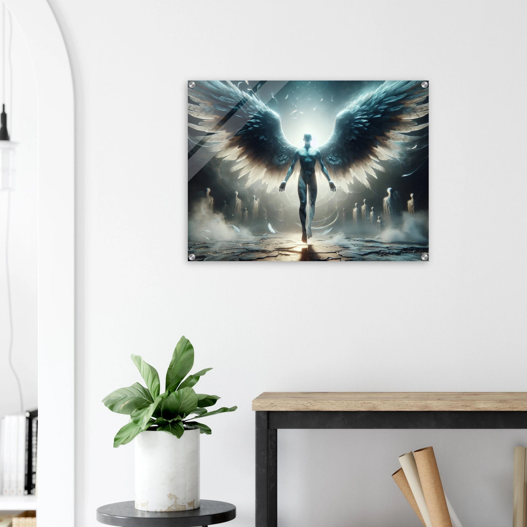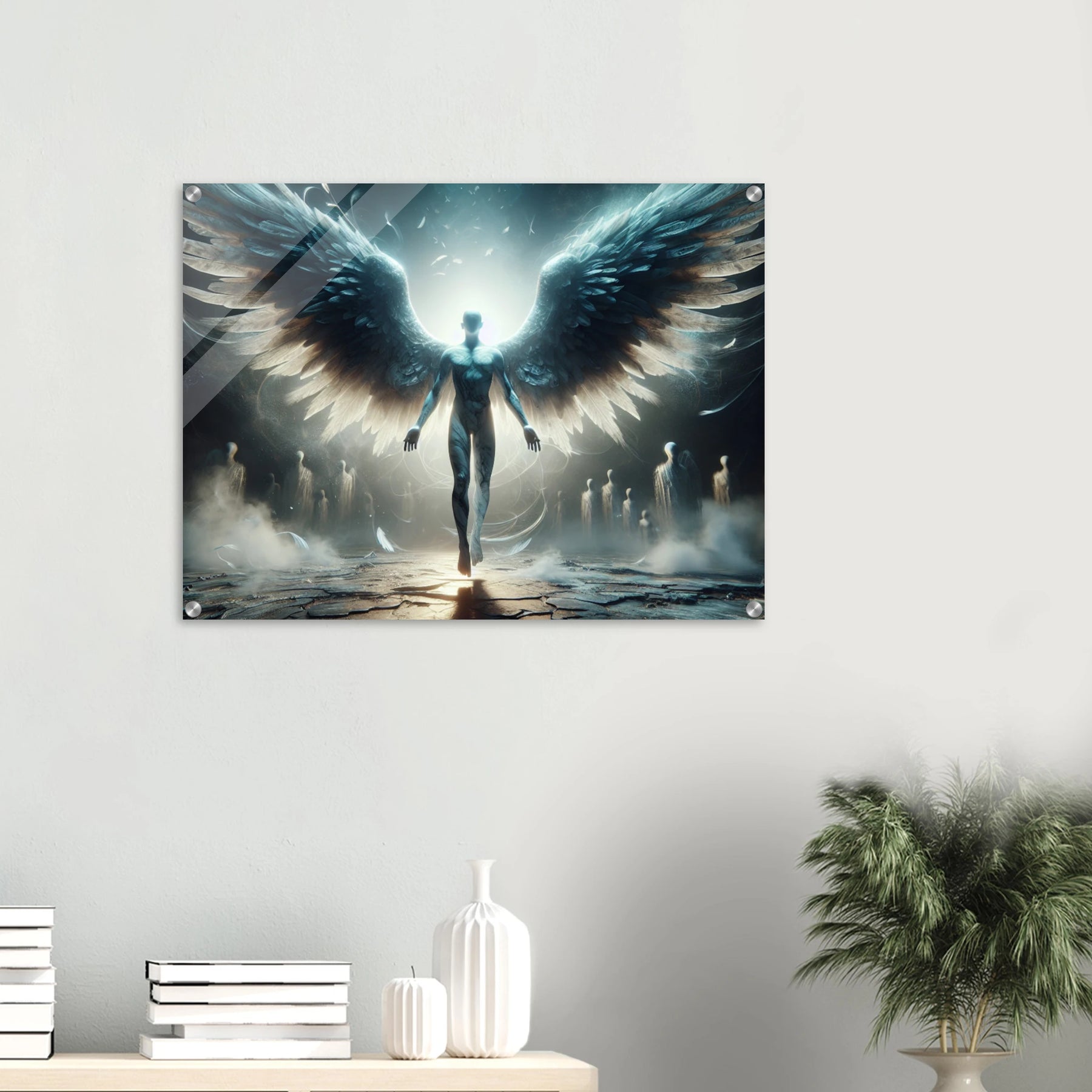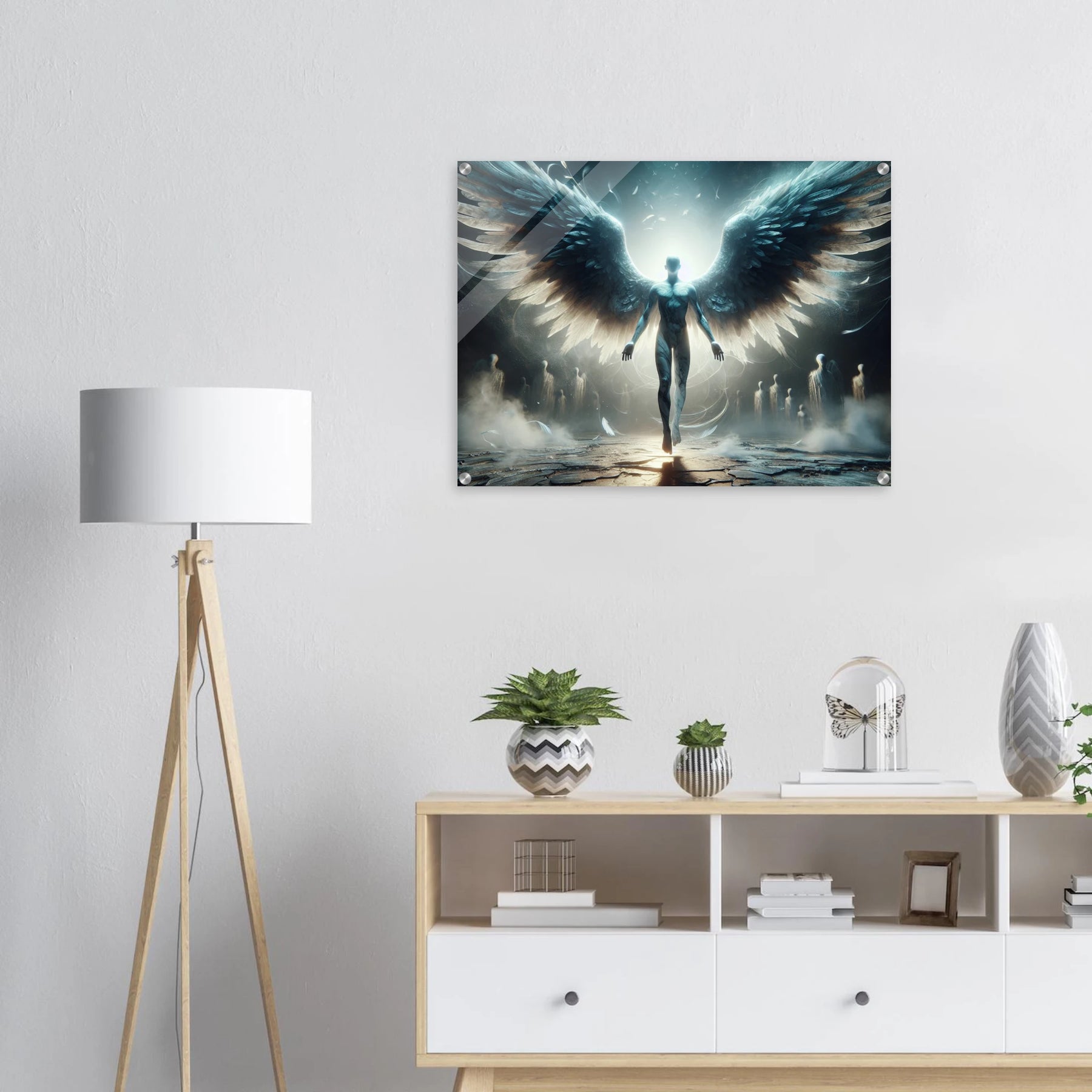 Acrylglasdruck: Männlicher Engel steht im Jüngsten Gericht, Welt bereits untergegangen, eindrucksvolle Wandkunst für Liebhaber von apokalyptischen Szenen und dramatischer Kunst