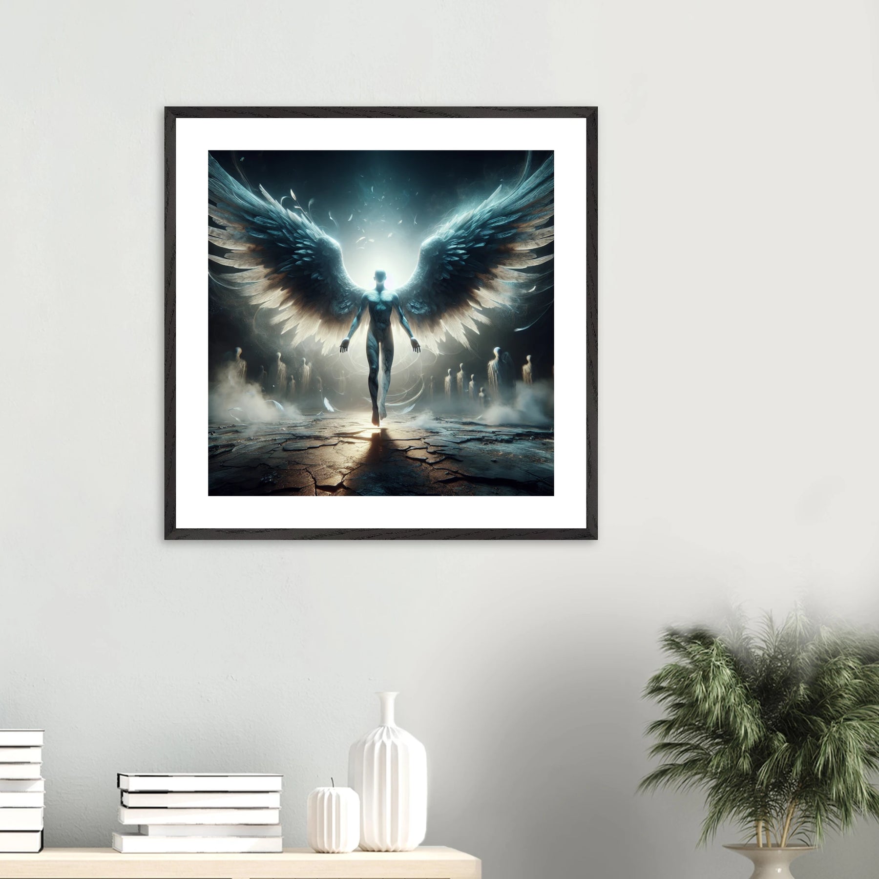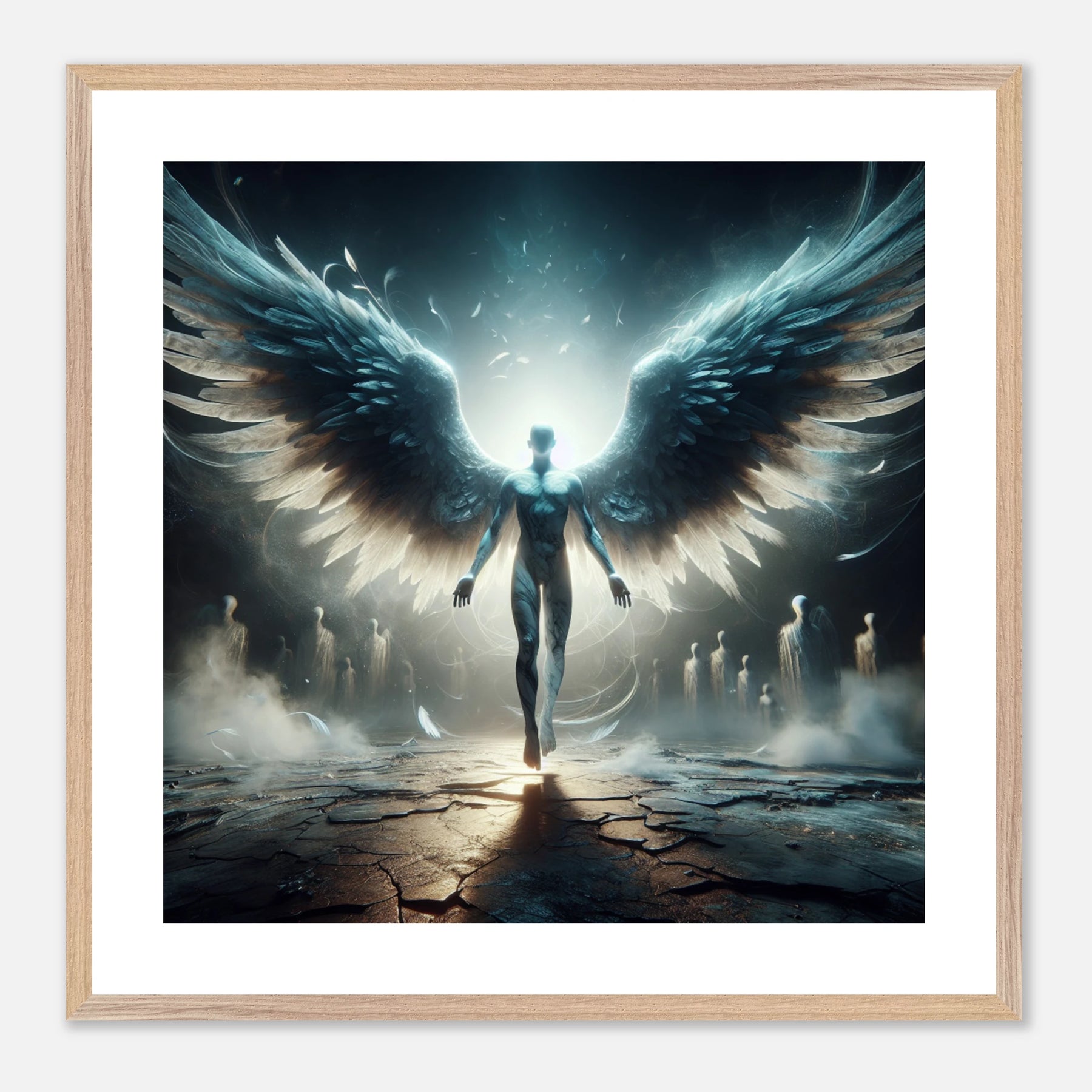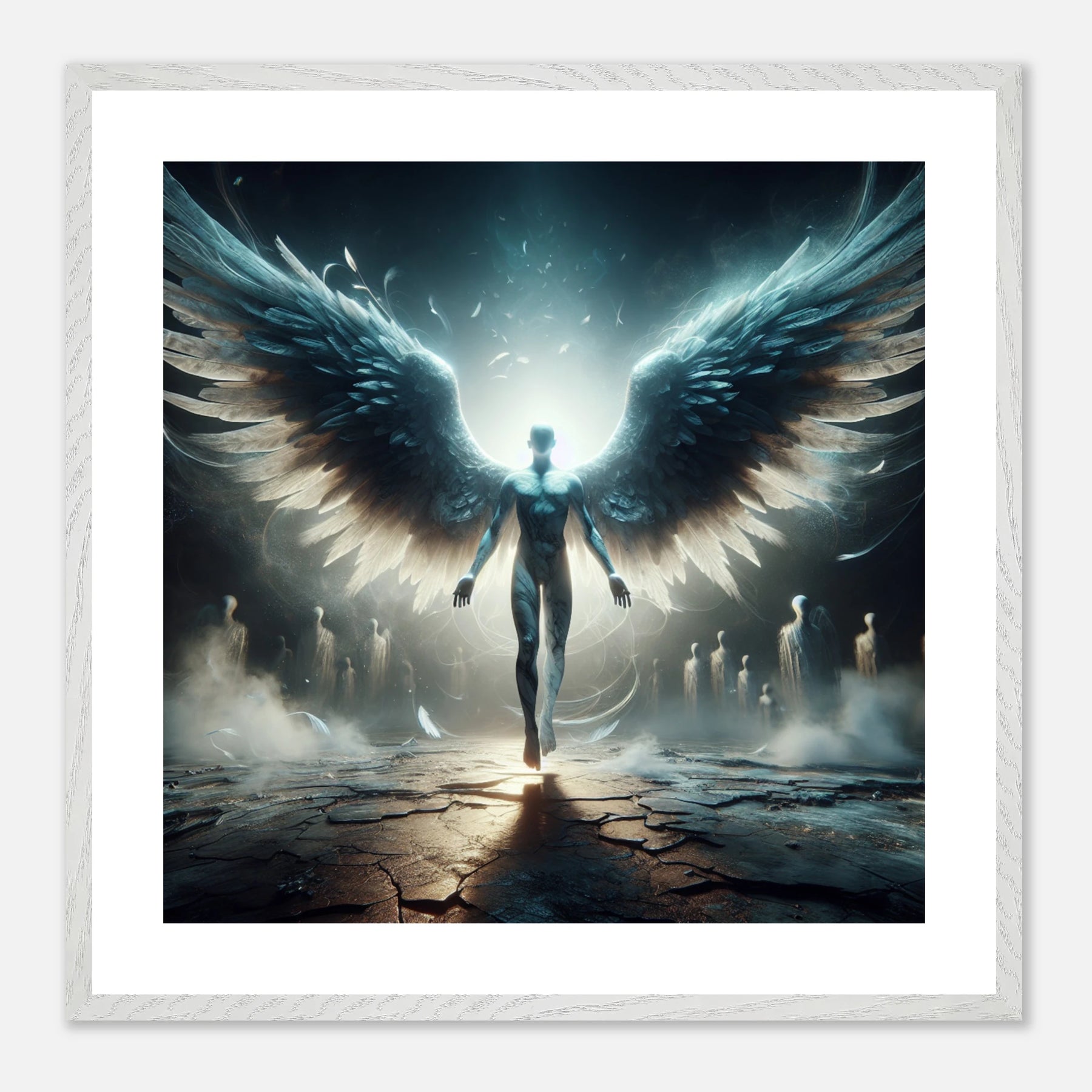Gerahmtes Premium-Poster: Männlicher Engel steht im Jüngsten Gericht, Welt bereits untergegangen, ideale Wandkunst für nachdenkliche und künstlerische zimmer