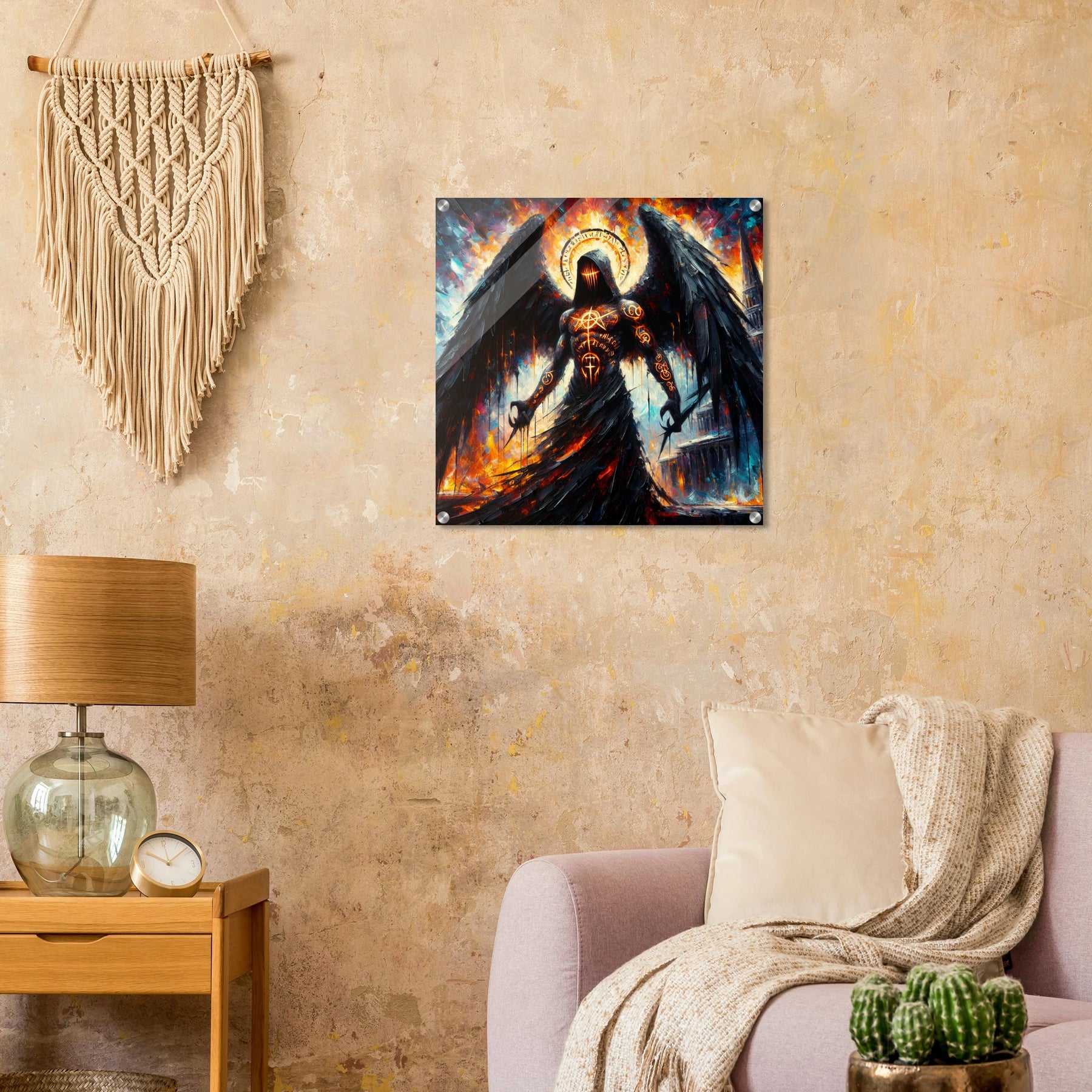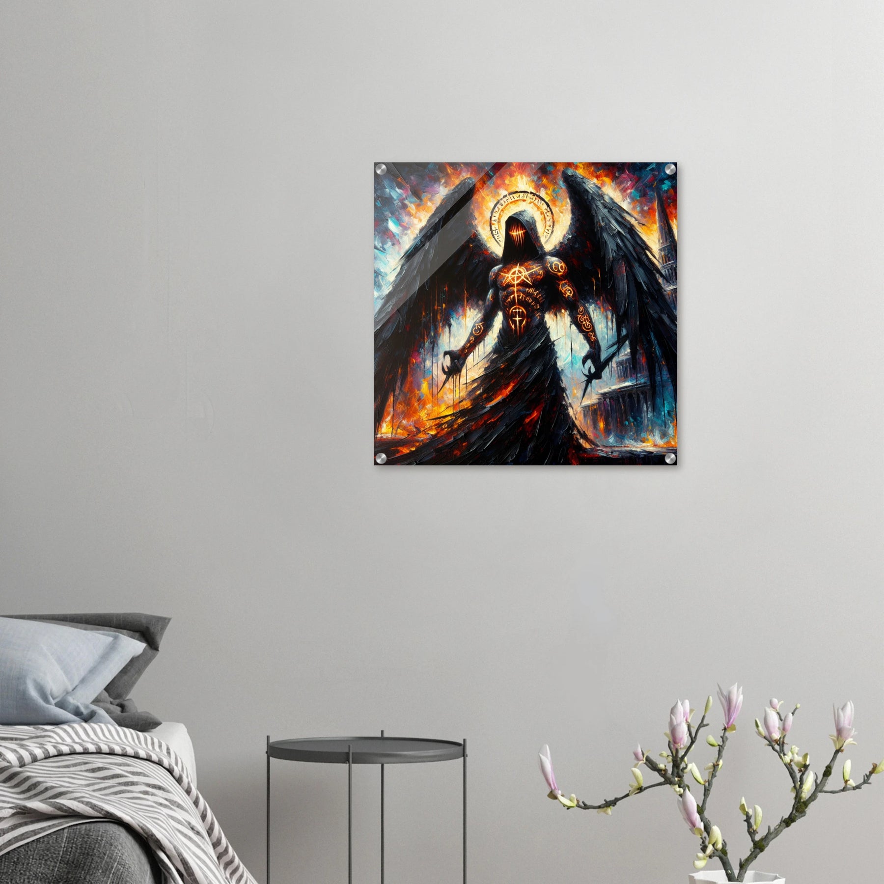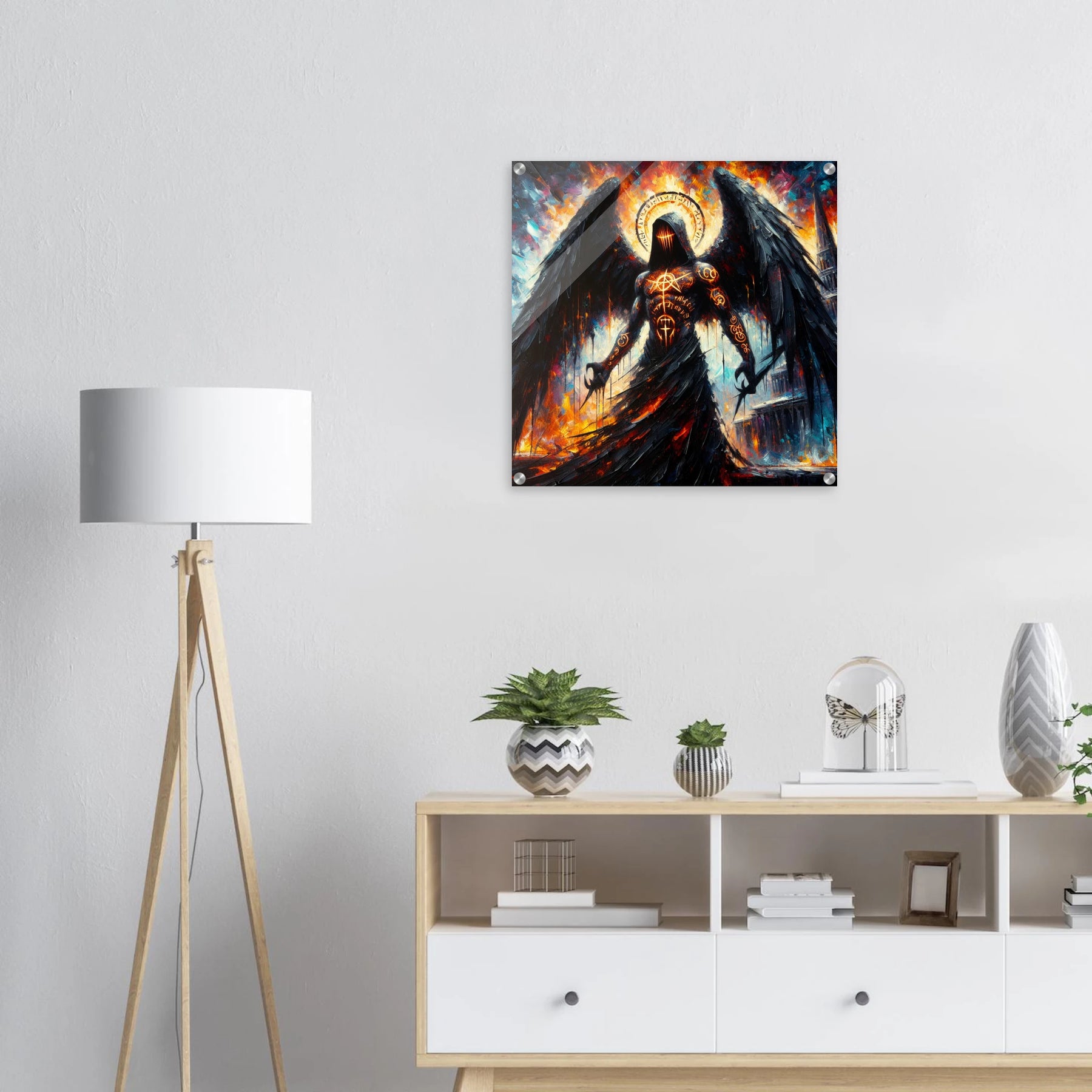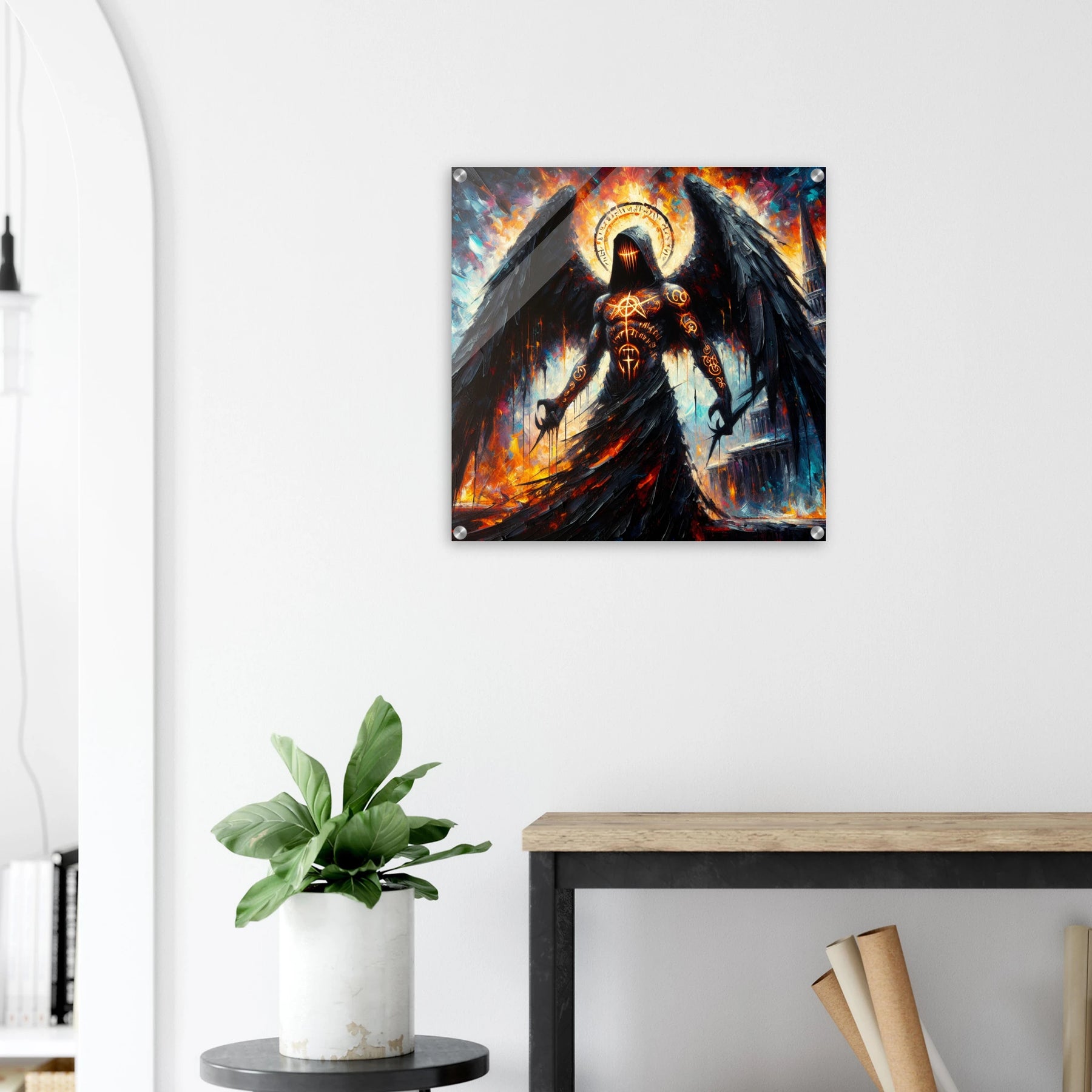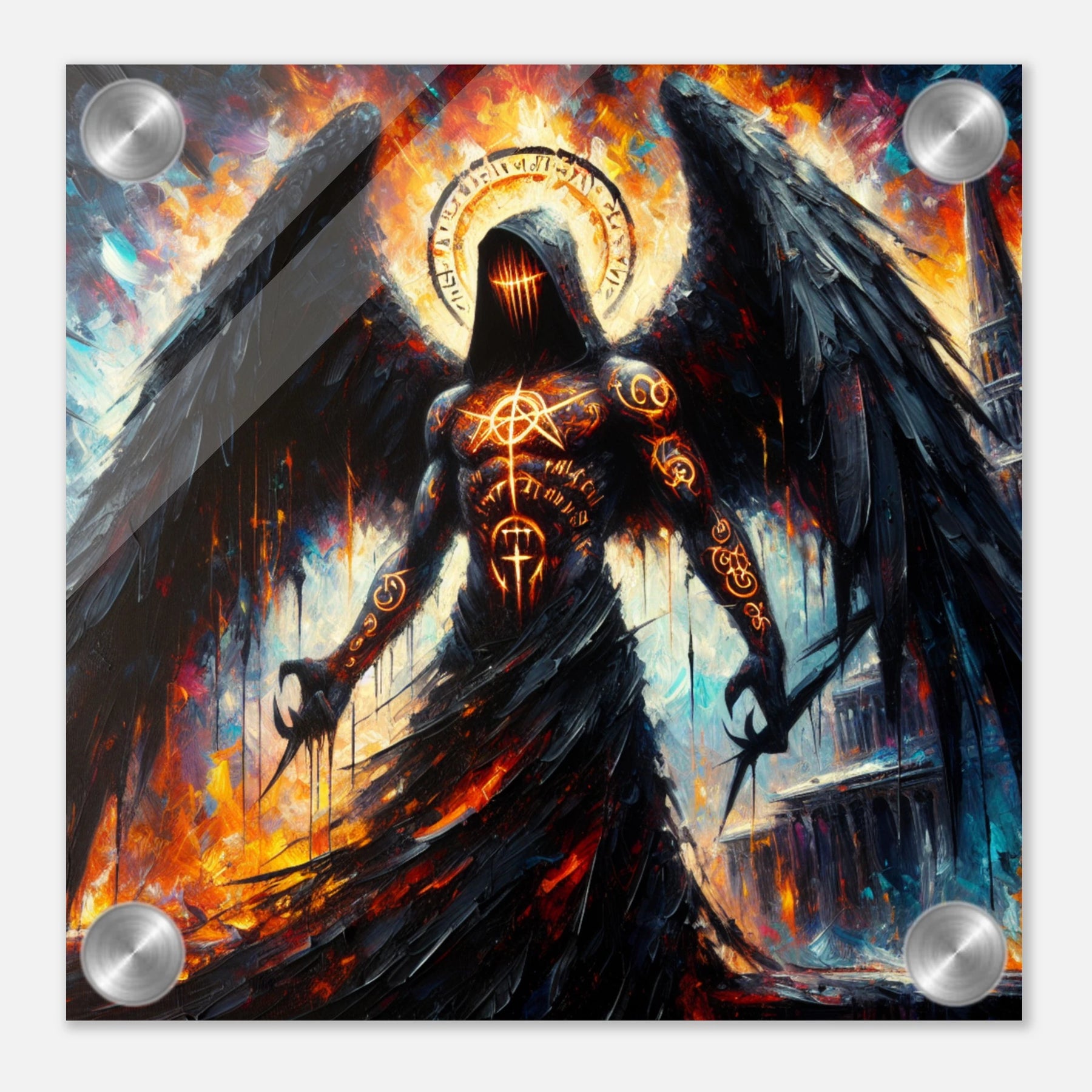 Acrylglas: Todesengel bemalt mit geheimnisvollen Runen und mysteriösen Zeichen, Wächter des Eingangs zur Hölle, fesselnde Wandkunst für Fantasy-Liebhaber und Mystik-Enthusiasten