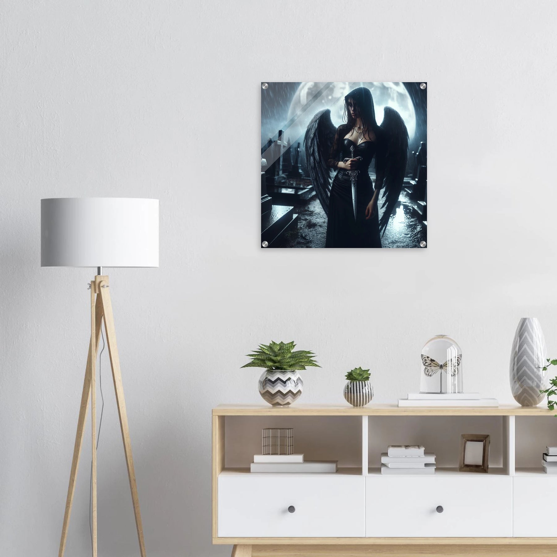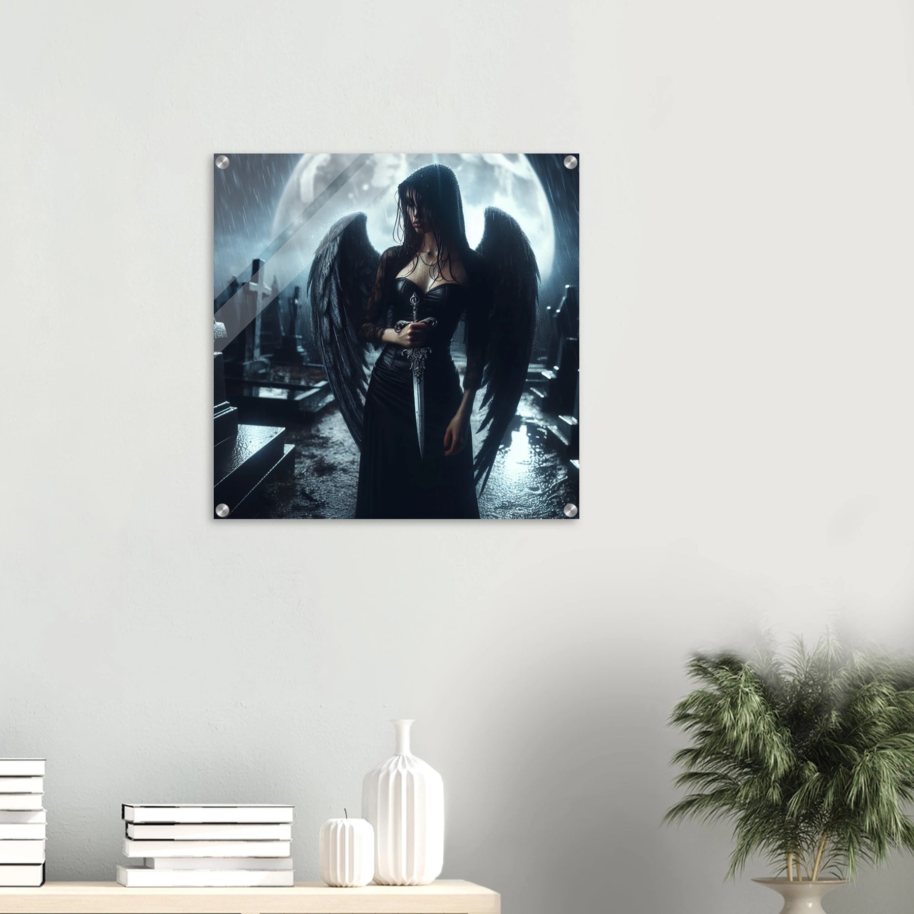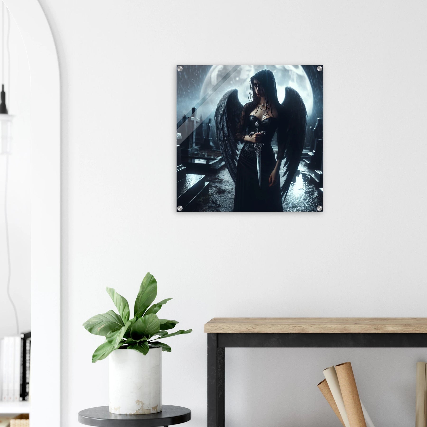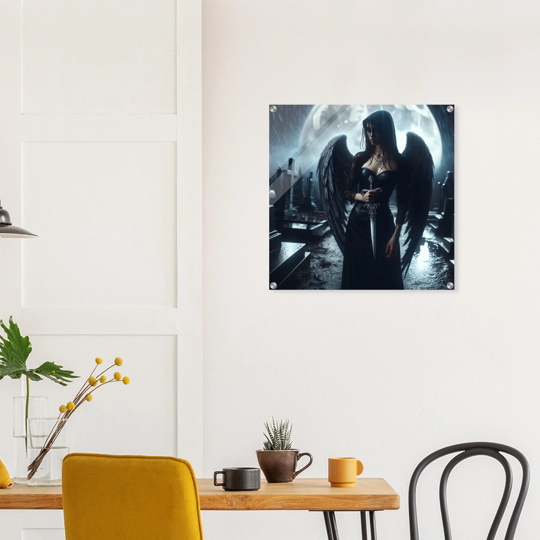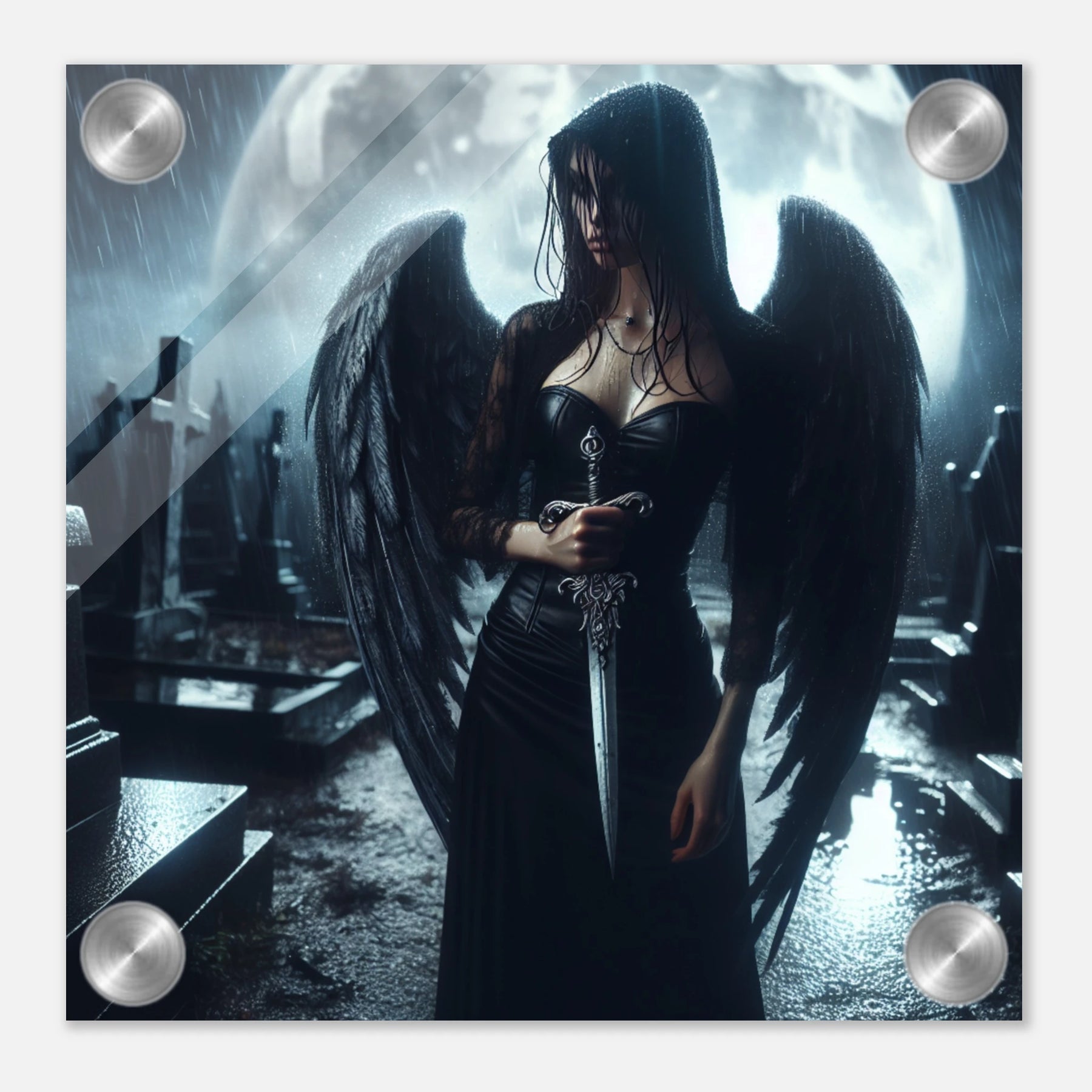 Acrylglasdruck: Dunkler melancholischer weiblicher Todesengel mit Dolch auf einem Friedhof, fesselnde Wandkunst für Gruftis und Gothics zum Thema Tod und Mord.