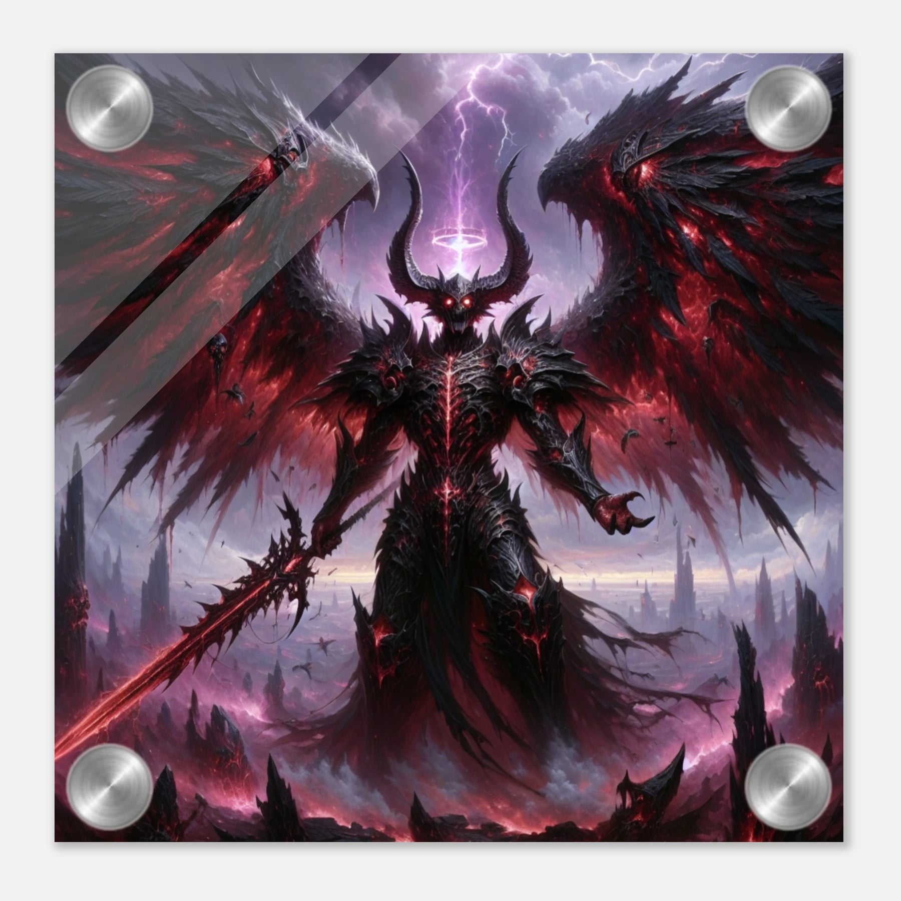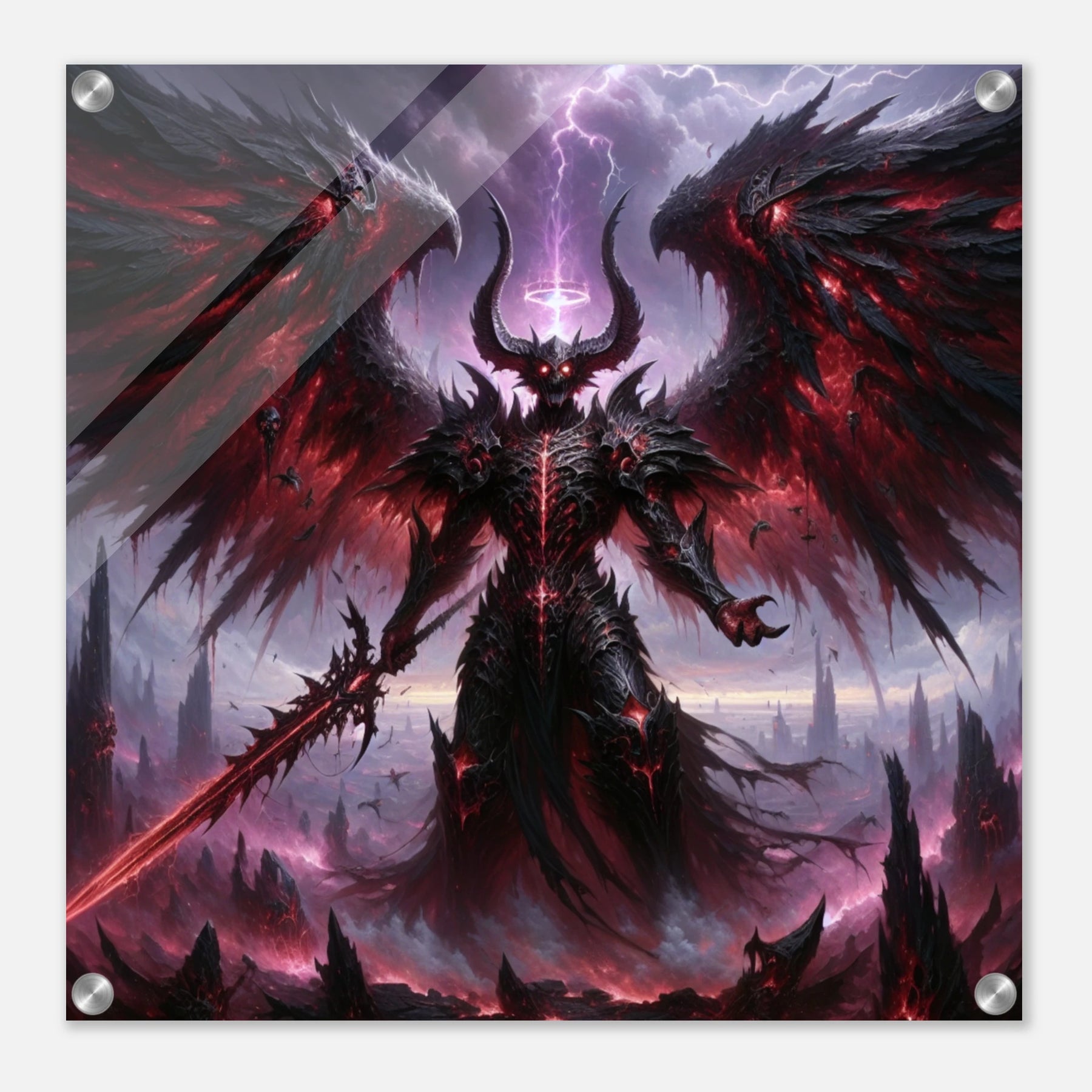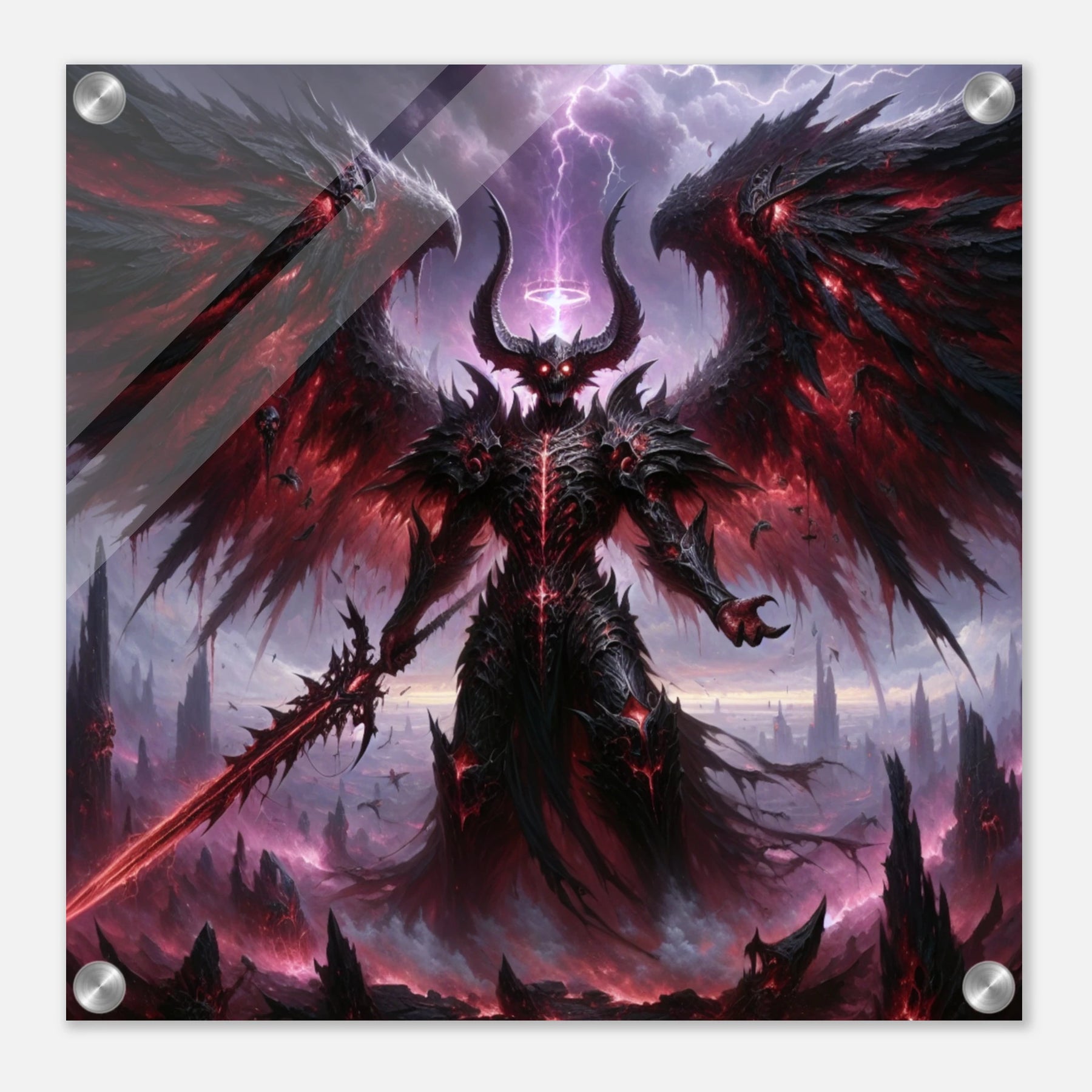 Acrylglasdruck: Dämonenkönig mit dunklen Flügeln, hält das Schwert der Vernichtung, wirkt wie der Endboss in einem Computerspiel, fesselnde Wandkunst für Gamer und Fantasy-Enthusiasten