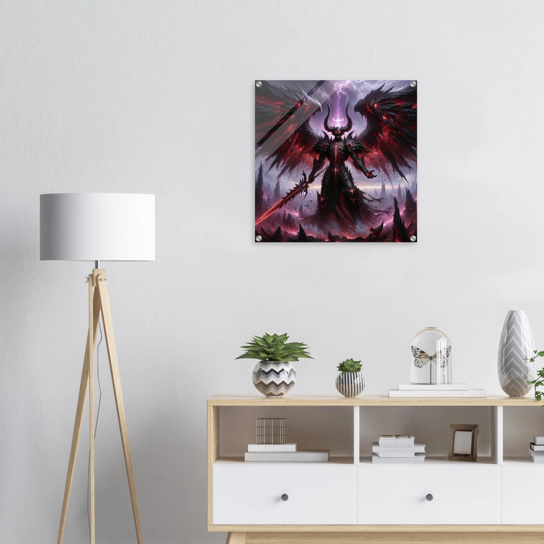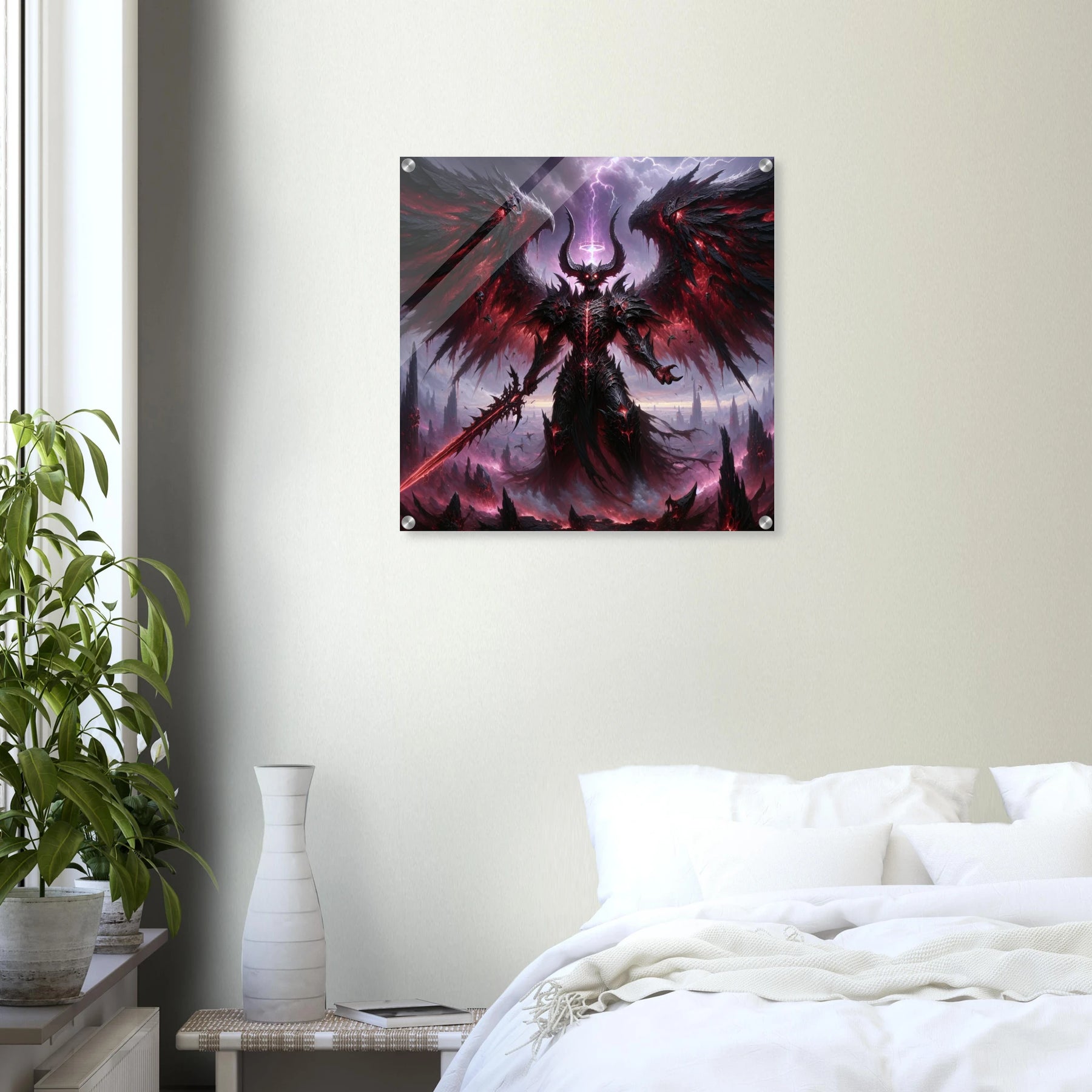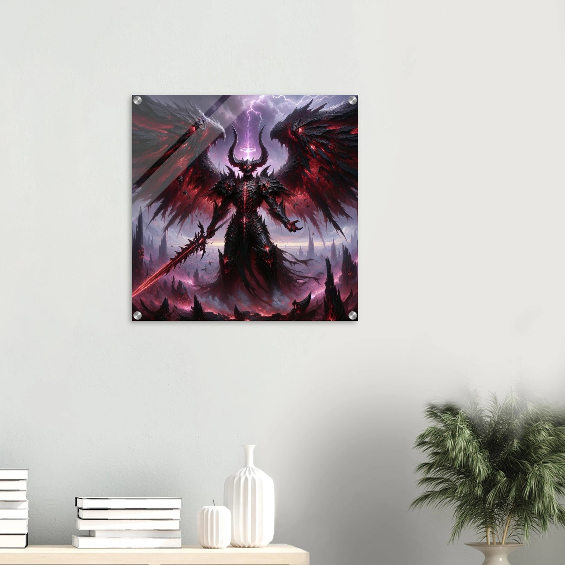 Acrylglasdruck: Dämonenkönig mit dunklen Flügeln, hält das Schwert der Vernichtung, wirkt wie der Endboss in einem Computerspiel, fesselnde Wandkunst für Gamer und Fantasy-Enthusiasten