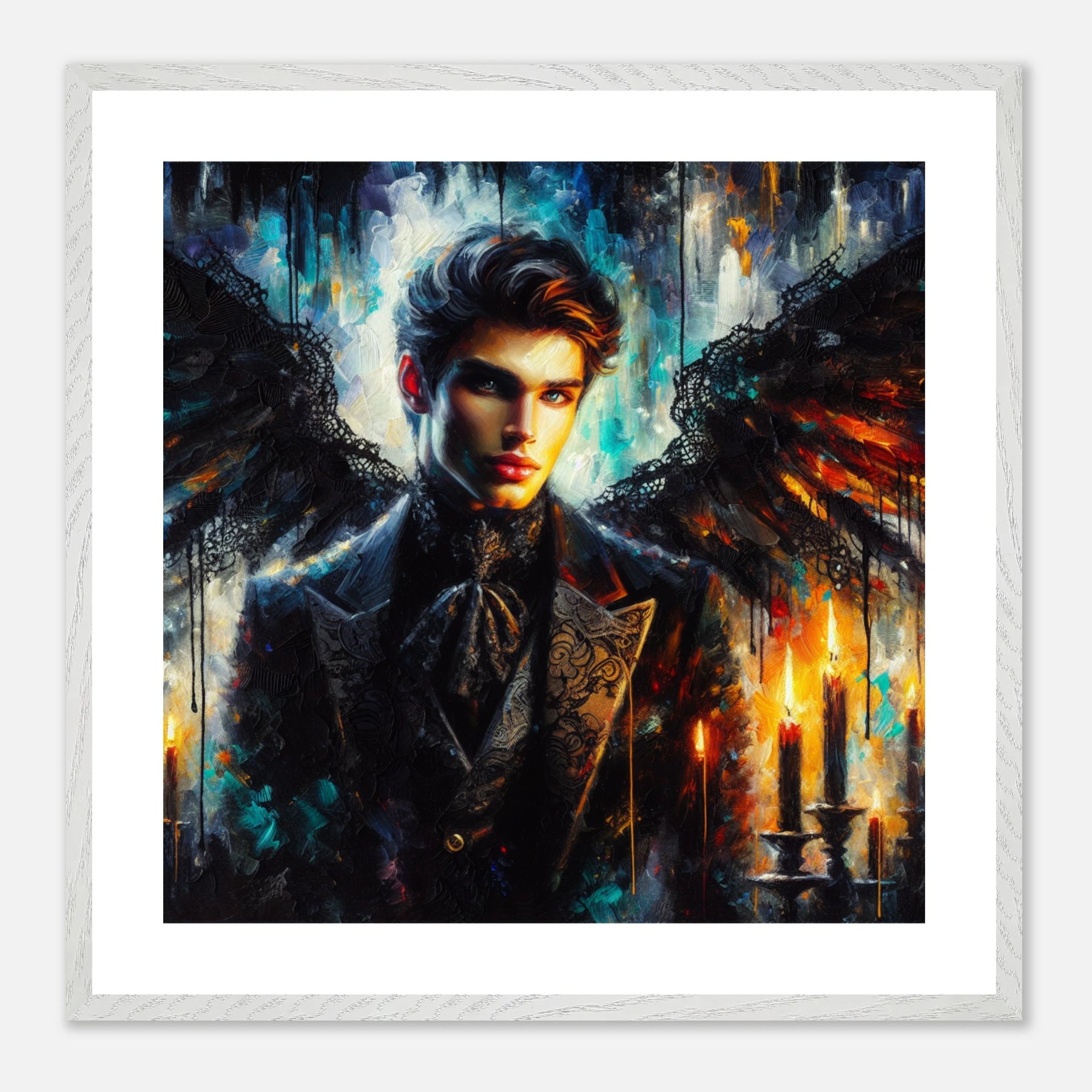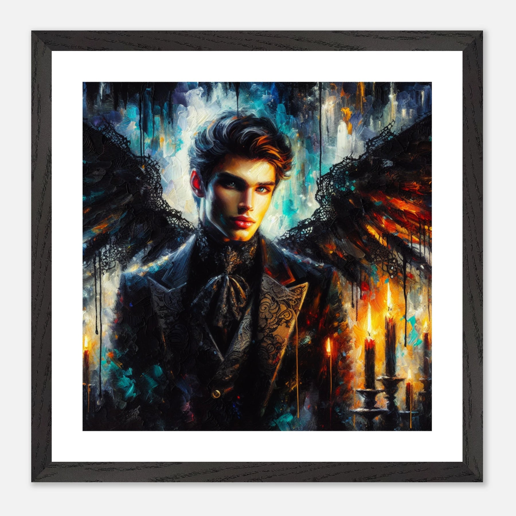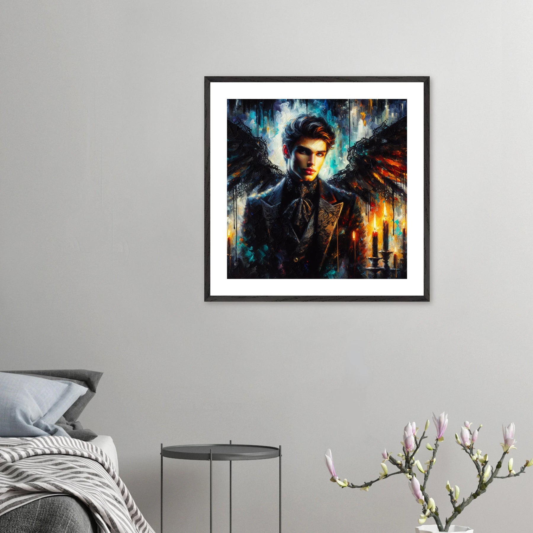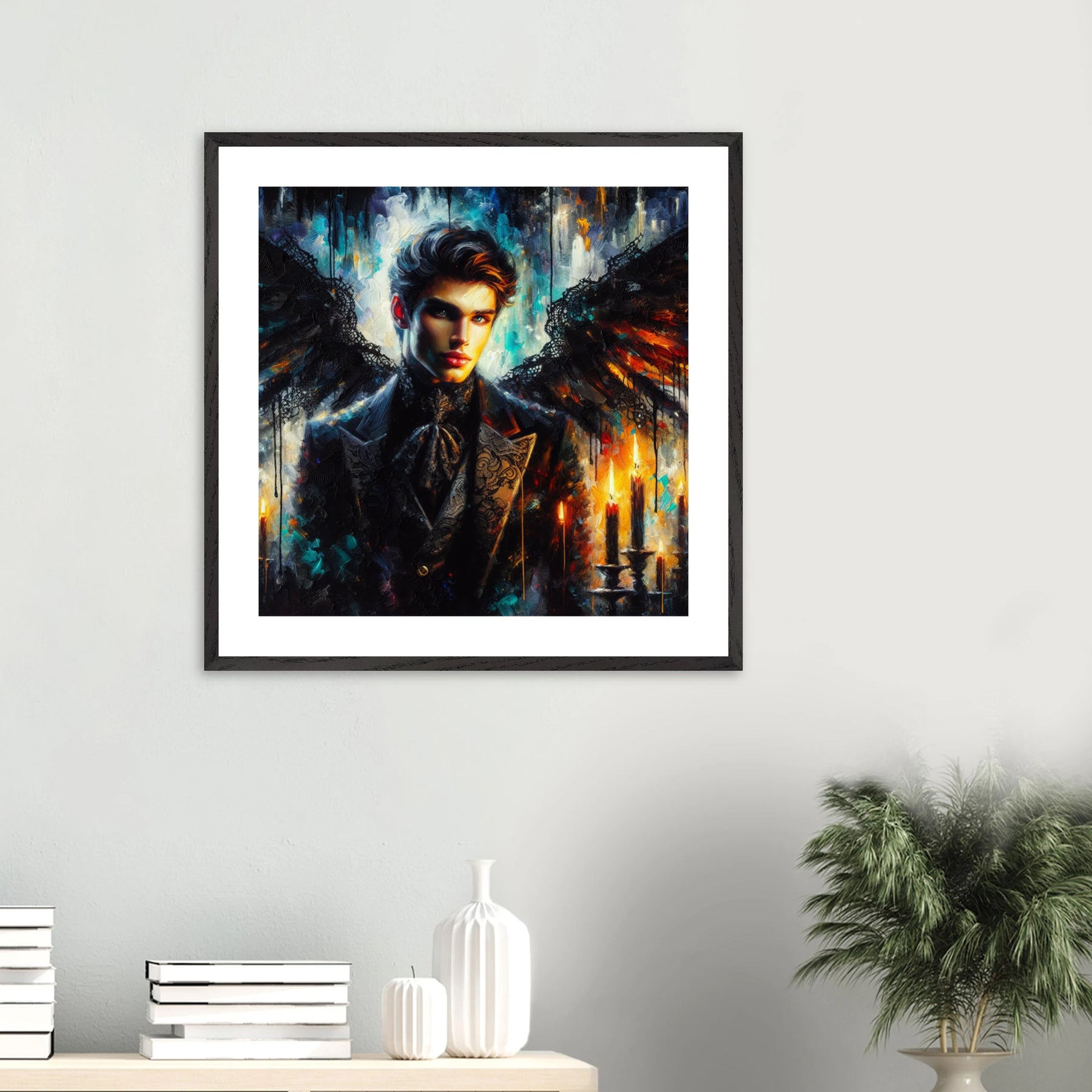 Gerahmtes Premium-Poster: Wunderschöner dunkler männlicher Engel, makelloses Aussehen, verkörpert Versuchung und Sünde, ideale Wandkunst für elegante und stimmungsvolle Räume