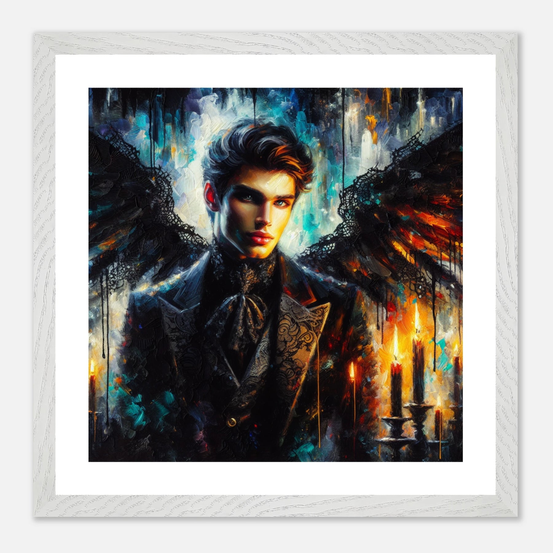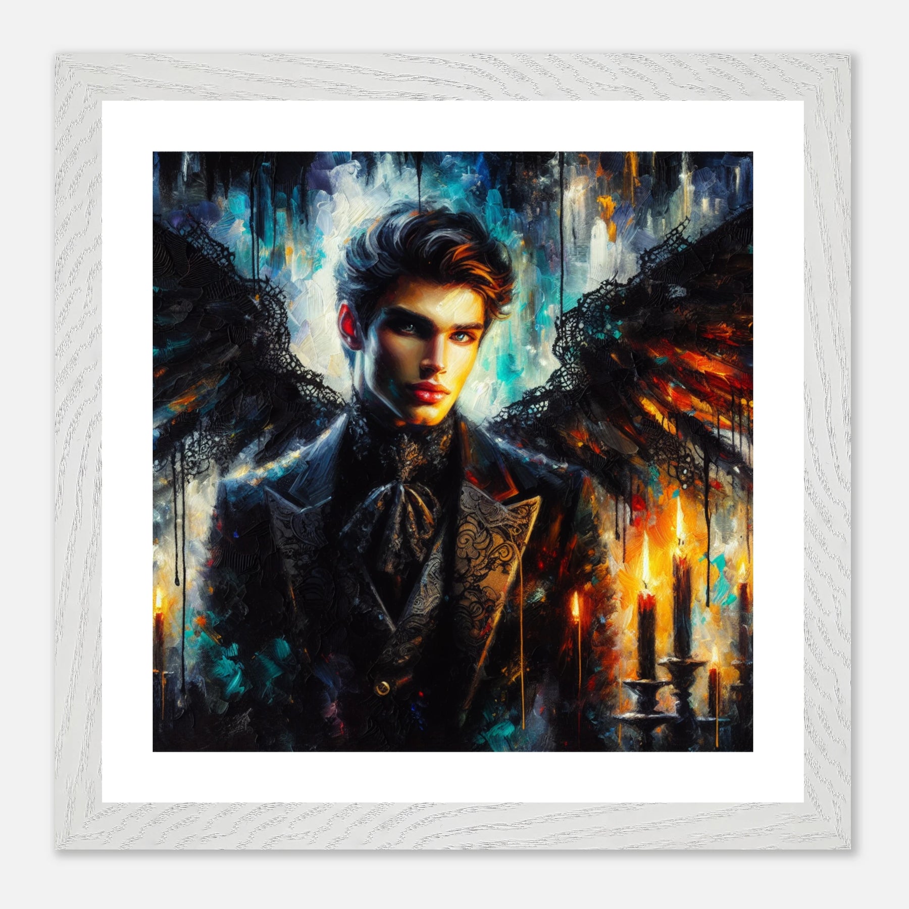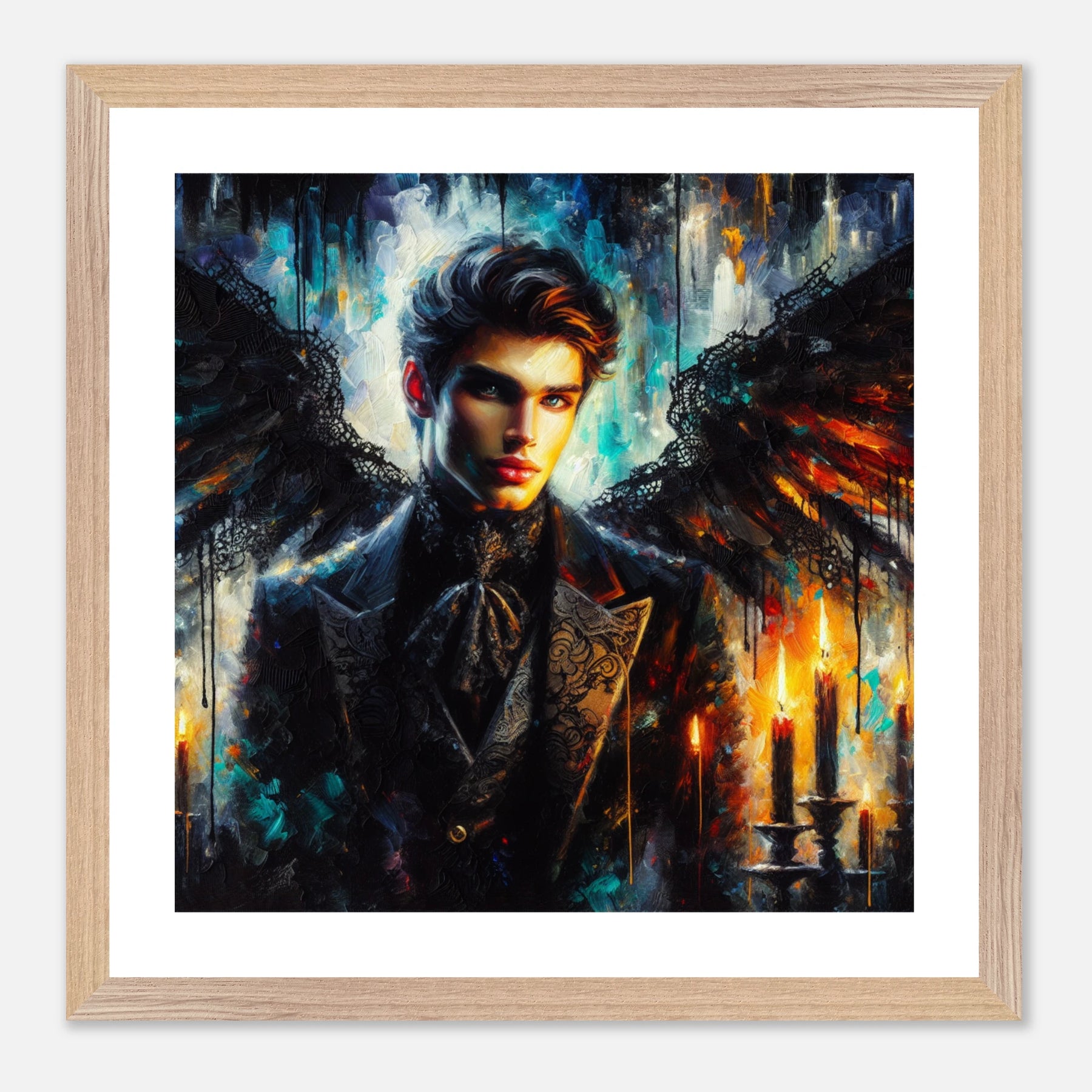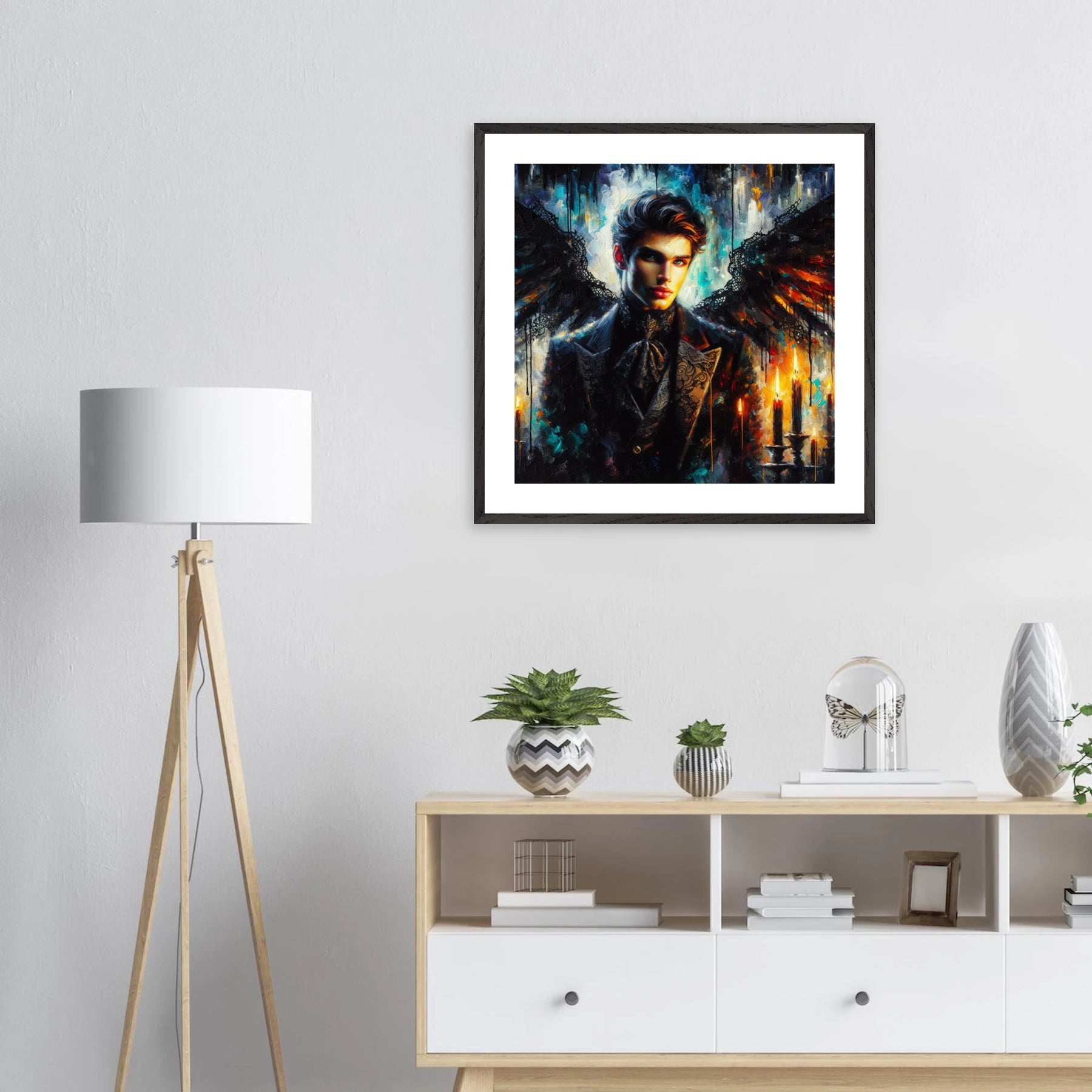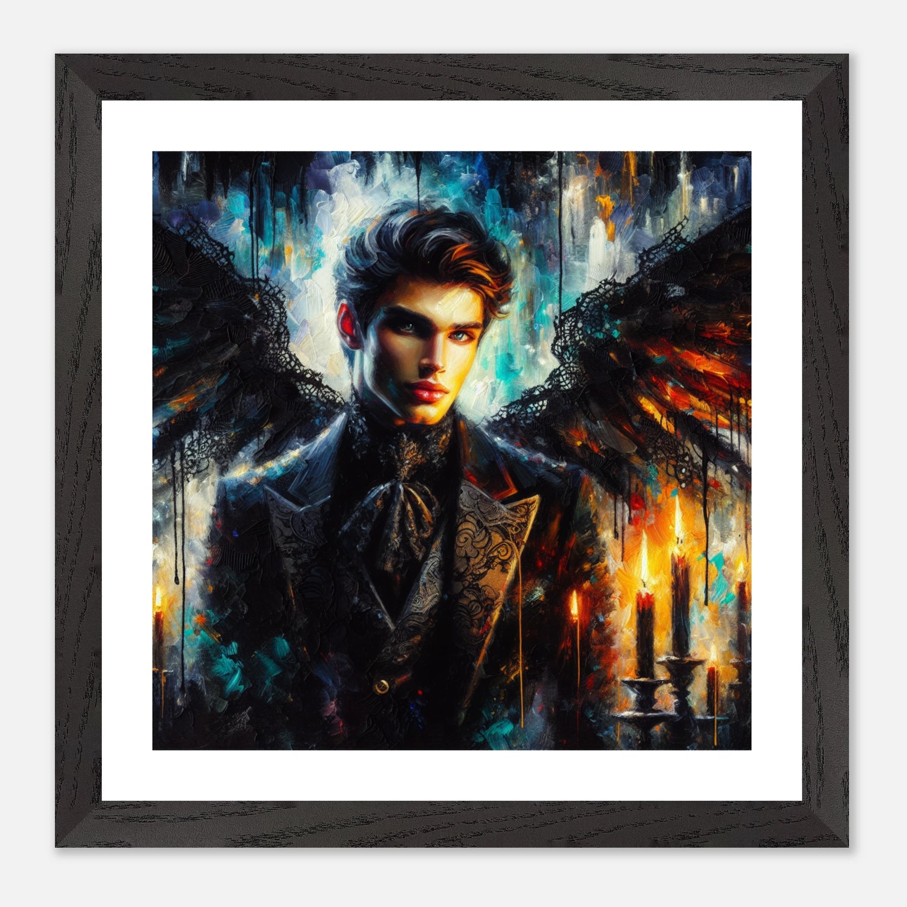 Gerahmtes Premium-Poster: Wunderschöner dunkler männlicher Engel, makelloses Aussehen, verkörpert Versuchung und Sünde, ideale Wandkunst für elegante und stimmungsvolle Räume