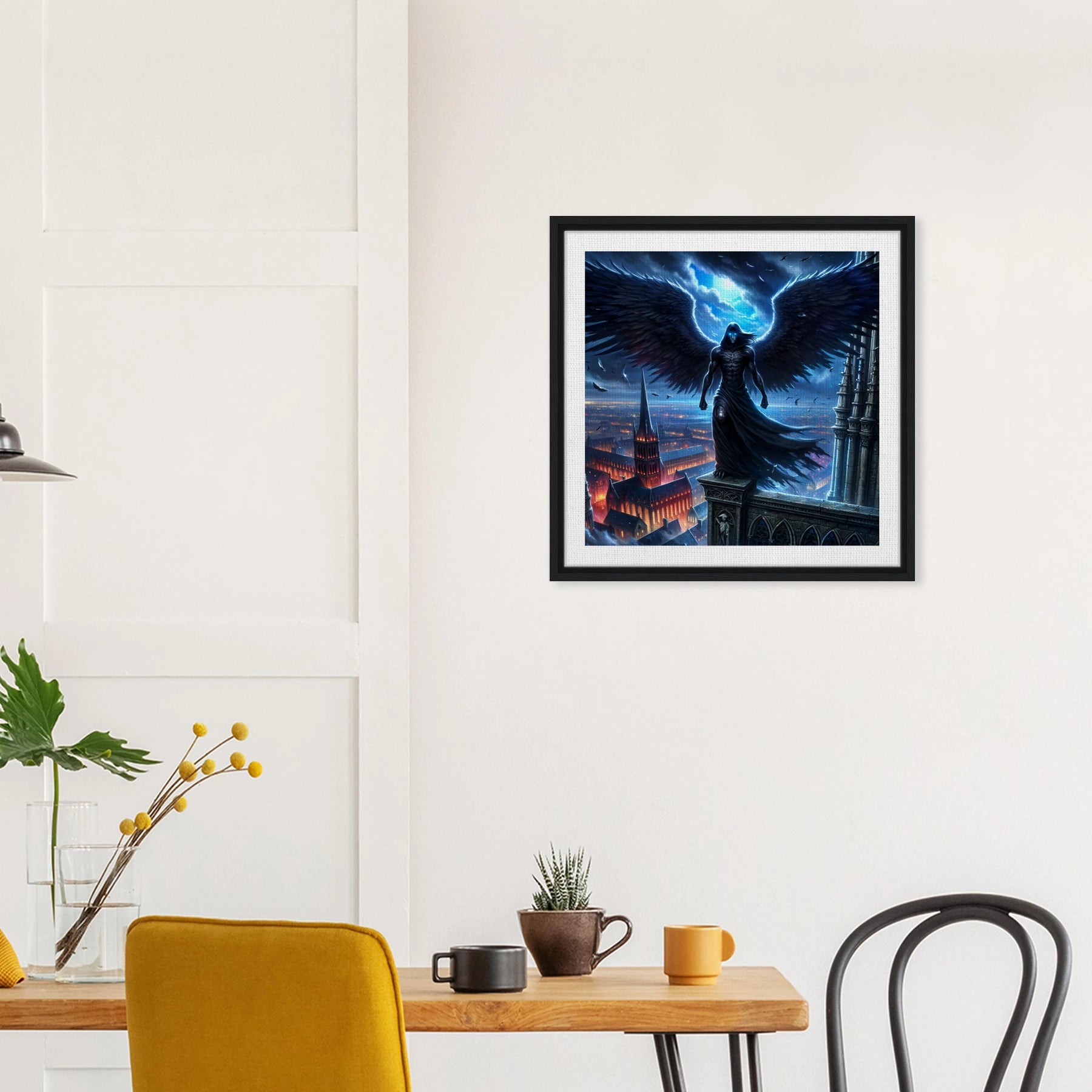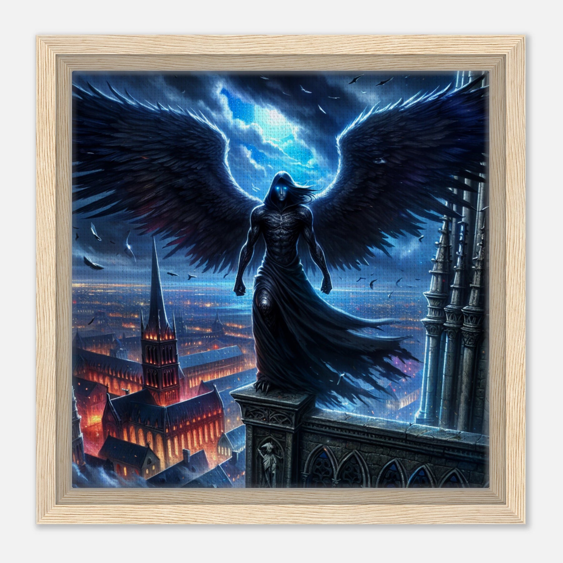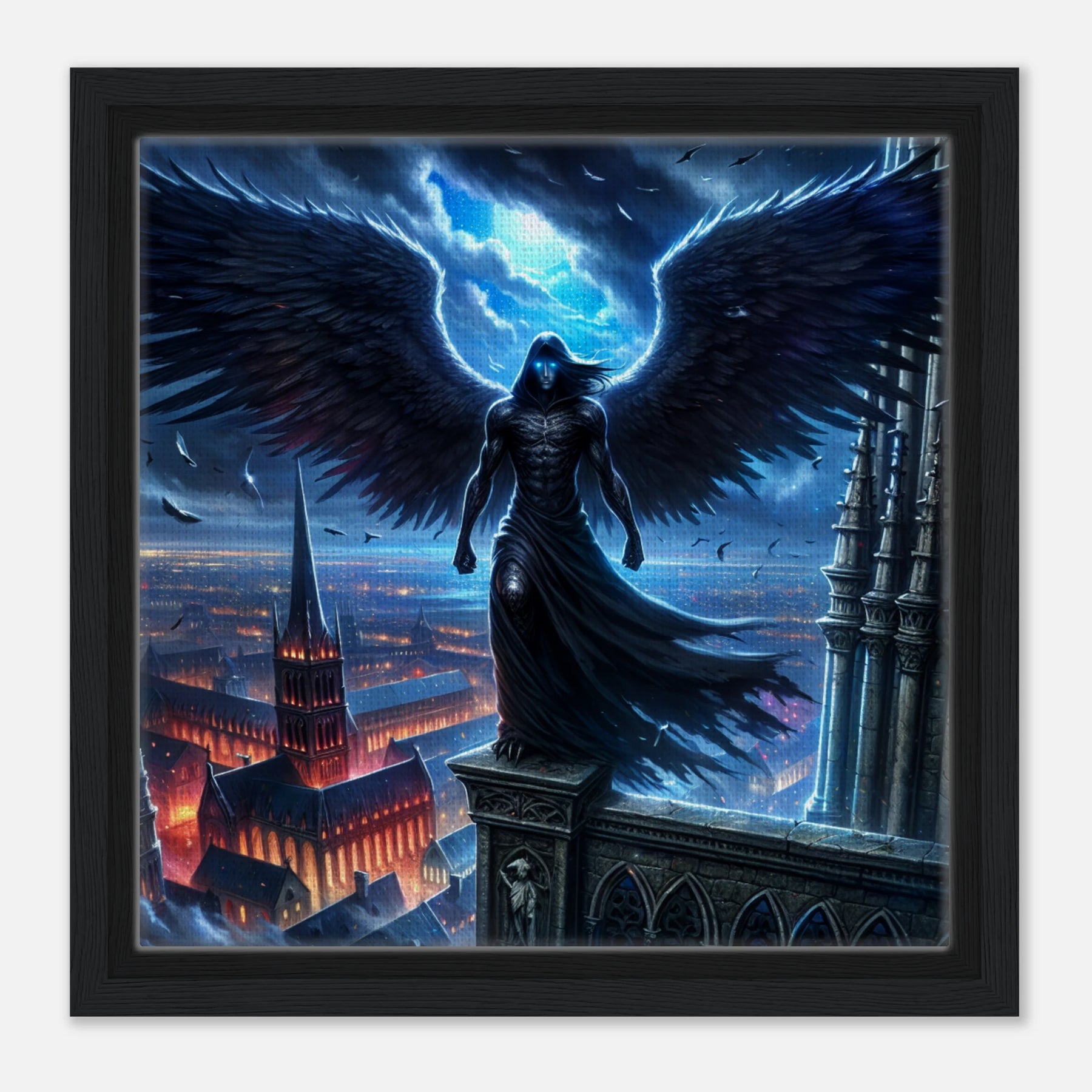 Gerahmte Leinwand: The Watcher in the Abyss, dunkler Engel mit großen schwarzen Flügeln und leuchtend blauen Augen, steht auf einem Dach über einer Stadt bei Nacht, gruselige Wanddekoration für Wohnzimmer und Gothic-Fans