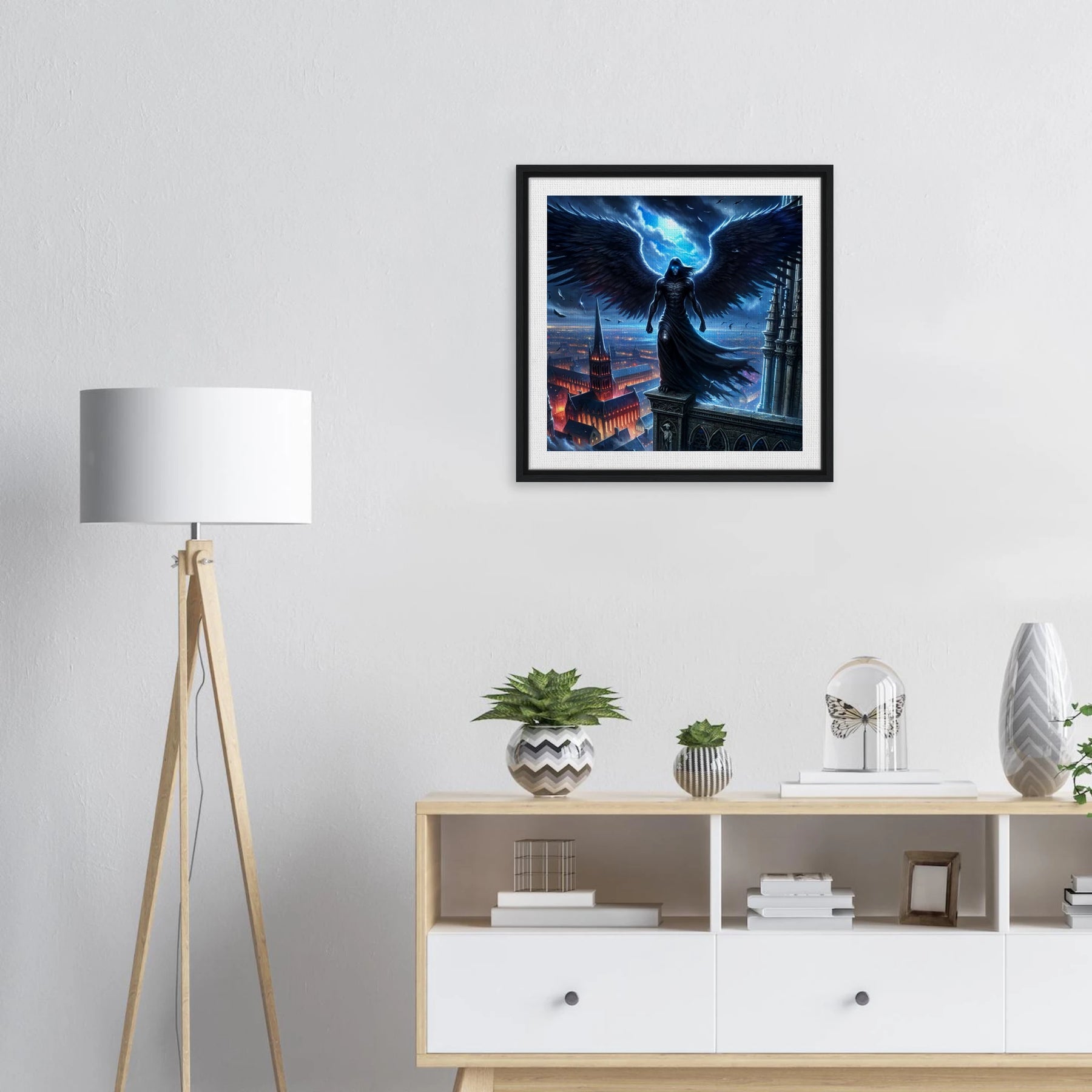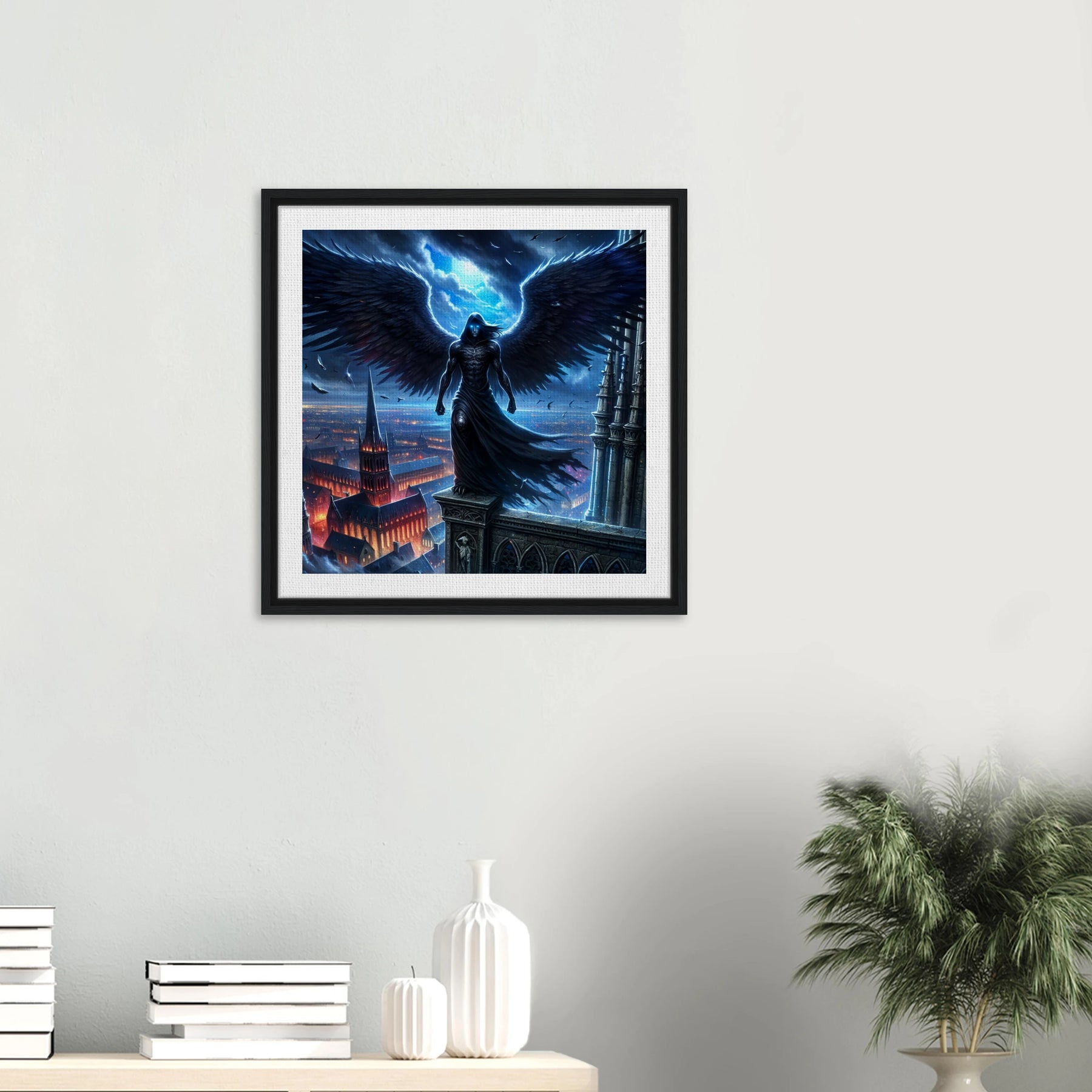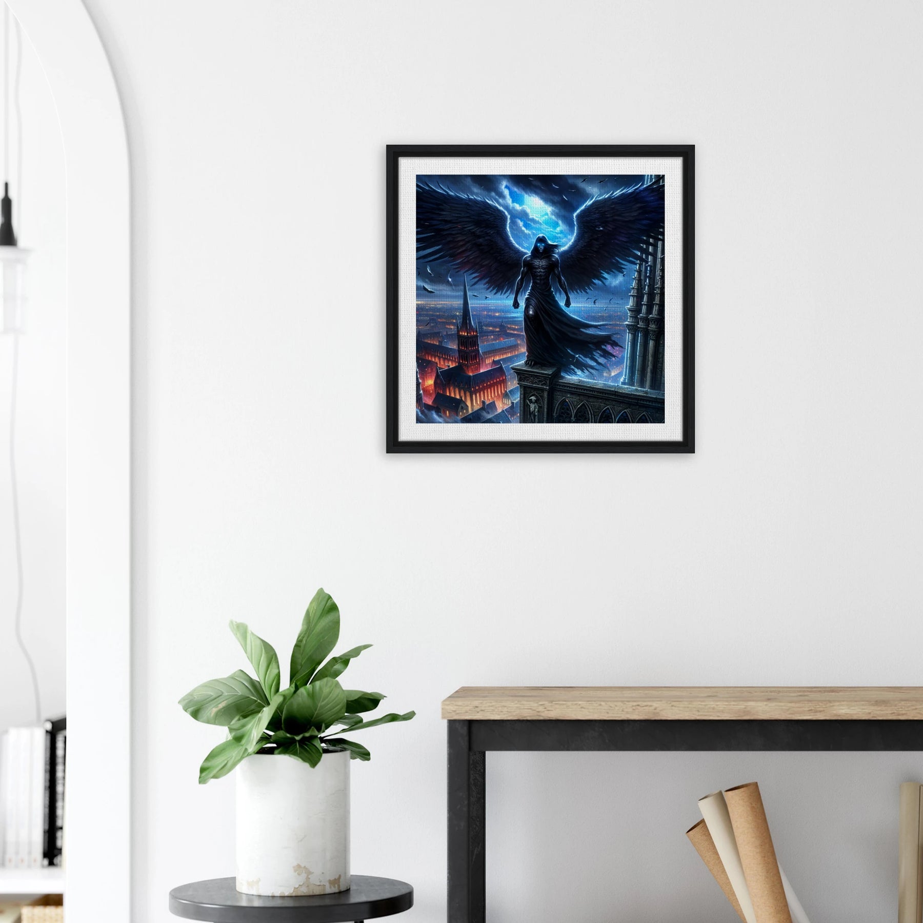 Gerahmte Leinwand: The Watcher in the Abyss, dunkler Engel mit großen schwarzen Flügeln und leuchtend blauen Augen, steht auf einem Dach über einer Stadt bei Nacht, gruselige Wanddekoration für Wohnzimmer und Gothic-Fans