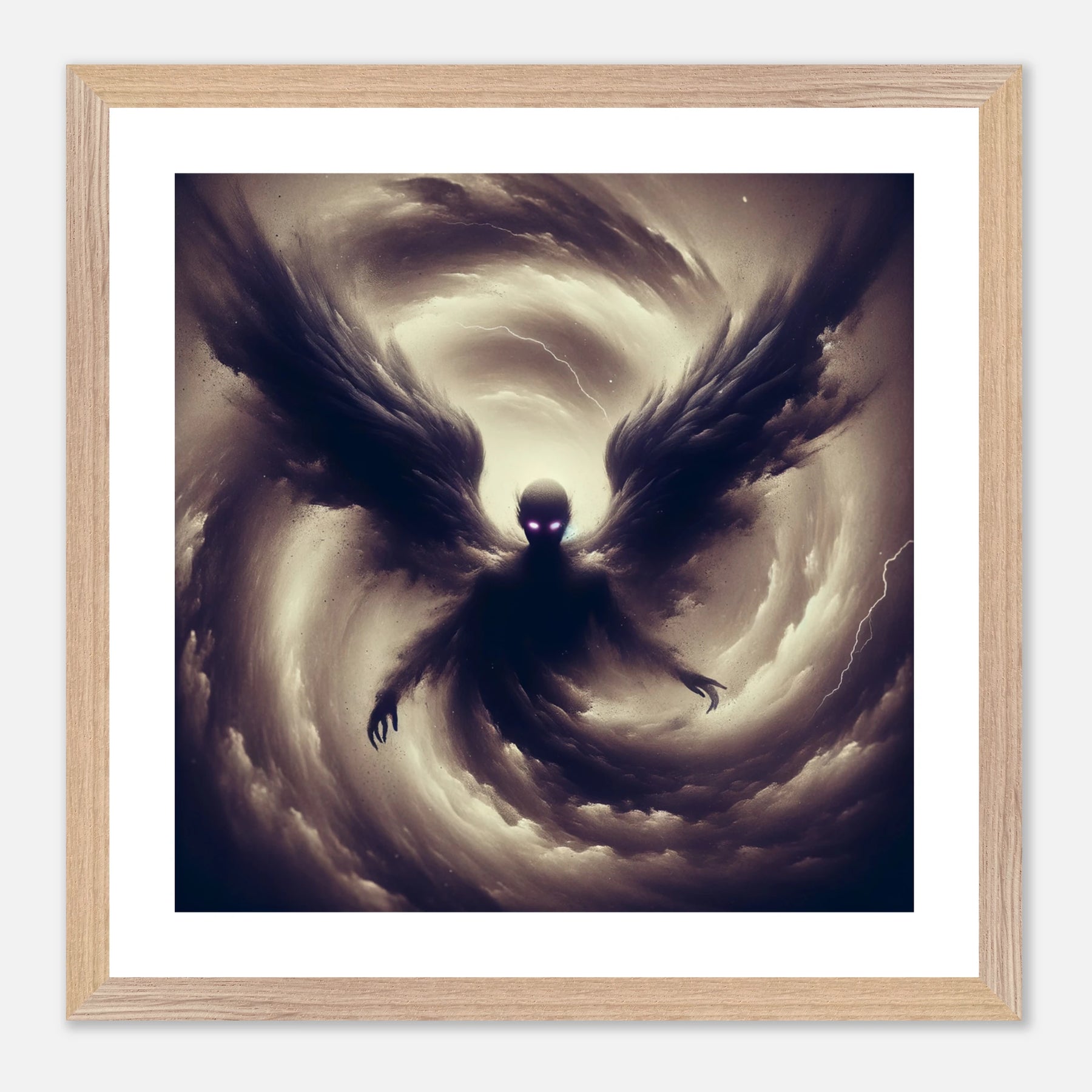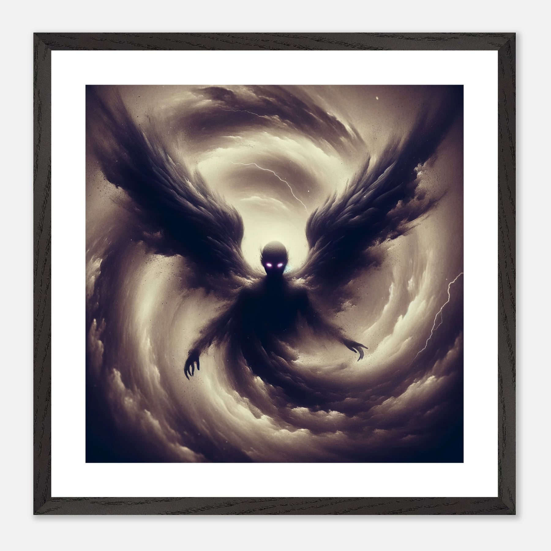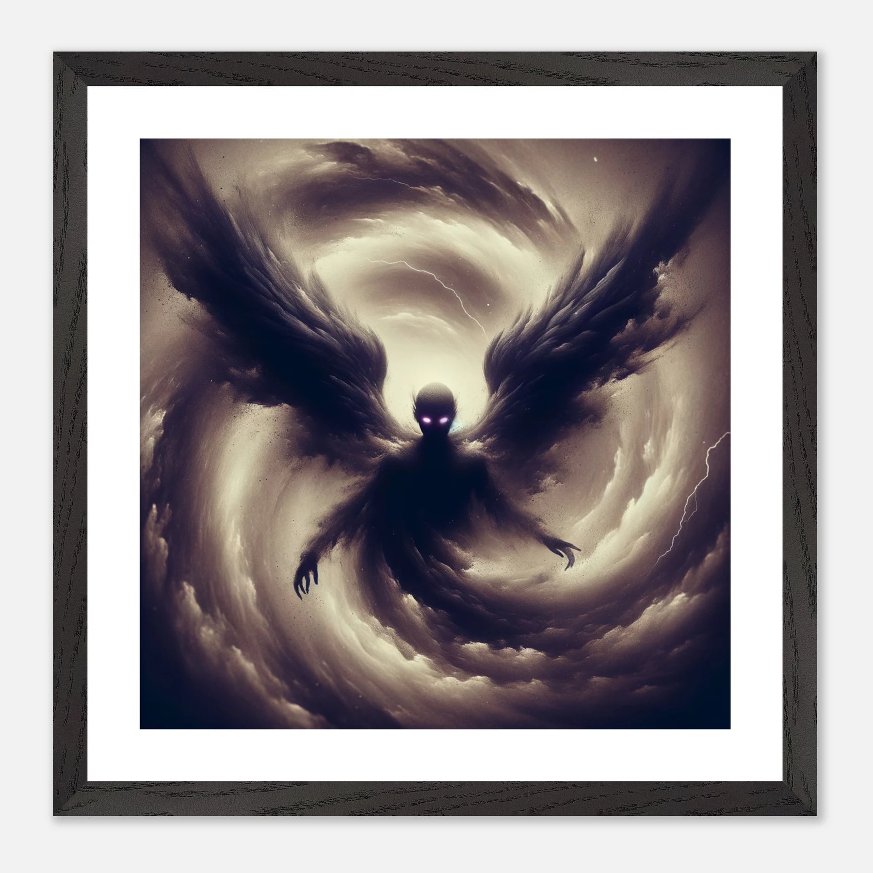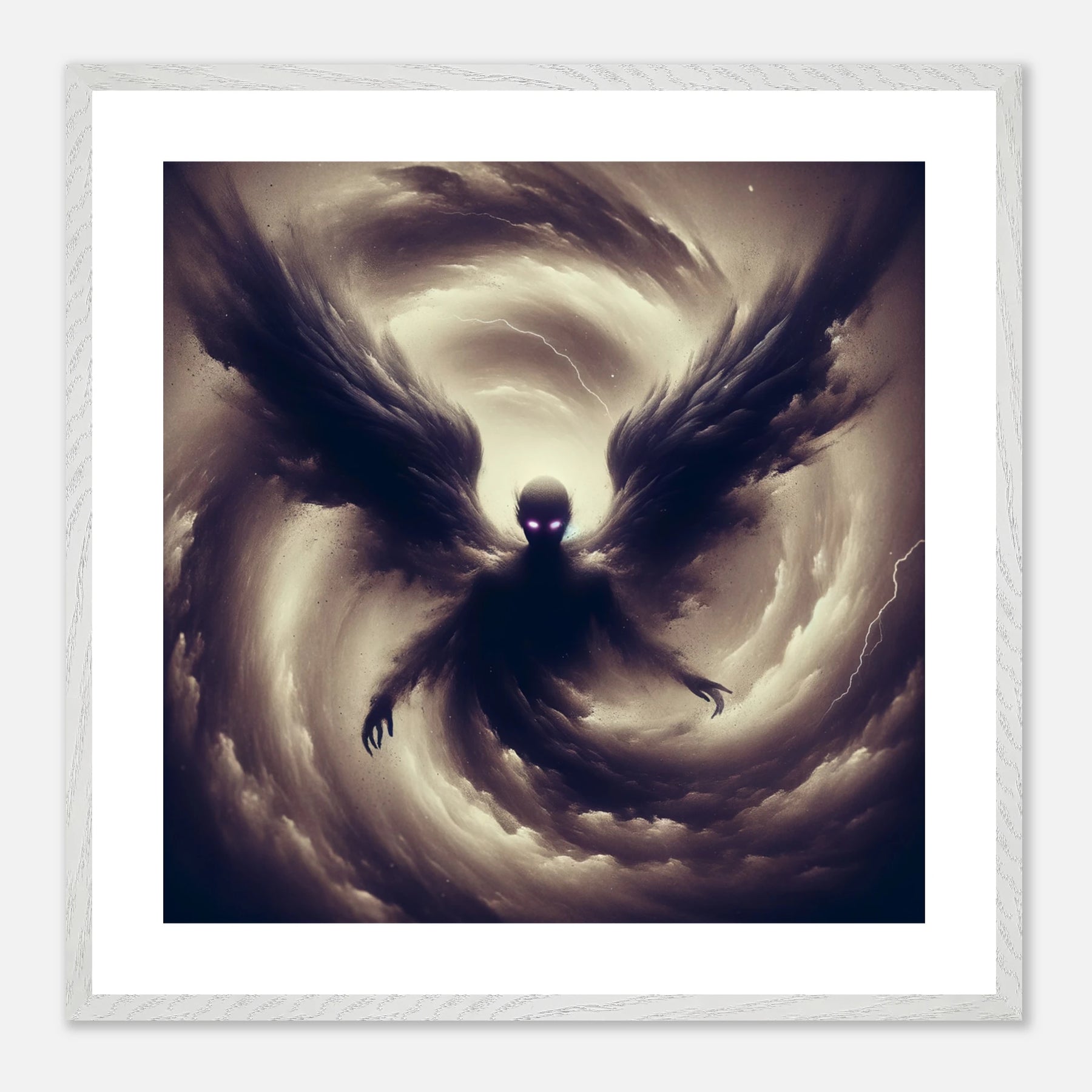 Gerahmtes Premium-Poster: Schattengeist mit Engelsflügeln, als Wolke in einem Sturm oder Hurrikan, düster und unheimlich, ideale Wandkunst für Horror-Enthusiasten und stimmungsvolle Räume