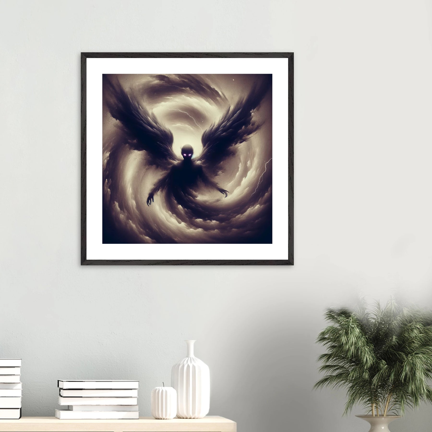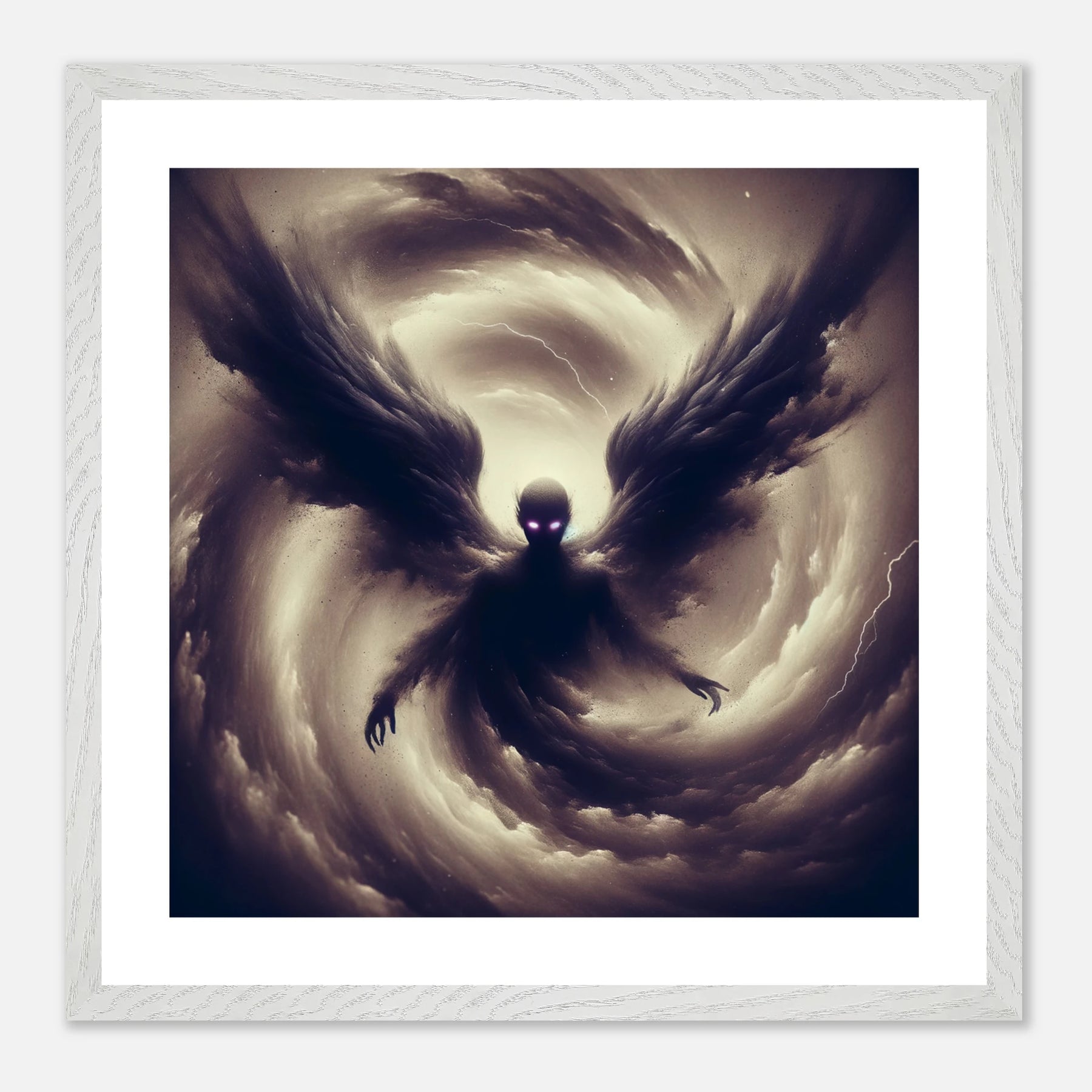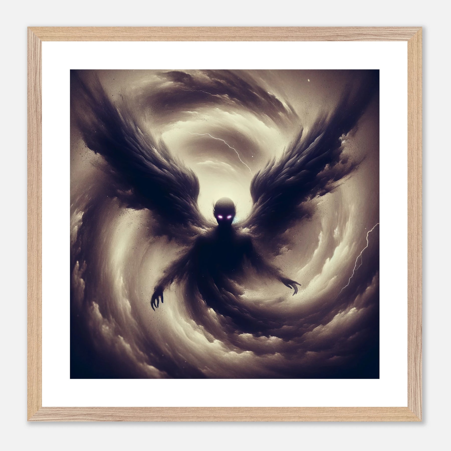 Gerahmtes Premium-Poster: Schattengeist mit Engelsflügeln, als Wolke in einem Sturm oder Hurrikan, düster und unheimlich, ideale Wandkunst für Horror-Enthusiasten und stimmungsvolle Räume