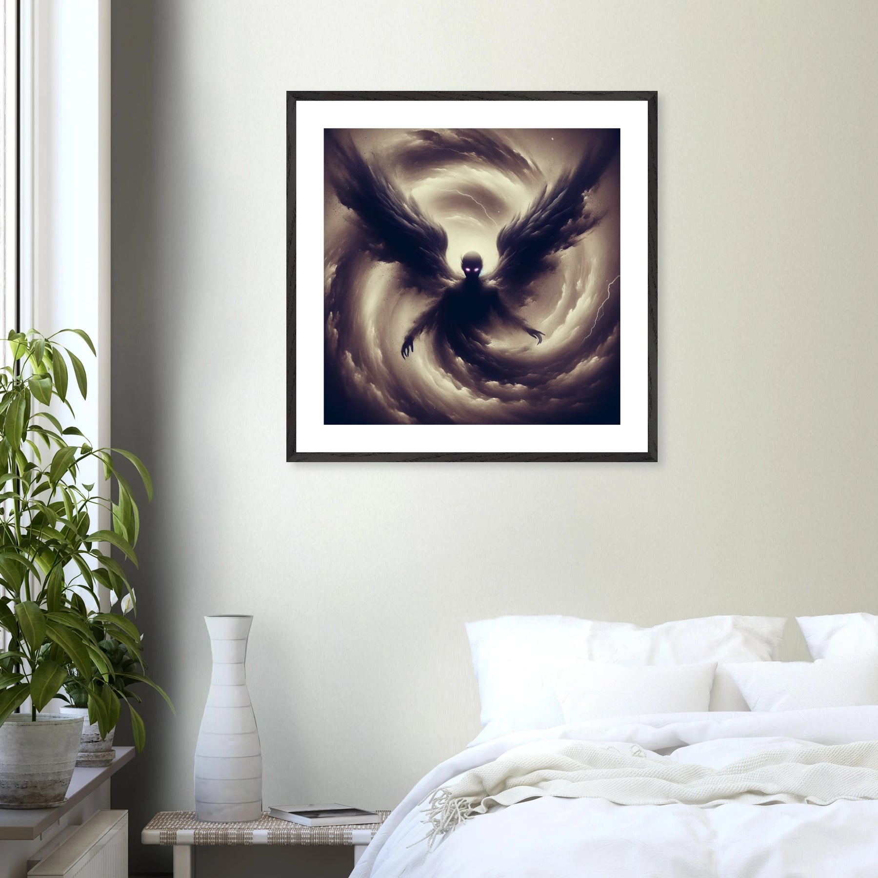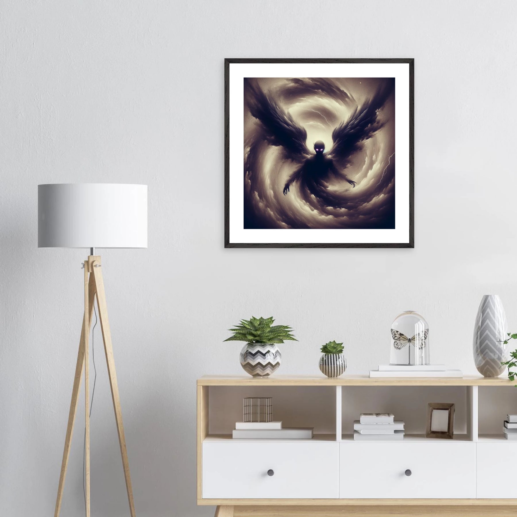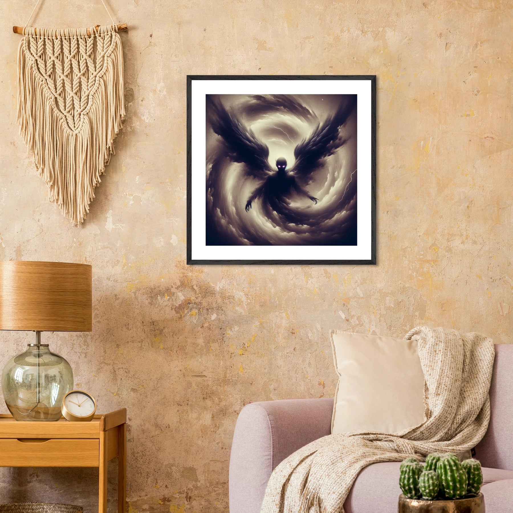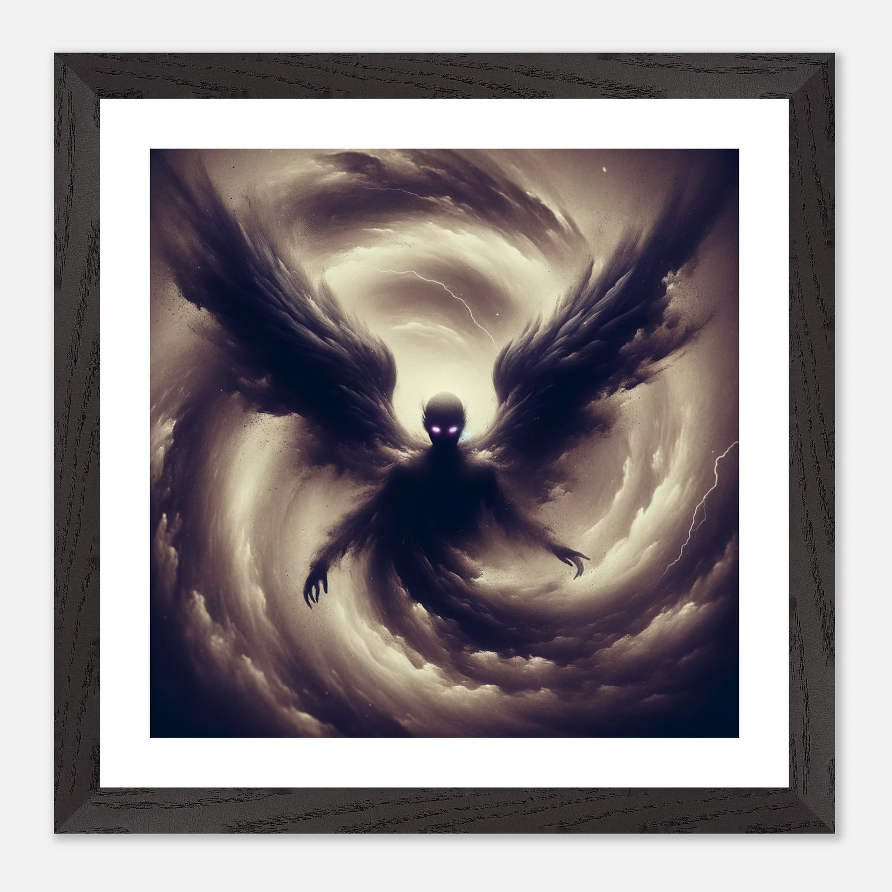 Gerahmtes Premium-Poster: Schattengeist mit Engelsflügeln, als Wolke in einem Sturm oder Hurrikan, düster und unheimlich, ideale Wandkunst für Horror-Enthusiasten und stimmungsvolle Räume