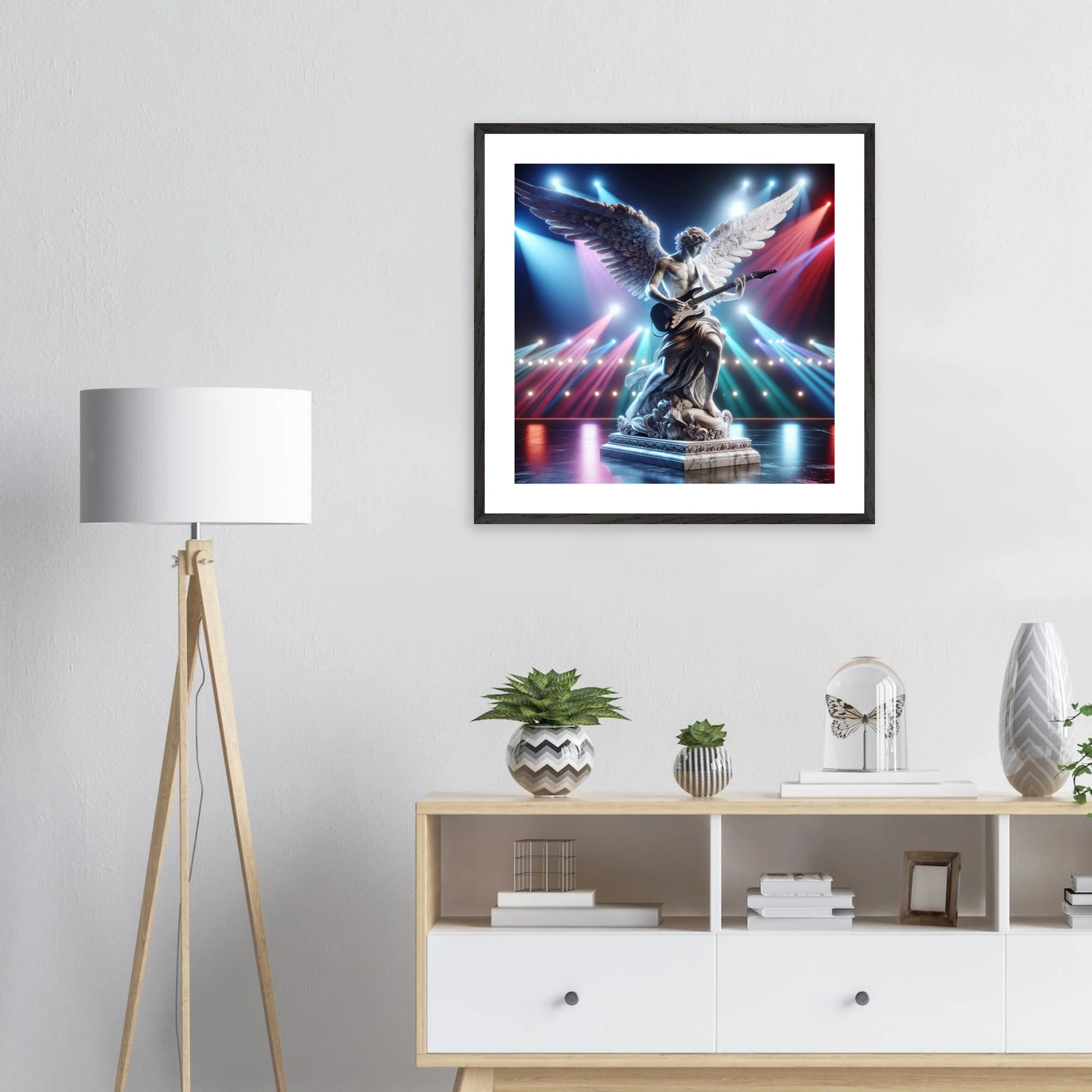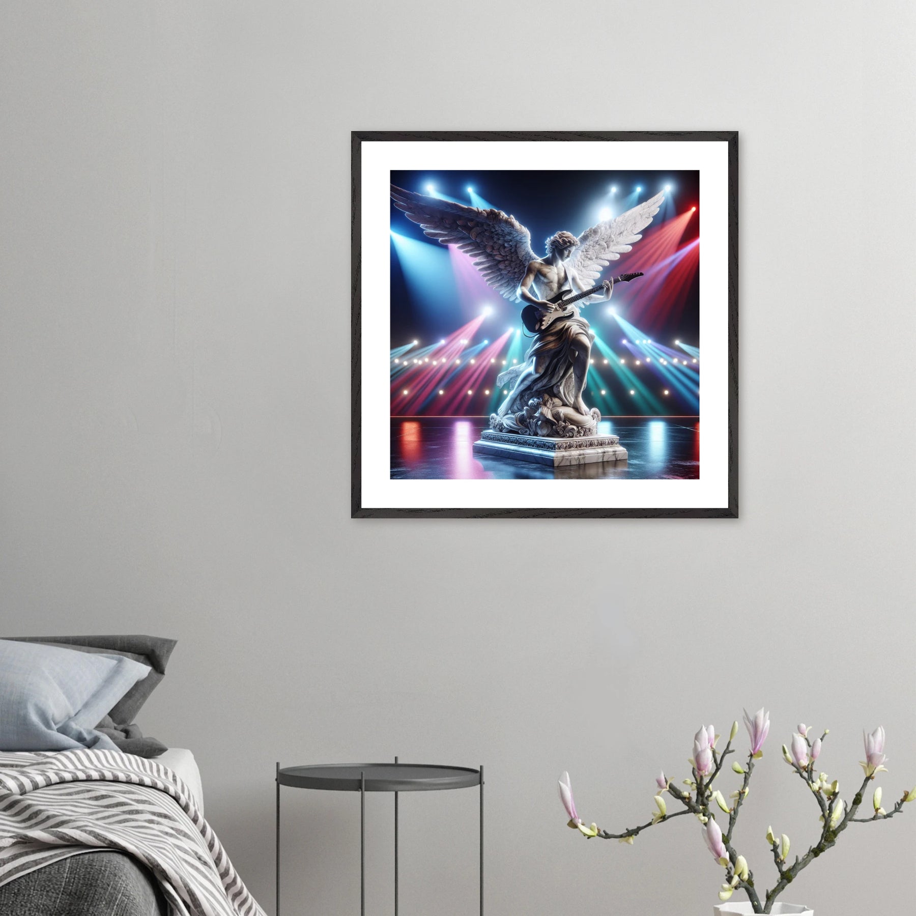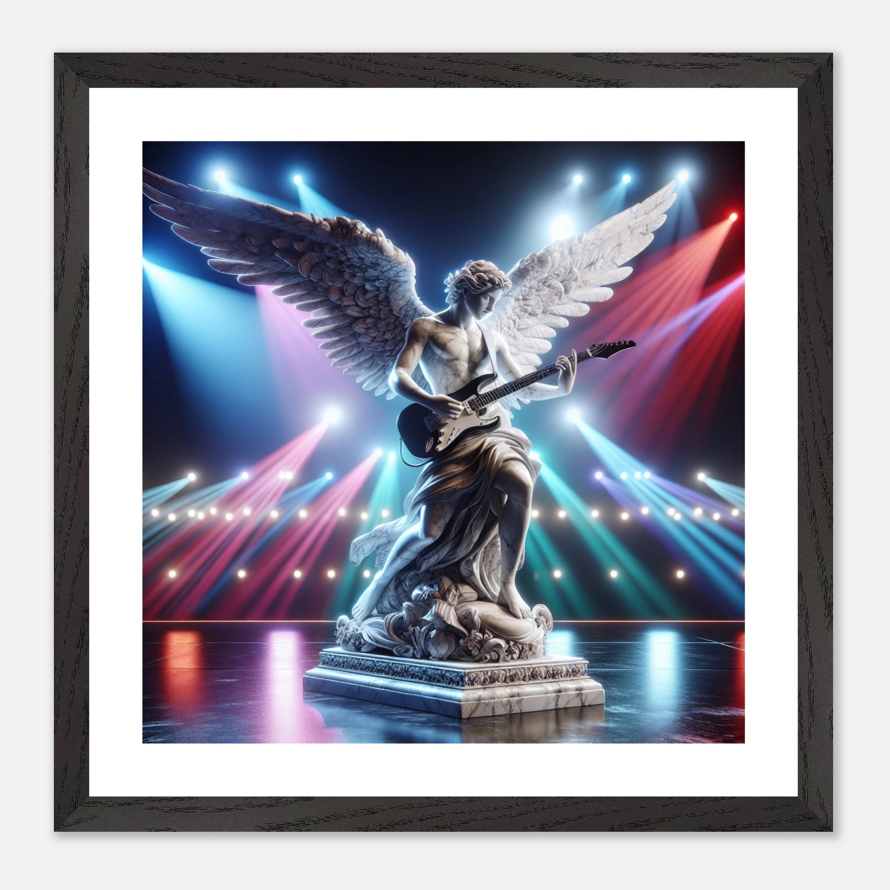 Premium Poster im Rahmen mit Engel als Marmorstatue mit E-Gitarre – epischer Rockstil auf Bühnenlicht | Dreaming Wings