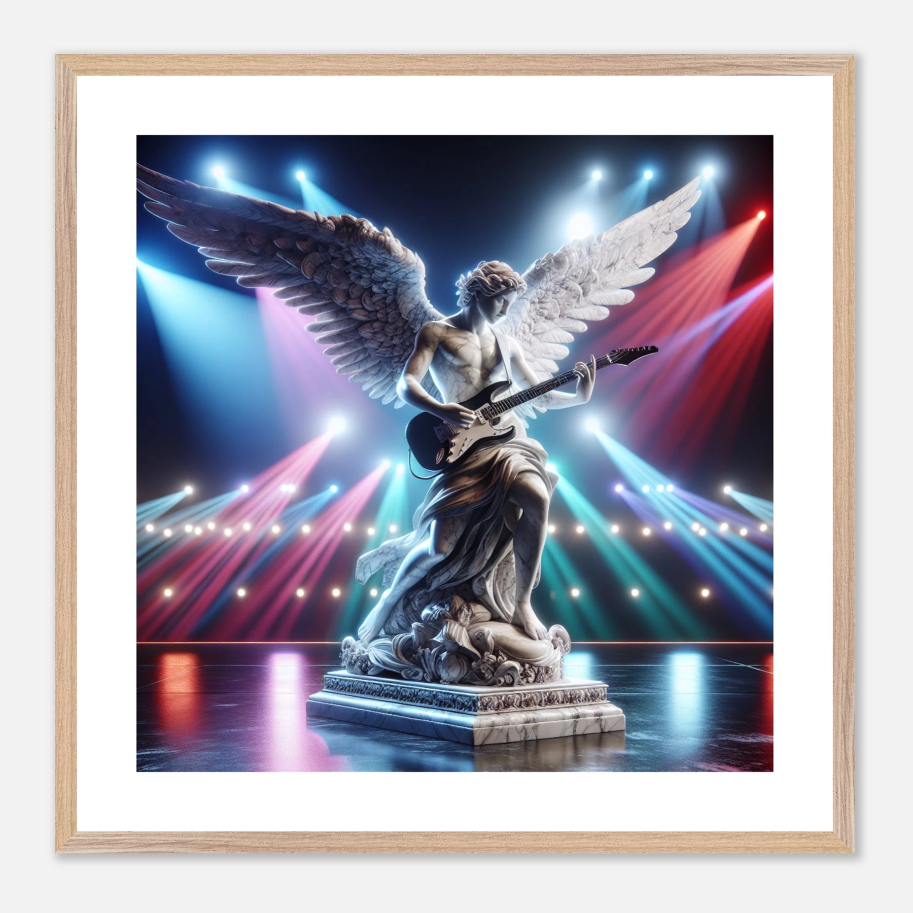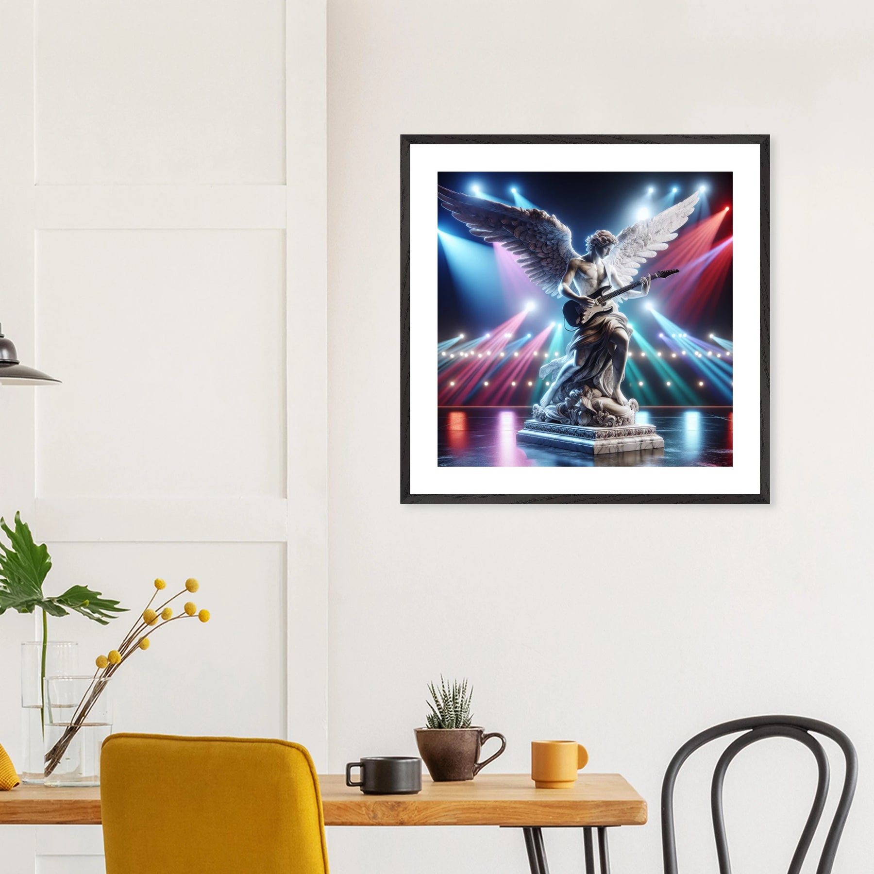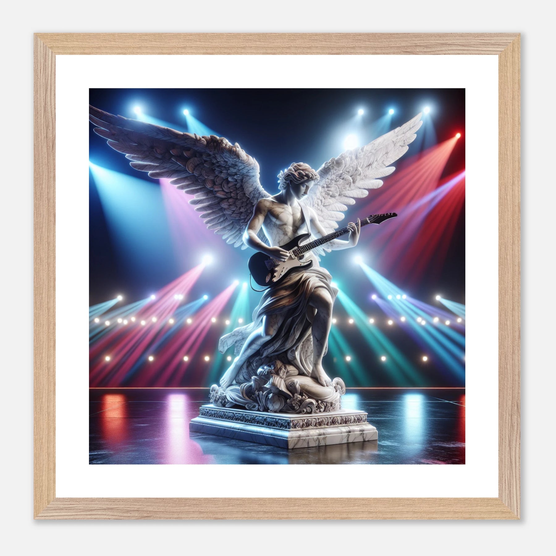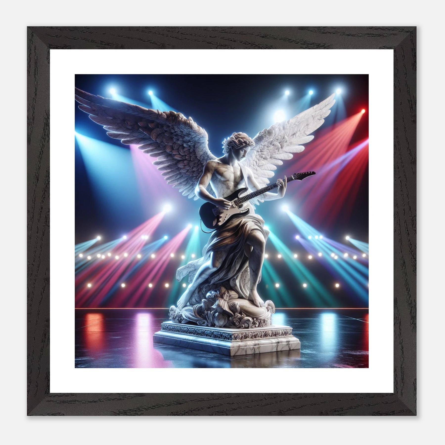 Premium Poster im Rahmen mit Engel als Marmorstatue mit E-Gitarre – epischer Rockstil auf Bühnenlicht | Dreaming Wings