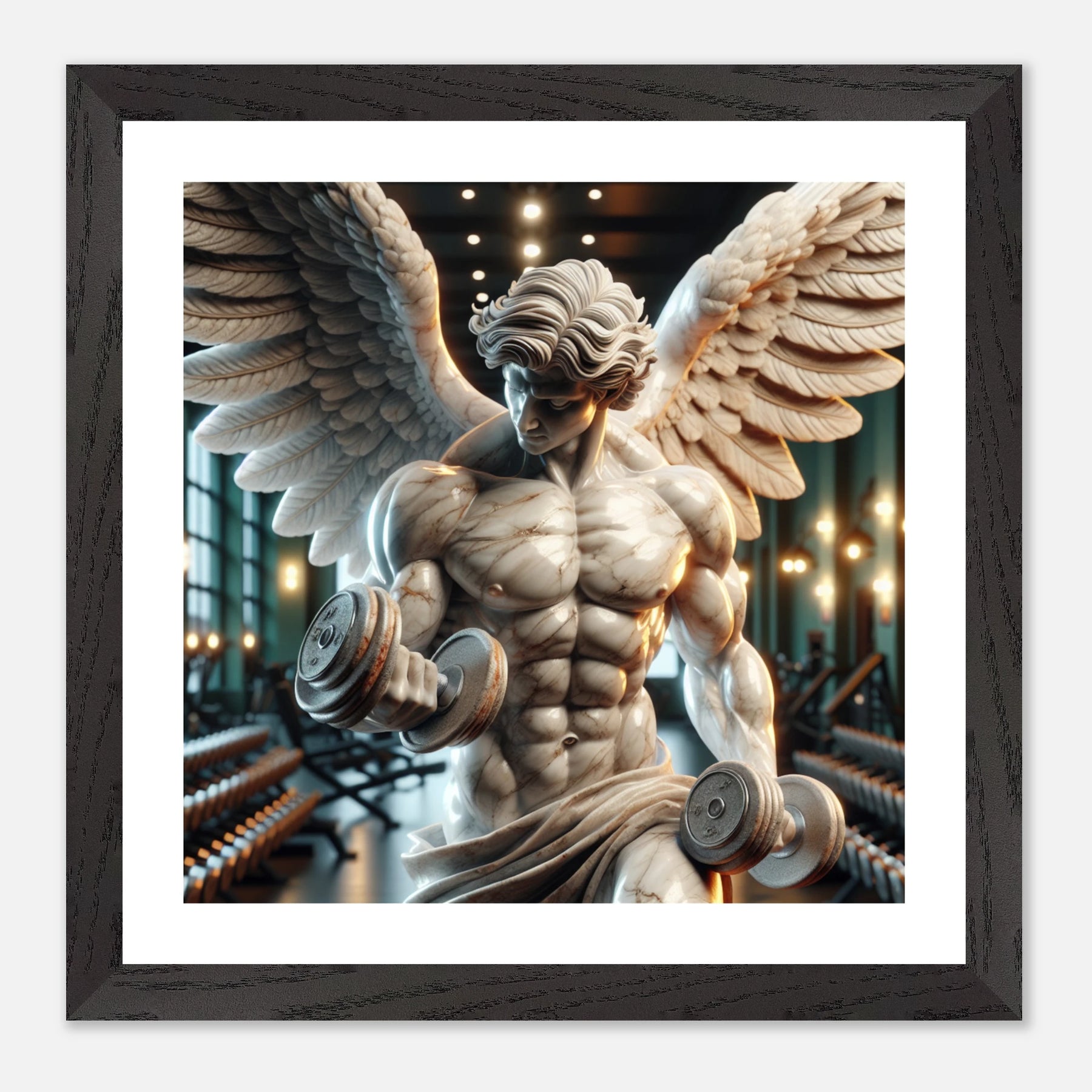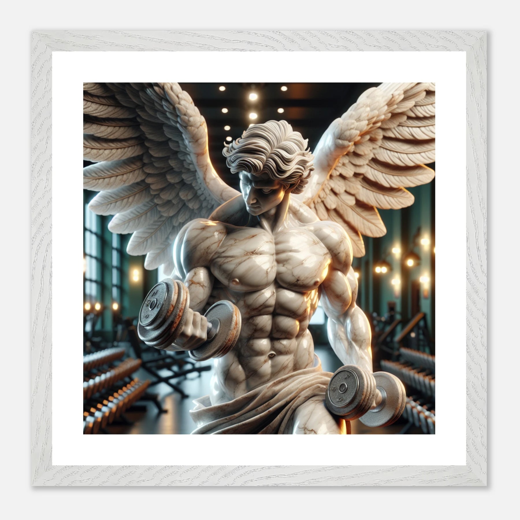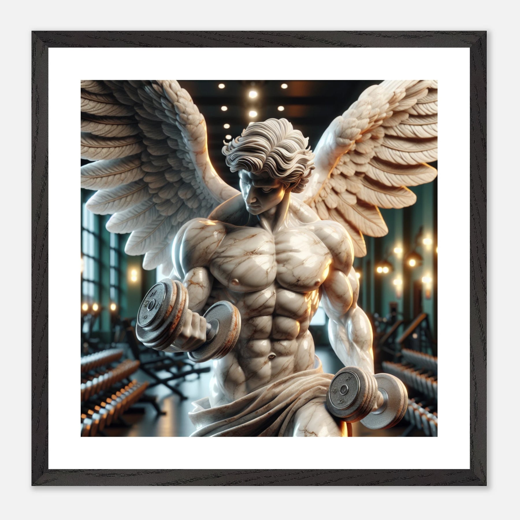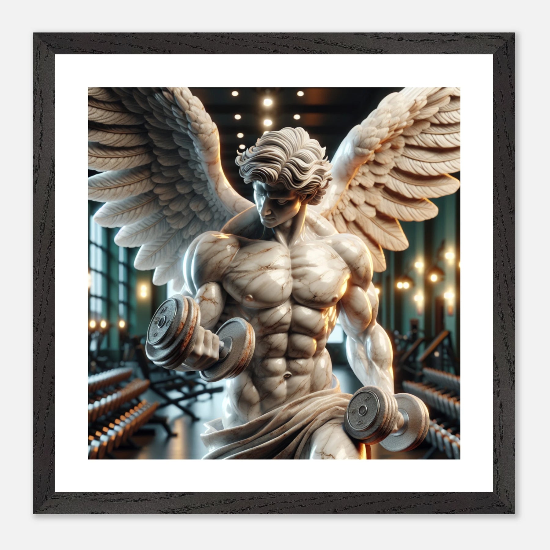 Premium Poster im Rahmen mit muskulösen Engel als Marmorstatue mit Hantel im Gym – sportliche Motivation im Fitnessstudio | Dreaming Wings