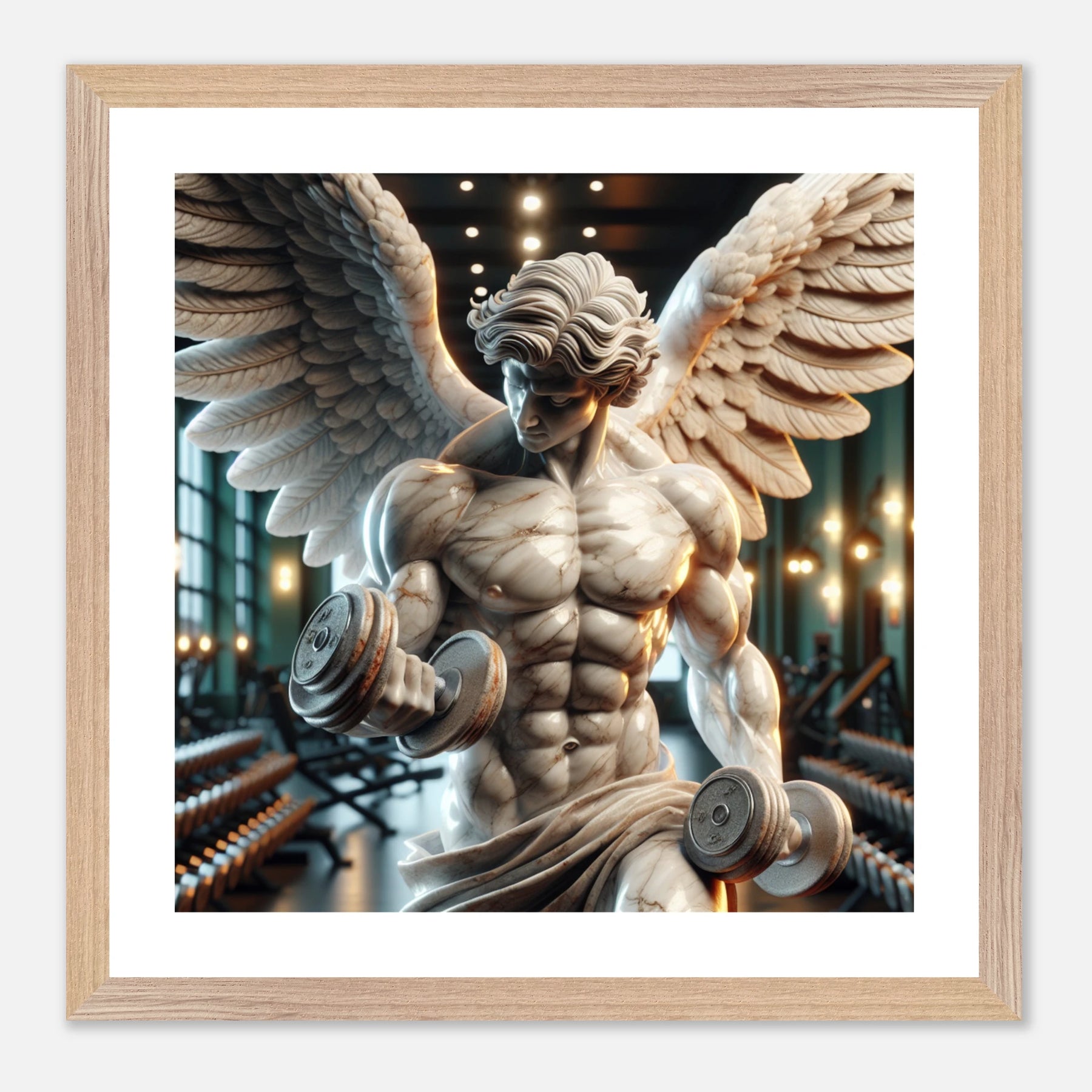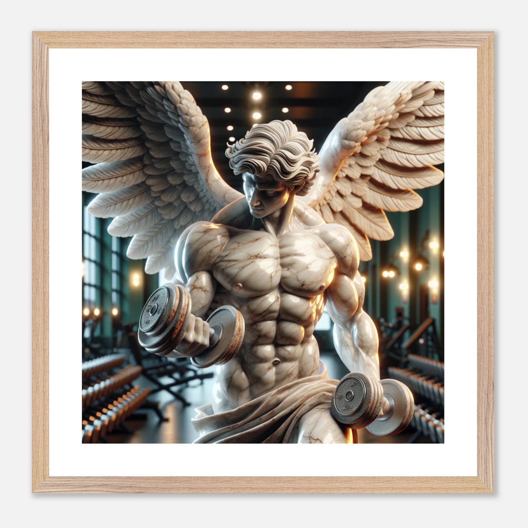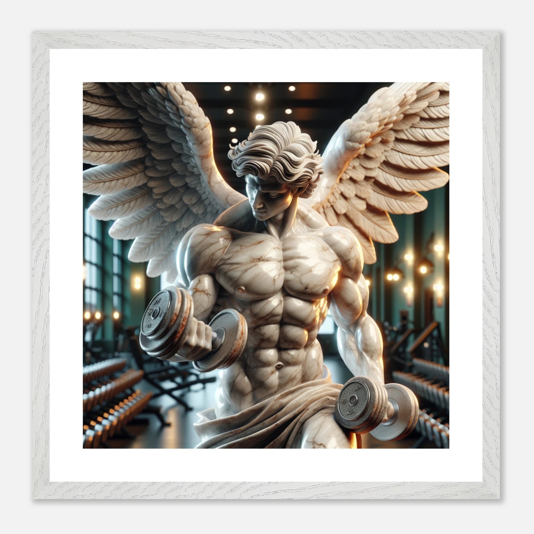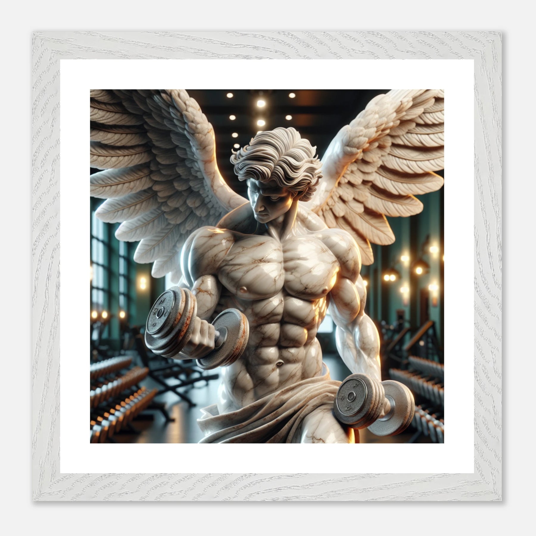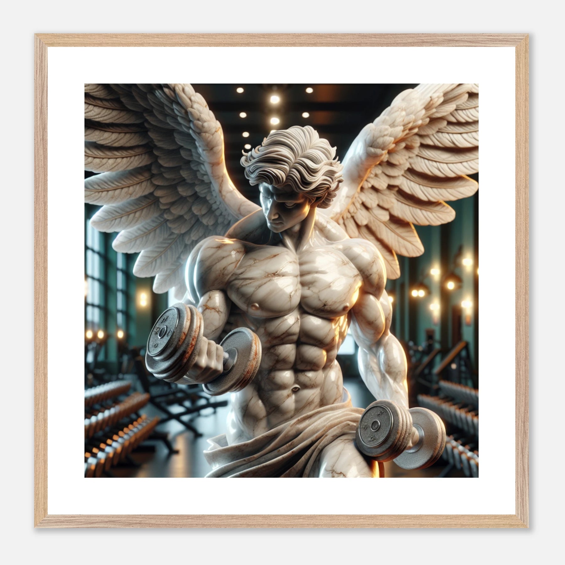 Premium Poster im Rahmen mit muskulösen Engel als Marmorstatue mit Hantel im Gym – sportliche Motivation im Fitnessstudio | Dreaming Wings