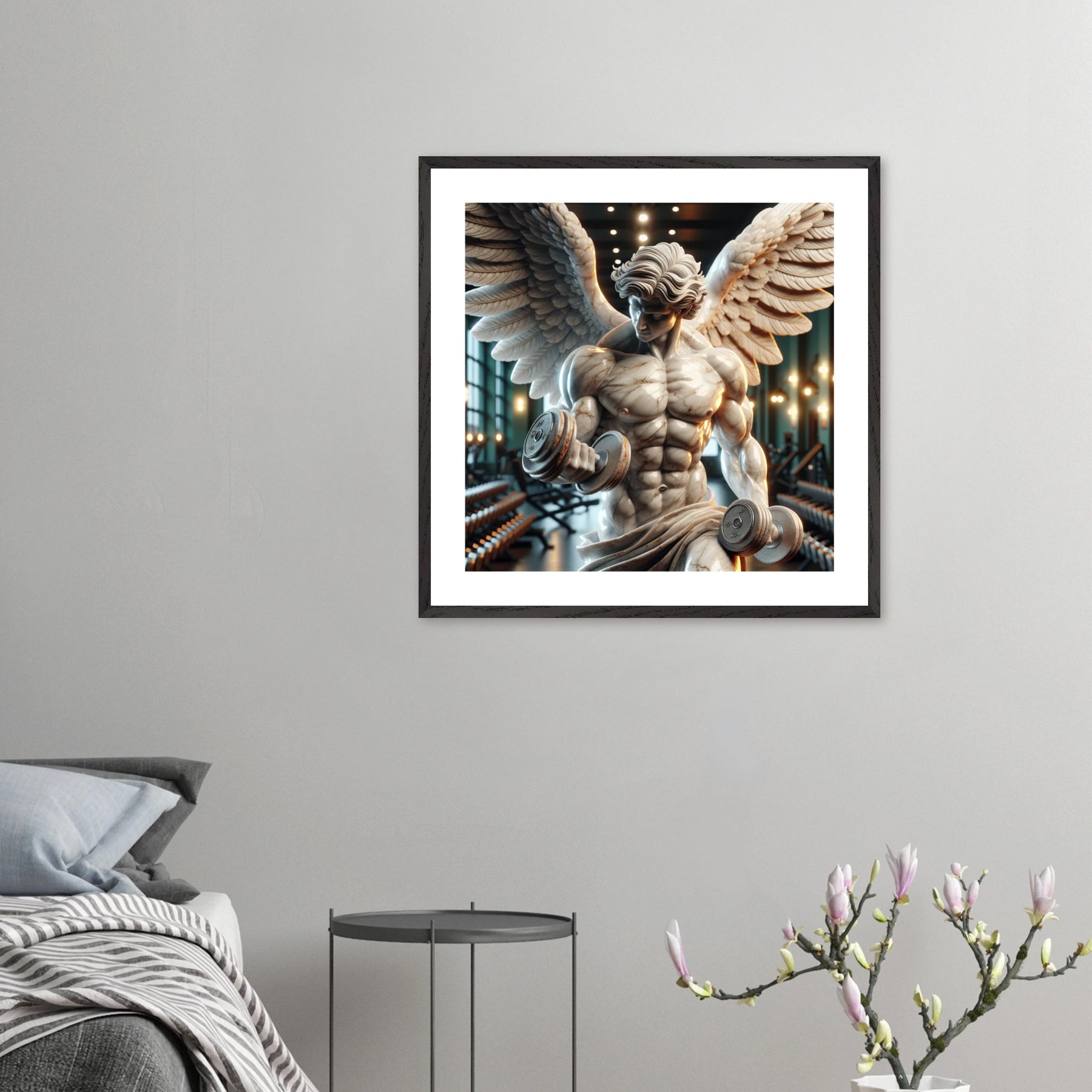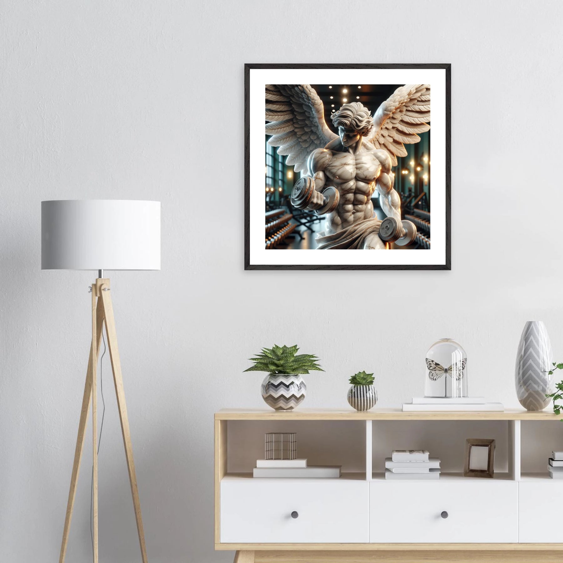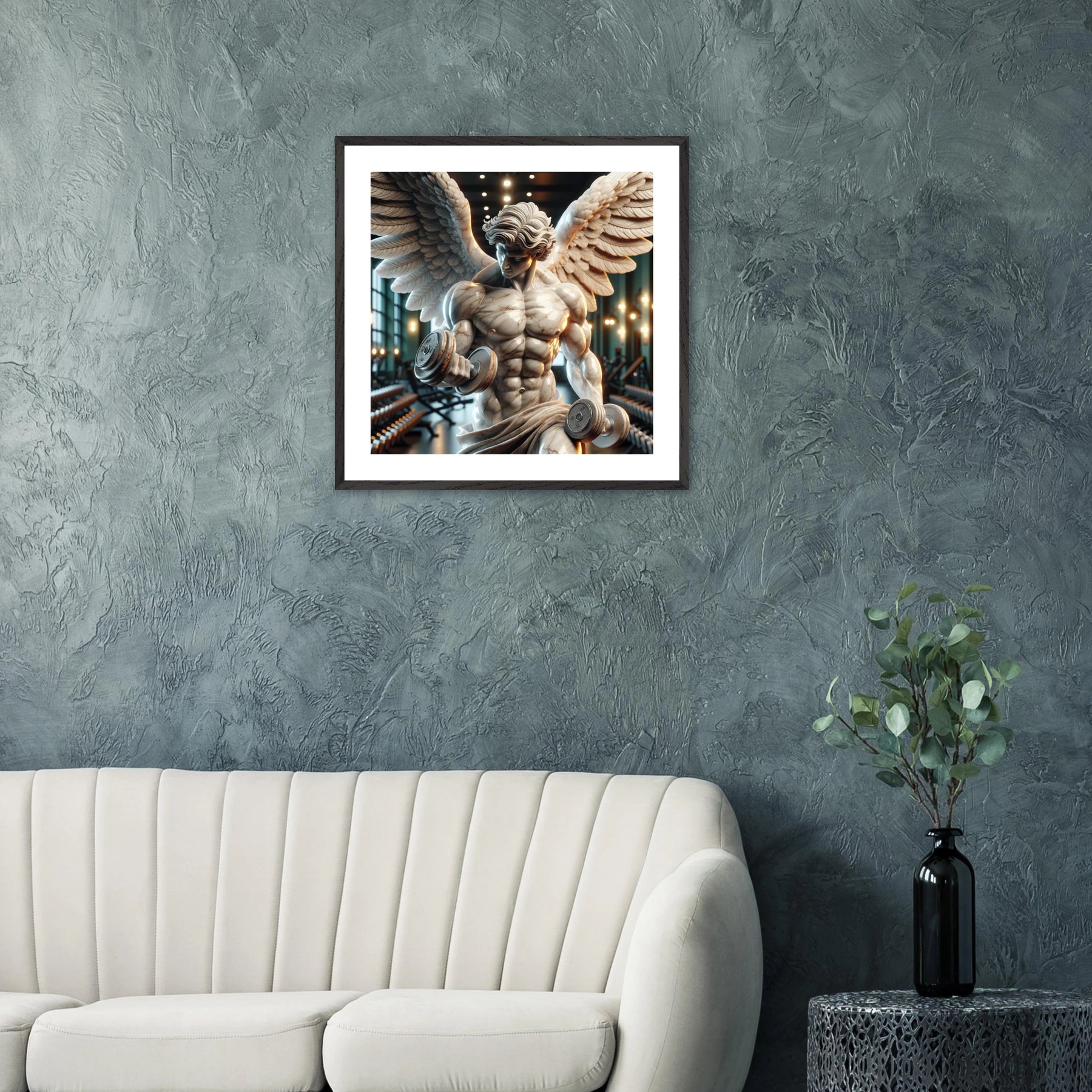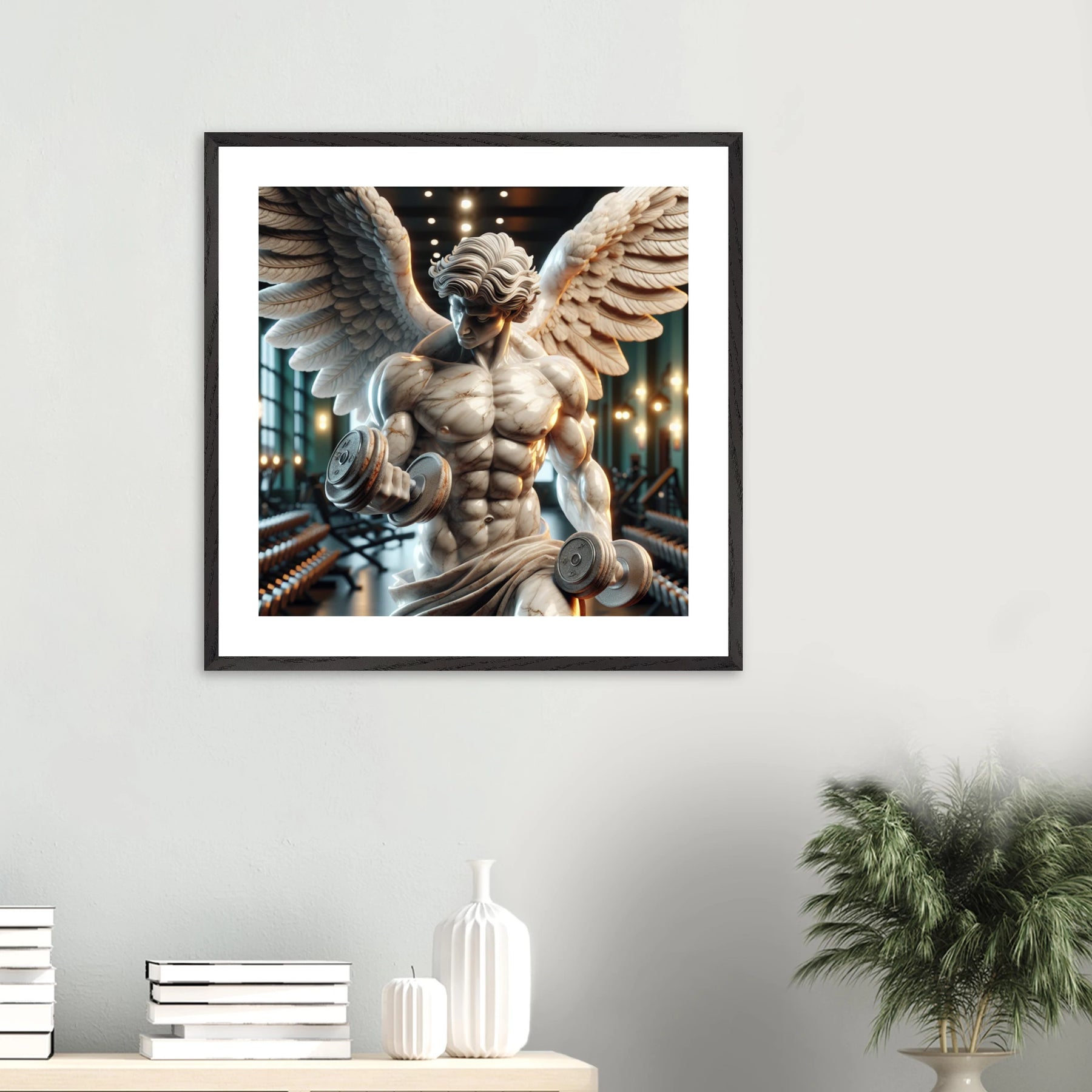 Premium Poster im Rahmen mit muskulösen Engel als Marmorstatue mit Hantel im Gym – sportliche Motivation im Fitnessstudio | Dreaming Wings