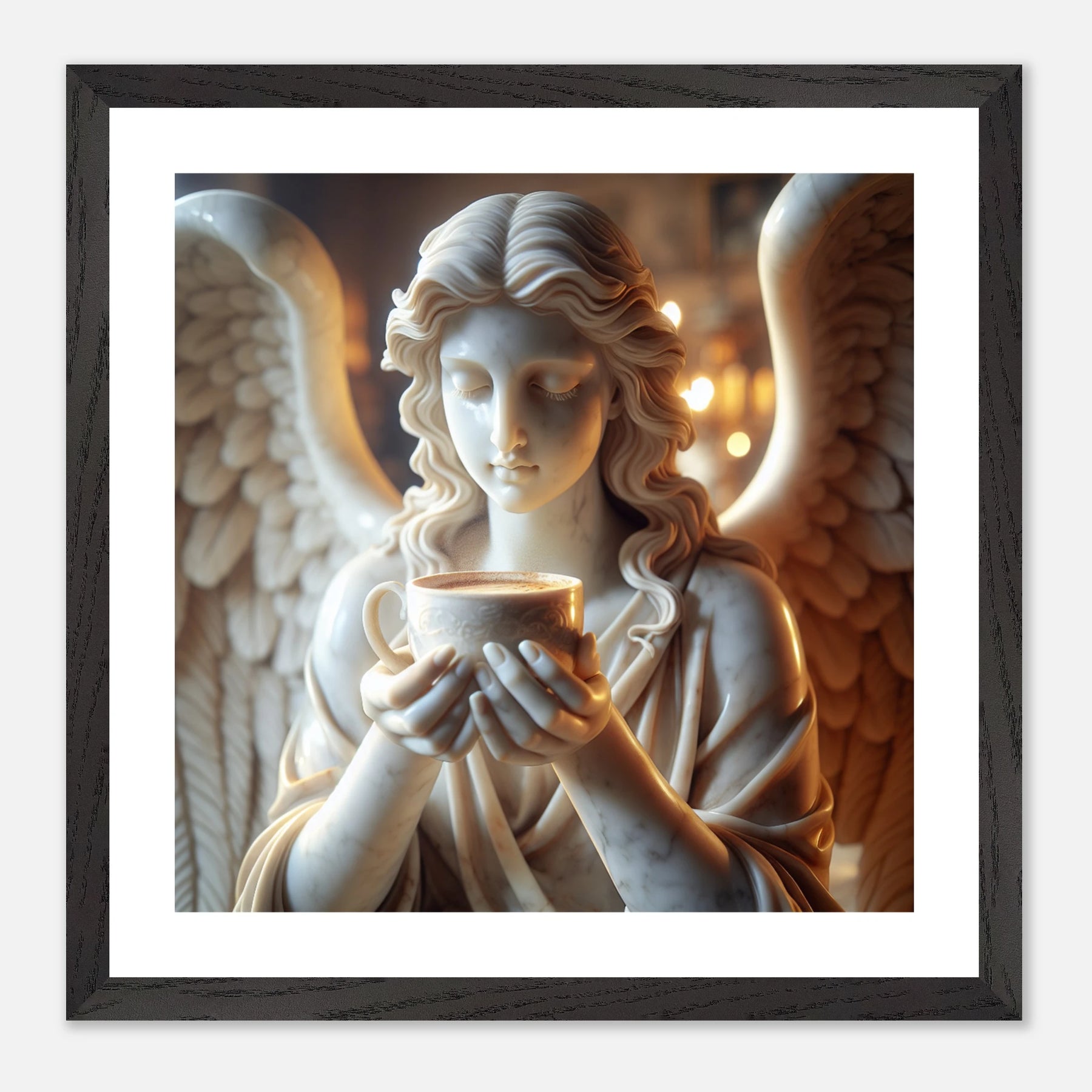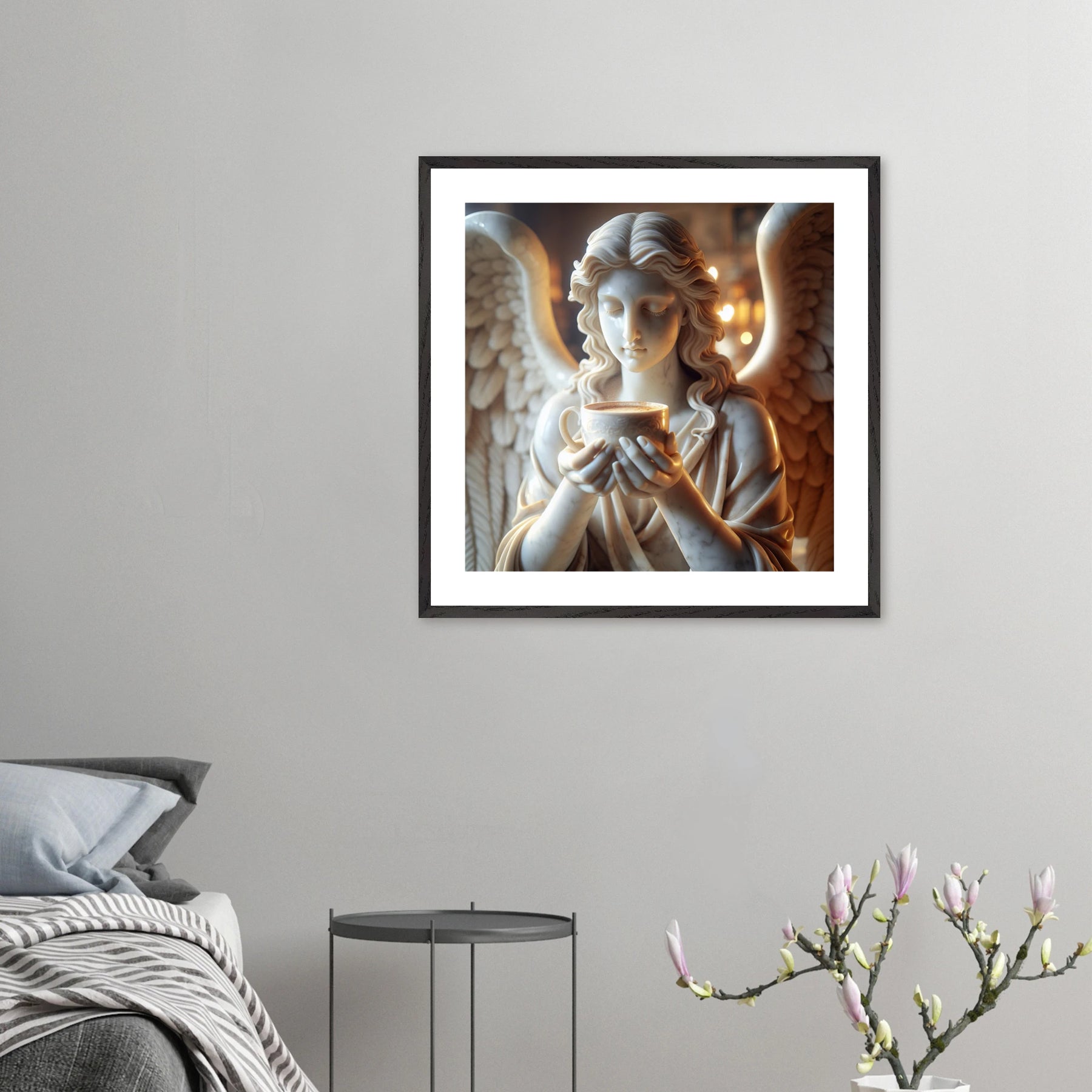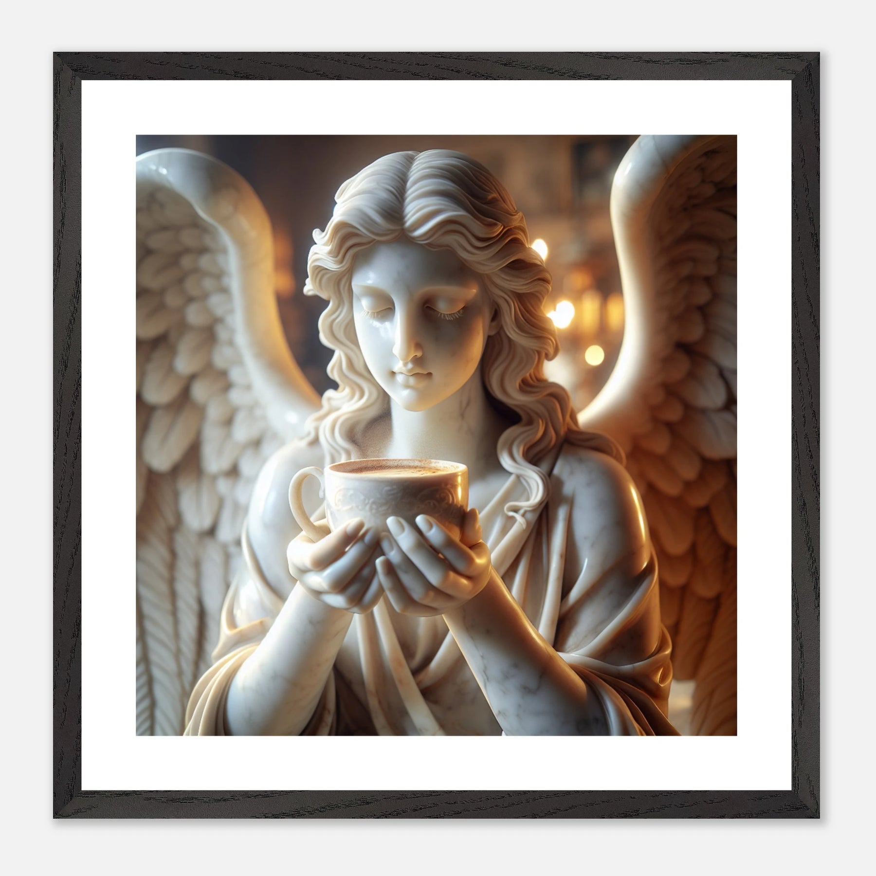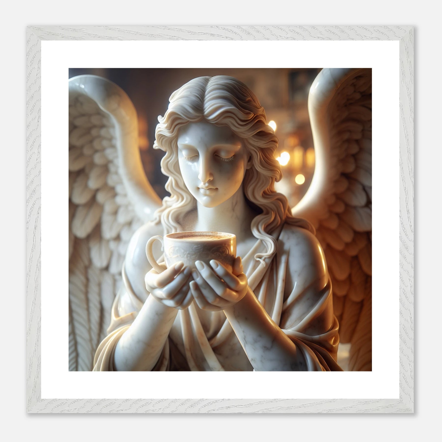Premium Poster im Rahmen mit Marmorengel und Kaffeetasse – moderne Ruhe & spirituelle Ästhetik für dein Zuhause | Dreaming Wings