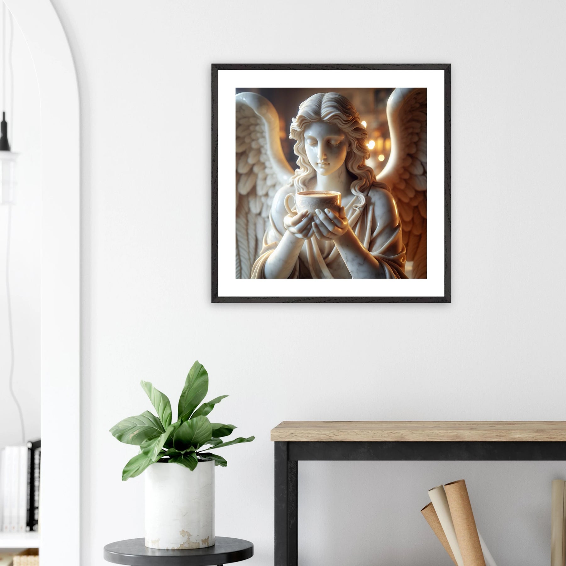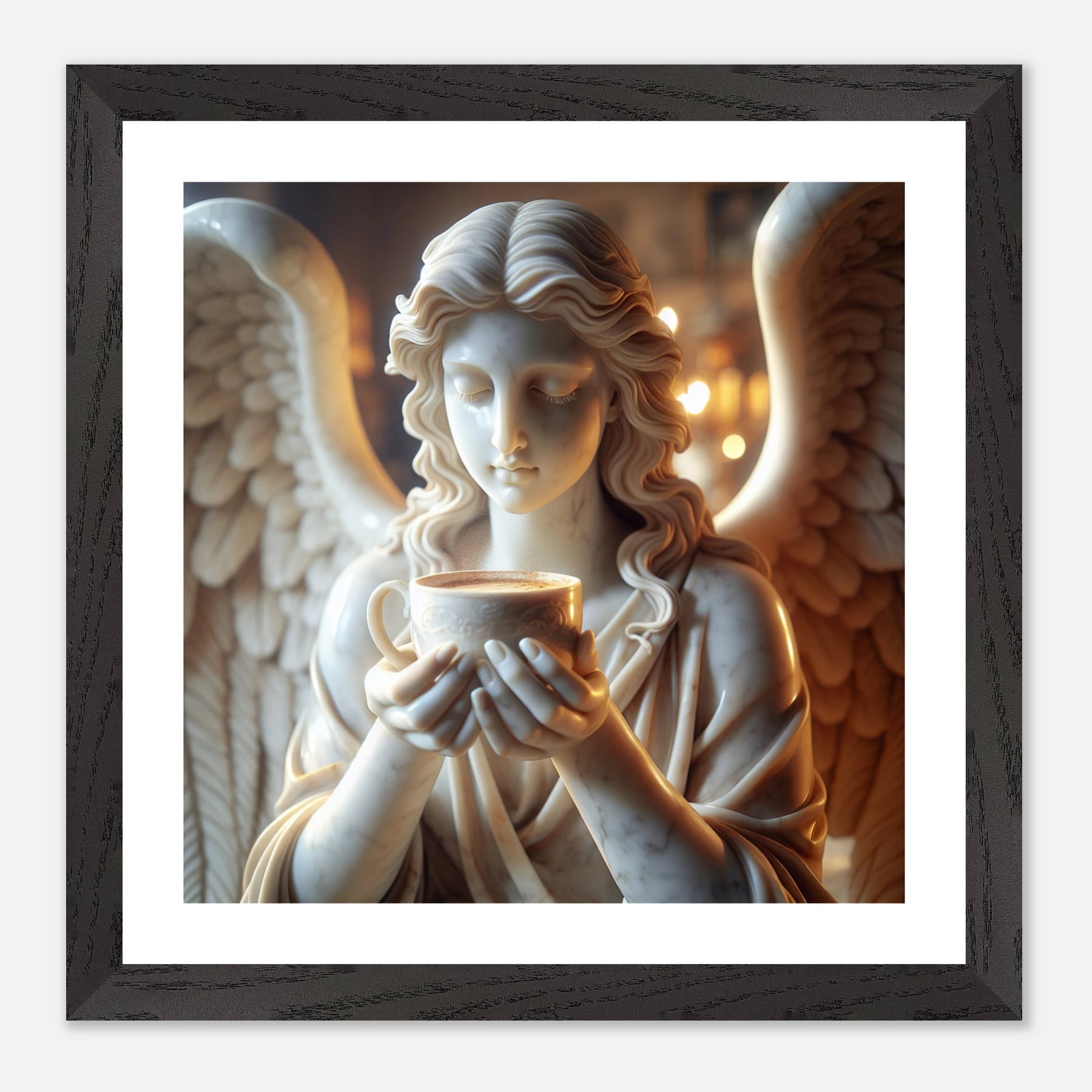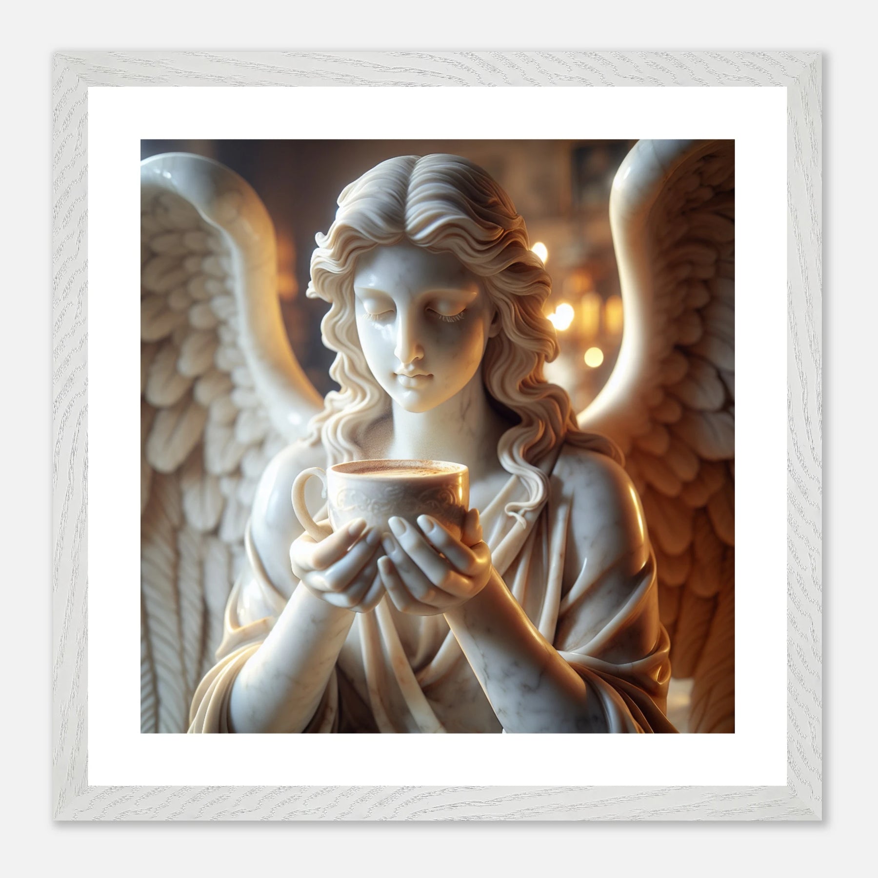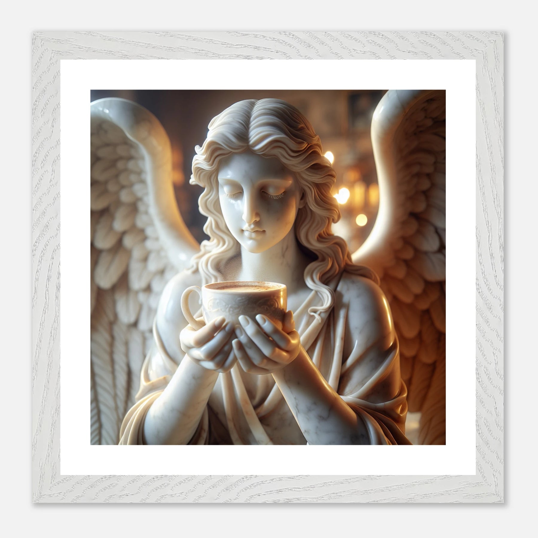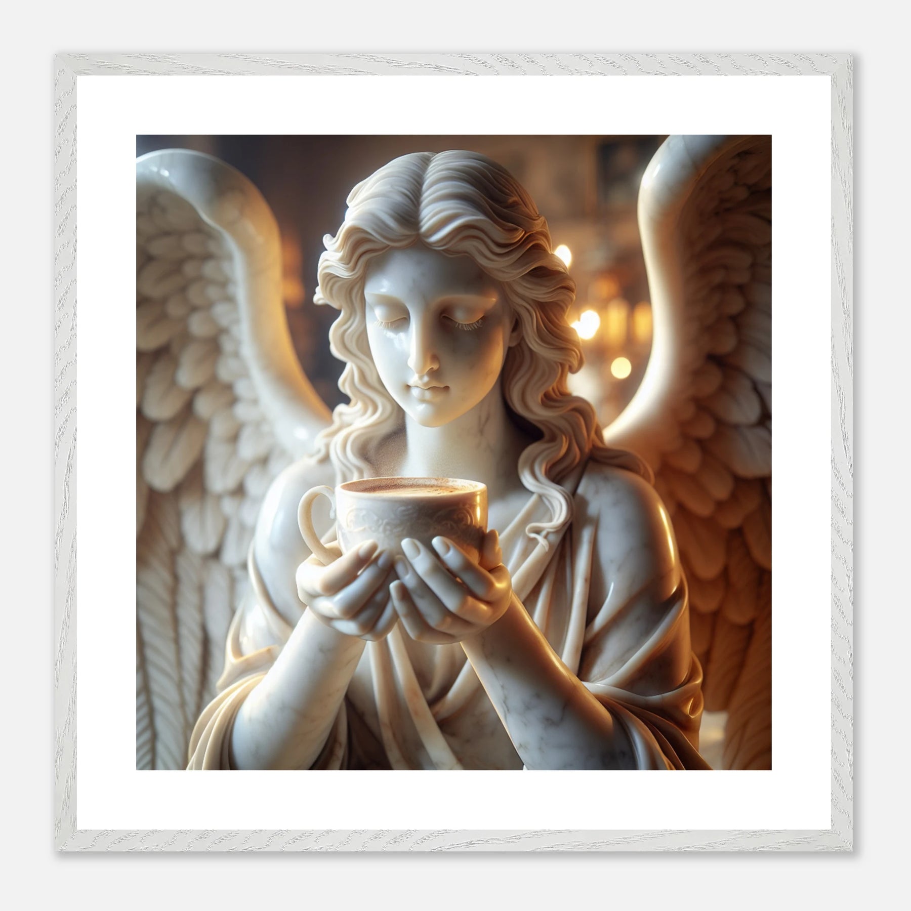 Premium Poster im Rahmen mit Marmorengel und Kaffeetasse – moderne Ruhe & spirituelle Ästhetik für dein Zuhause | Dreaming Wings