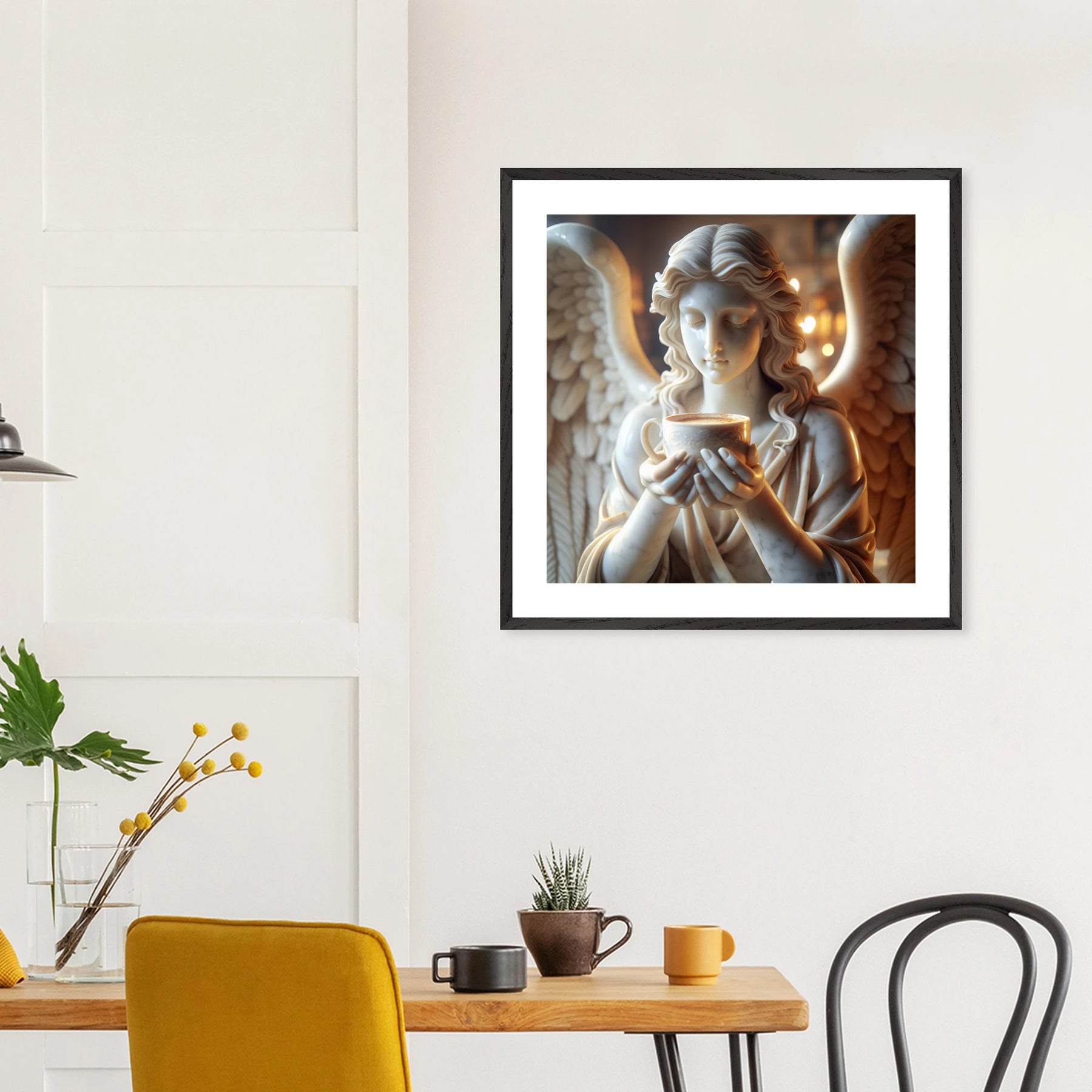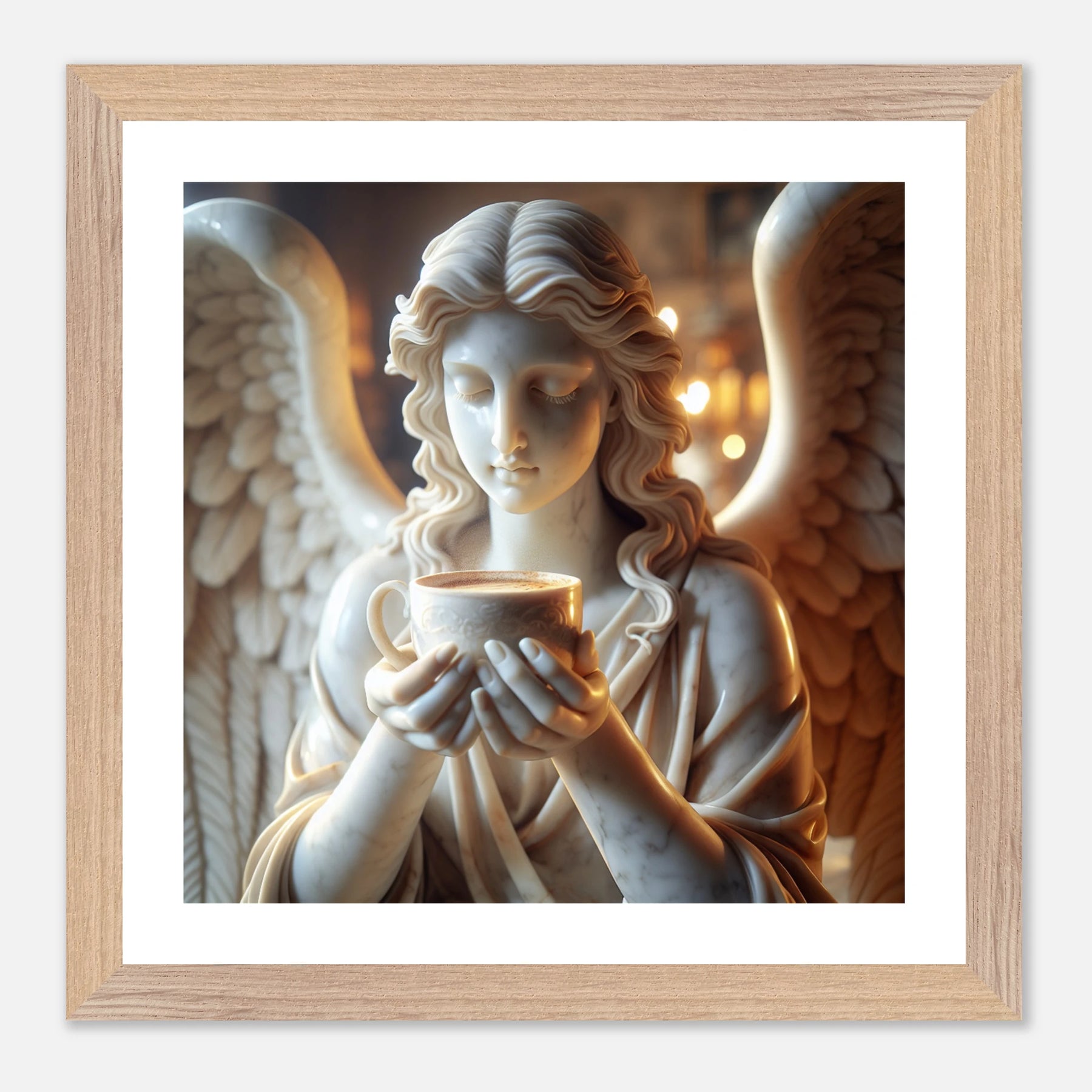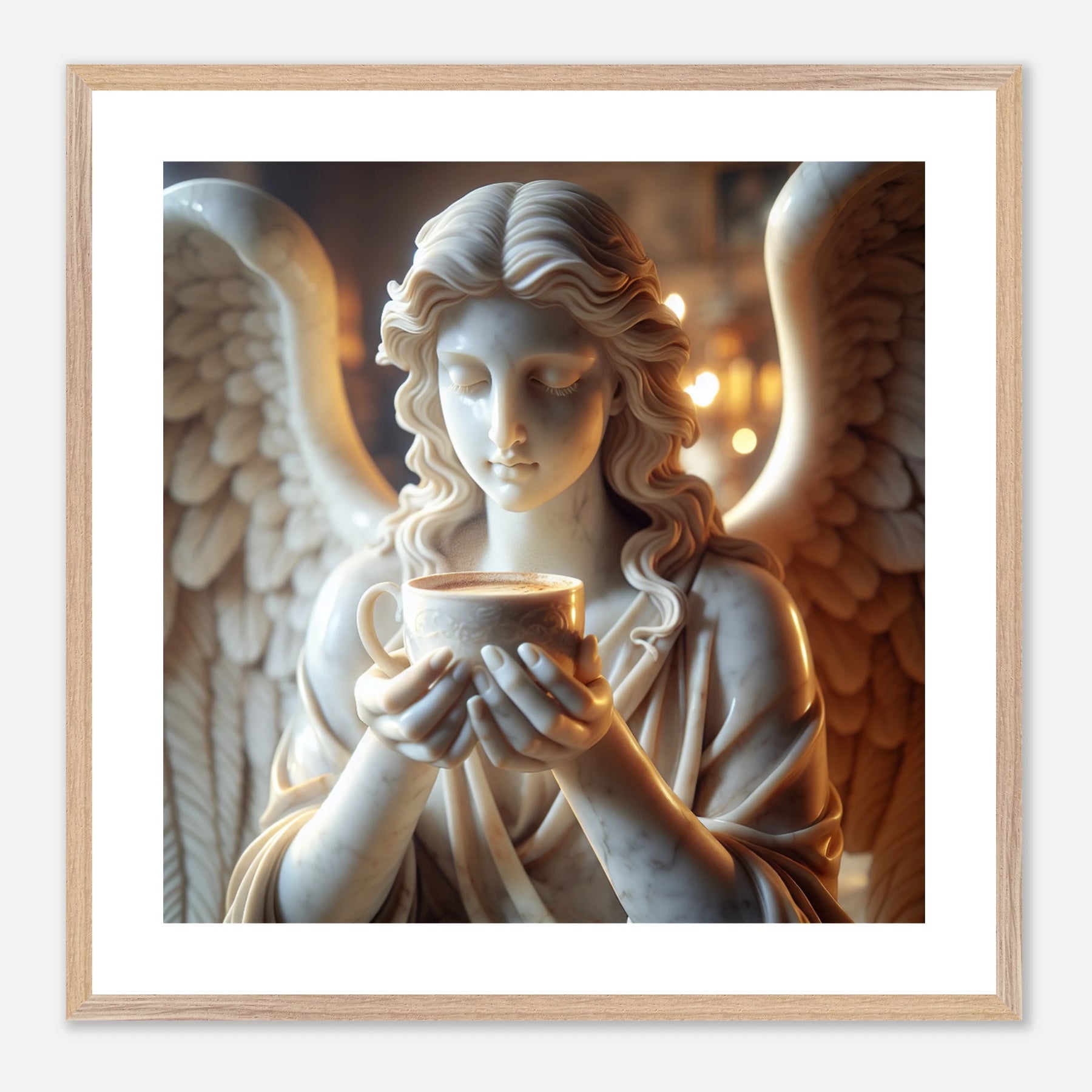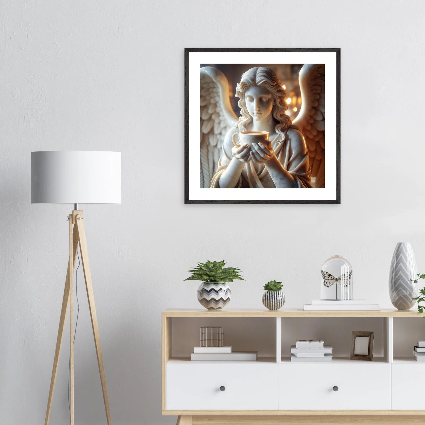 Premium Poster im Rahmen mit Marmorengel und Kaffeetasse – moderne Ruhe & spirituelle Ästhetik für dein Zuhause | Dreaming Wings