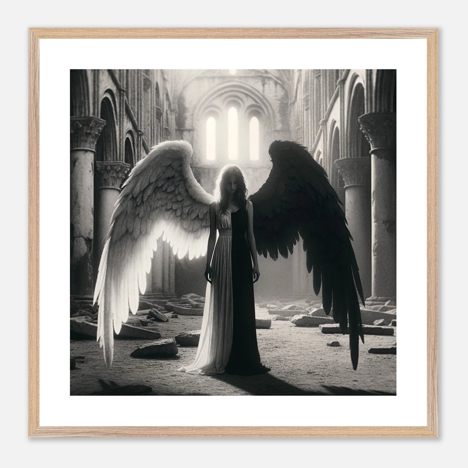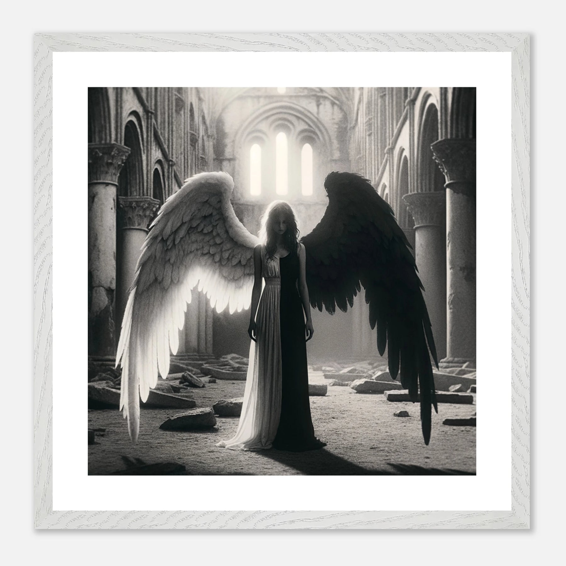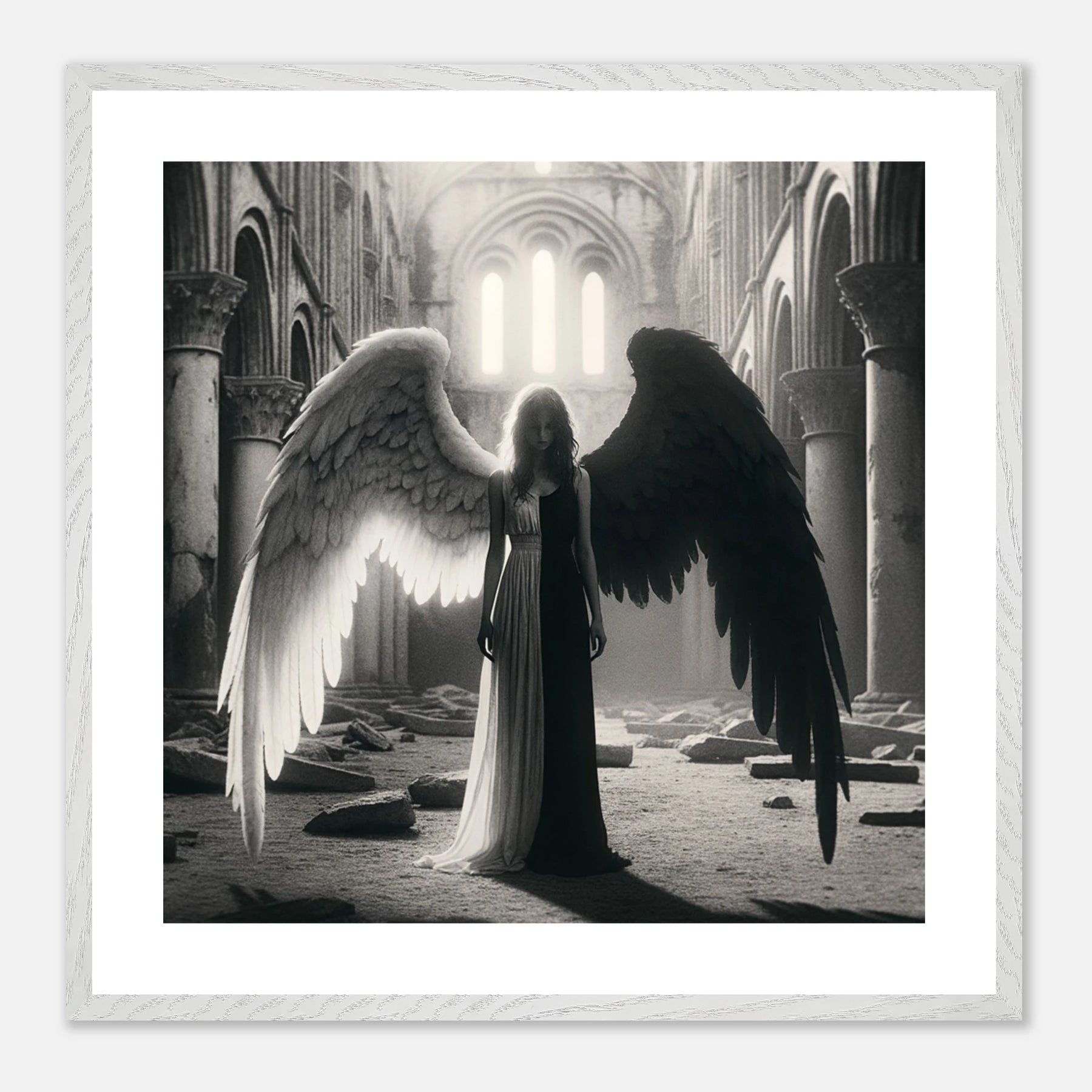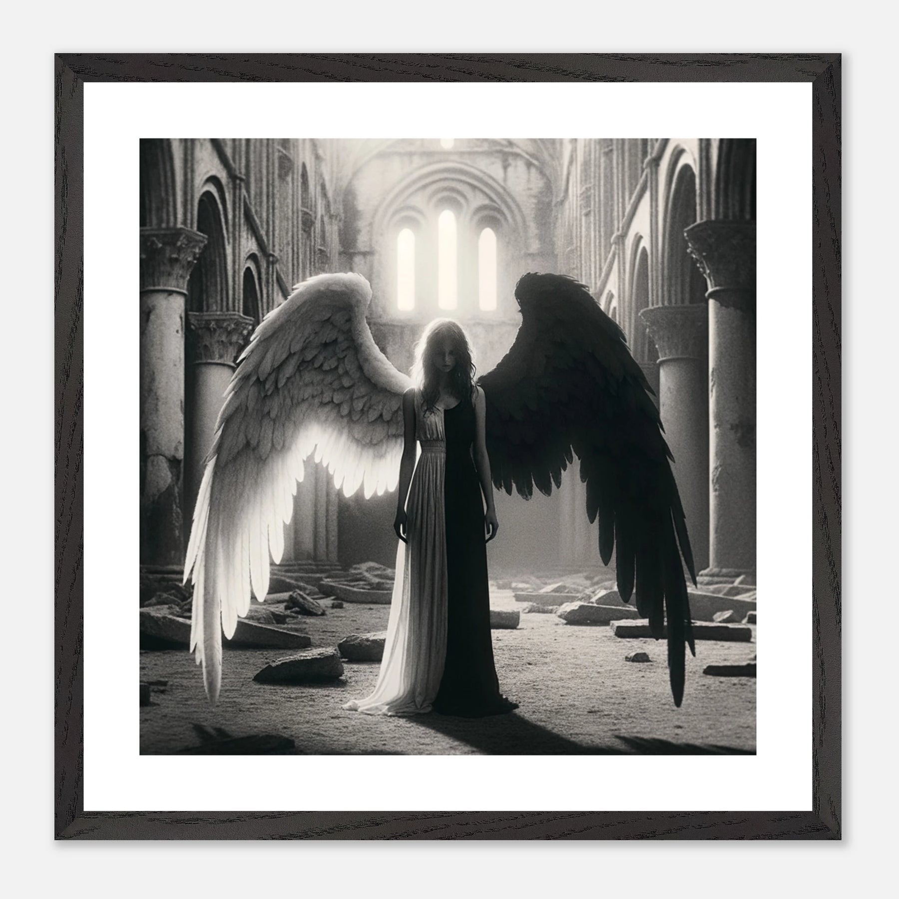 Gerahmtes Premium-Poster: Schwarz-weißer Engel in den Ruinen einer Kirche, schwarzer Teil steht für Zerstörung und Böses, weißer Teil für Hoffnung und Überwindung, ideale Wandkunst für Meditationsräume und spirituelle Zentren