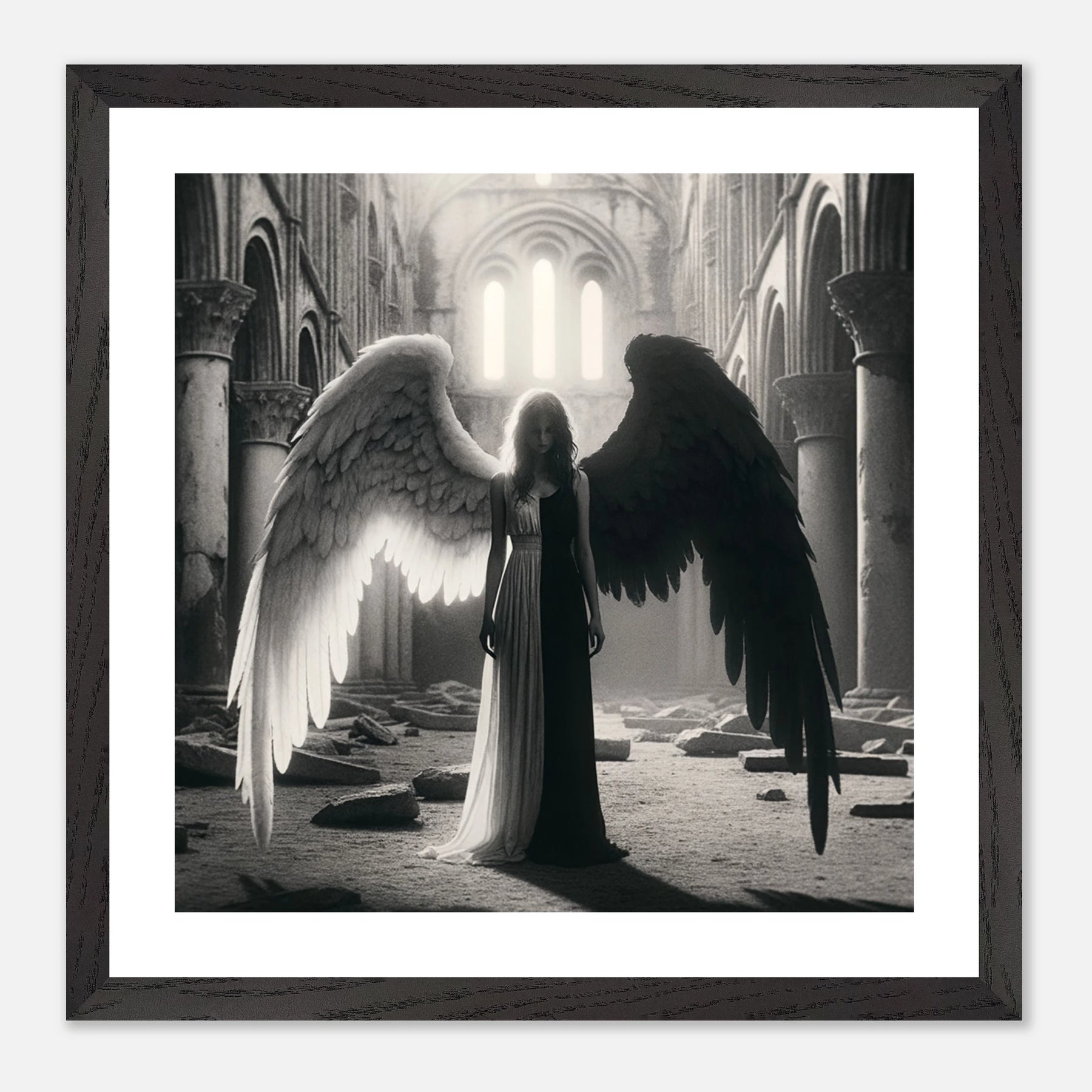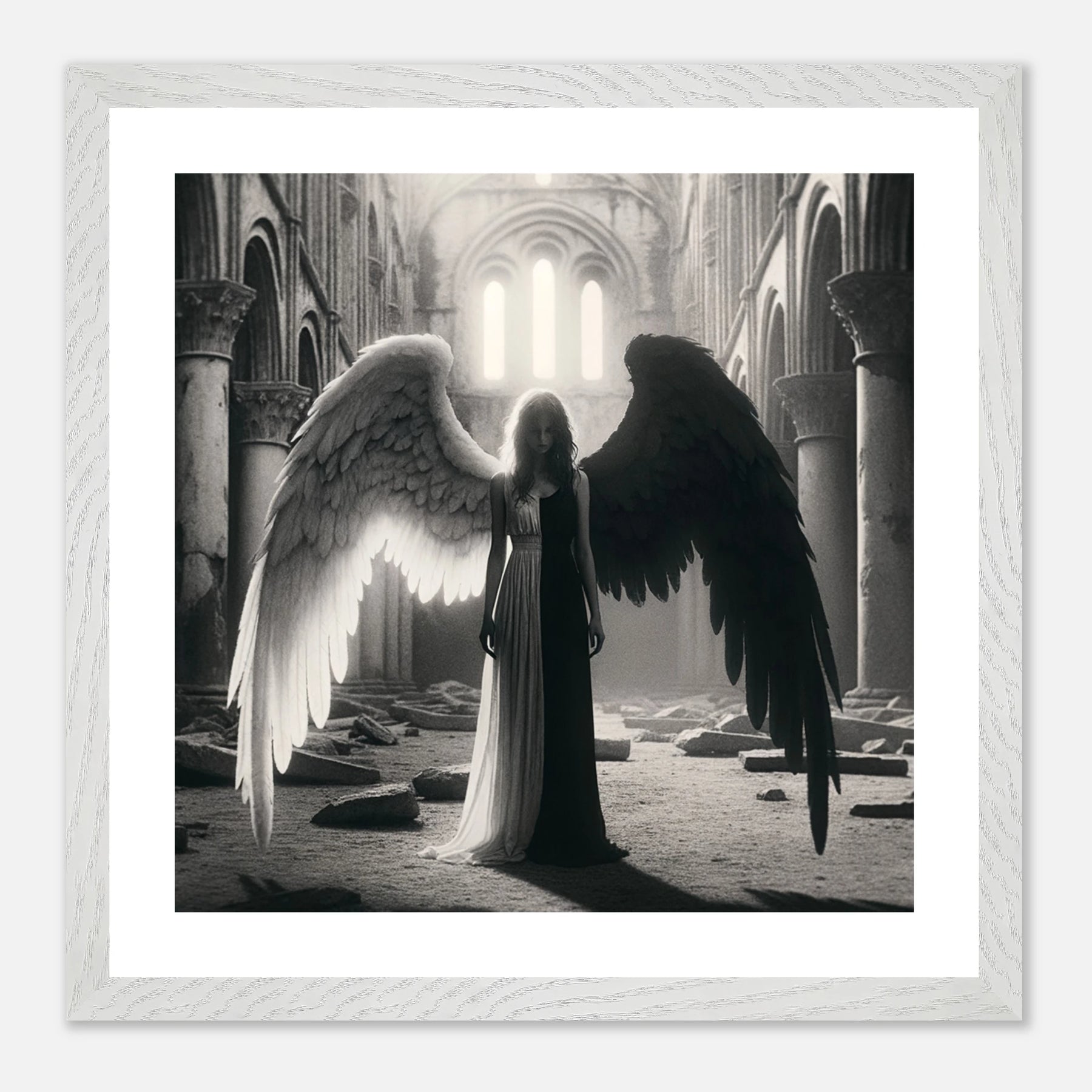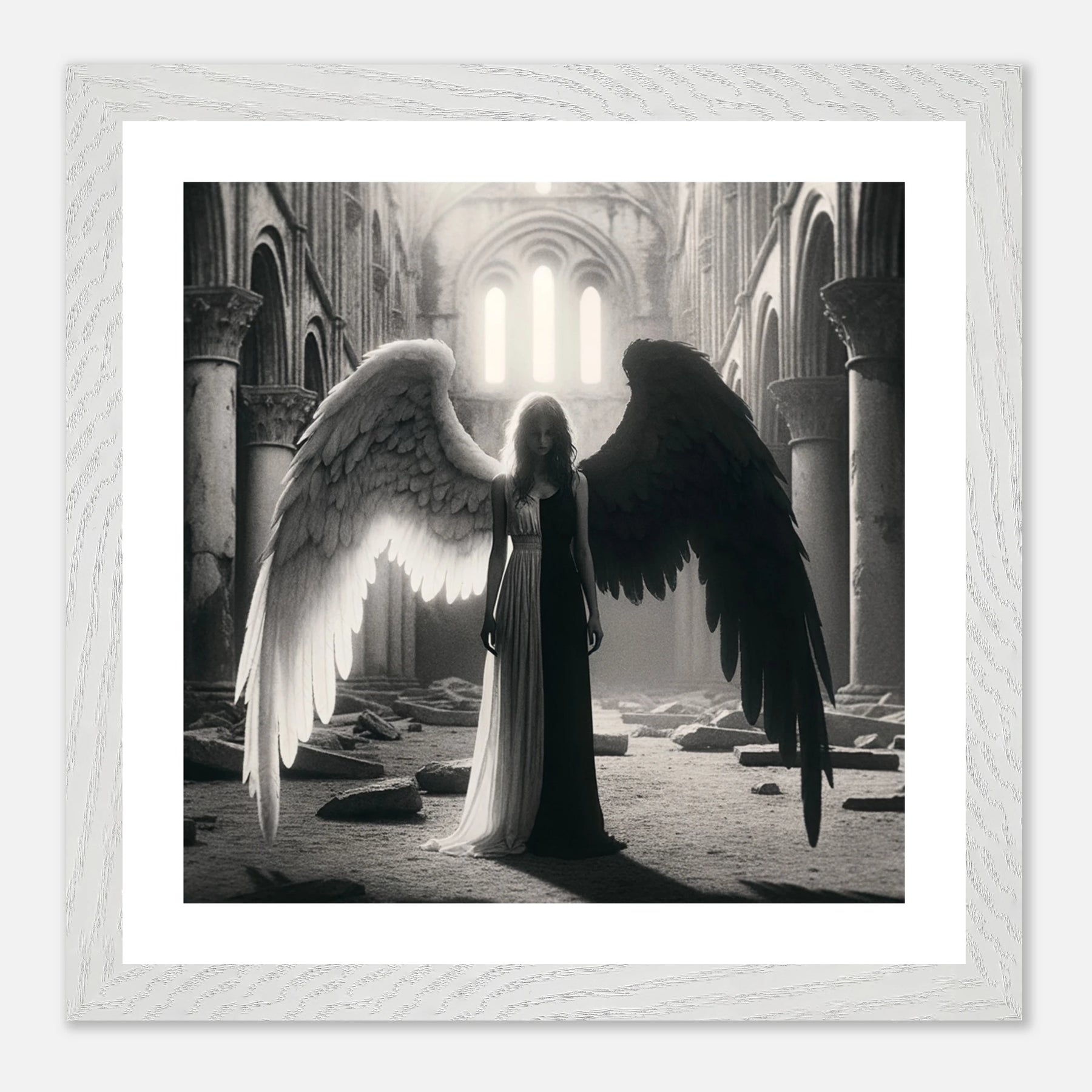Gerahmtes Premium-Poster: Schwarz-weißer Engel in den Ruinen einer Kirche, schwarzer Teil steht für Zerstörung und Böses, weißer Teil für Hoffnung und Überwindung, ideale Wandkunst für Meditationsräume und spirituelle Zentren