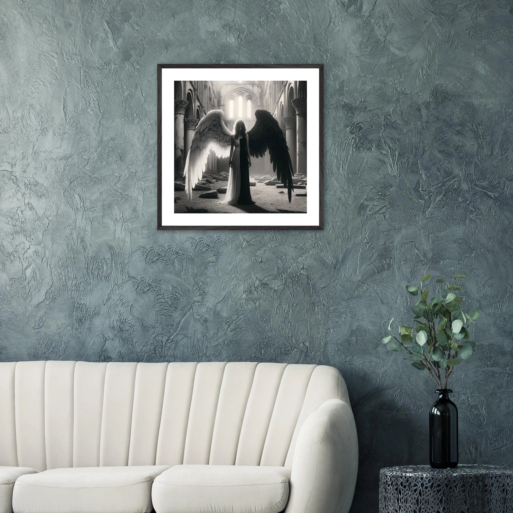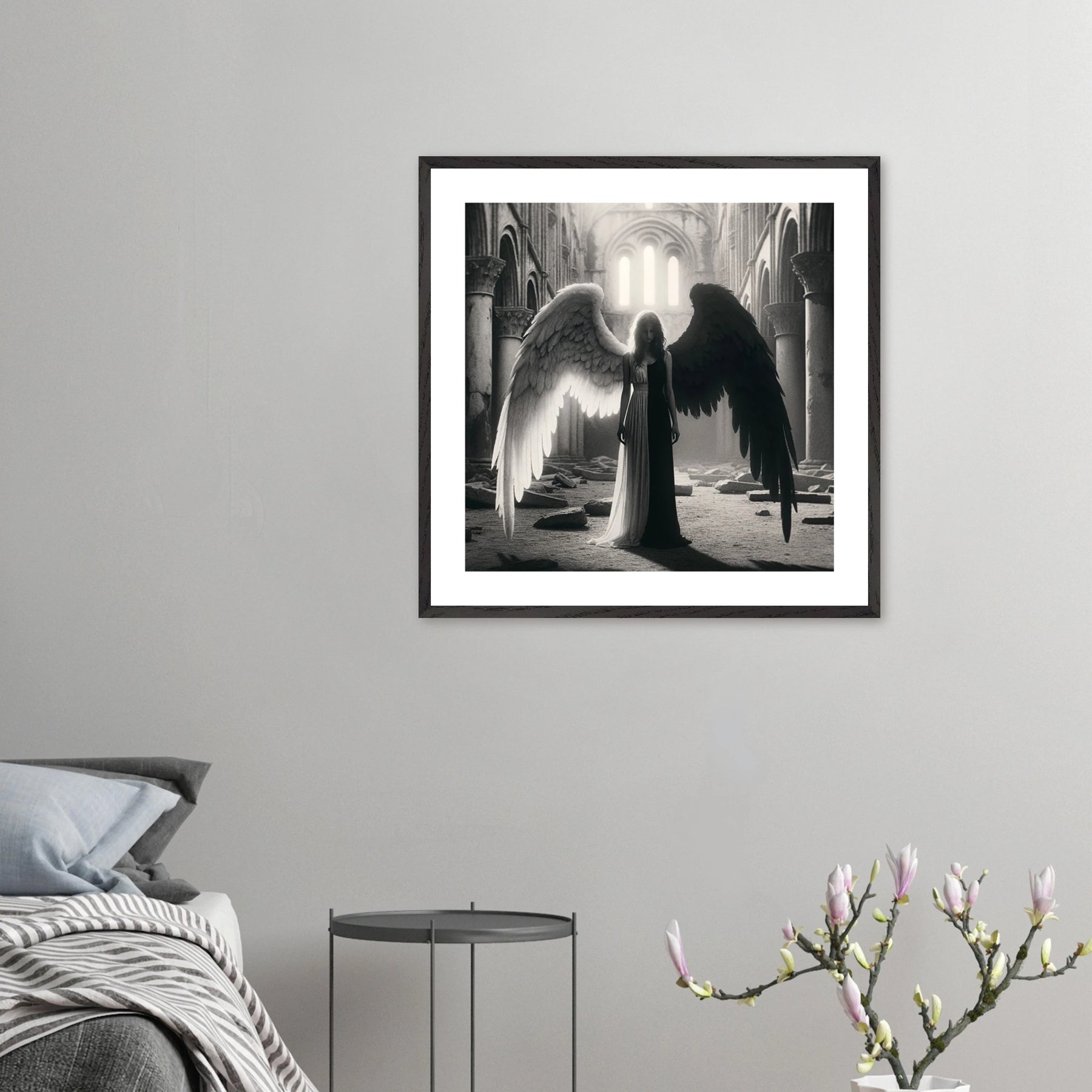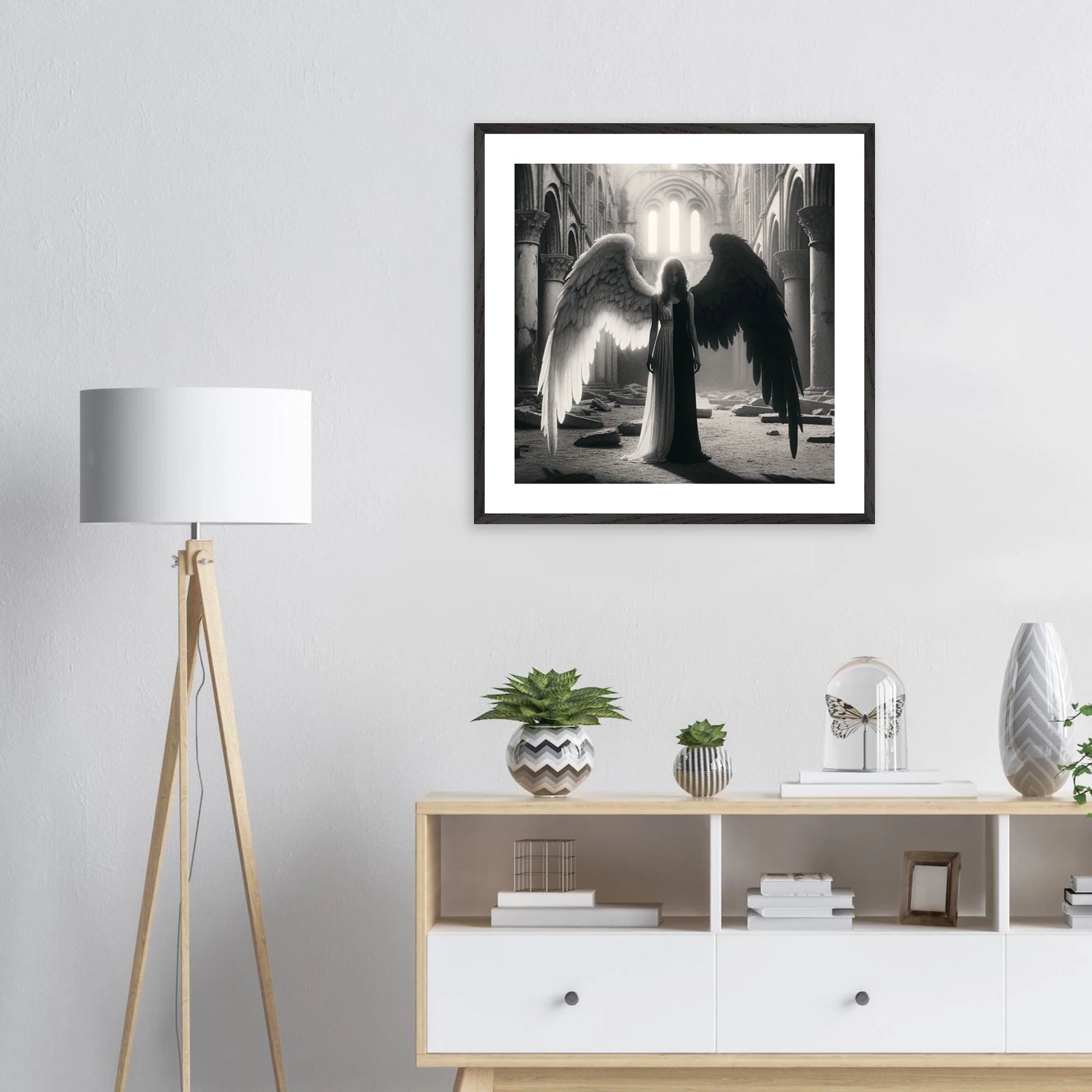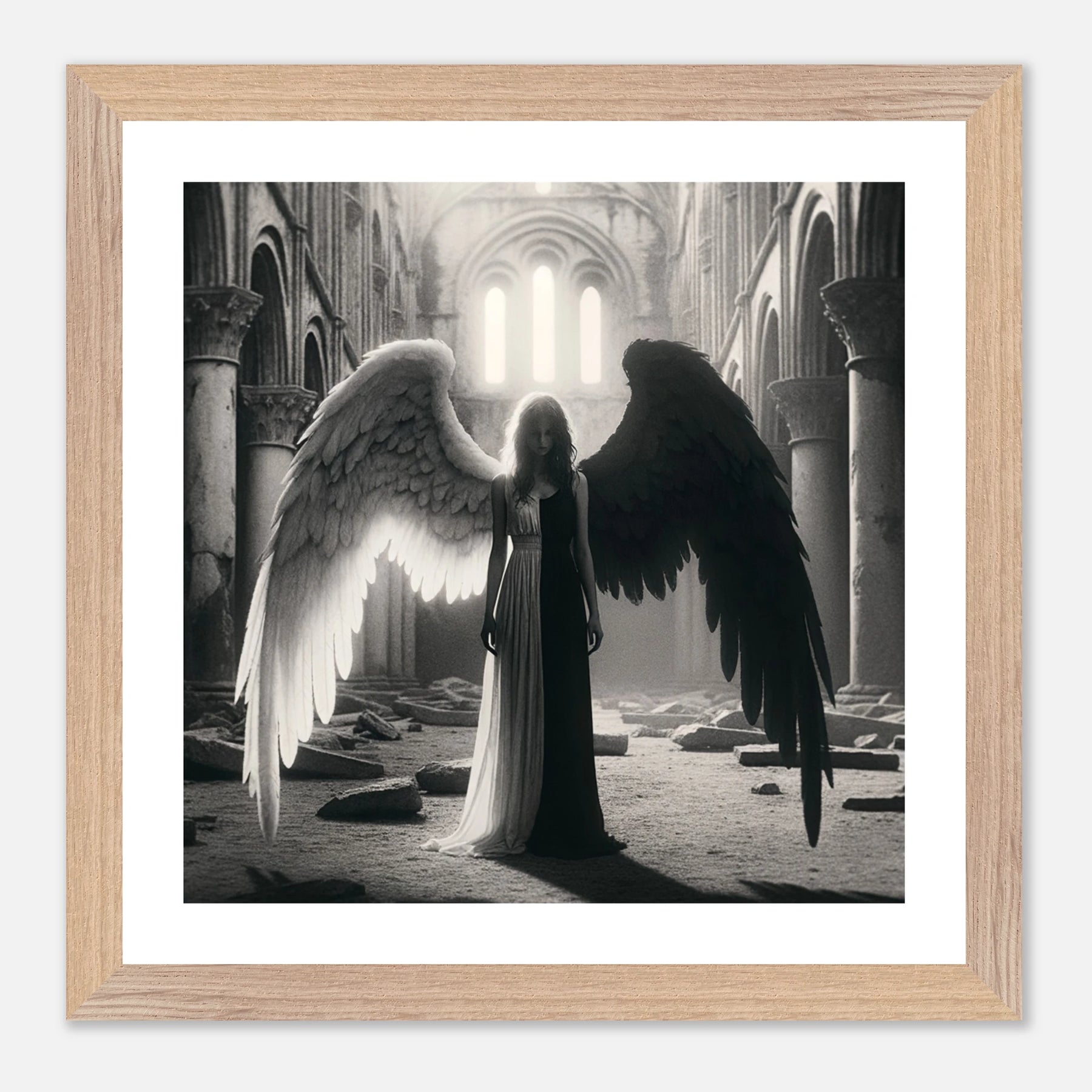 Gerahmtes Premium-Poster: Schwarz-weißer Engel in den Ruinen einer Kirche, schwarzer Teil steht für Zerstörung und Böses, weißer Teil für Hoffnung und Überwindung, ideale Wandkunst für Meditationsräume und spirituelle Zentren