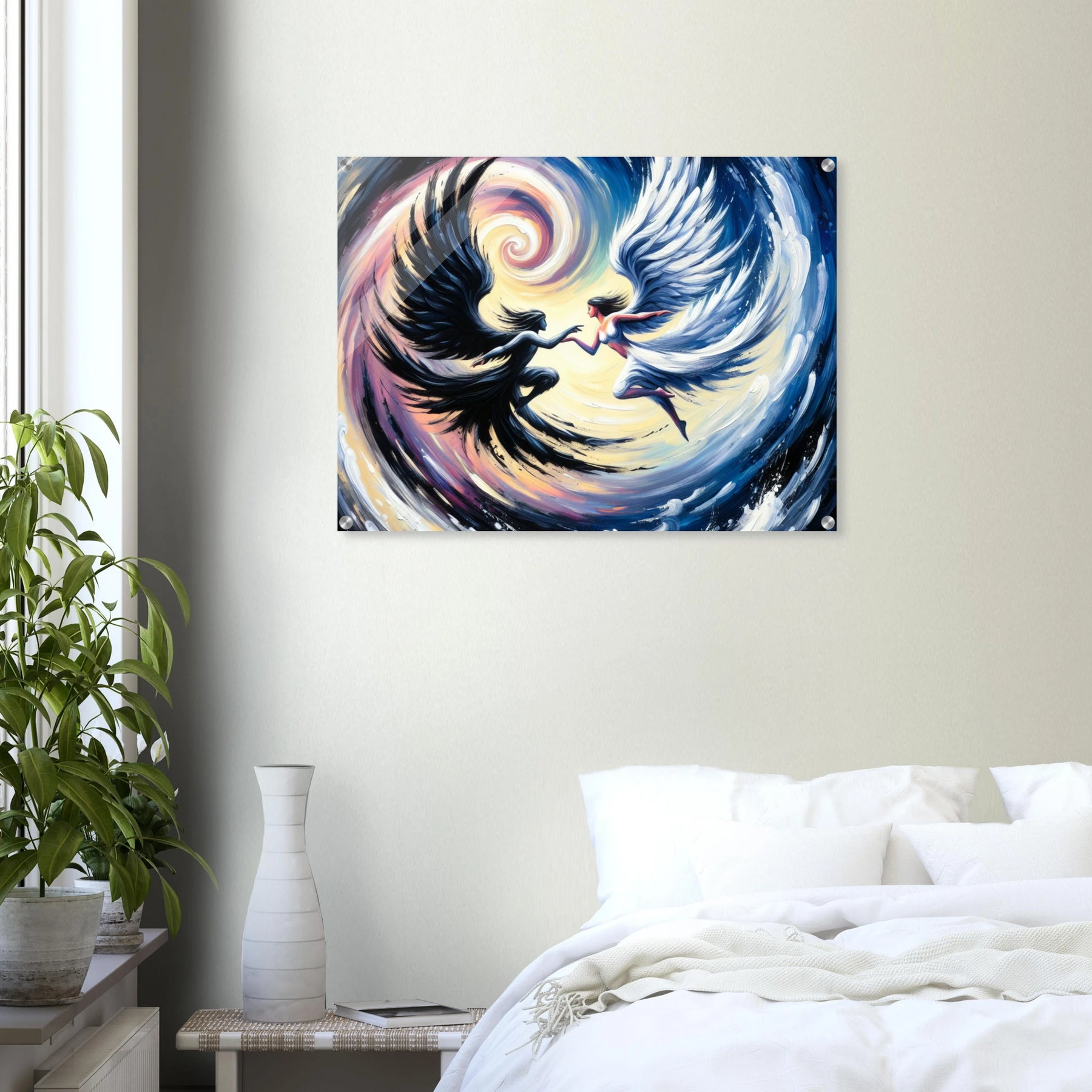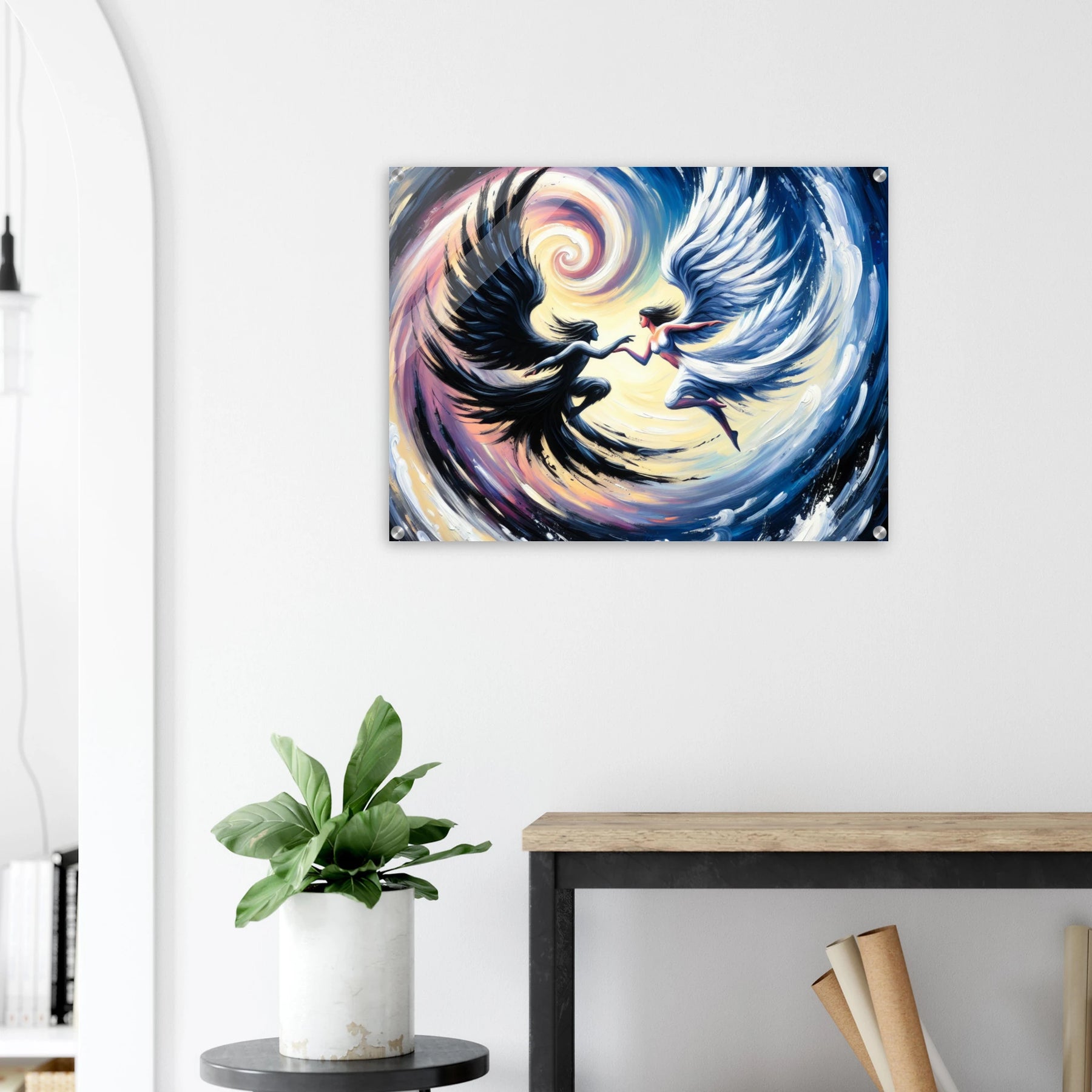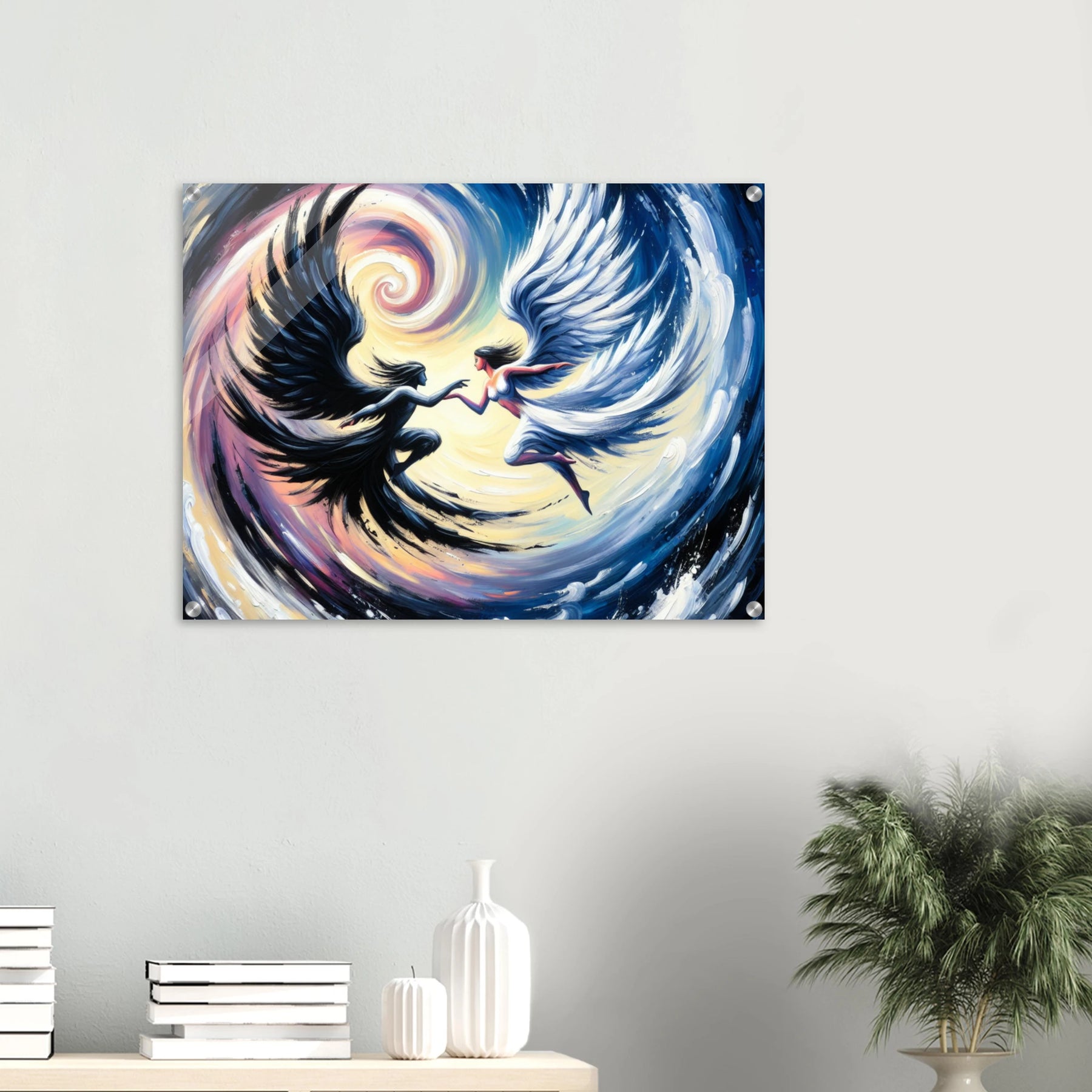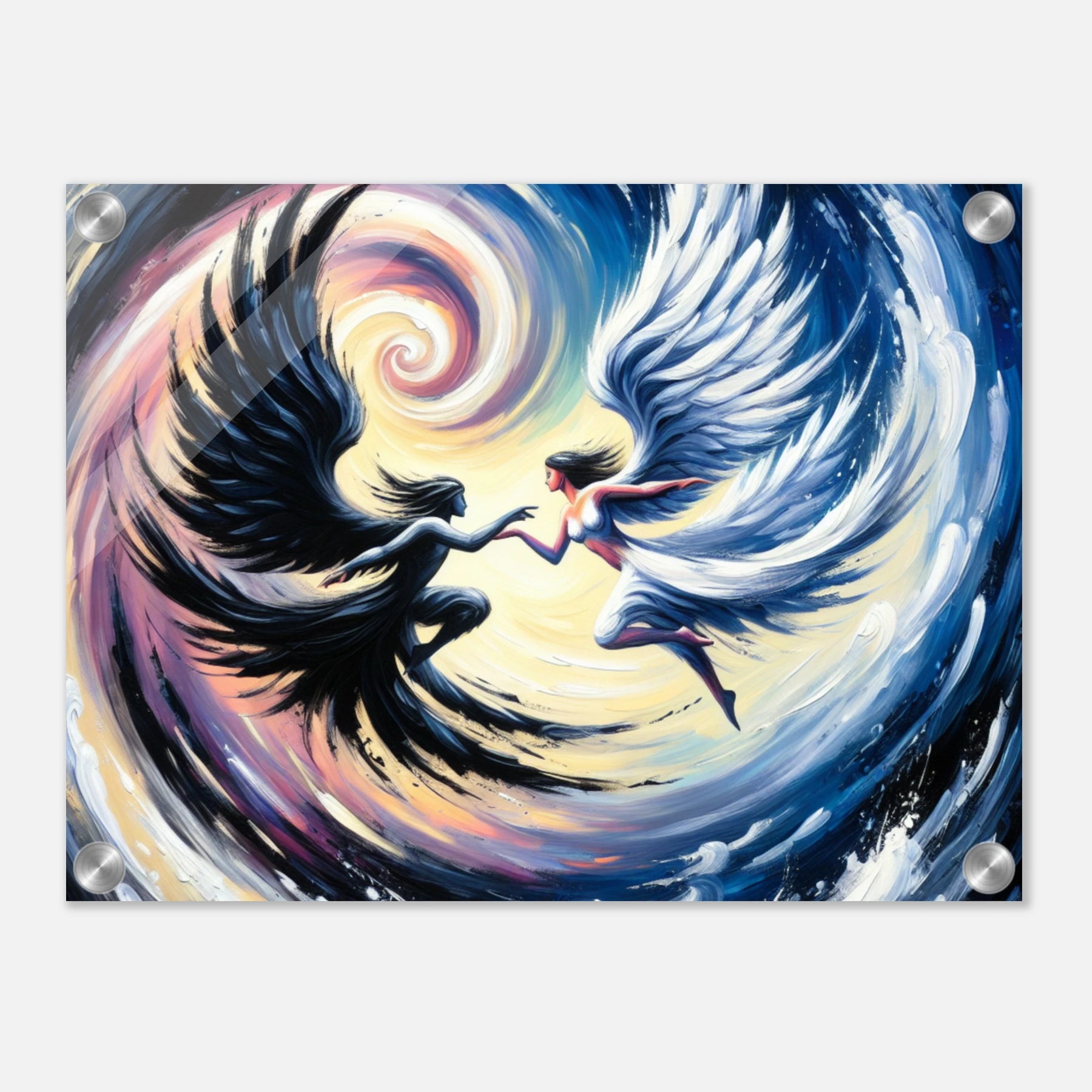 Acrylglasdruck: Verschwommene Fusion zwischen Todesengel und Schutzengel, in sich drehend, dynamische Wandkunst für Meditationsraum