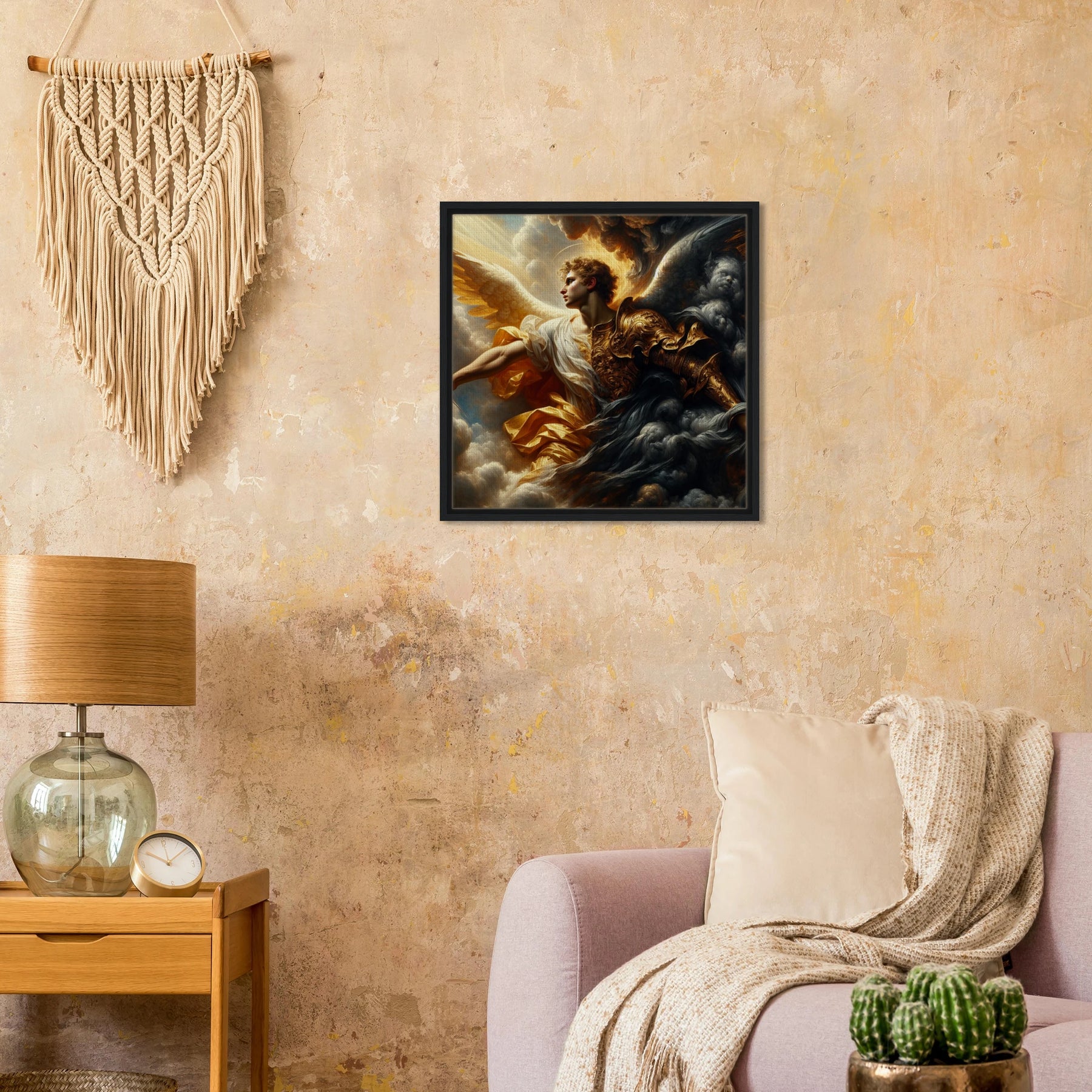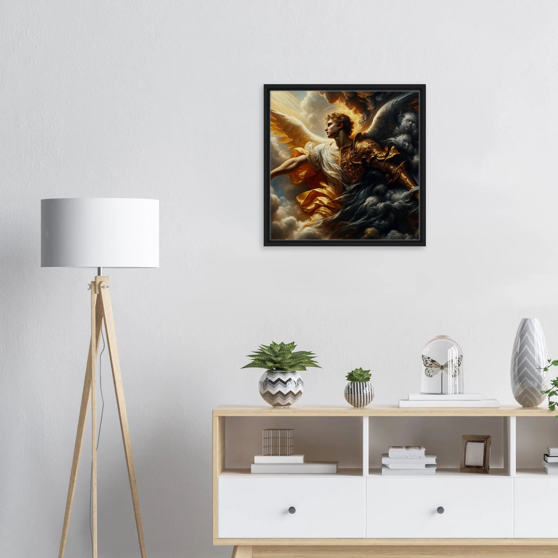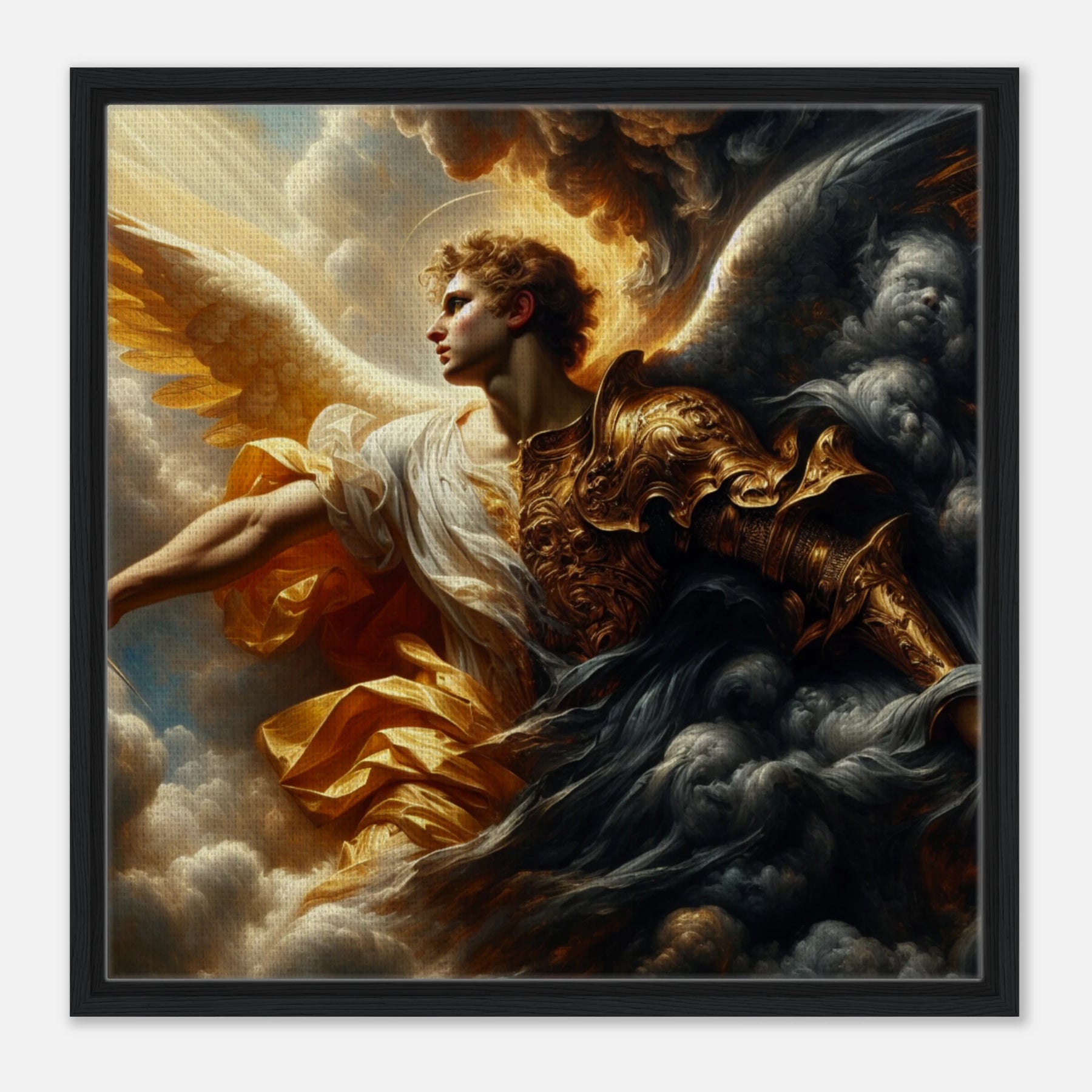 Gerahmte Leinwand: Schutzengel in goldener Rüstung im Himmel bedrängt von bösen Geistern, Kampf zwischen Gut und Böse, dramatische Wanddekoration für Wohnzimmer