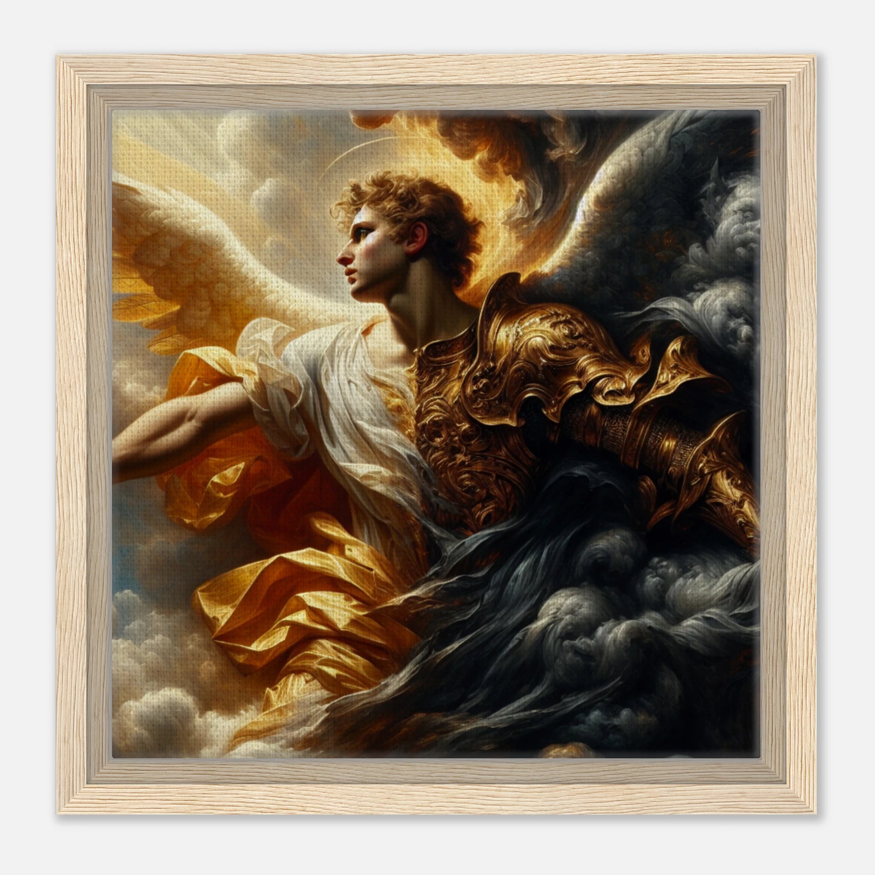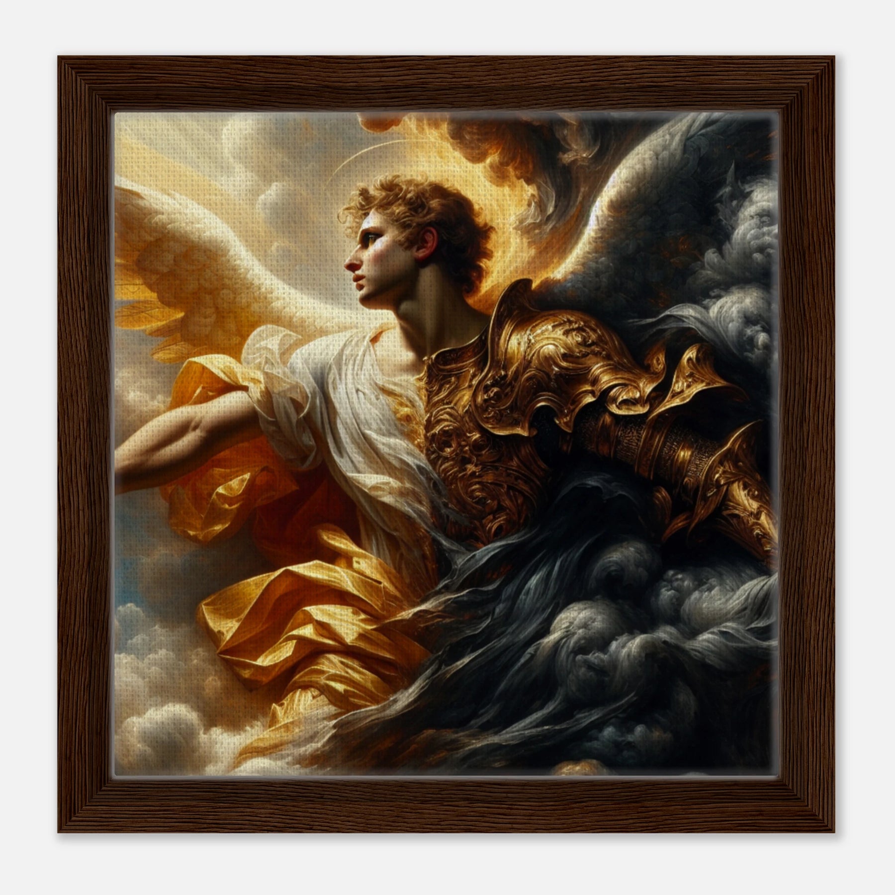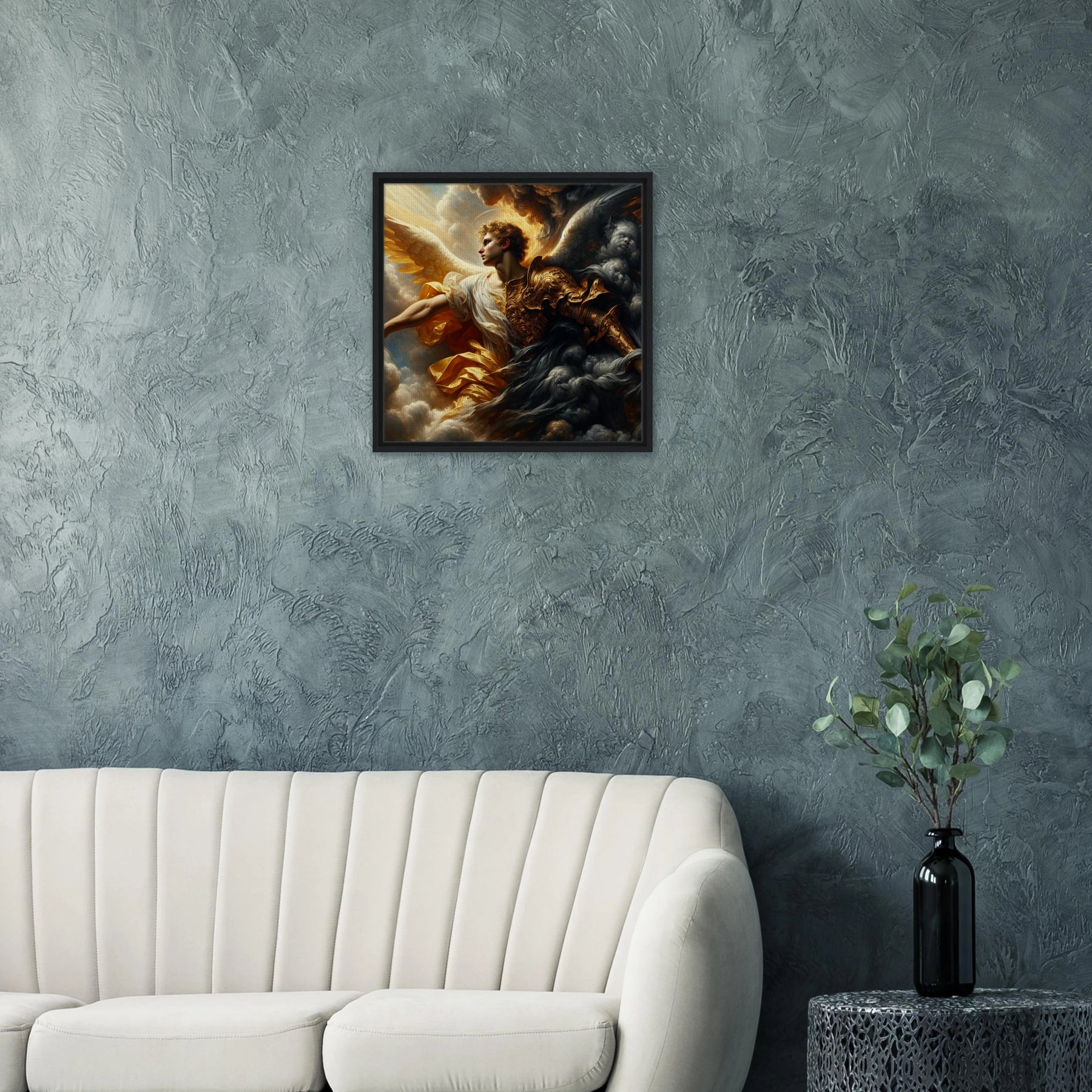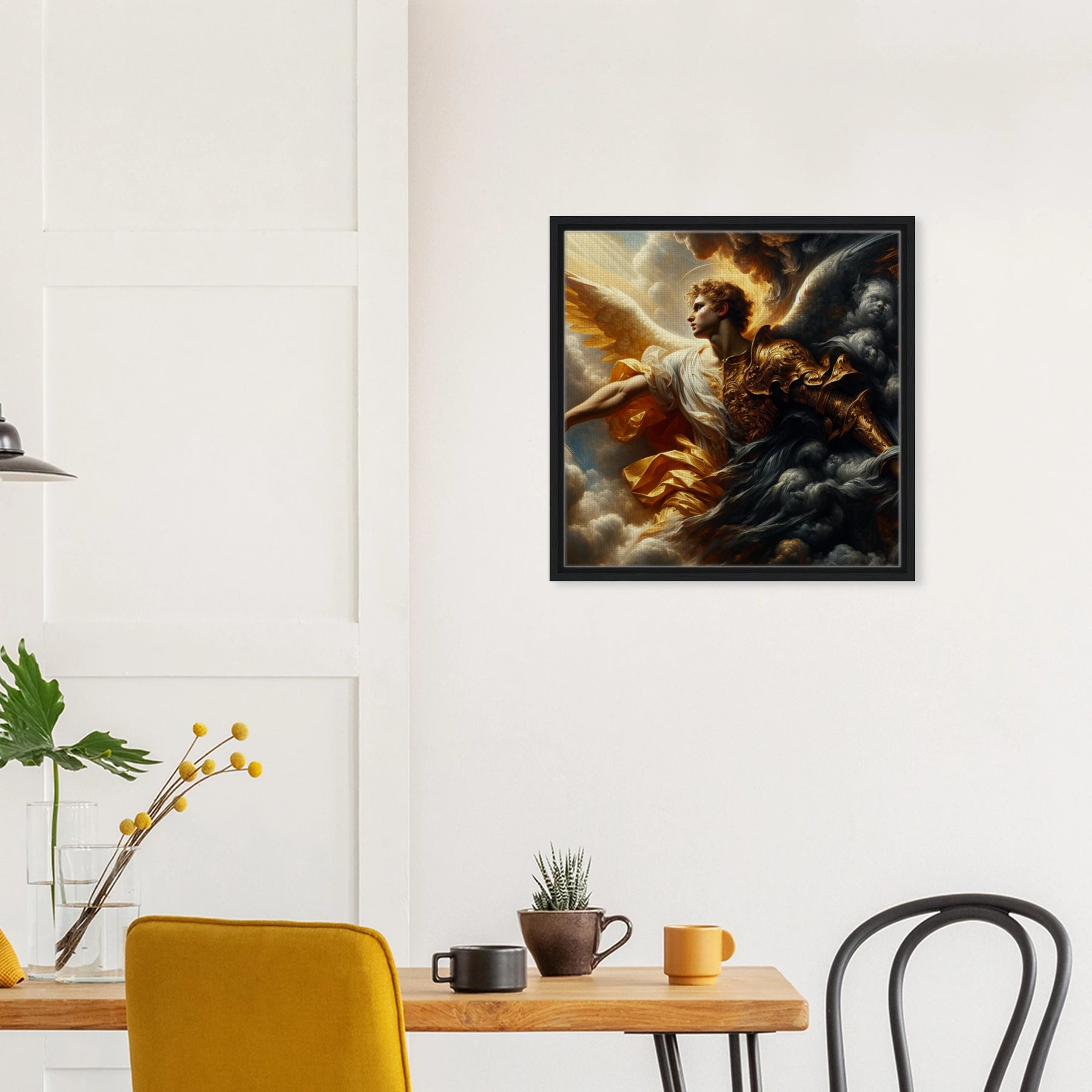 Gerahmte Leinwand: Schutzengel in goldener Rüstung im Himmel bedrängt von bösen Geistern, Kampf zwischen Gut und Böse, dramatische Wanddekoration für Wohnzimmer