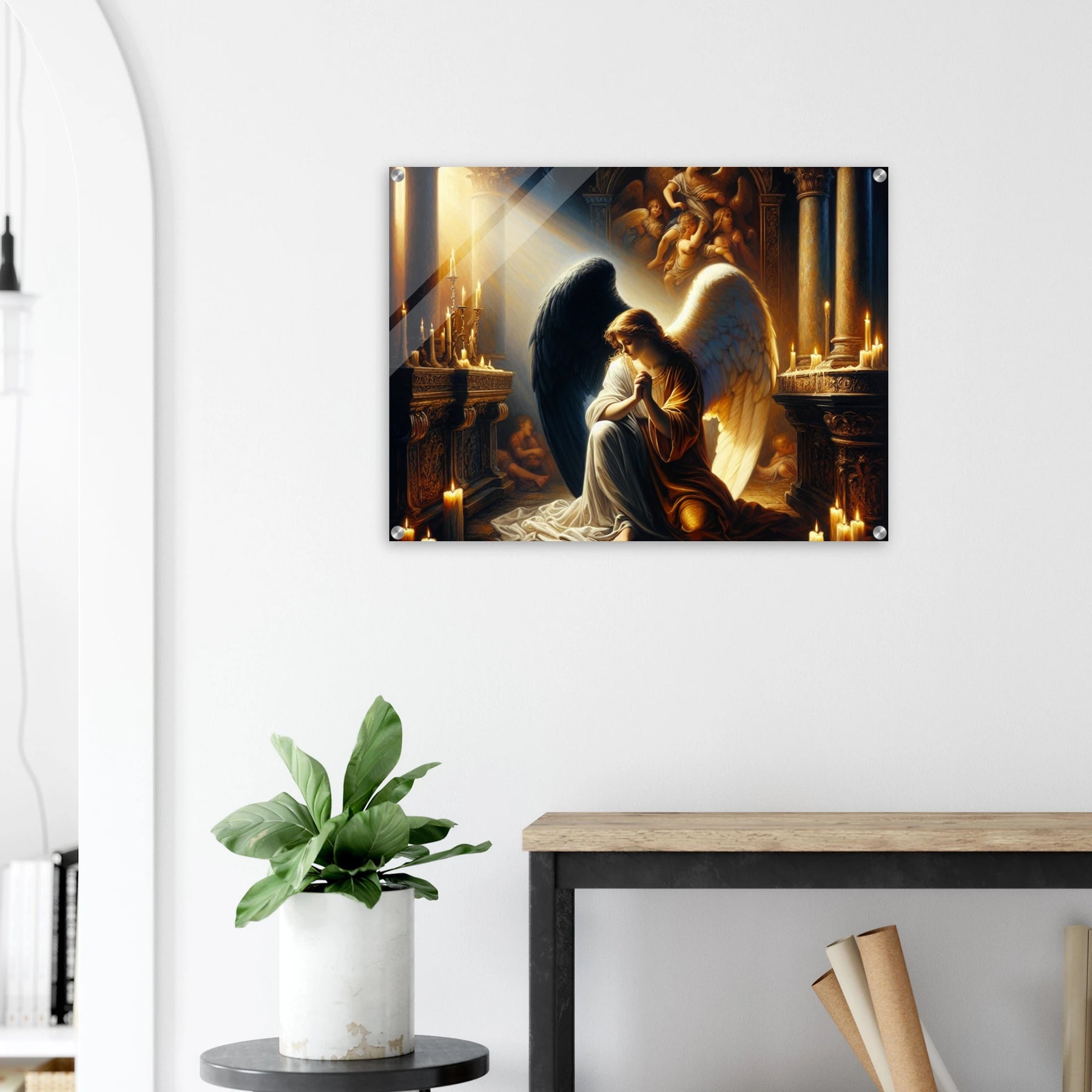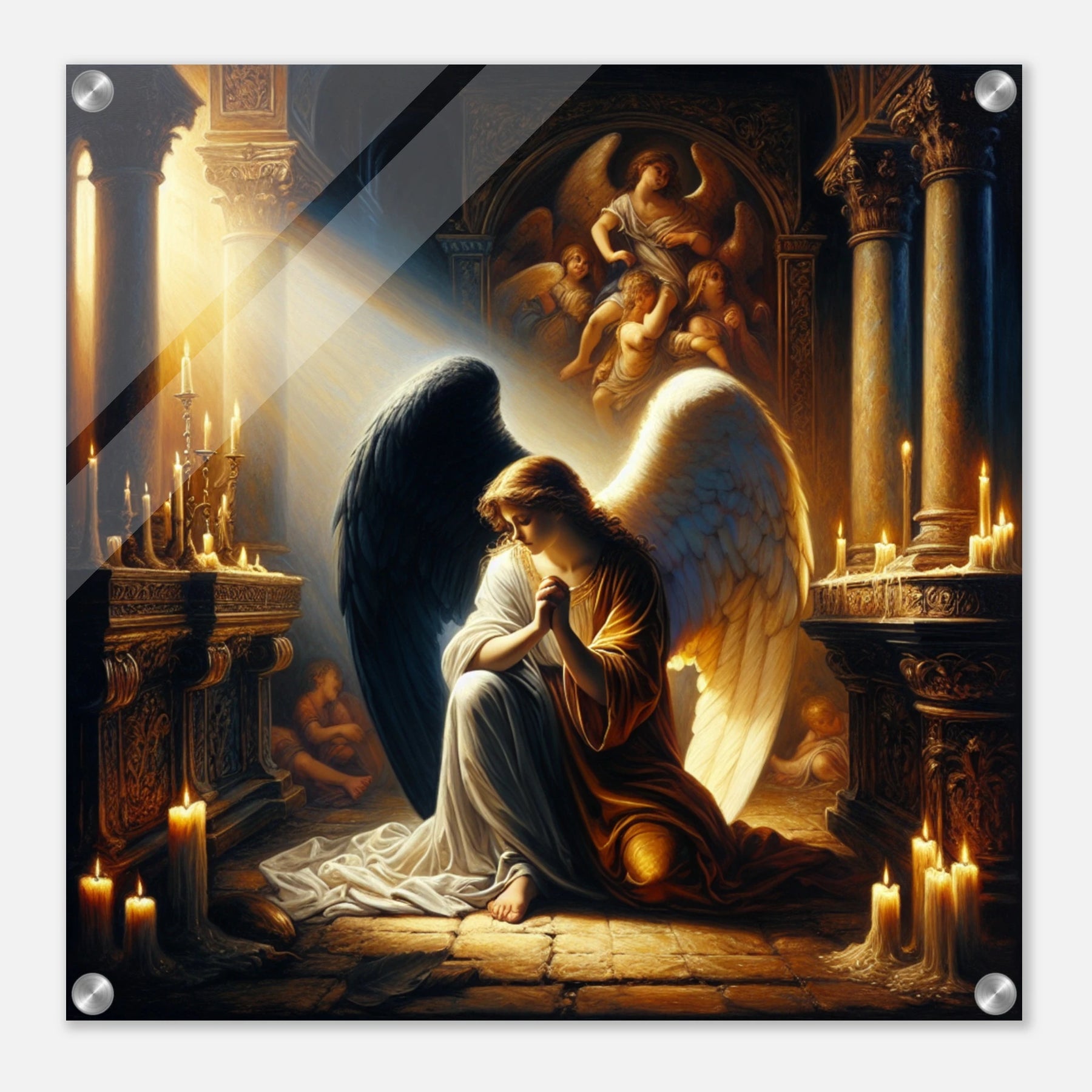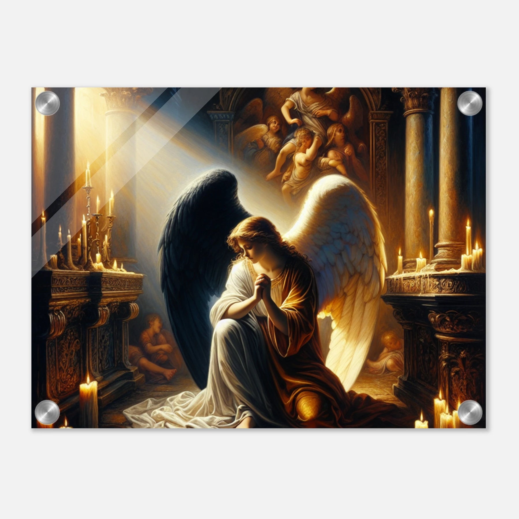 Acrylglasdruck: Engel mit schwarzen und weißen Flügeln, betend vor dem Altar einer katholischen Kirche im Kerzenschein, spirituelle Wandkunst für Religion Meditationsraum