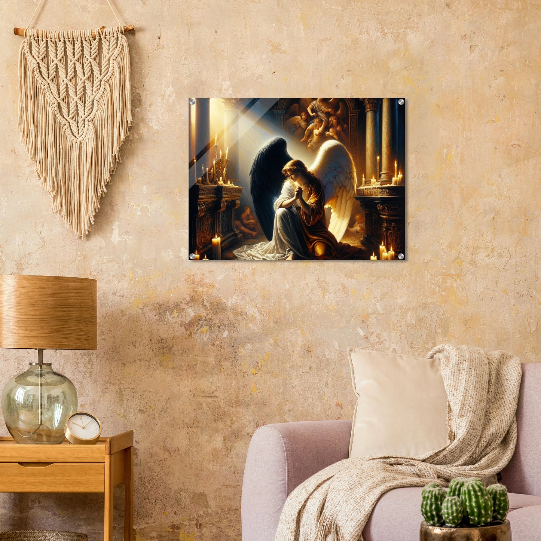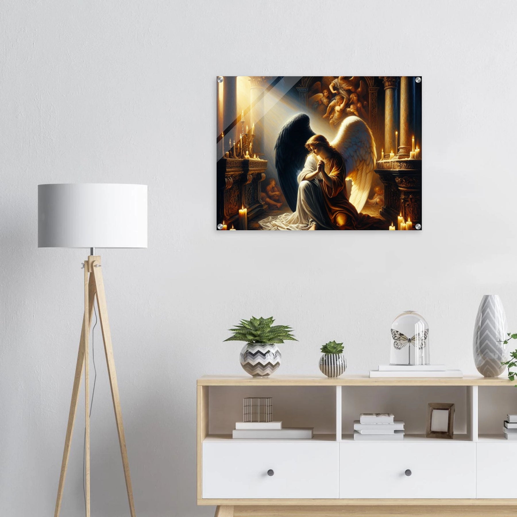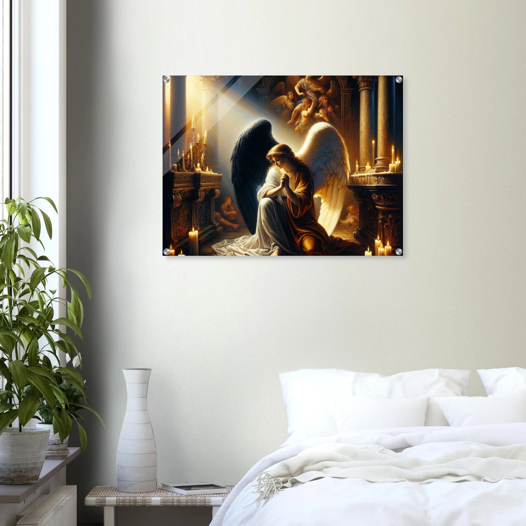 Acrylglasdruck: Engel mit schwarzen und weißen Flügeln, betend vor dem Altar einer katholischen Kirche im Kerzenschein, spirituelle Wandkunst für Religion Meditationsraum