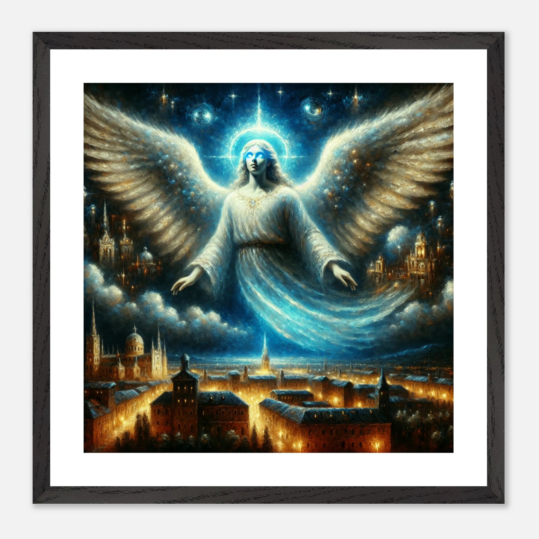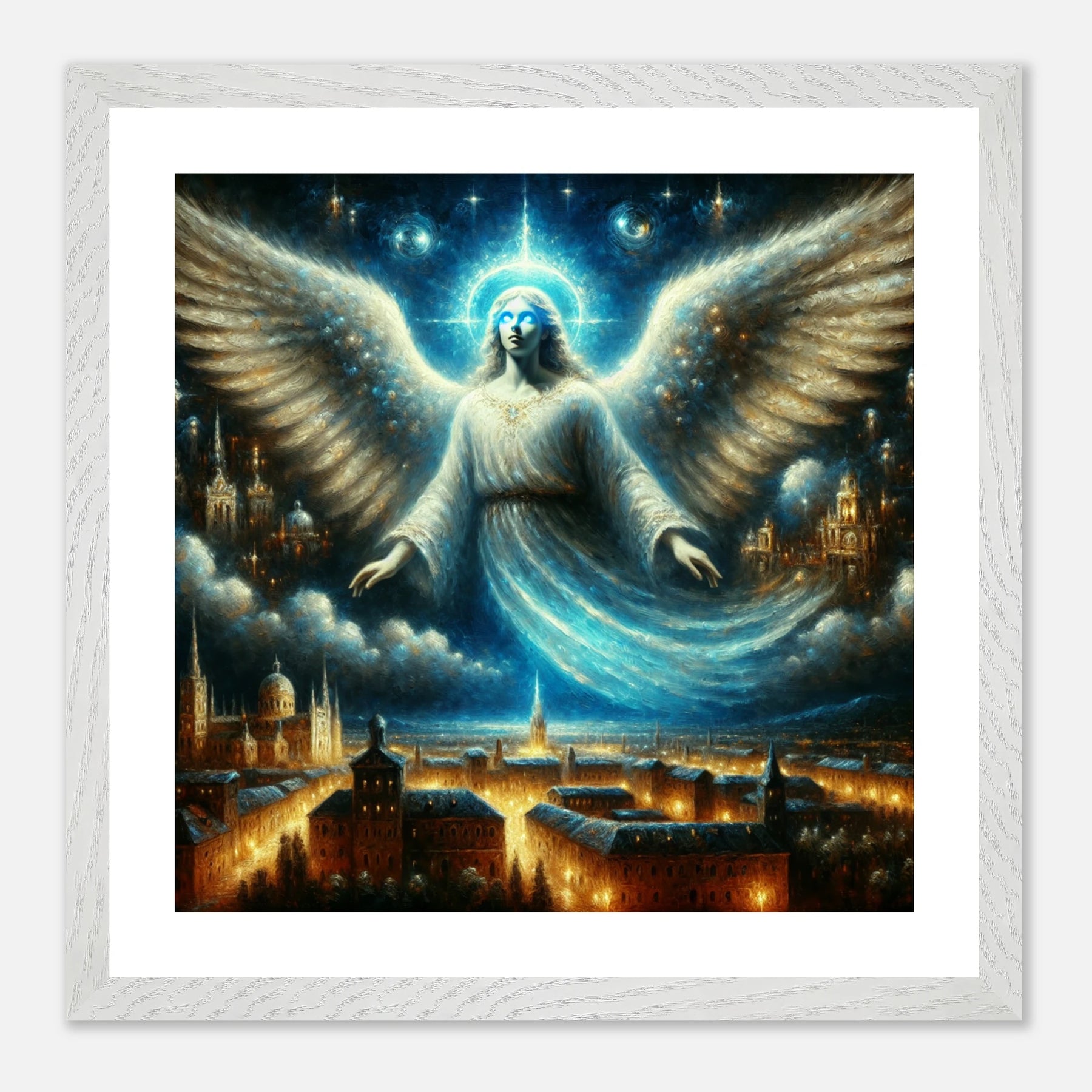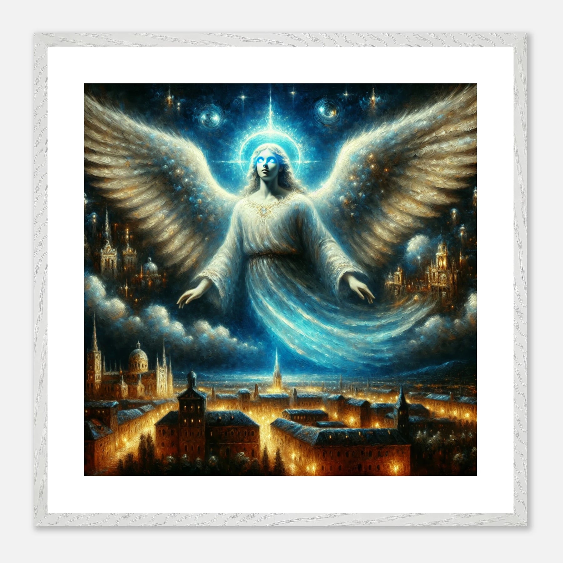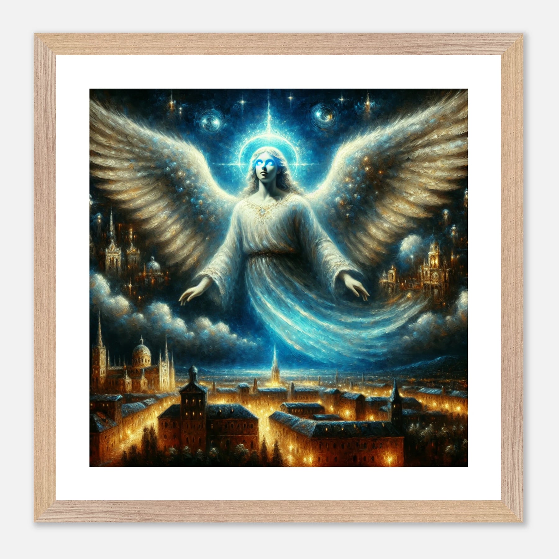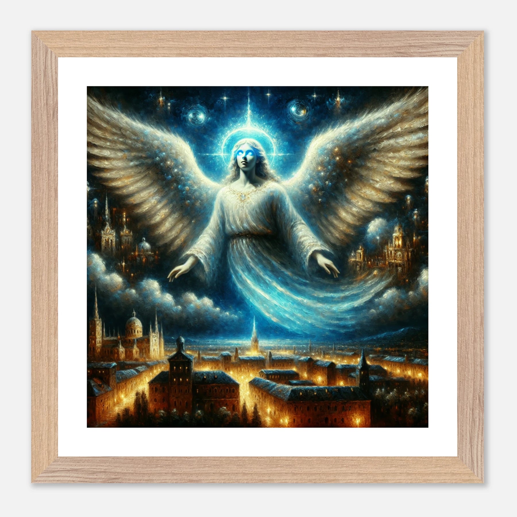 Mystischer Engel mit leuchtenden Augen über nächtlicher Stadt – spirituelles Poster für Himmelsfreunde
