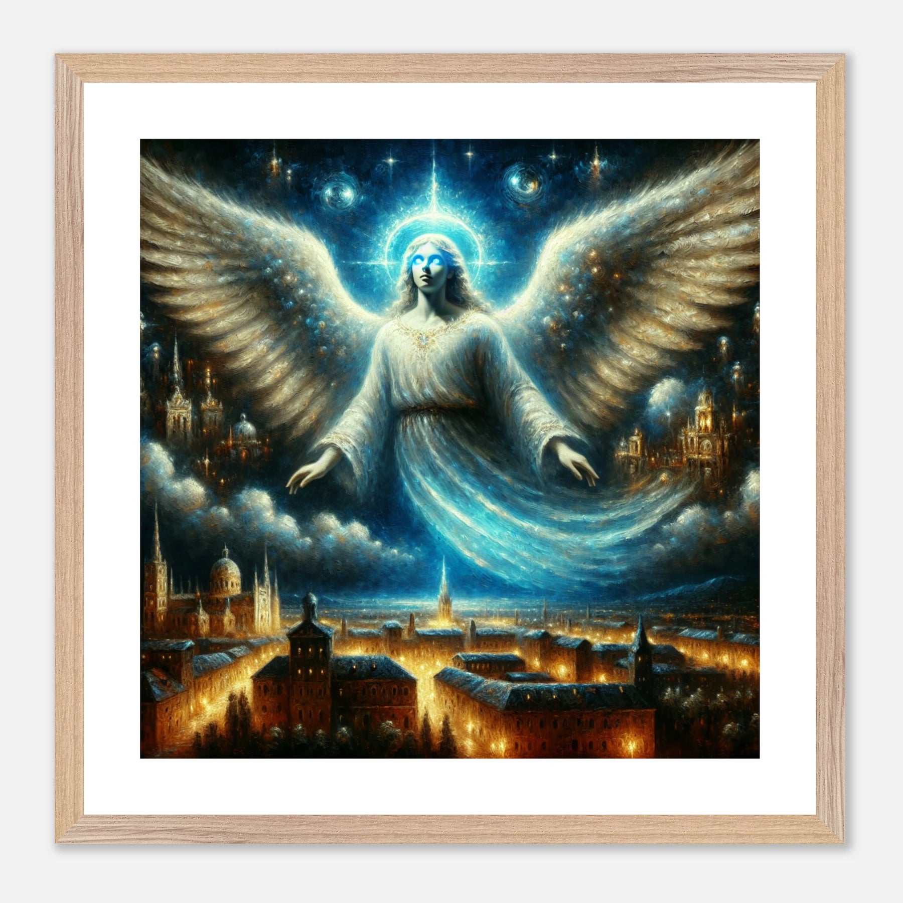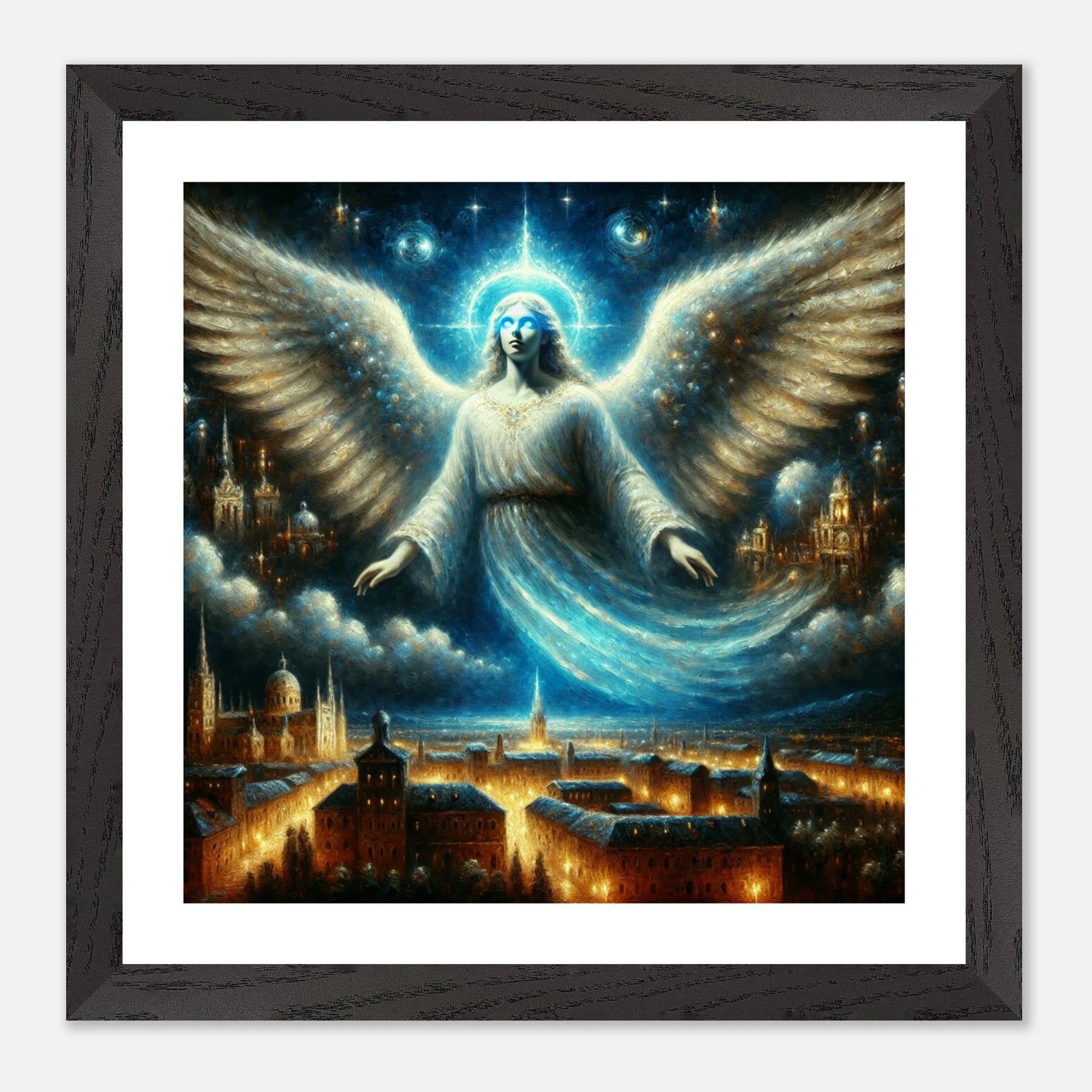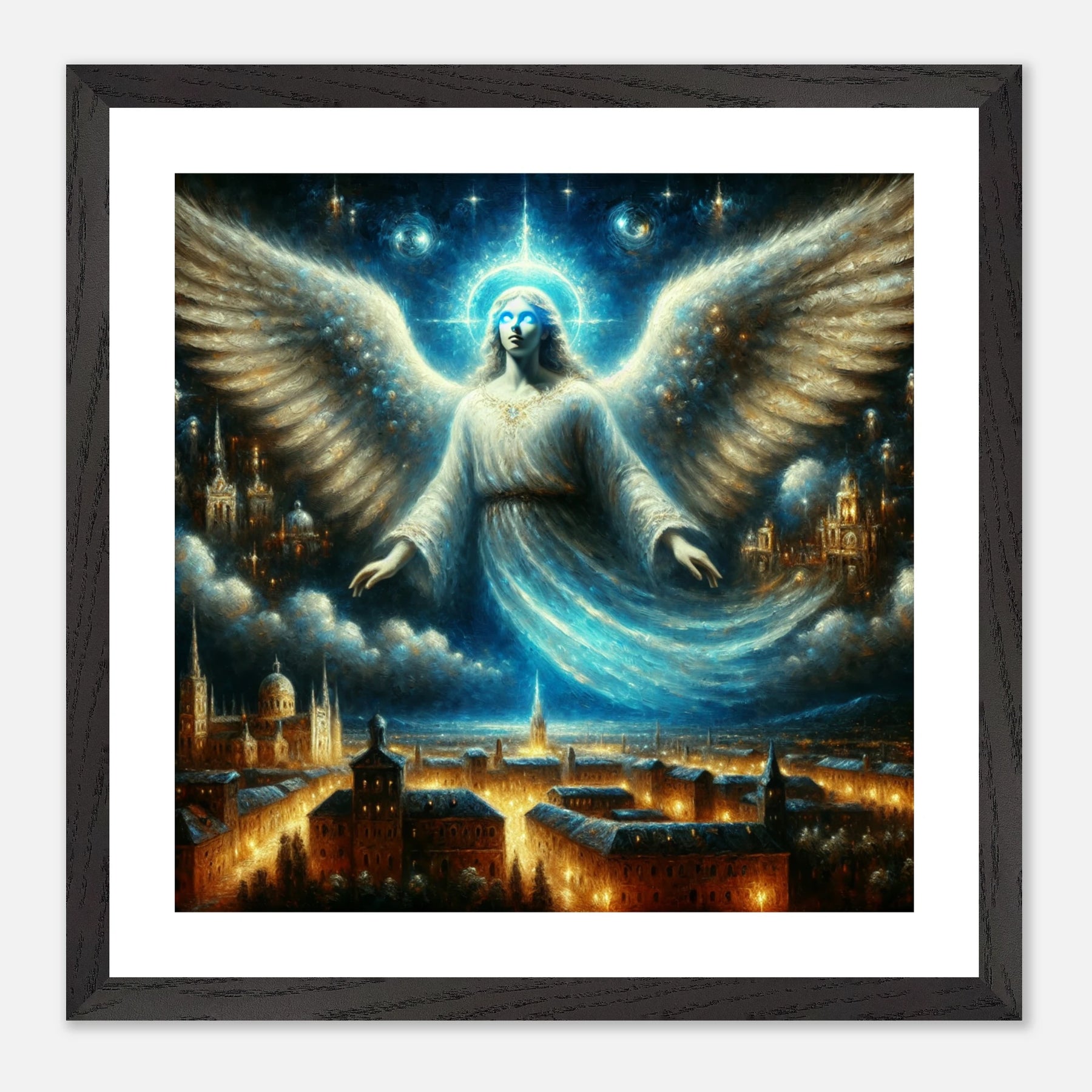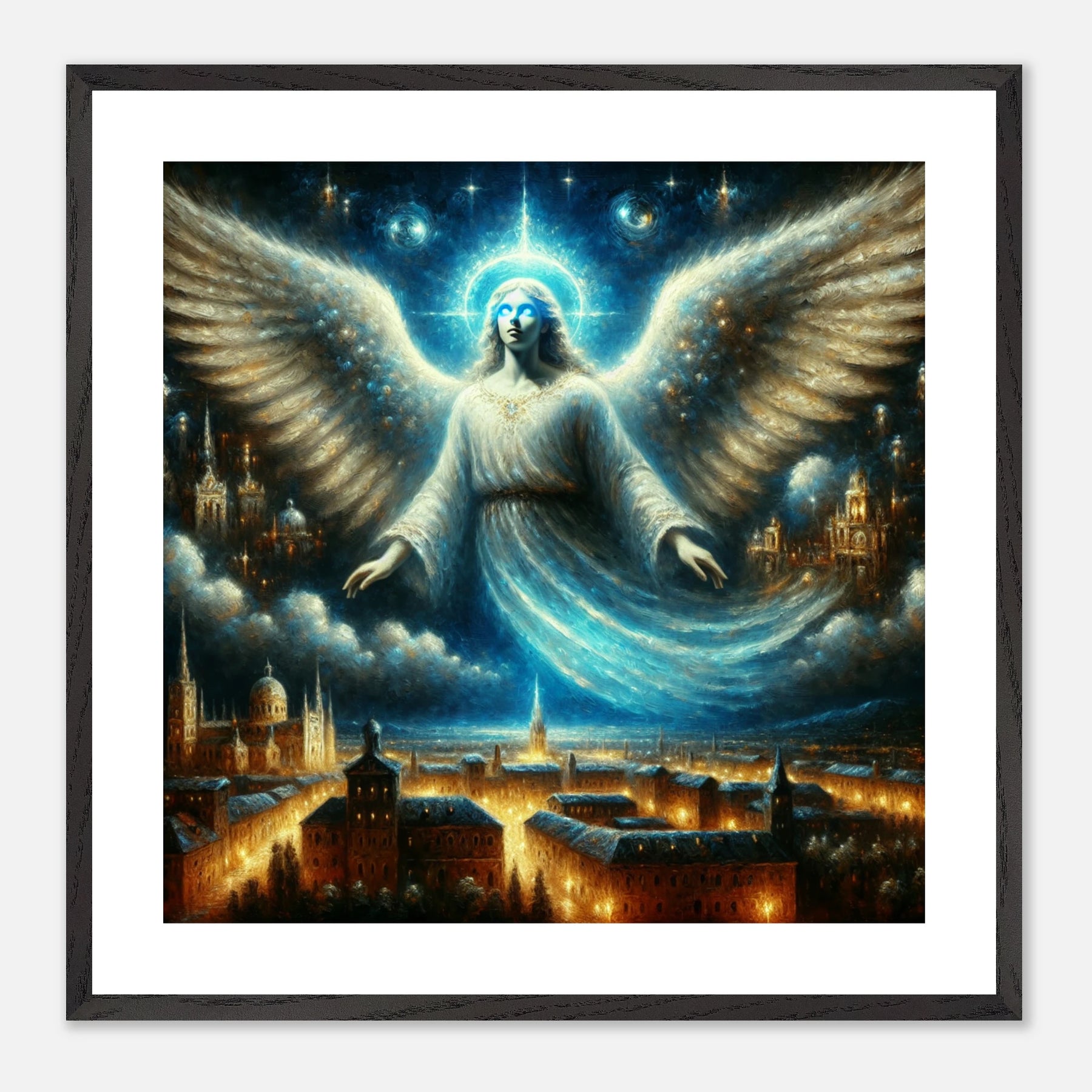 Mystischer Engel mit leuchtenden Augen über nächtlicher Stadt – spirituelles Poster für Himmelsfreunde