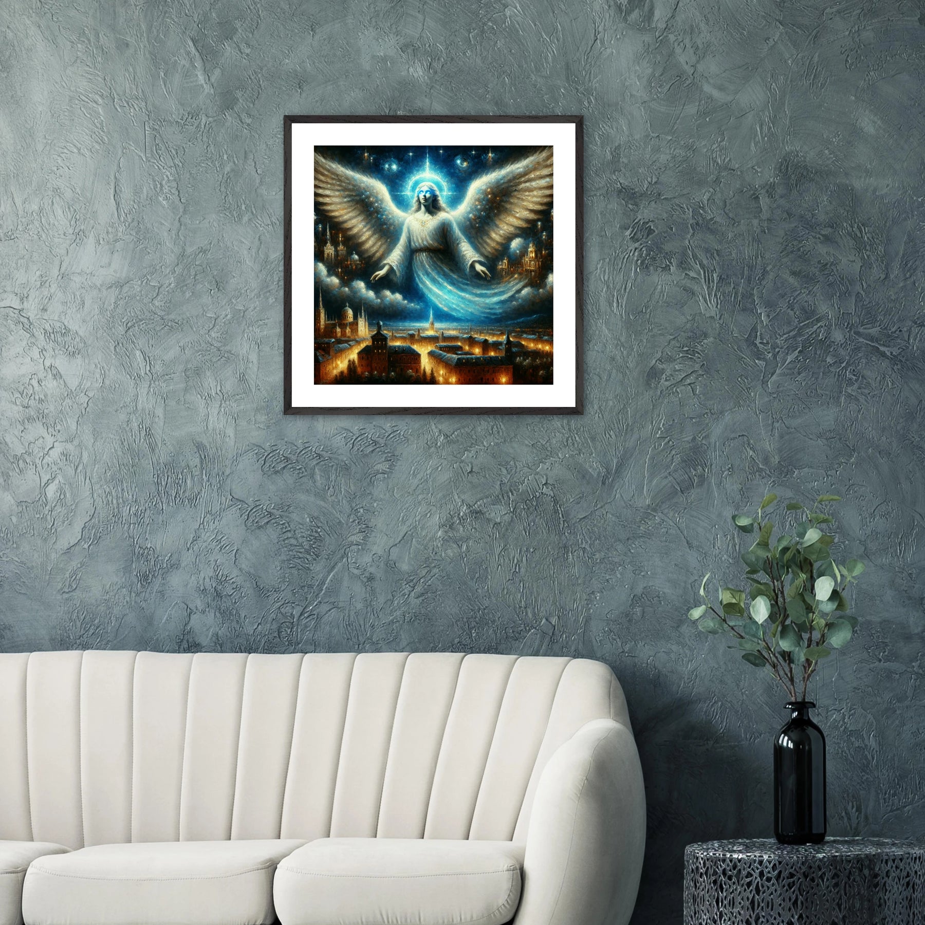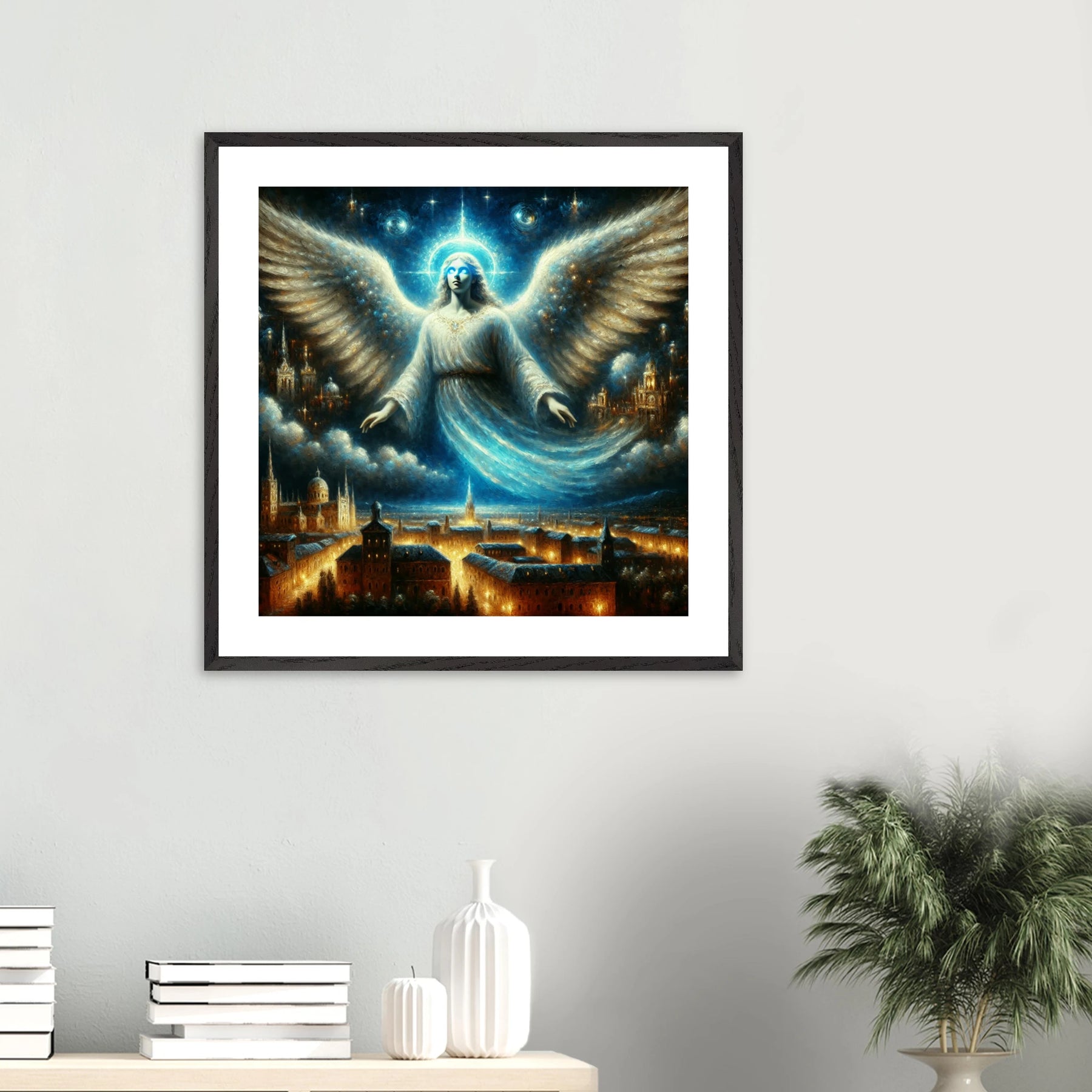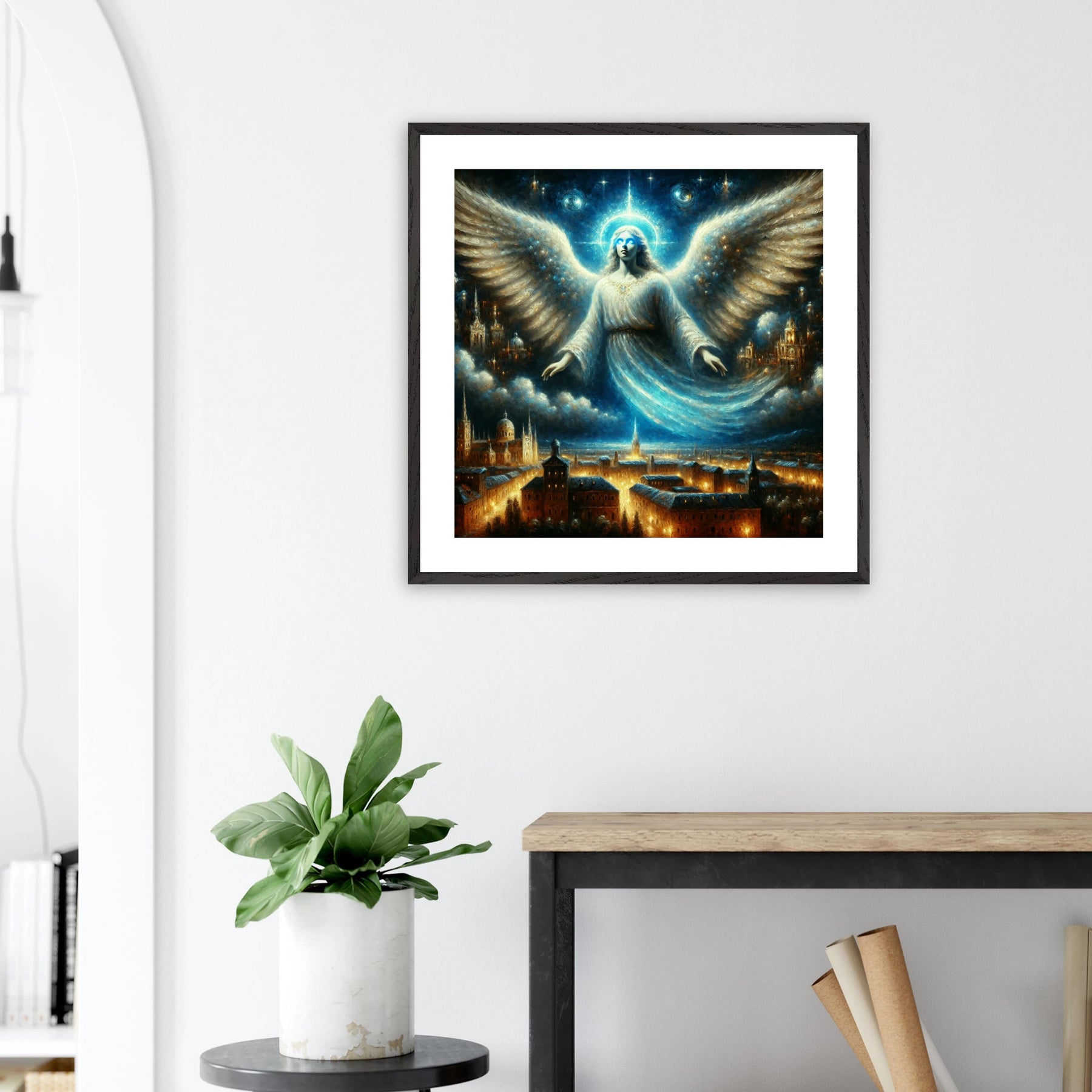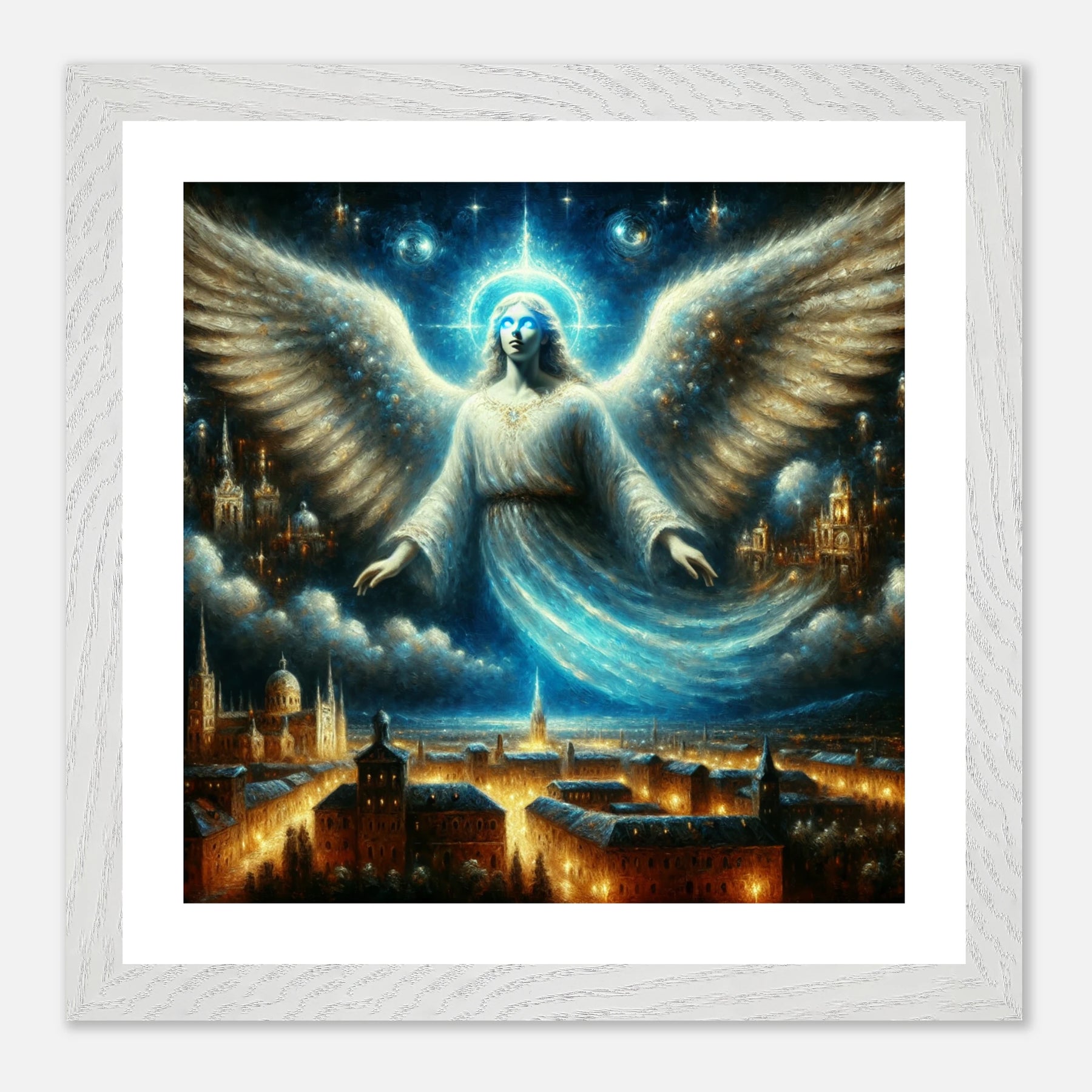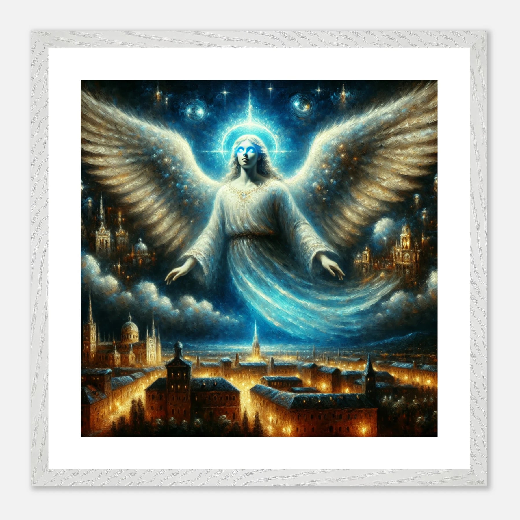 Mystischer Engel mit leuchtenden Augen über nächtlicher Stadt – spirituelles Poster für Himmelsfreunde