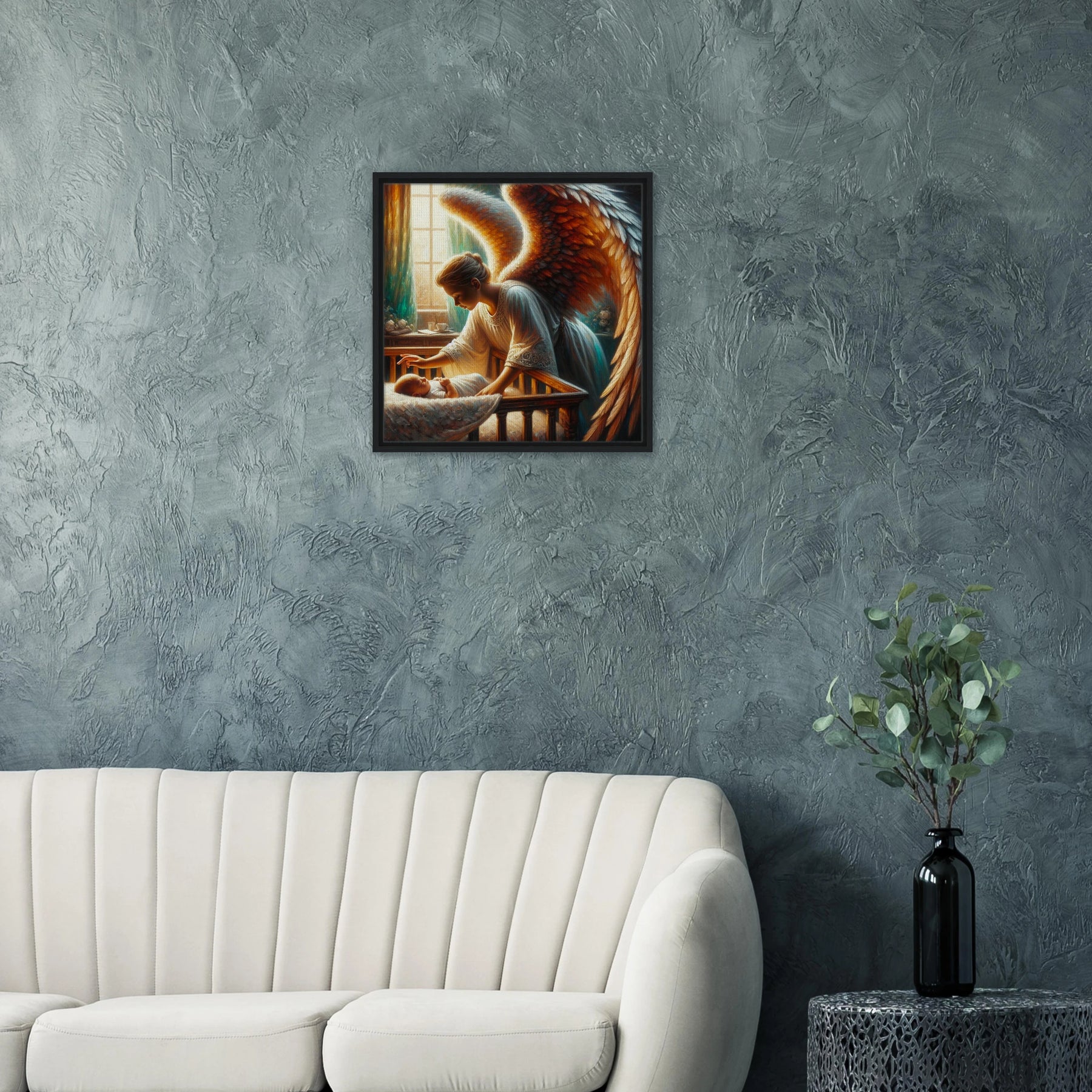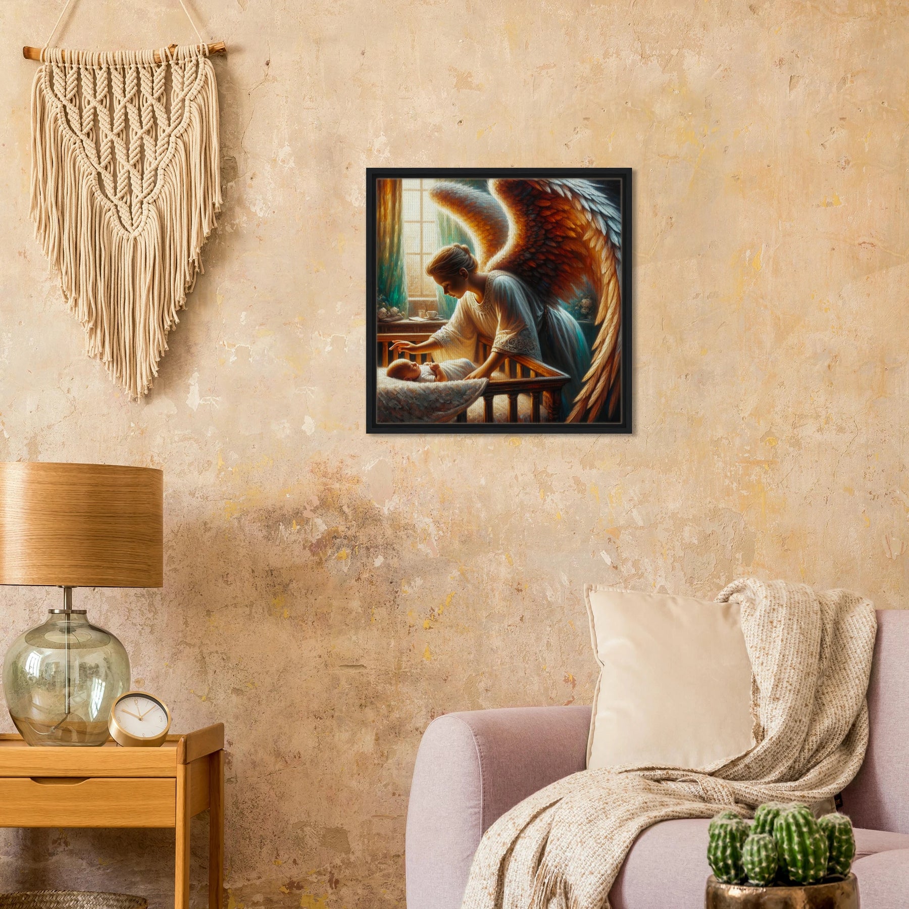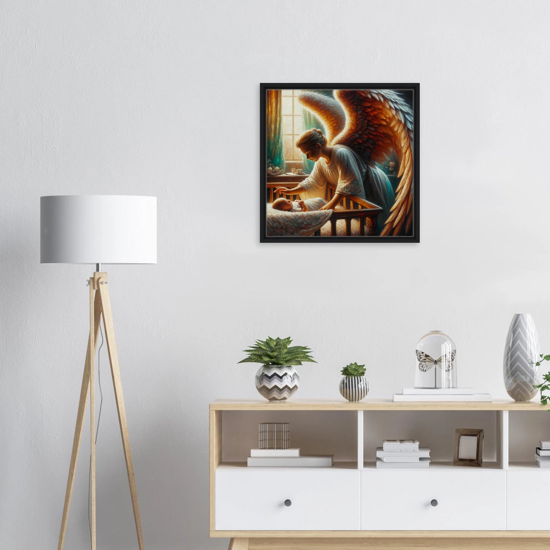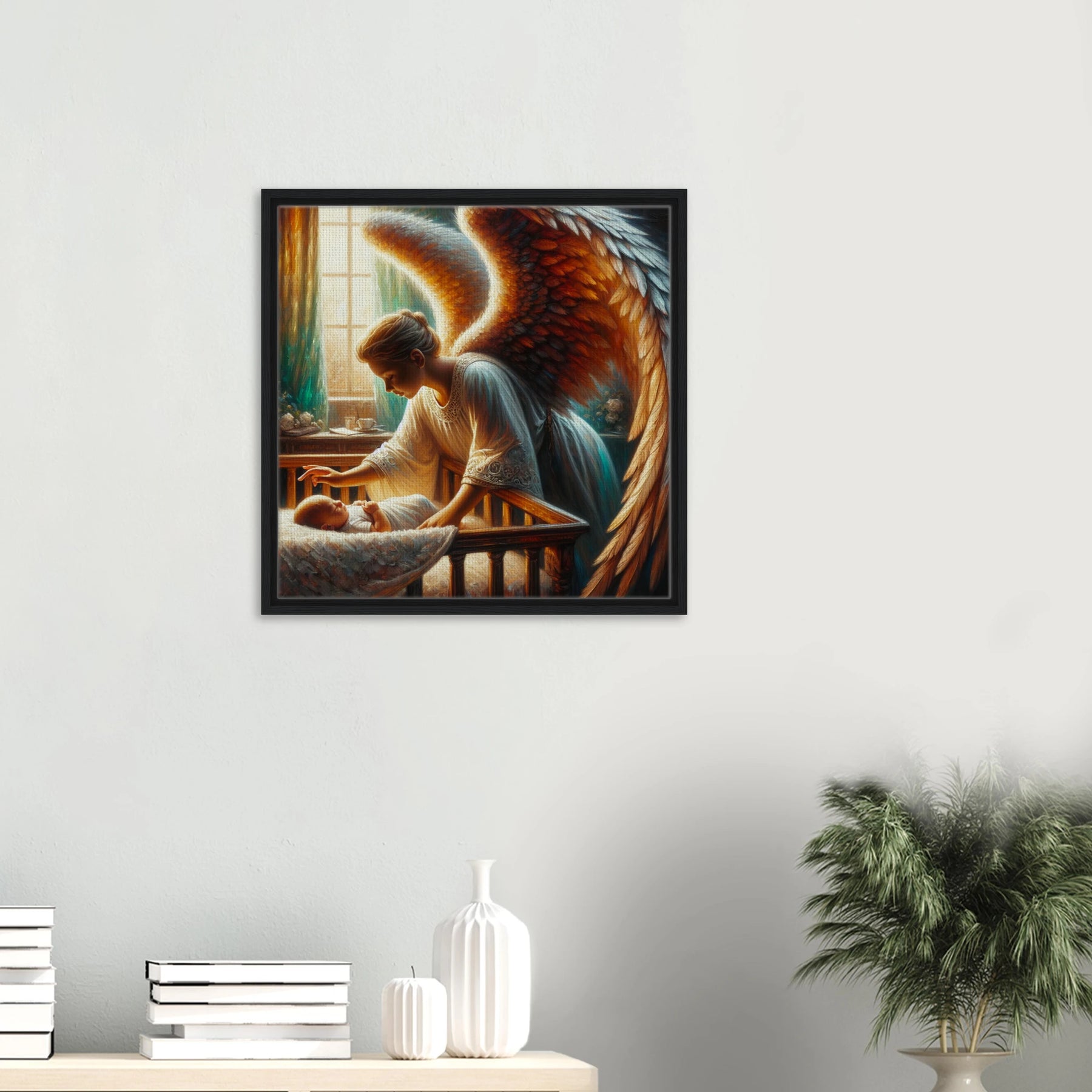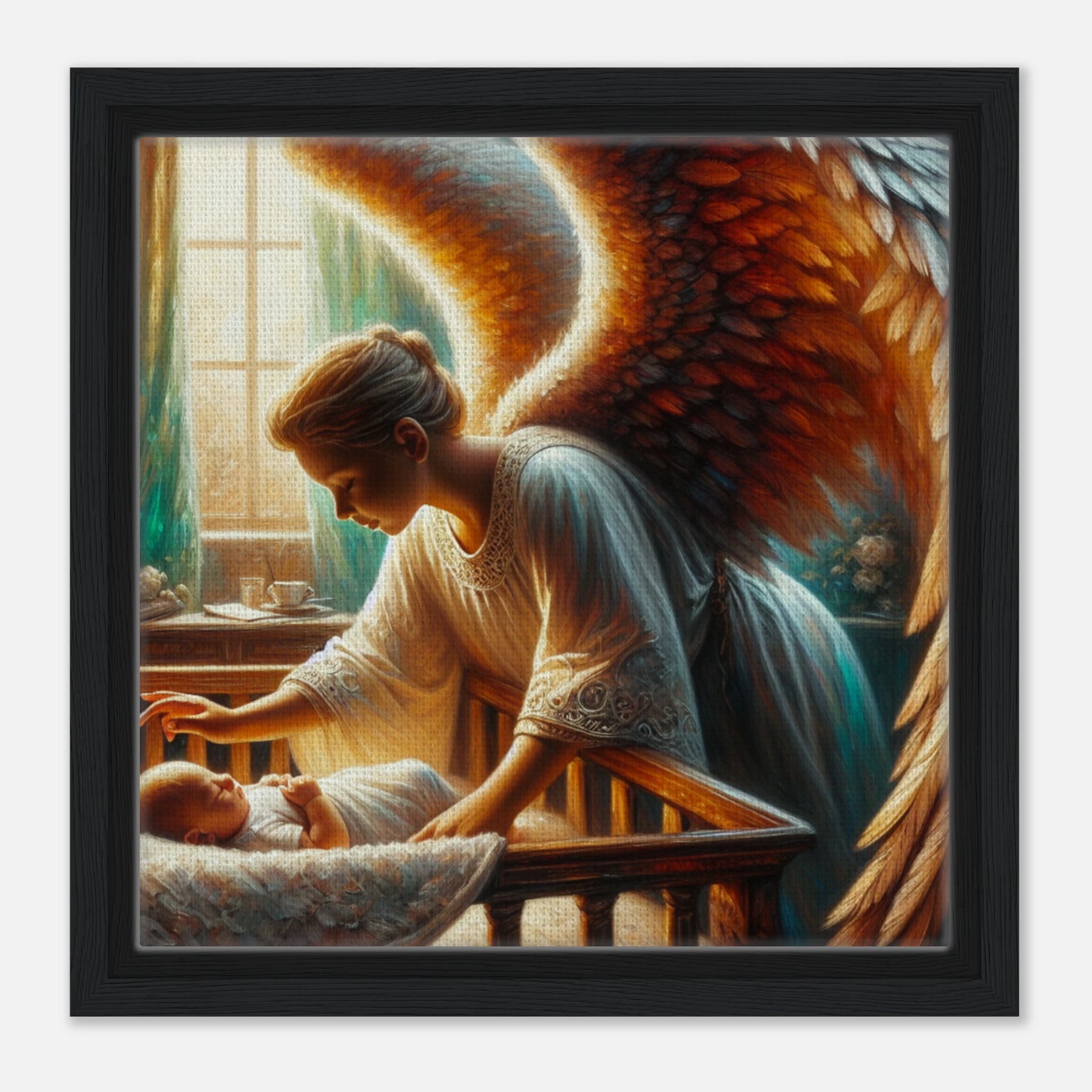 Diese gerahmte Leinwand zeigt einen Guardian Angel – lichtvoll, beschützend und voller Anmut. Die strukturierte Oberfläche bringt Wärme und Tiefe ins Motiv, während der edle Rahmen dem Bild seine stille Eleganz verleiht.