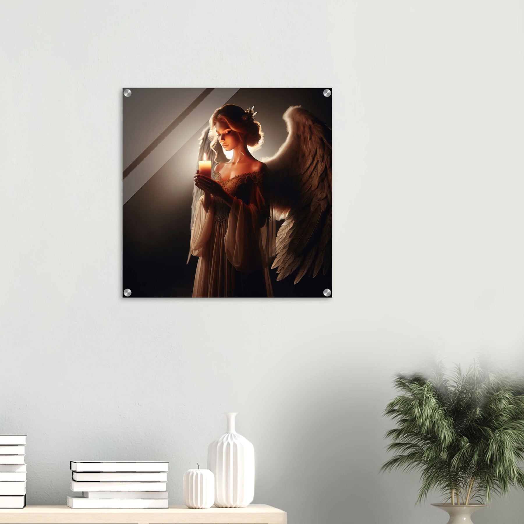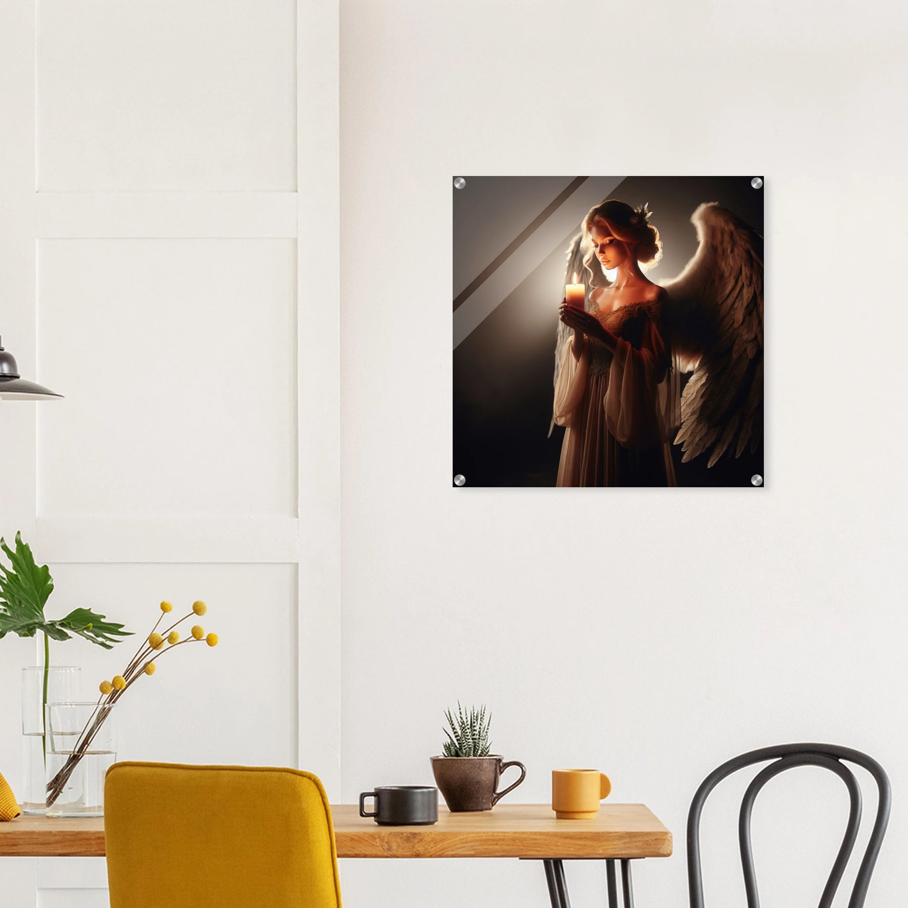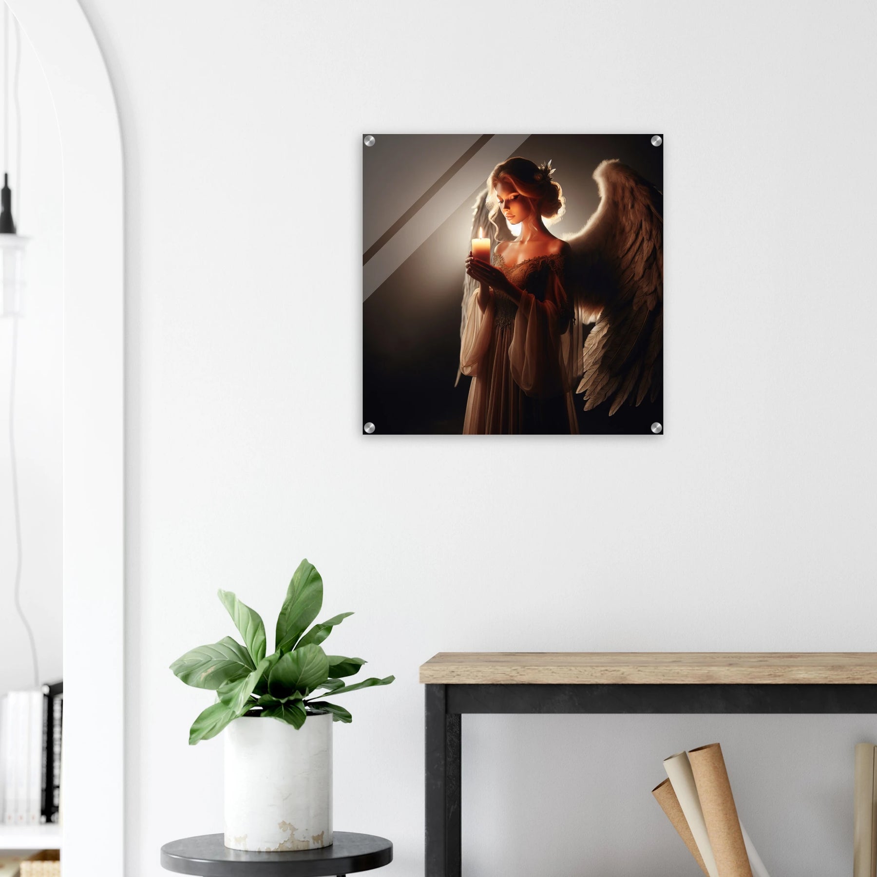 Acrylglasdruck: Schutzengel hält eine brennende Kerze in der Dunkelheit, Flamme der Hoffnung brennt hell, eindrucksvolle Wandkunst für Menschen, die Trost und Zuversicht suchen