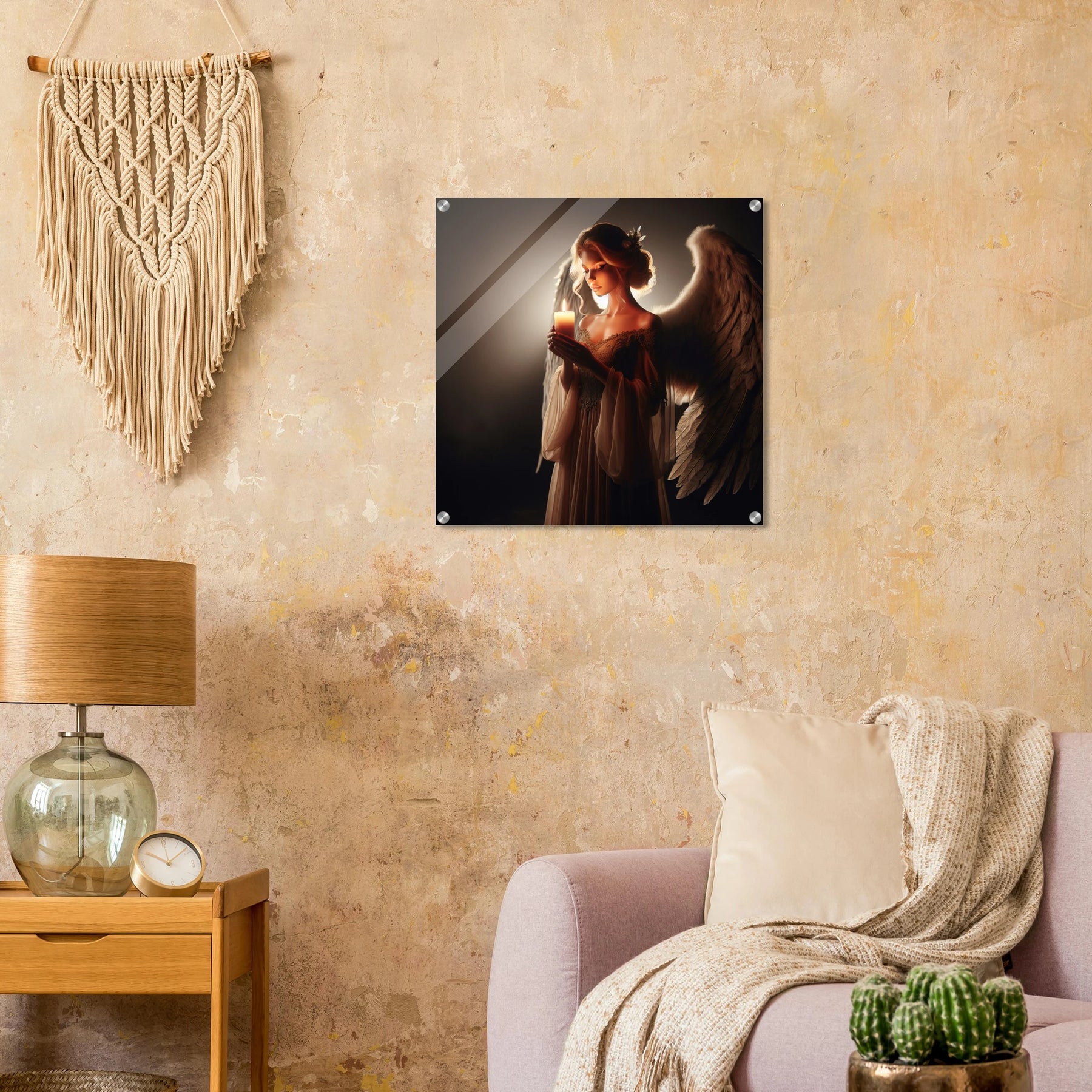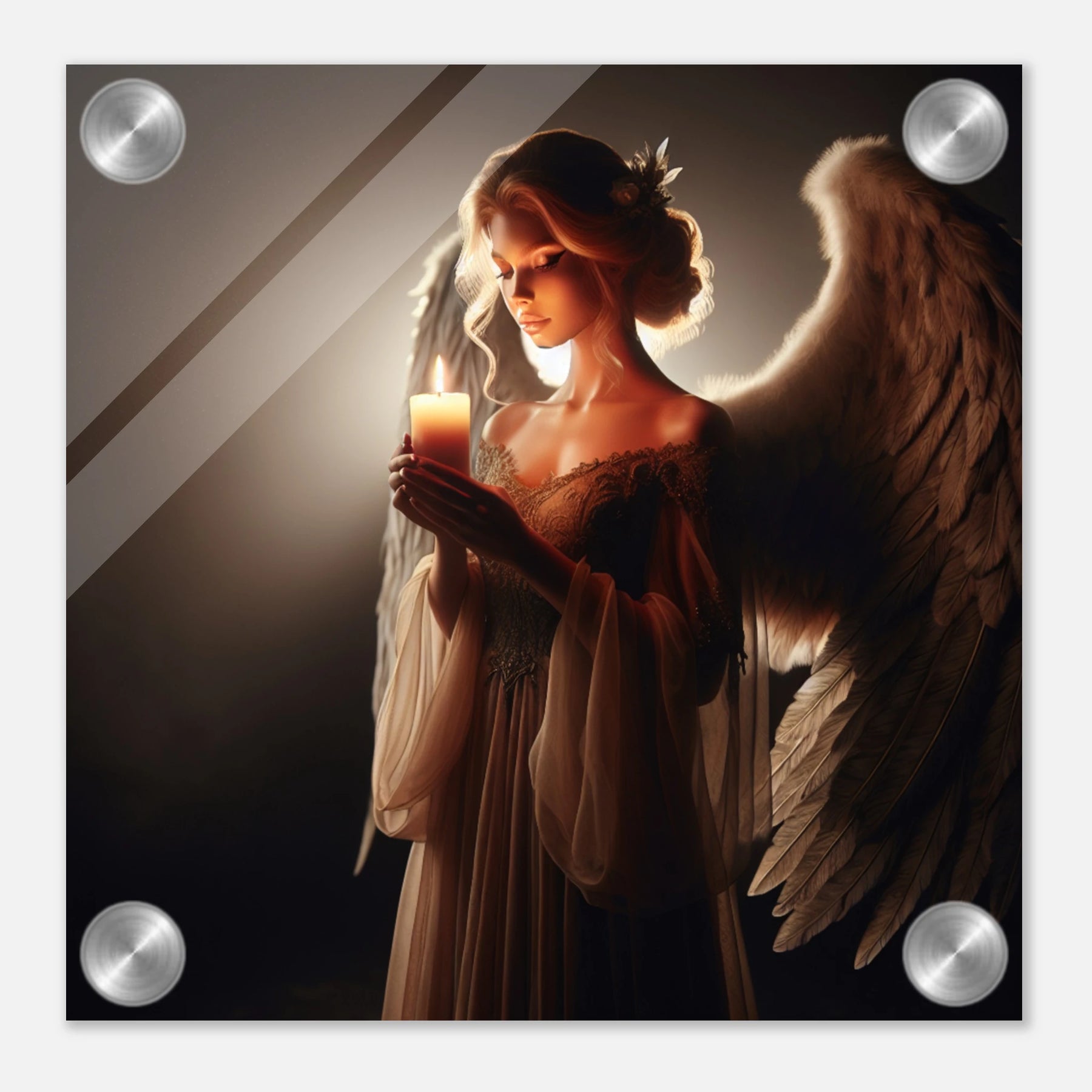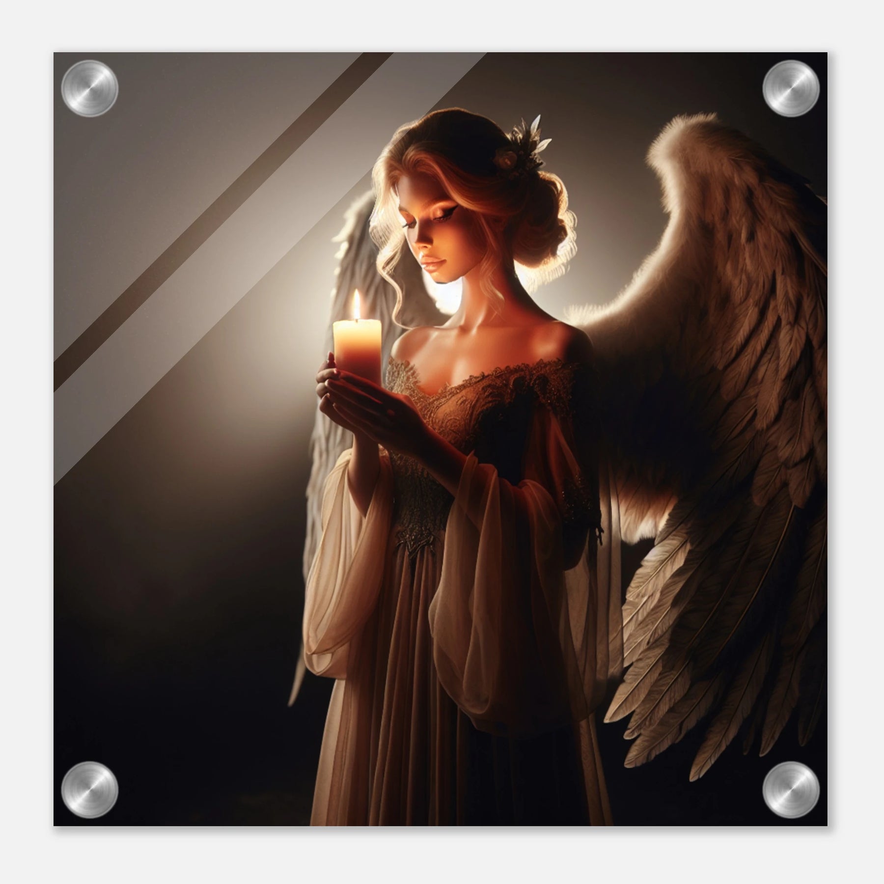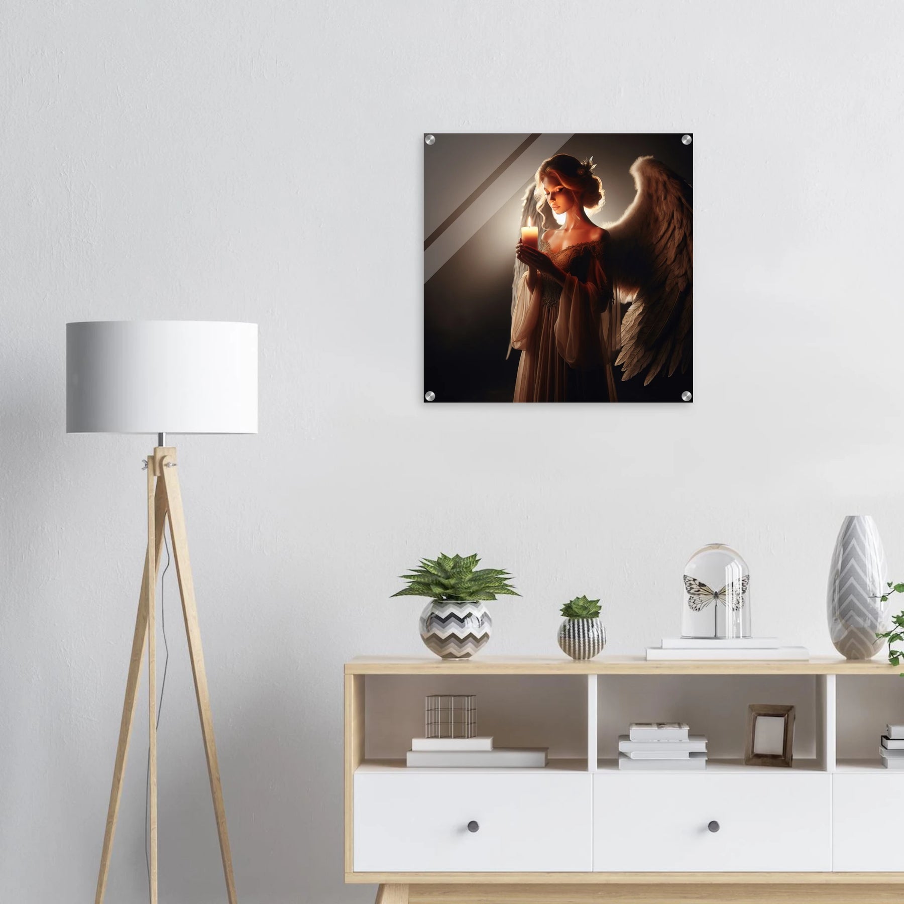 Acrylglasdruck: Schutzengel hält eine brennende Kerze in der Dunkelheit, Flamme der Hoffnung brennt hell, eindrucksvolle Wandkunst für Menschen, die Trost und Zuversicht suchen