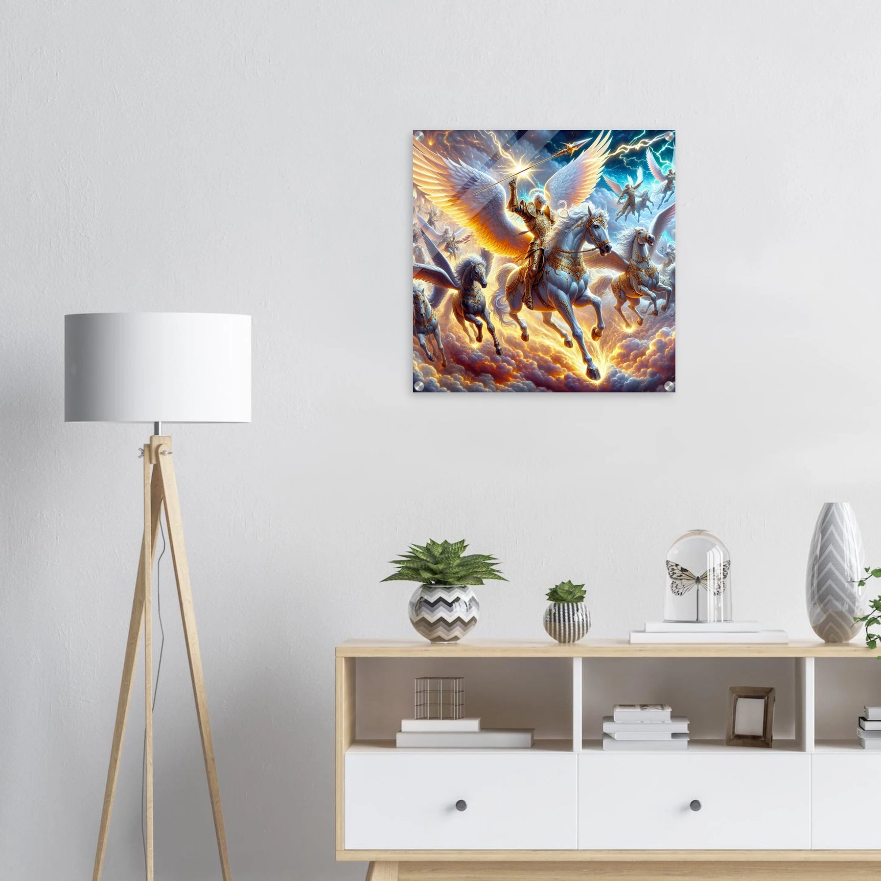 Acrylglasdruck – Himmlische Stärke auf glänzendem Grund