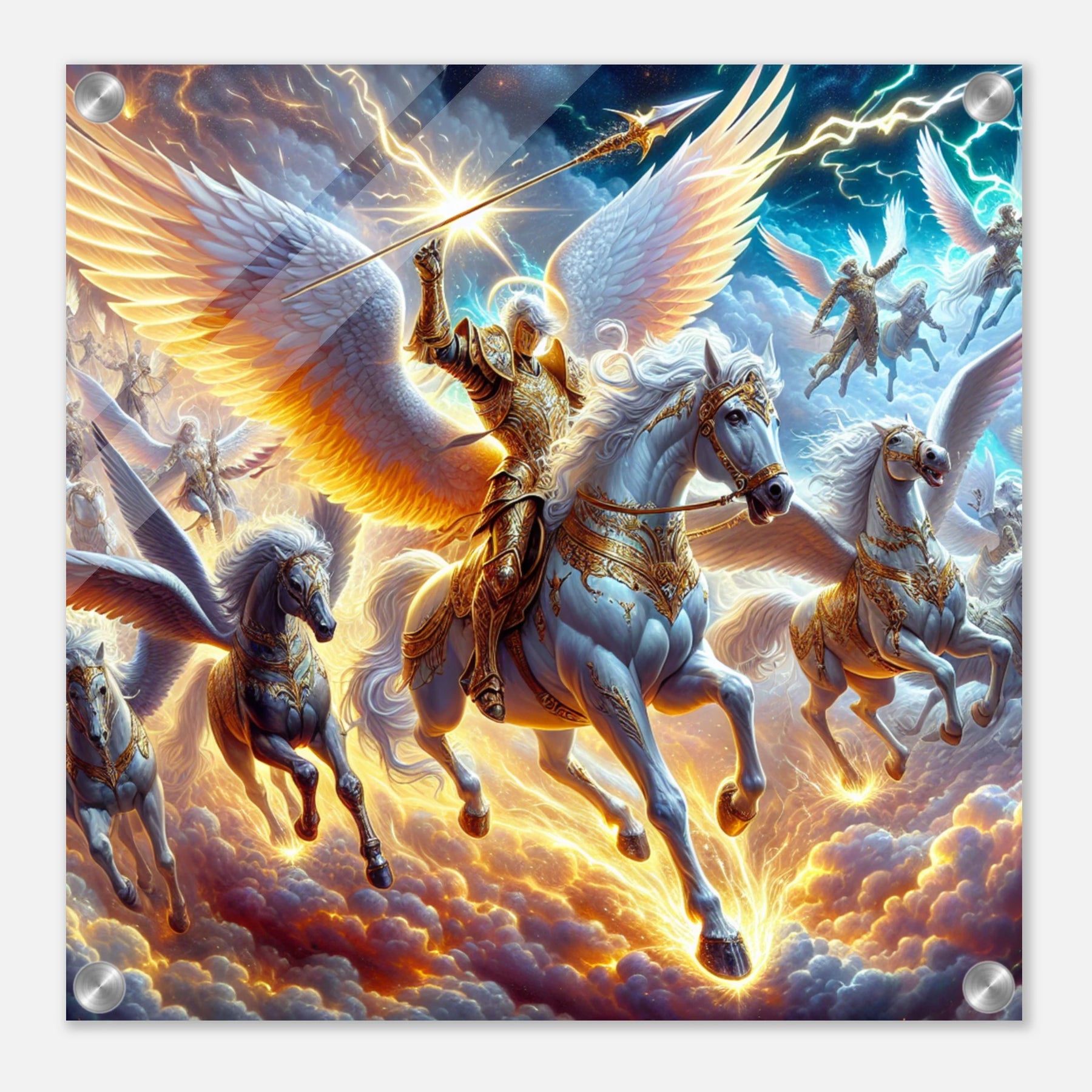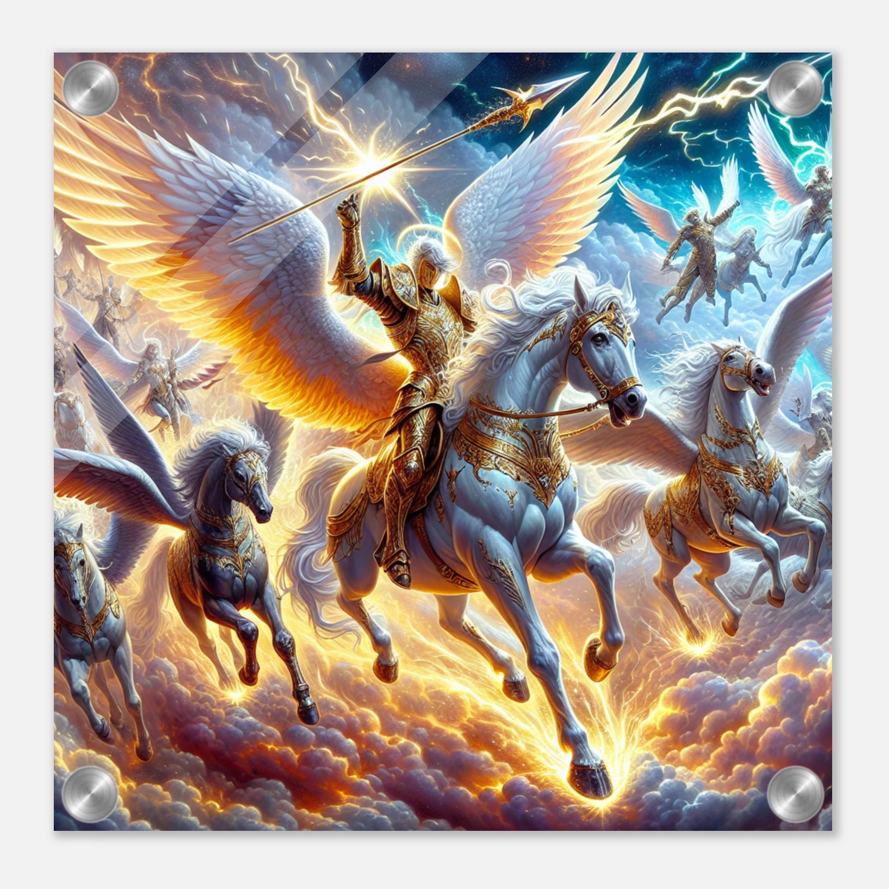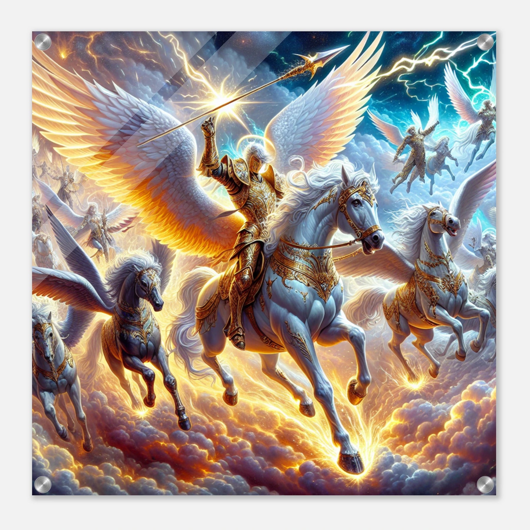 Detailreicher Acrylglasdruck mit fliegenden Kriegerengeln und goldener Rüstung – kraftvolle Fantasy-Szene