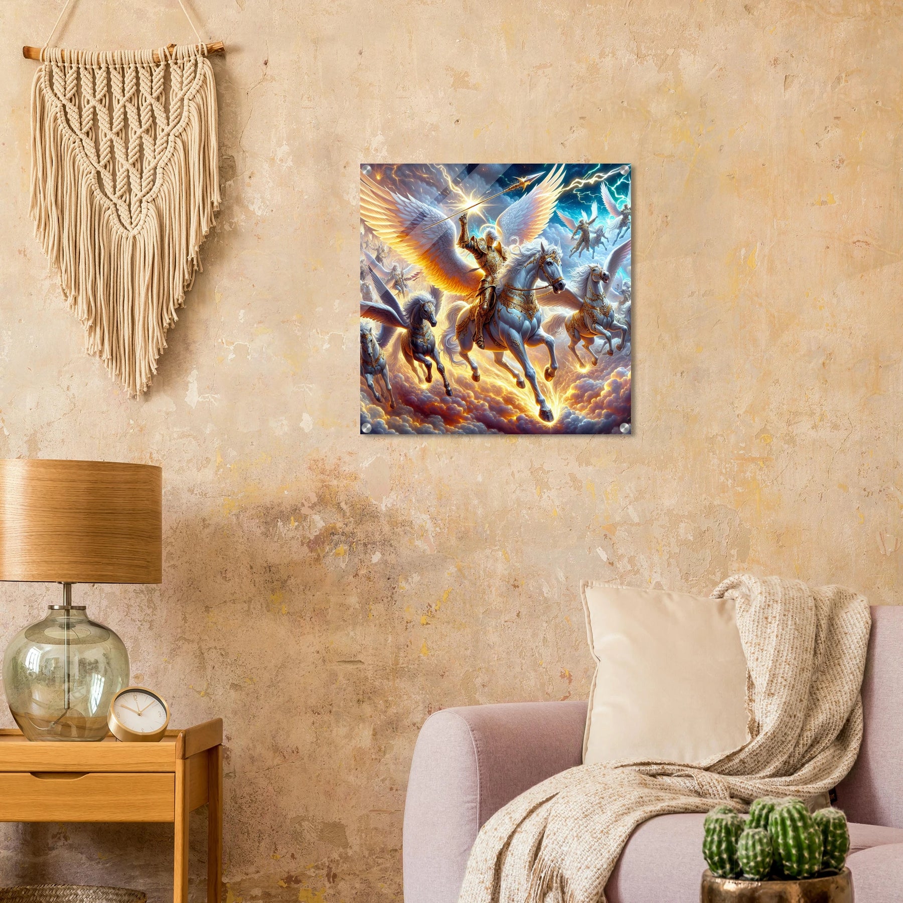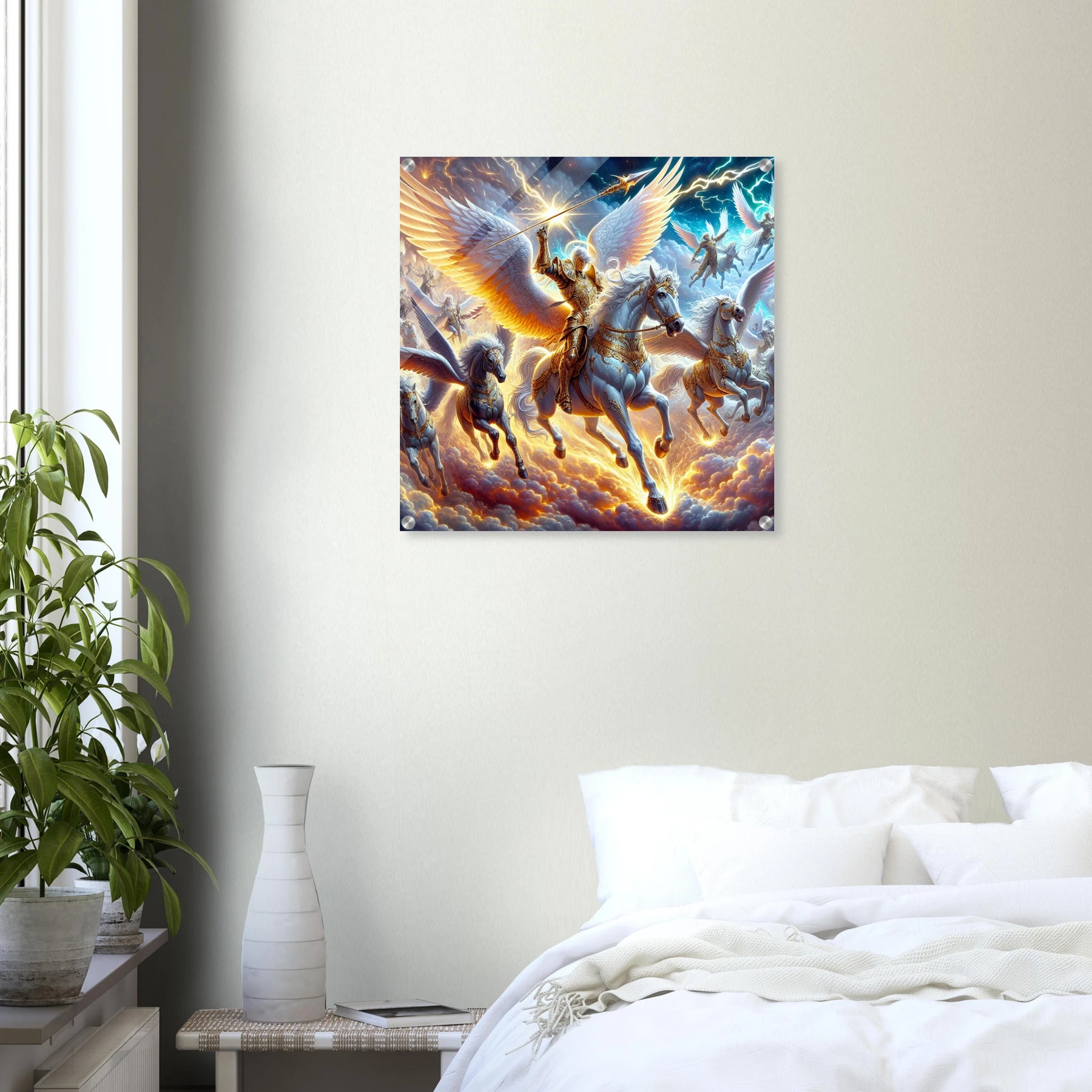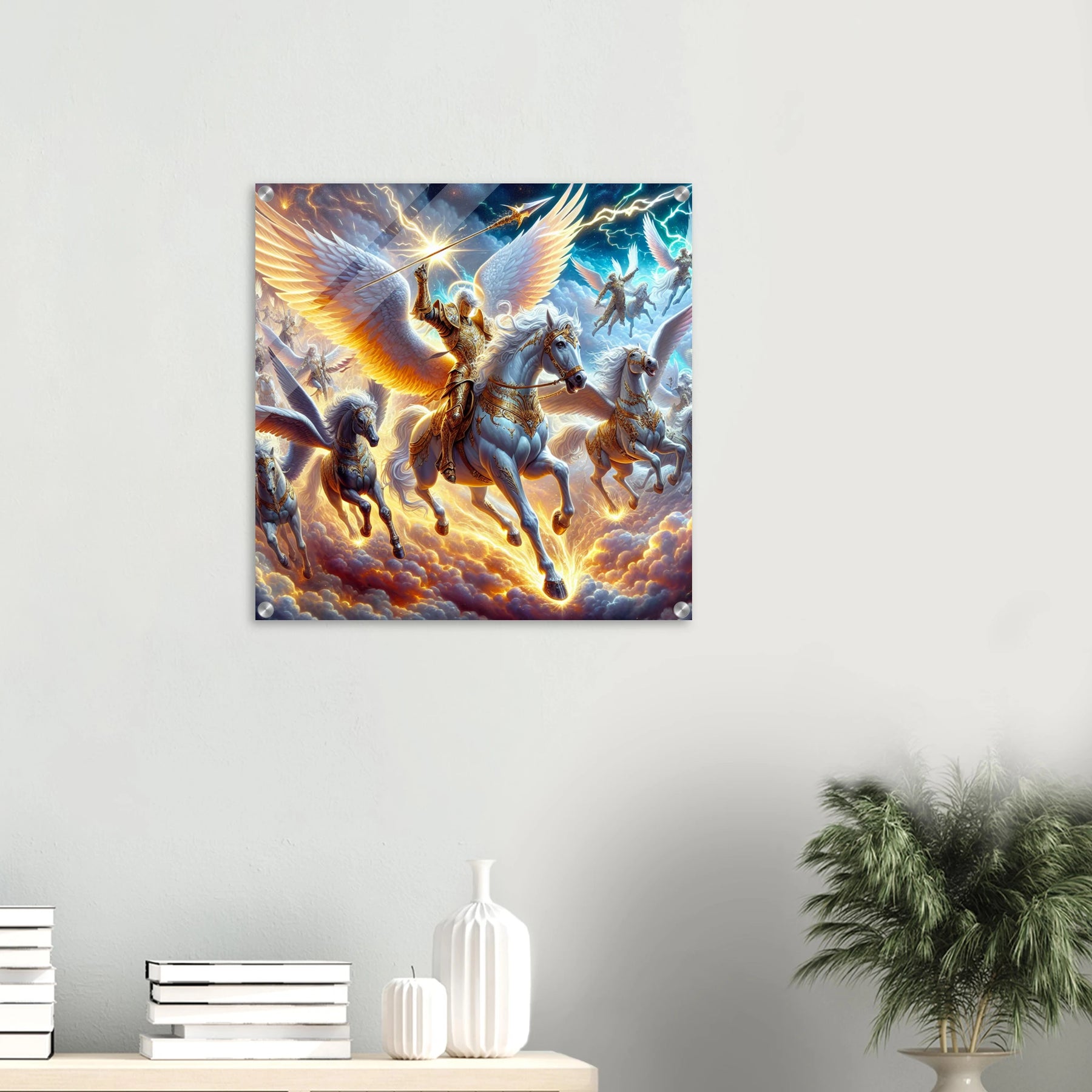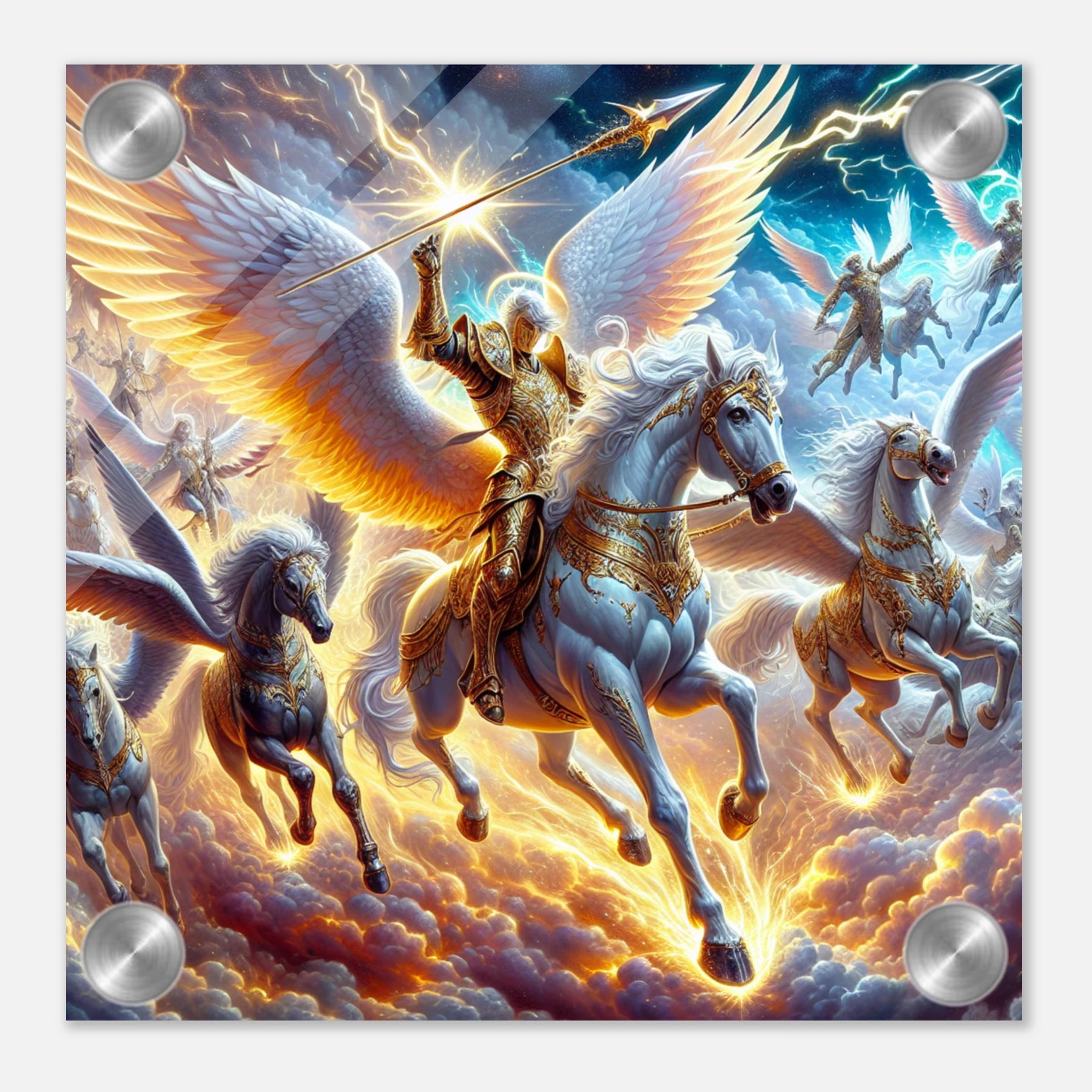Detailreicher Acrylglasdruck mit fliegenden Kriegerengeln und goldener Rüstung – kraftvolle Fantasy-Szene