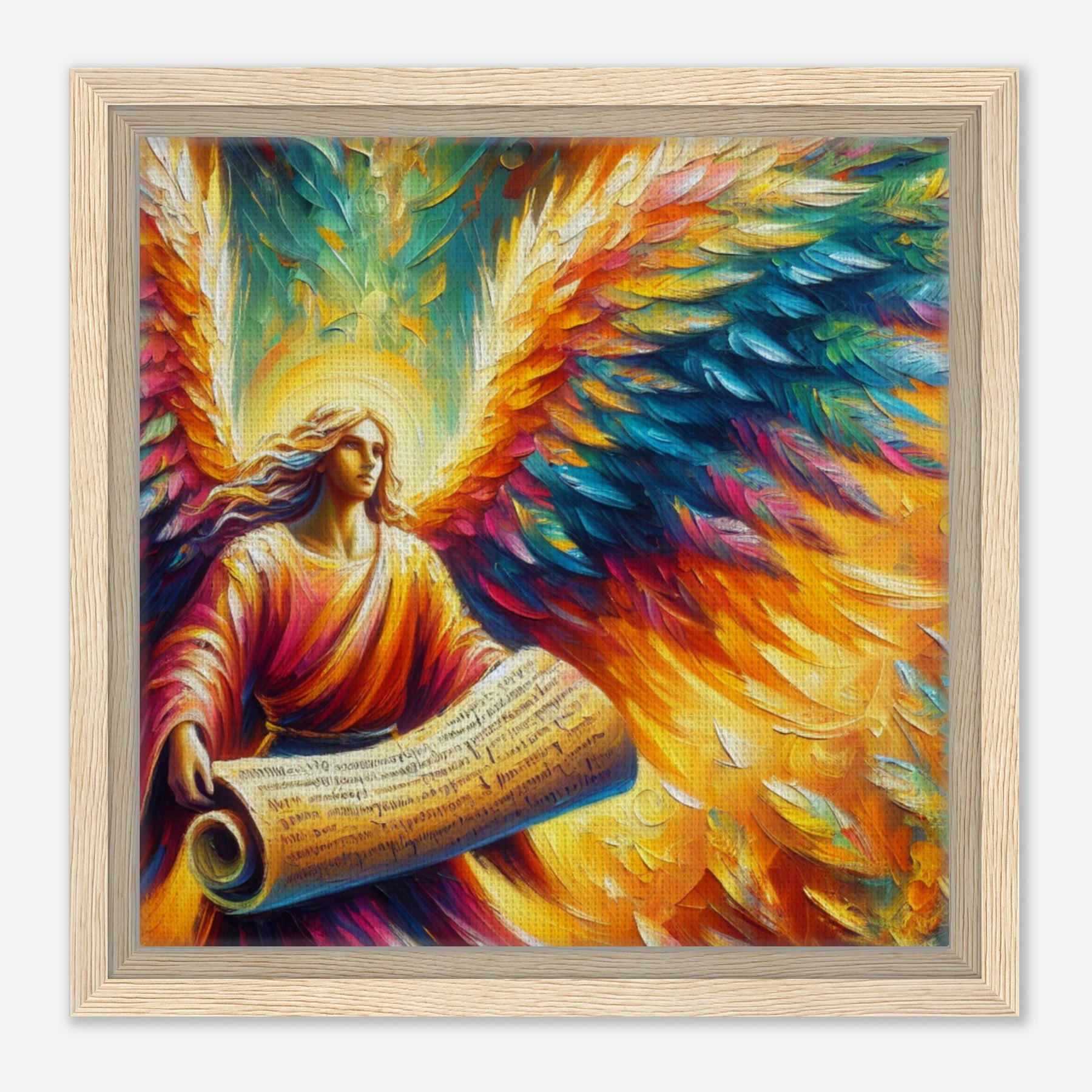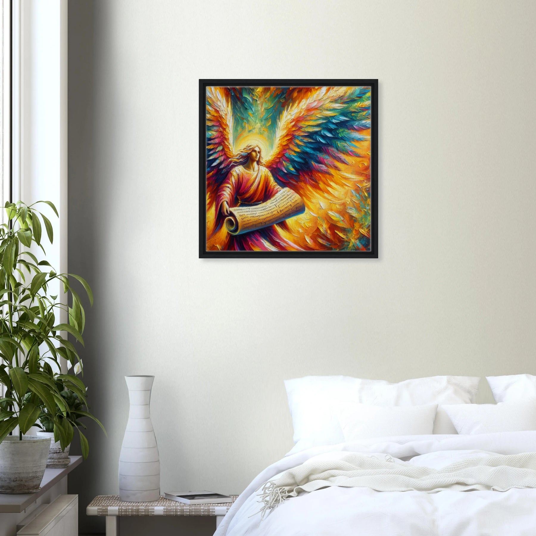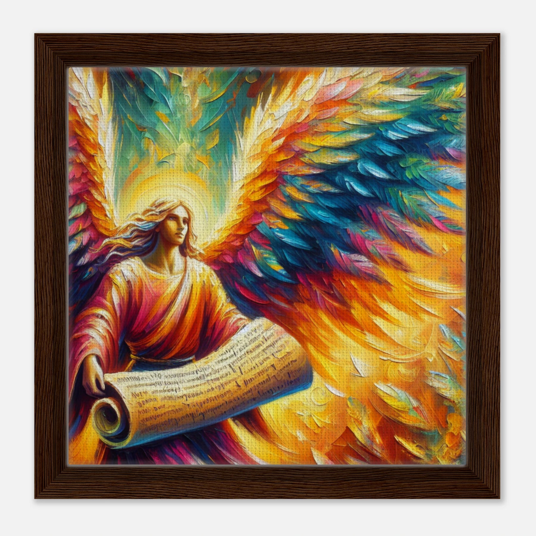 Gerahmte Leinwand: The Divine Messenger, bunter Engel als Apostel mit großer Schriftrolle, symbolisiert Gebote oder Wünsche der Menschen, inspirierende Wanddekoration für Wohnzimmer und kreative Räume
