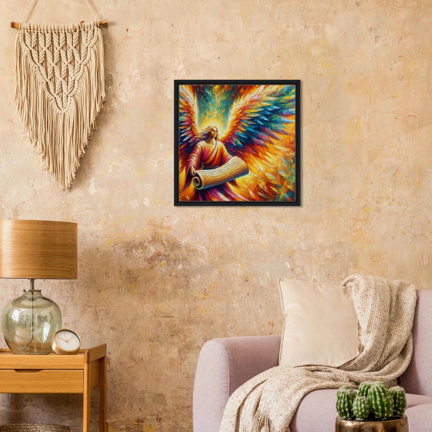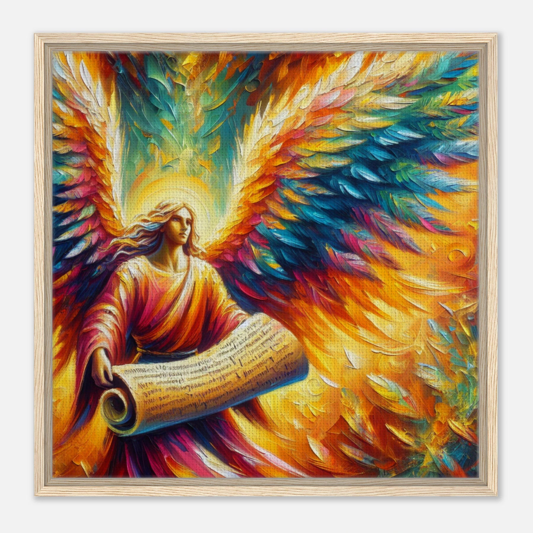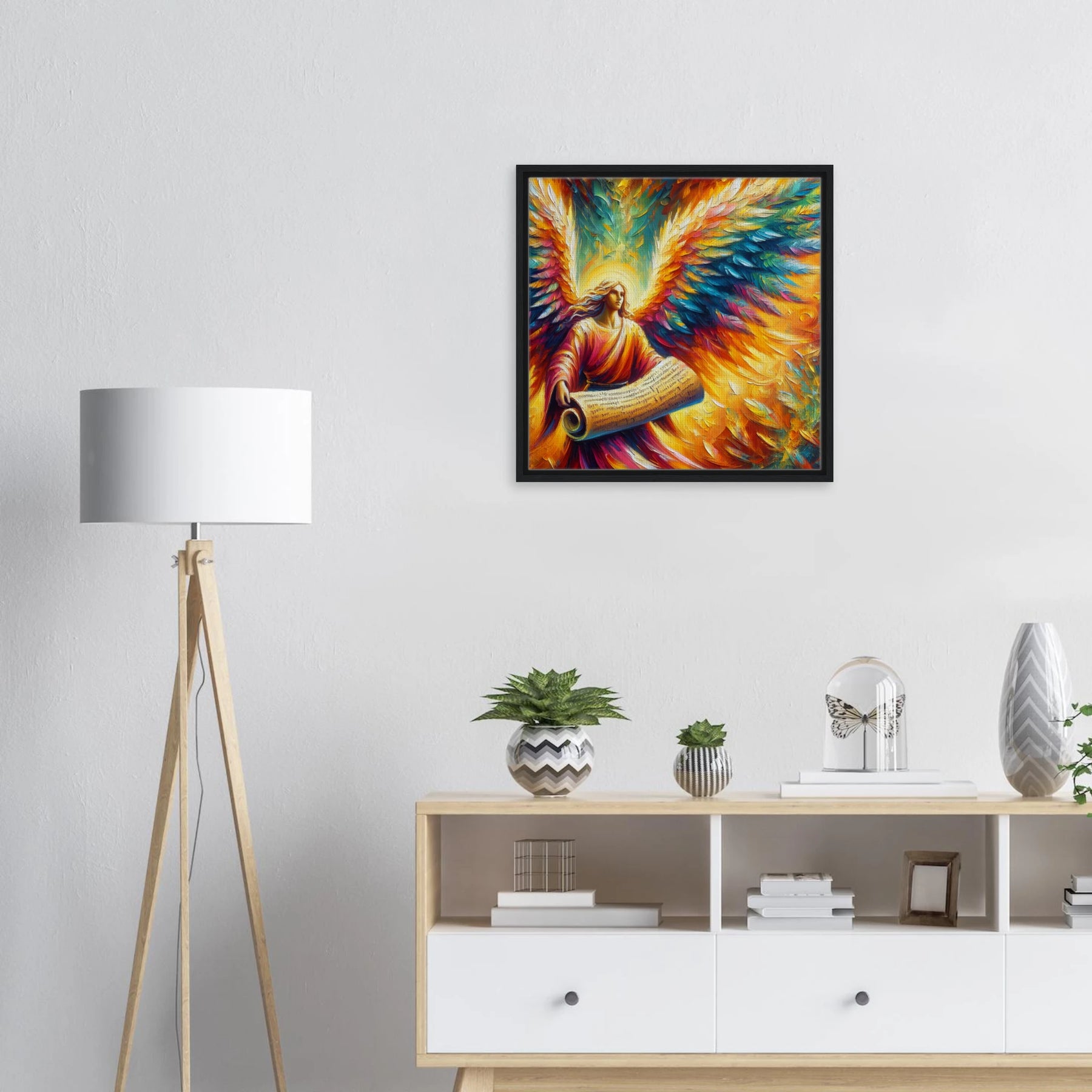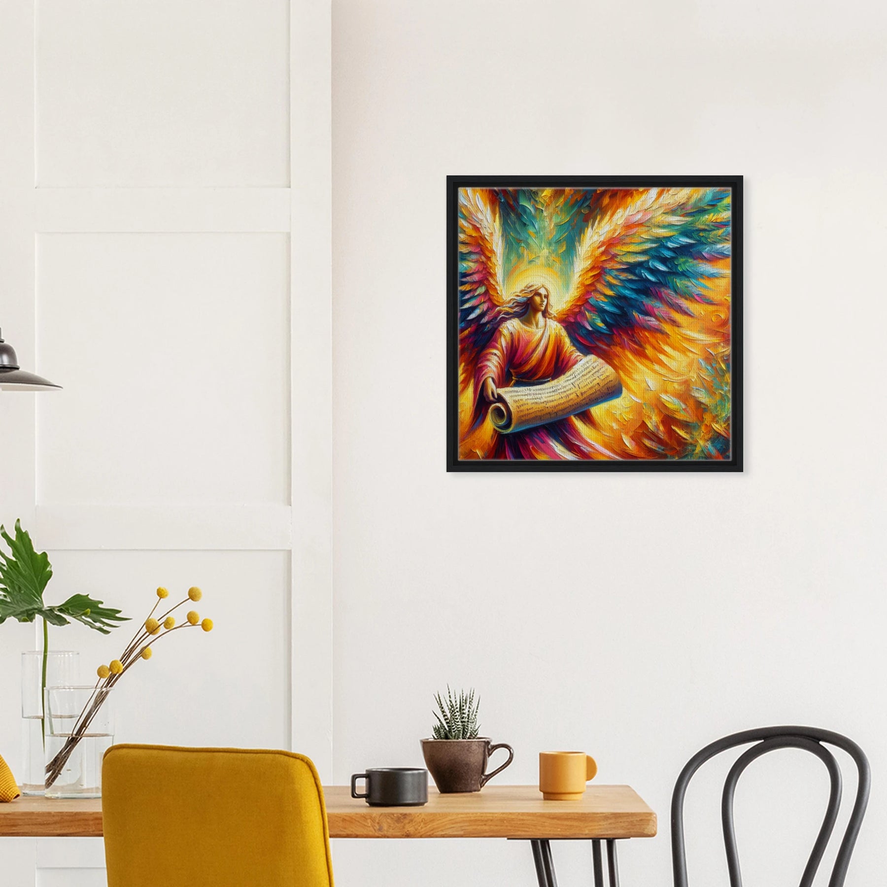 Gerahmte Leinwand: The Divine Messenger, bunter Engel als Apostel mit großer Schriftrolle, symbolisiert Gebote oder Wünsche der Menschen, inspirierende Wanddekoration für Wohnzimmer und kreative Räume