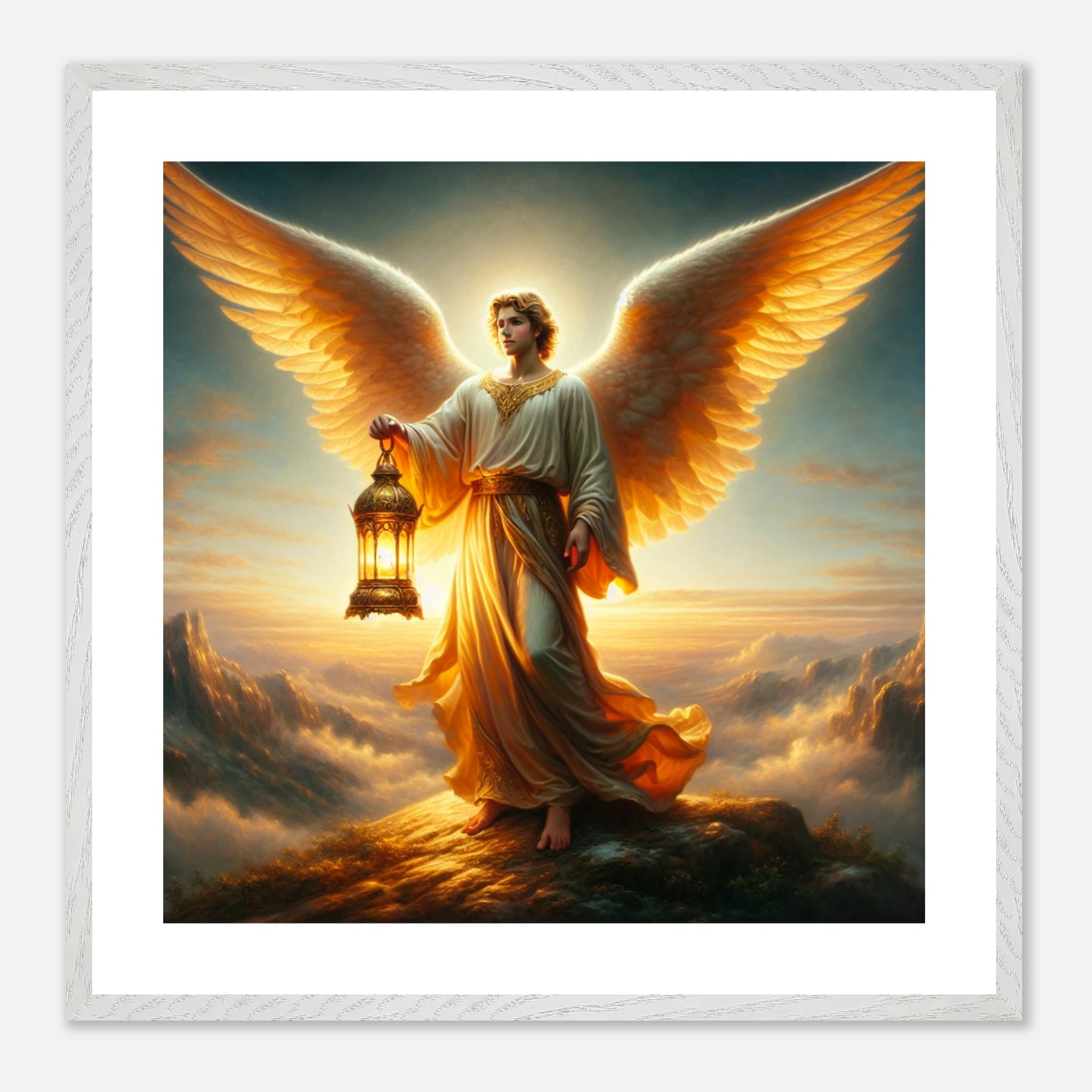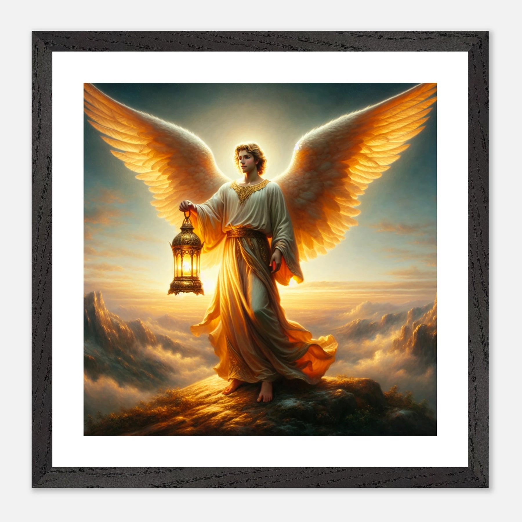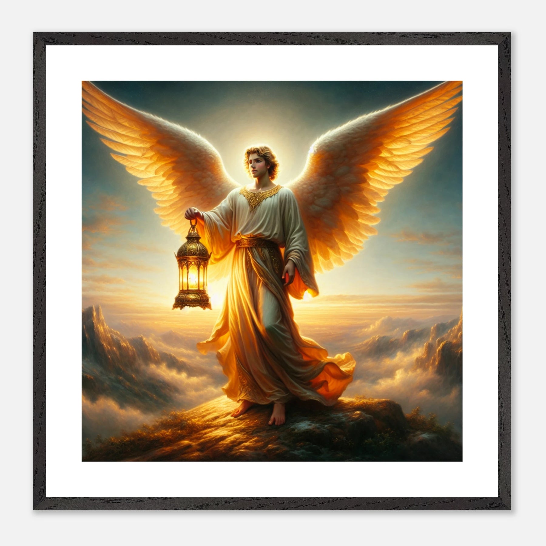 Gerahmtes Premium-Poster: Heiliger Engel mit Laterne auf einem Gipfel eines hohen Berges, Schutzheiliger der Bergsteiger, ideale Wandkunst für Outdoor-Enthusiasten und Bergsteiger