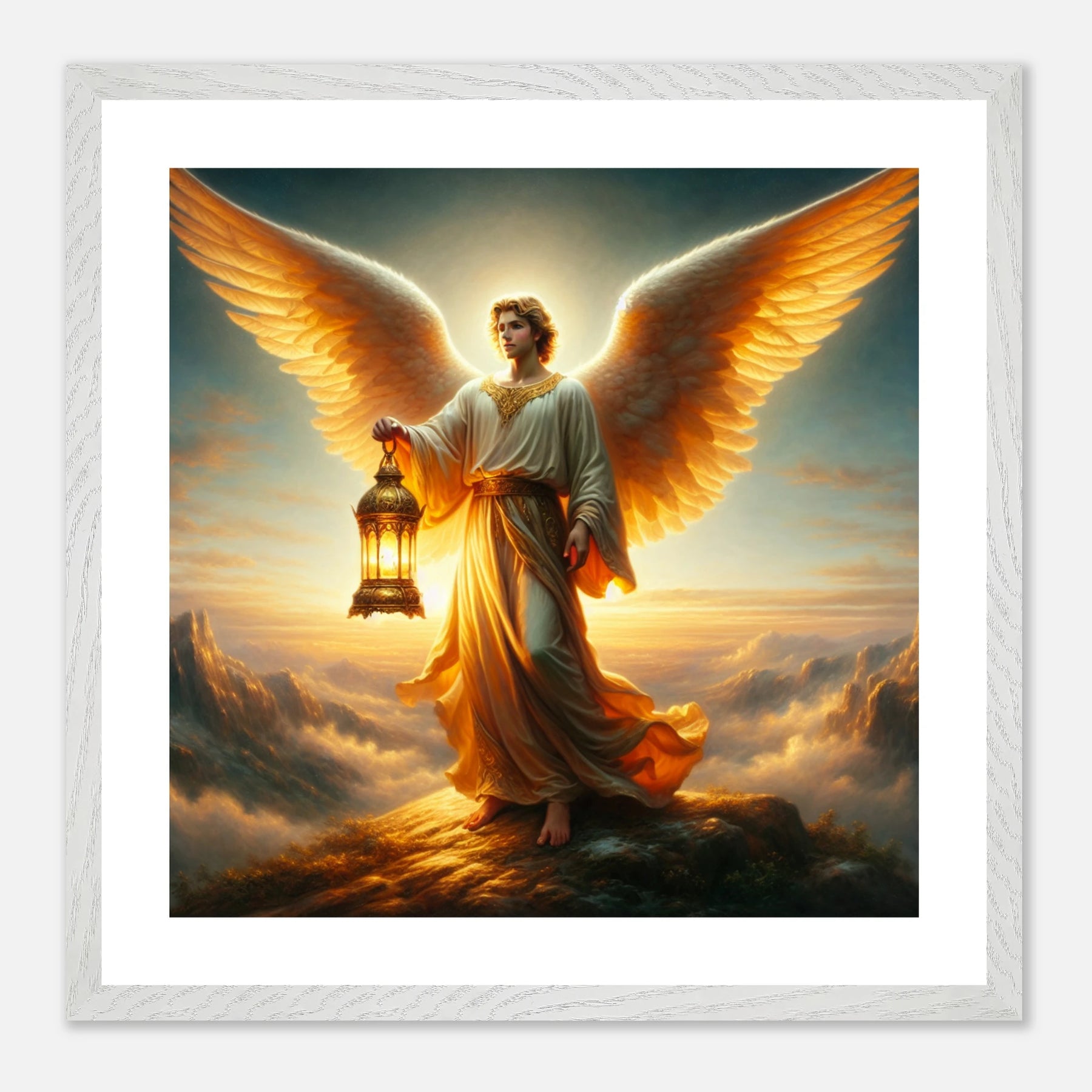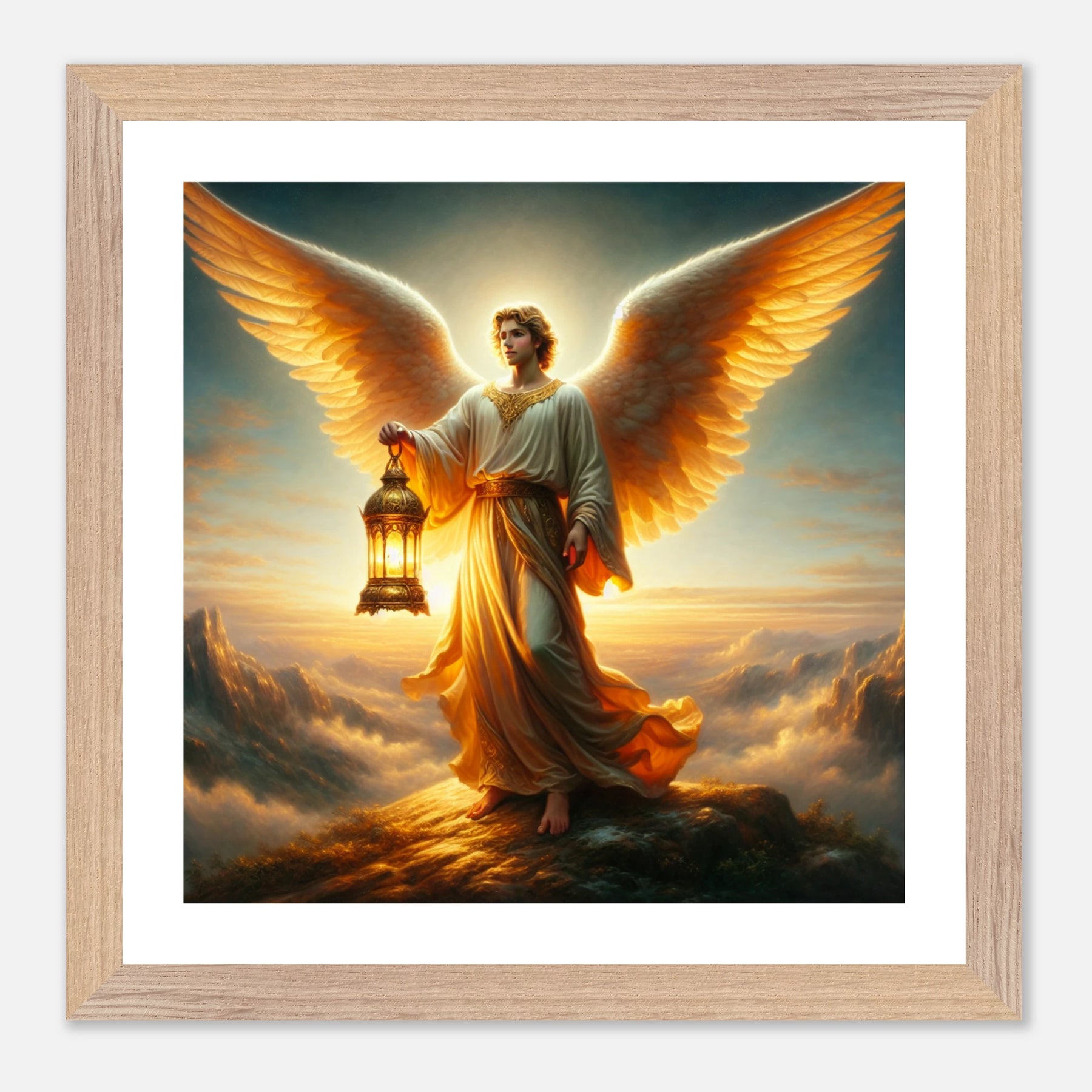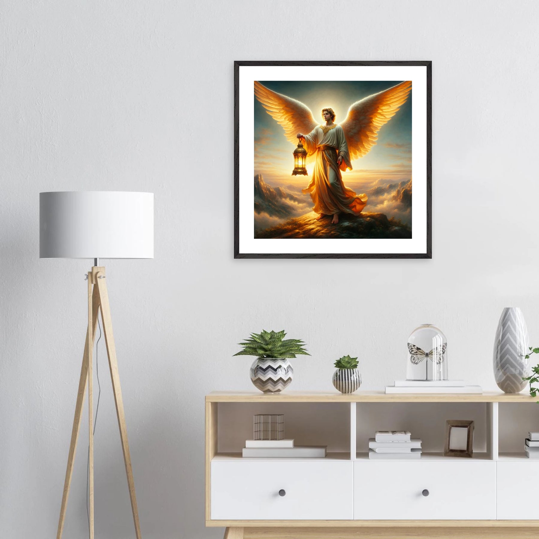 Gerahmtes Premium-Poster: Heiliger Engel mit Laterne auf einem Gipfel eines hohen Berges, Schutzheiliger der Bergsteiger, ideale Wandkunst für Outdoor-Enthusiasten und Bergsteiger