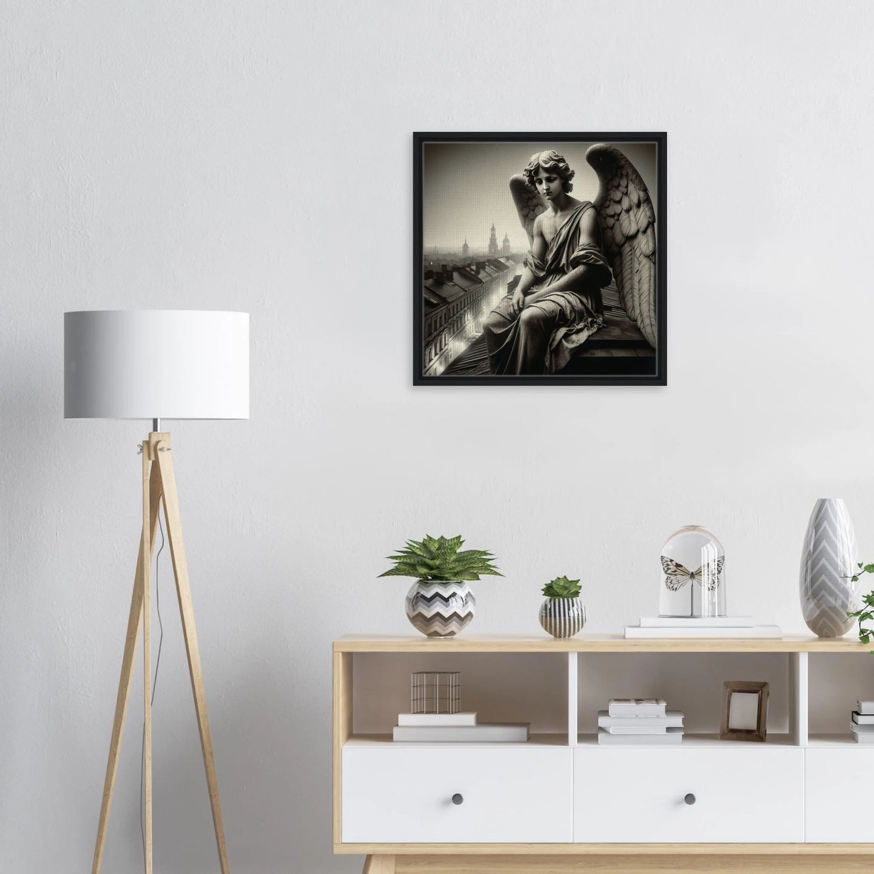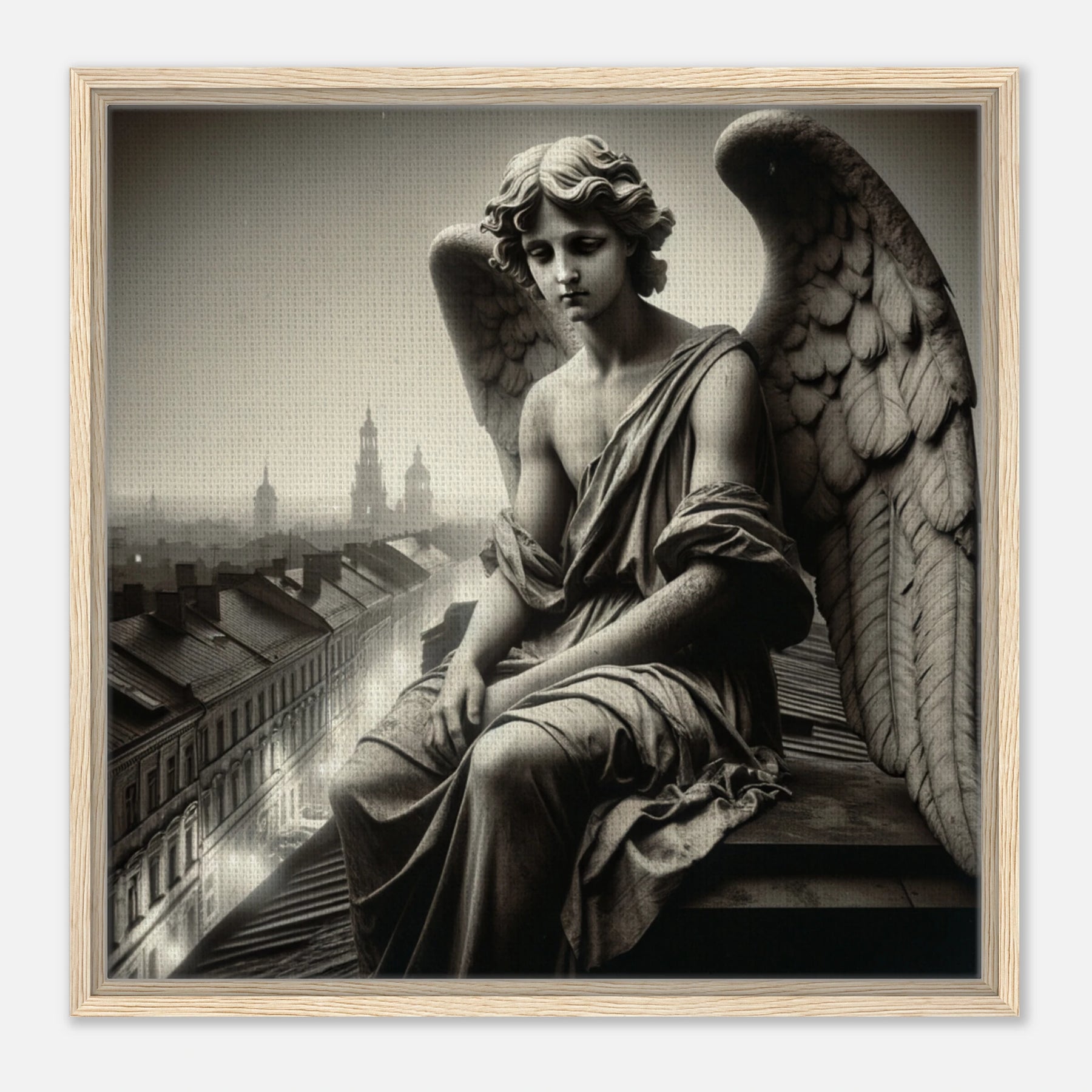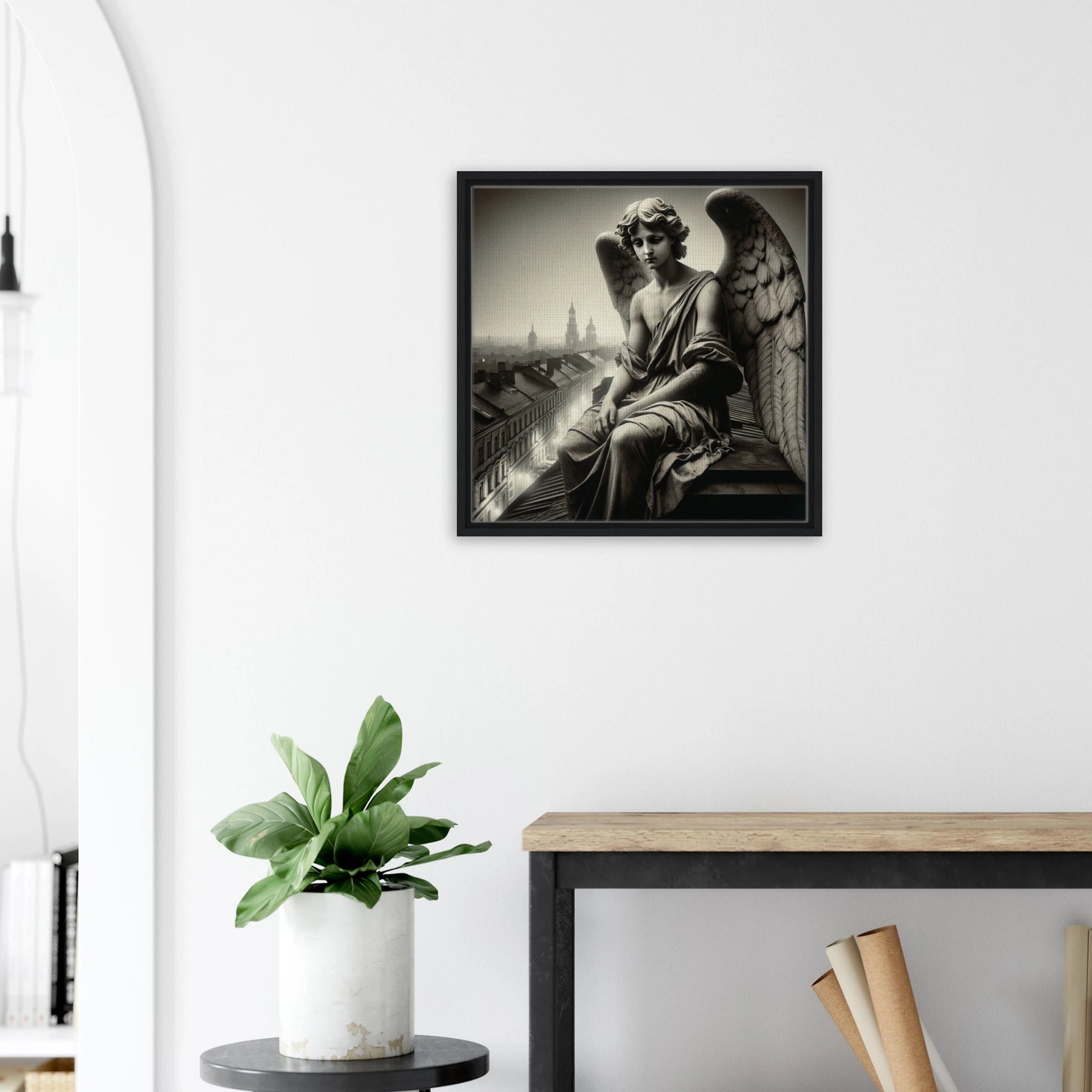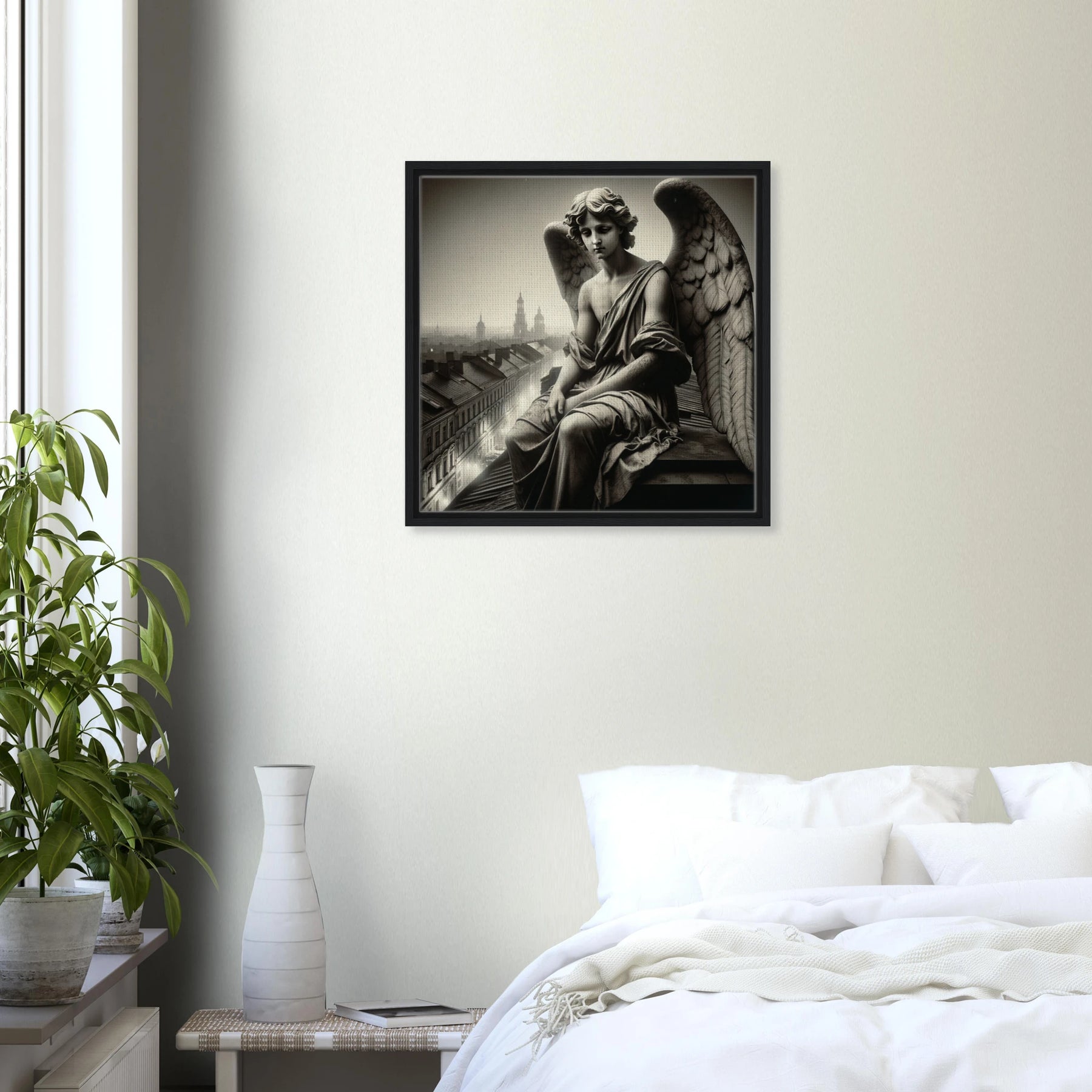 Gerahmte Leinwand: The Silent Guardian, Engel in Schwarz-Weiß-Optik, sitzt traurig auf einem Dach und schaut enttäuscht auf die Menschen, emotionale Wanddekoration für Wohnzimmer und reflektierende Räume