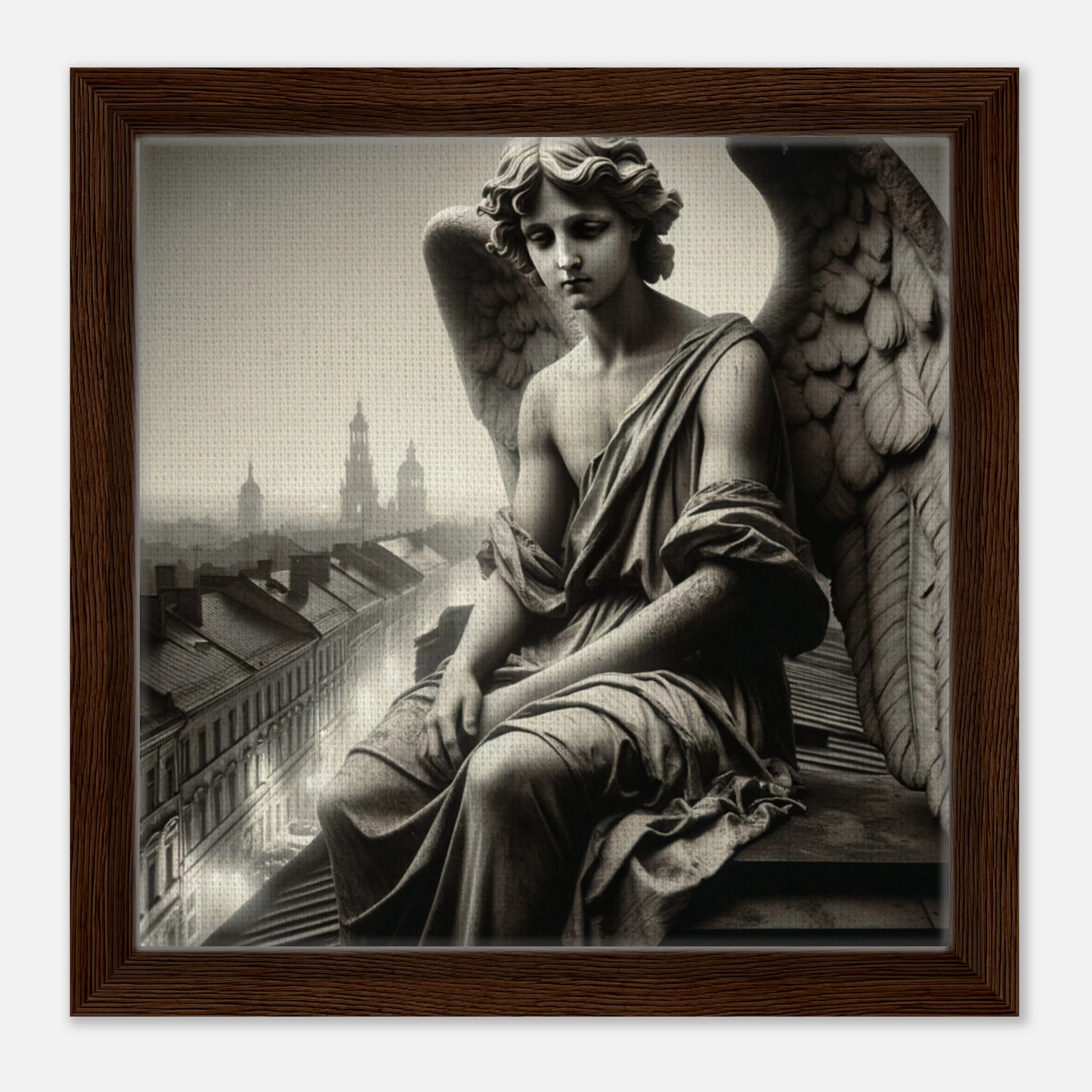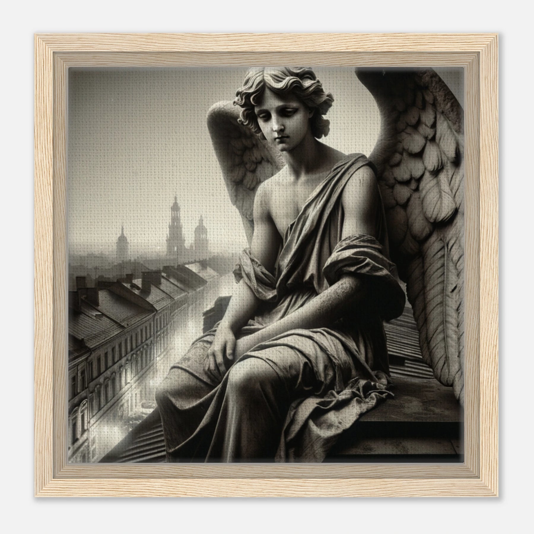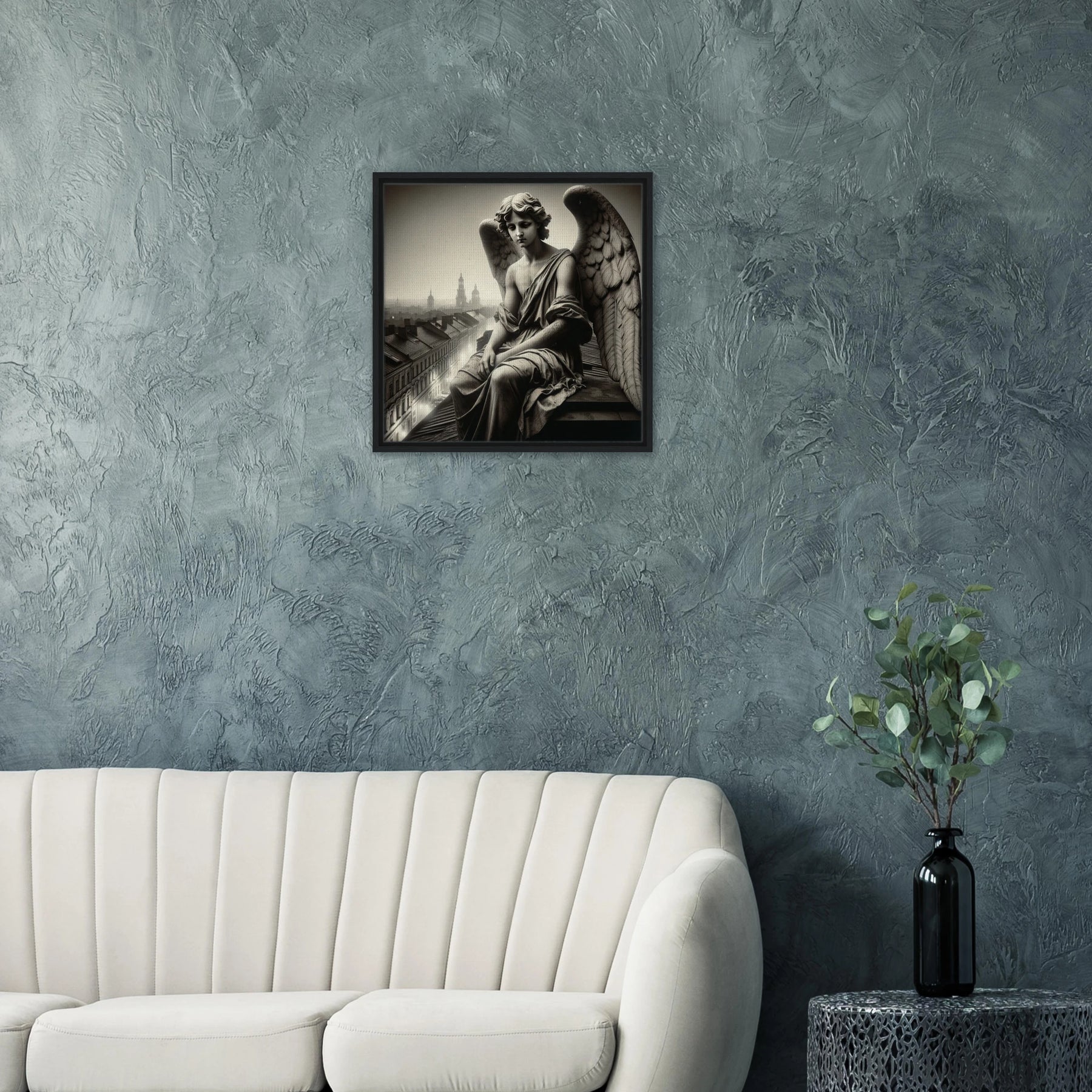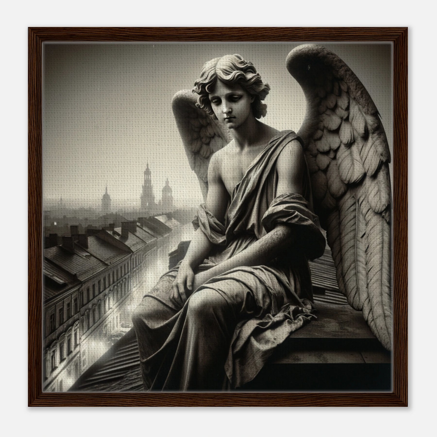 Gerahmte Leinwand: The Silent Guardian, Engel in Schwarz-Weiß-Optik, sitzt traurig auf einem Dach und schaut enttäuscht auf die Menschen, emotionale Wanddekoration für Wohnzimmer und reflektierende Räume