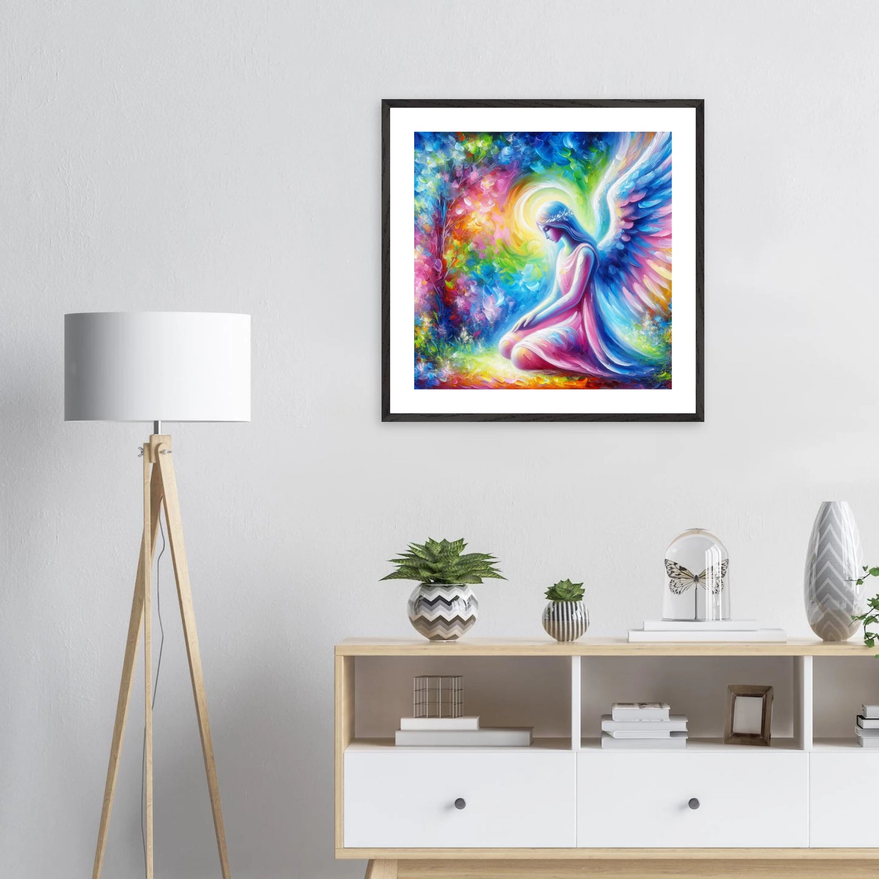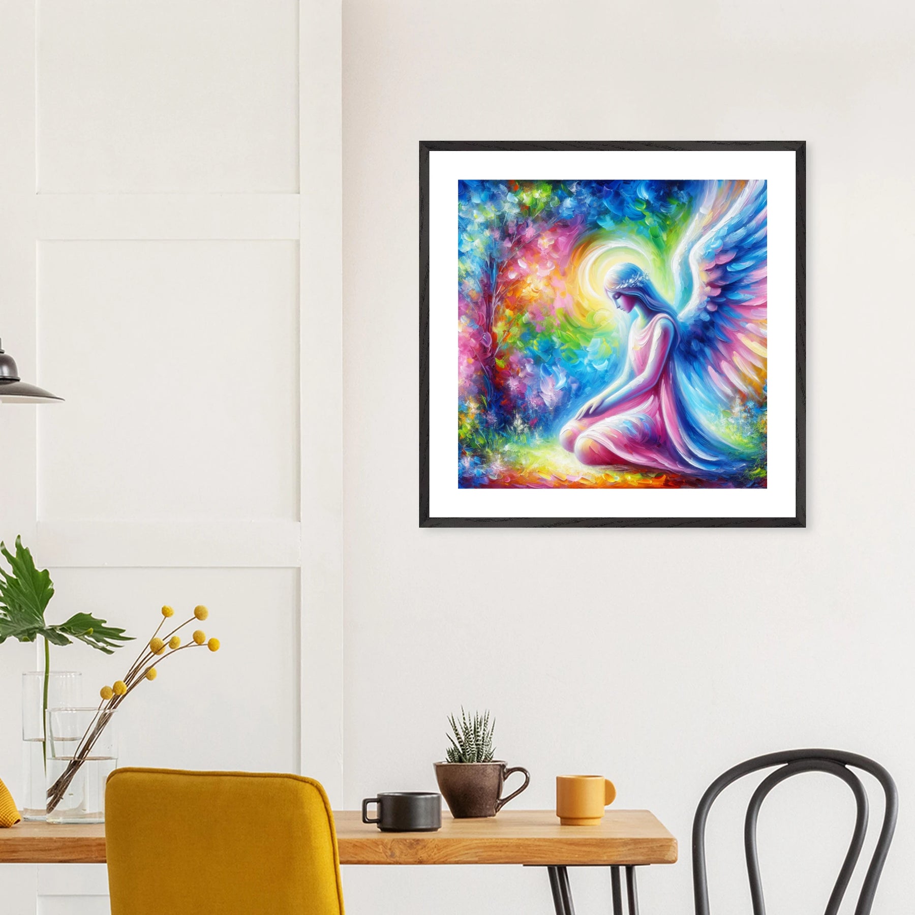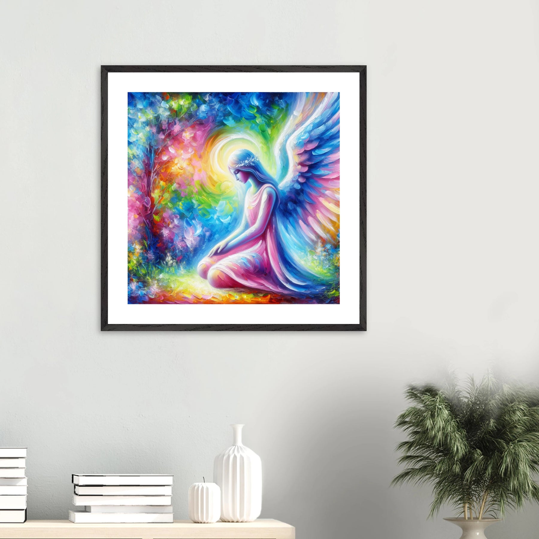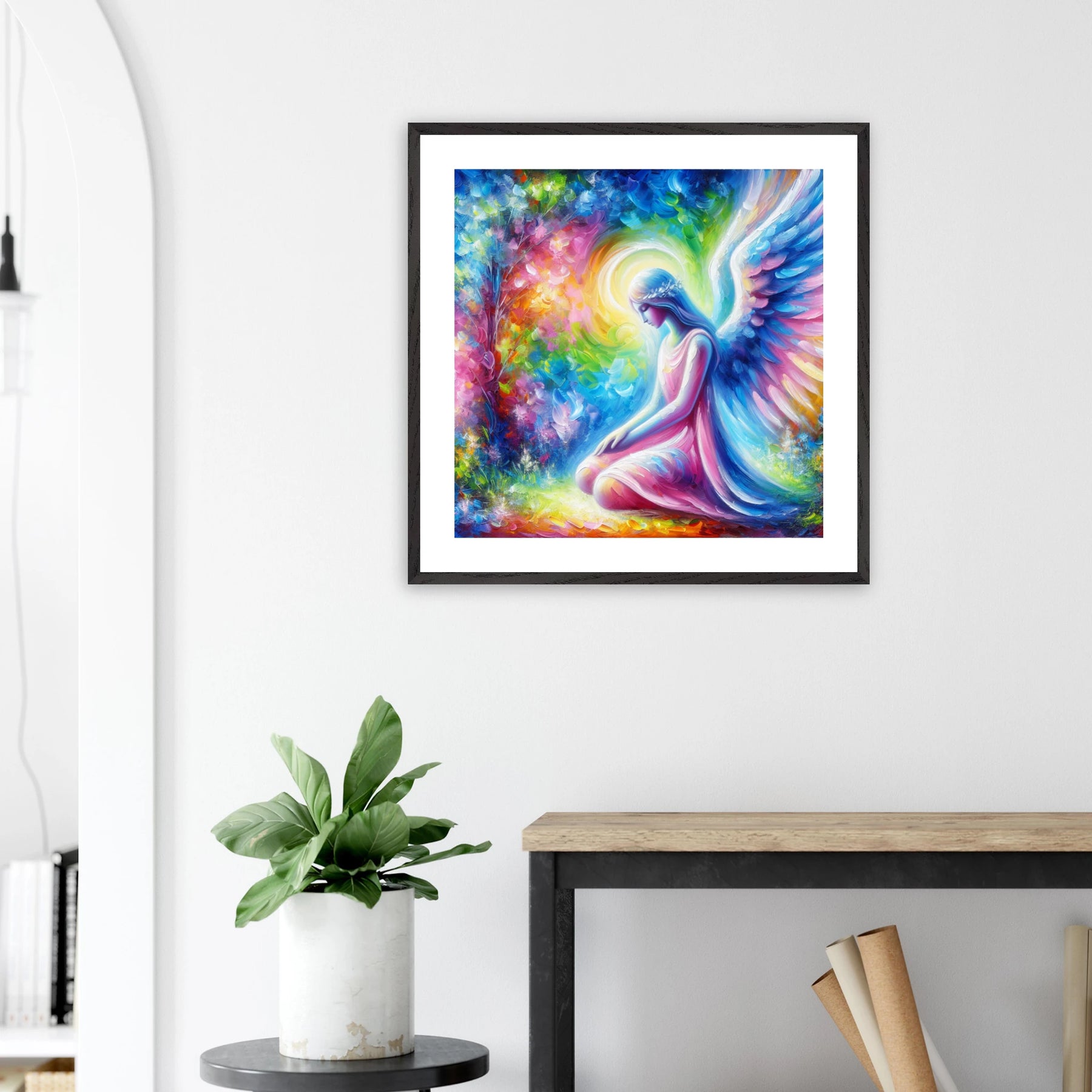 Gerahmtes Premium-Poster: Engel in Acrylfarben gemalt, betet für die Menschheit, farbenfrohe und beruhigende Wandkunst für inspirierende und friedvolle Umgebungen