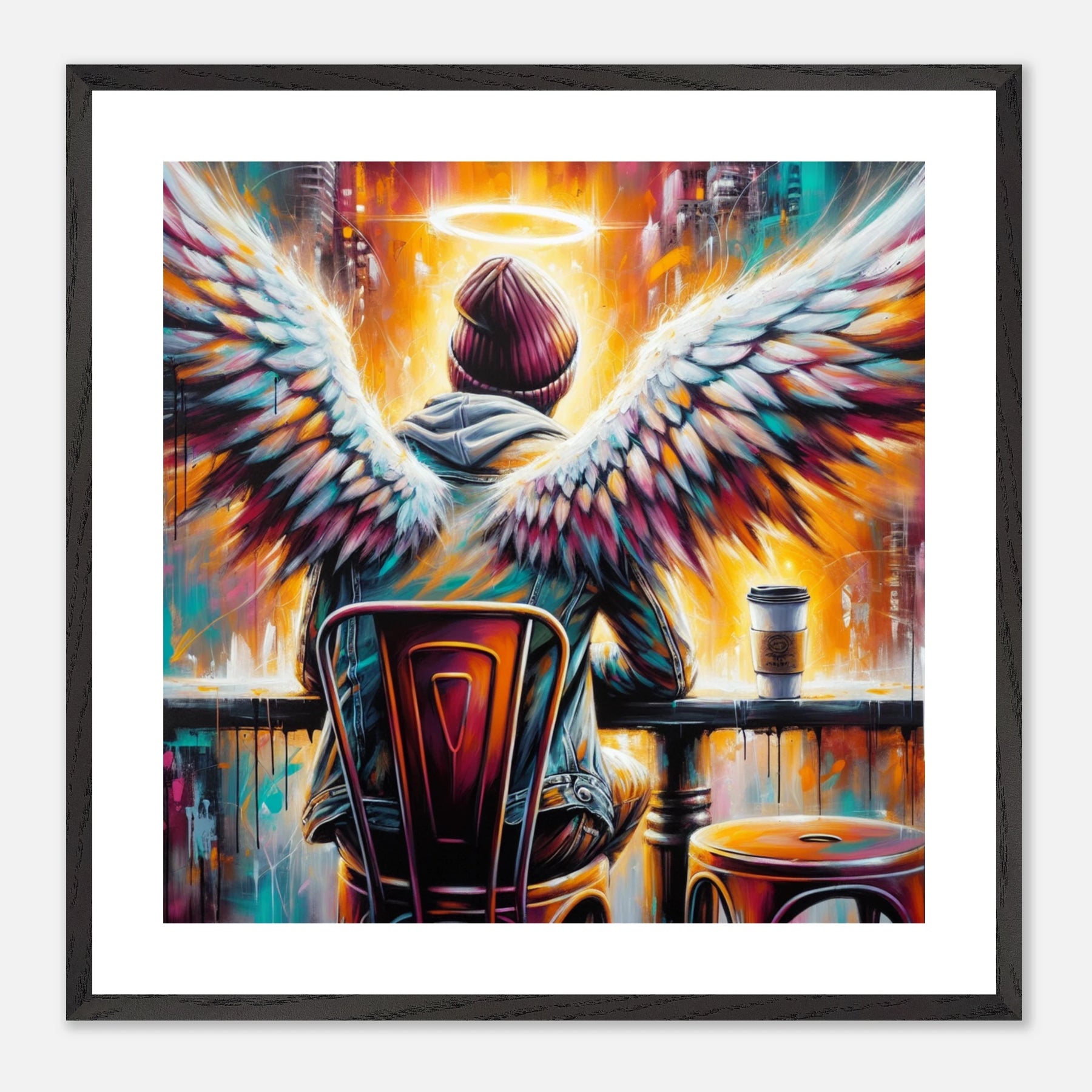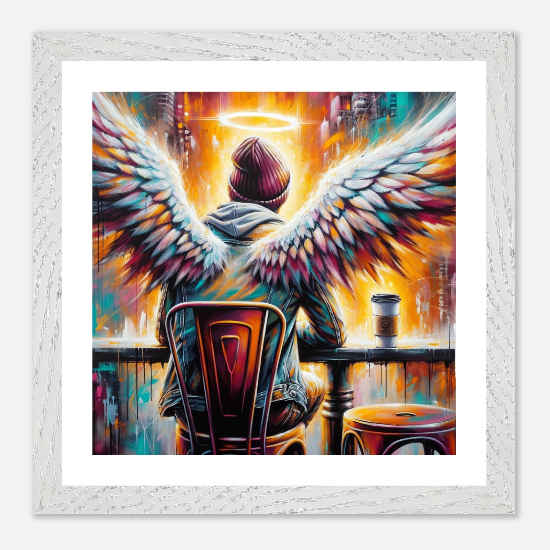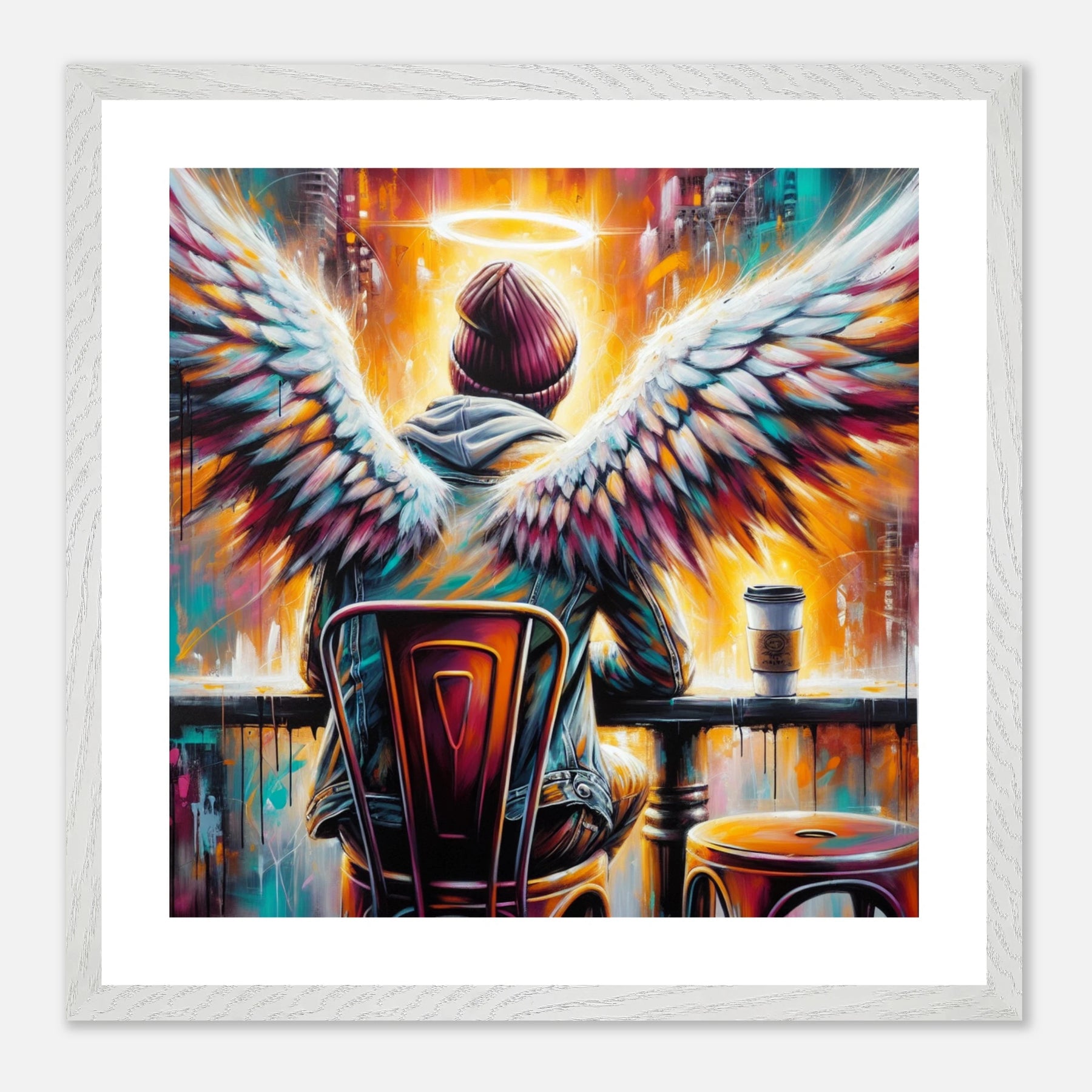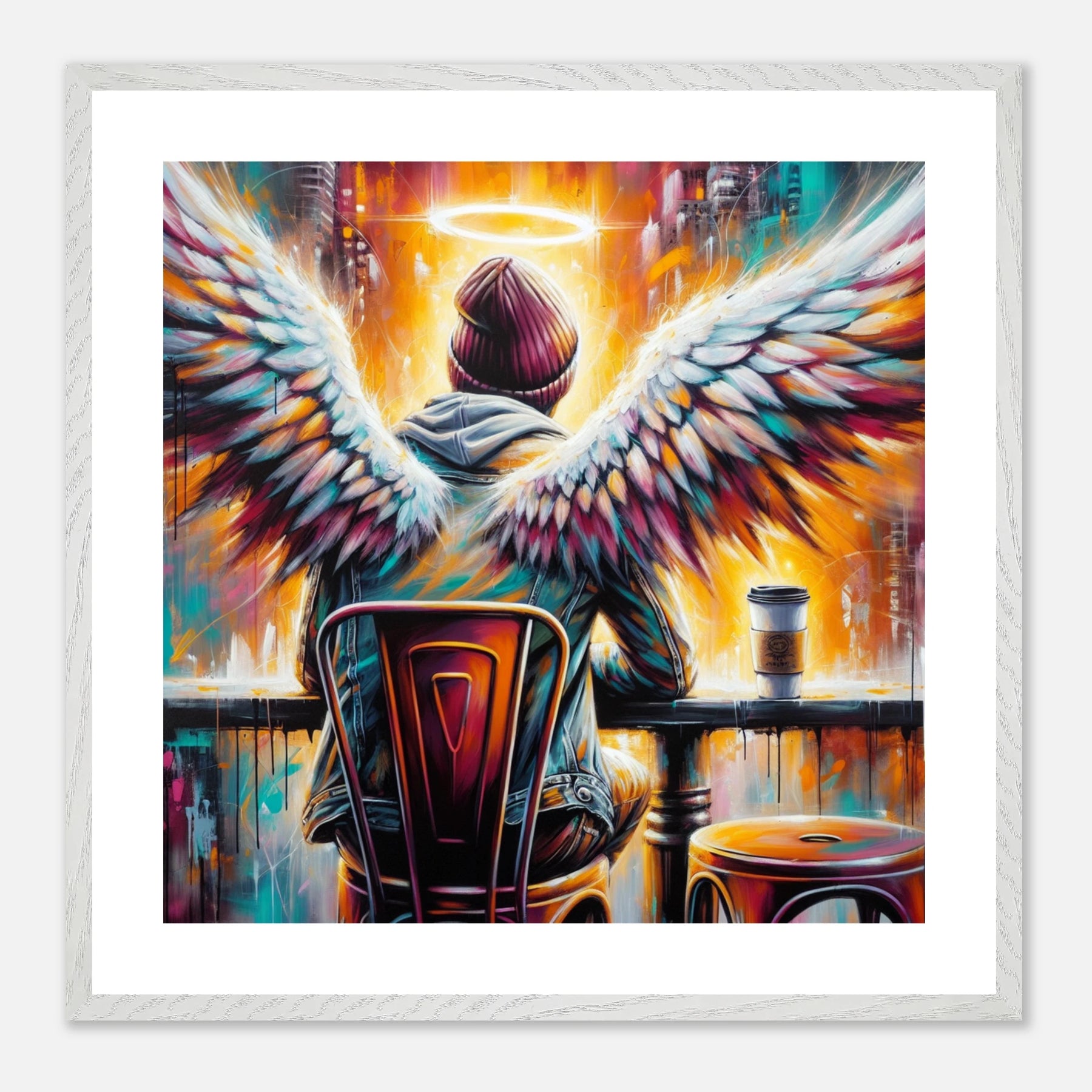 Hipster-Engel im Café mit Heiligenschein – Coffee & Halos Poster, trinkt Kaffee in Acrylfarben