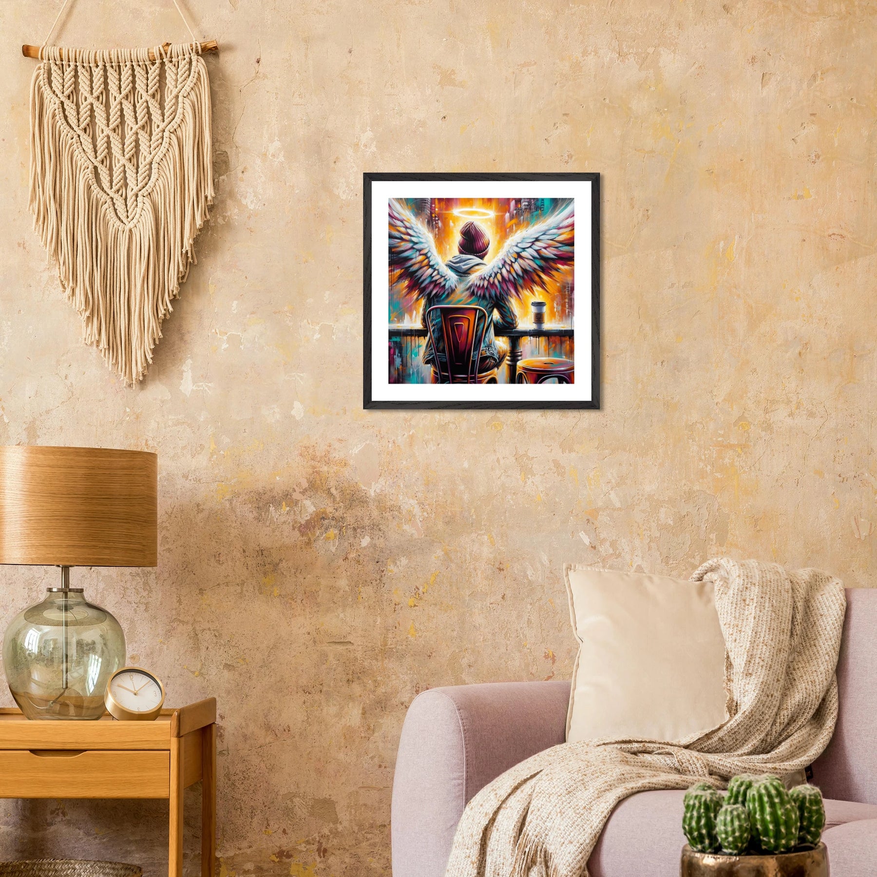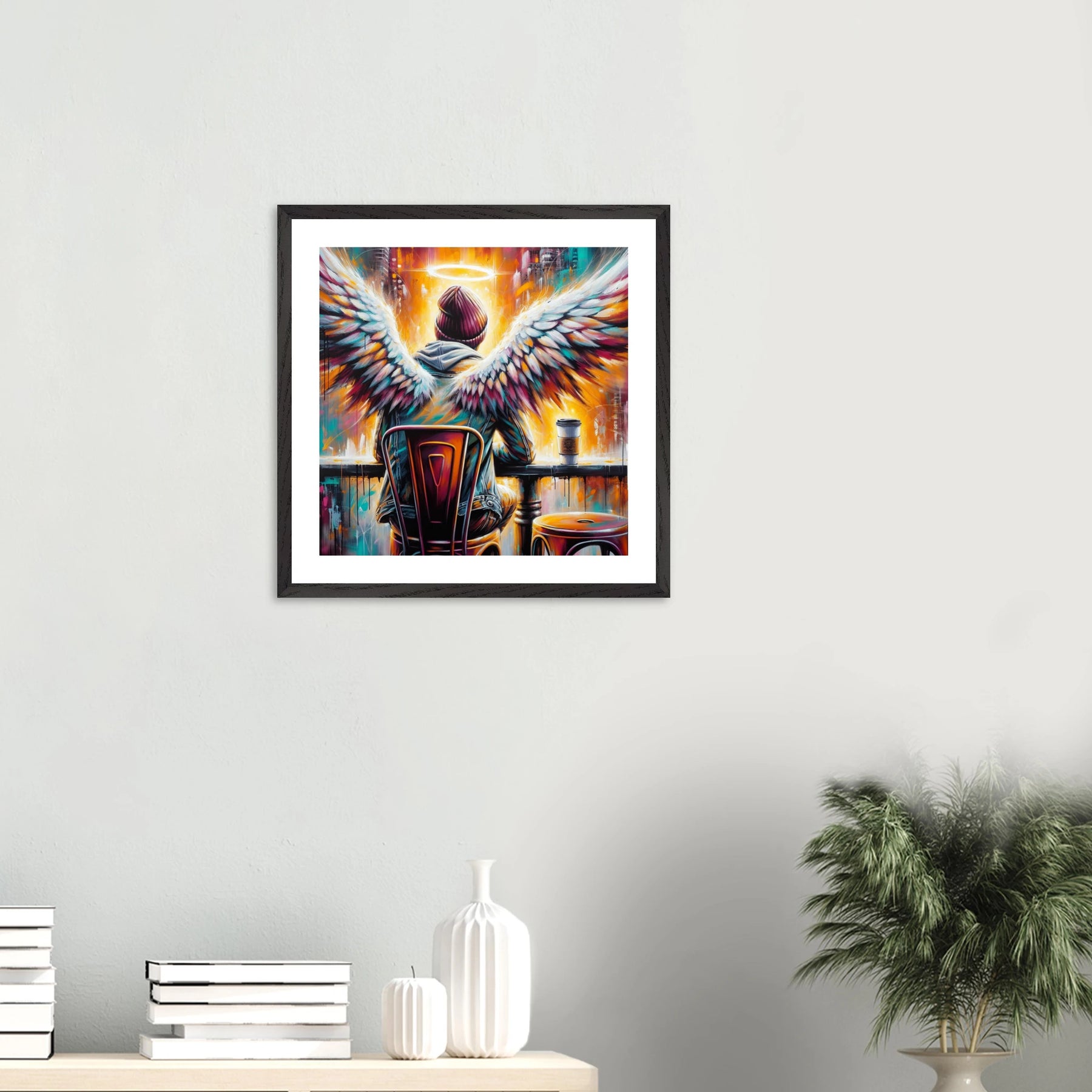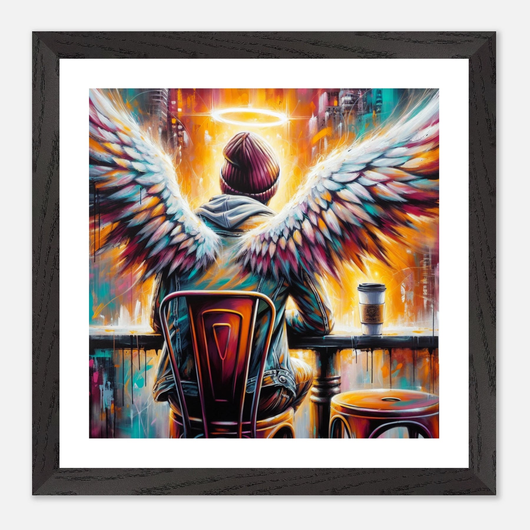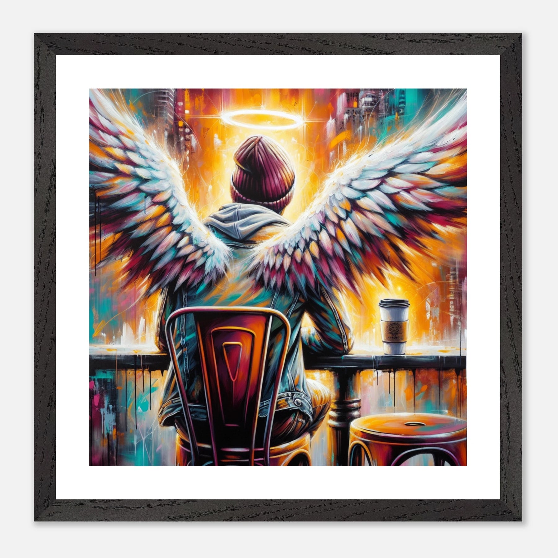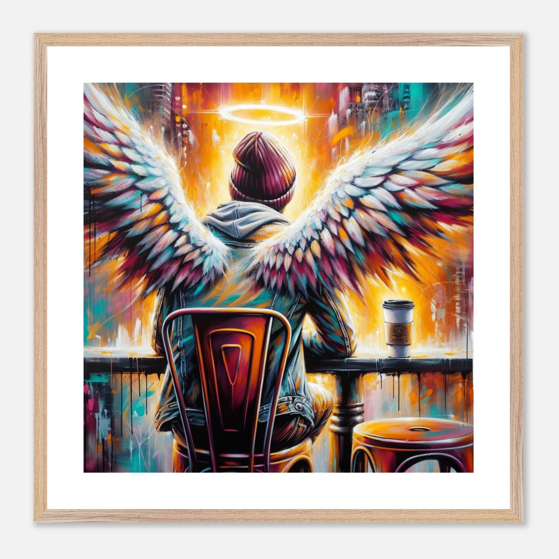Hipster-Engel im Café mit Heiligenschein – Coffee & Halos Poster, trinkt Kaffee in Acrylfarben