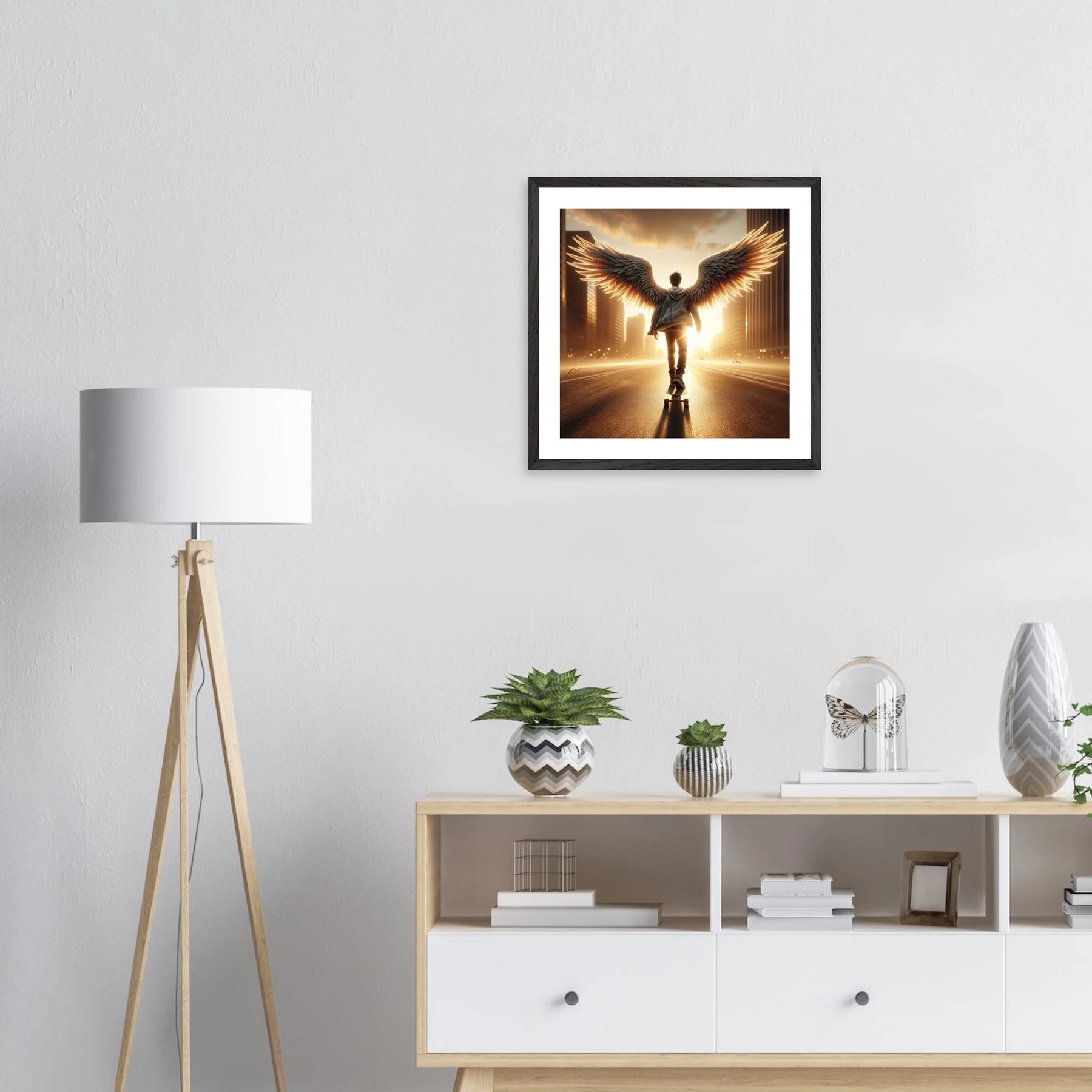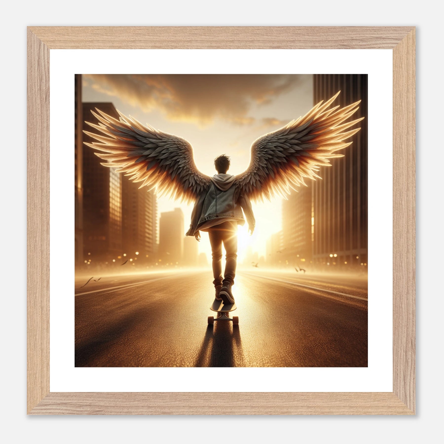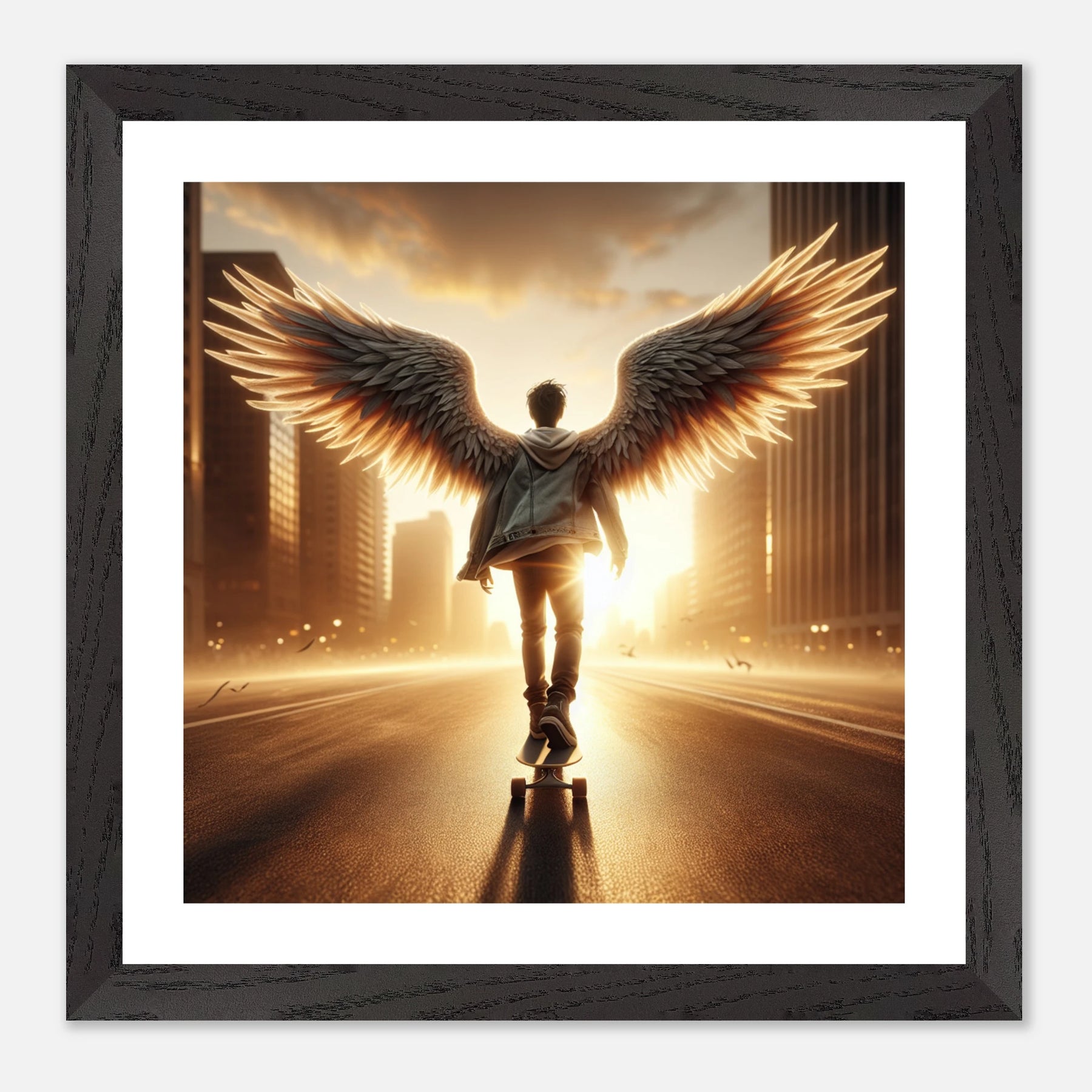 Dieses edle Premium-Poster aus der Urban Angel-Serie bringt urbane Tiefe und moderne Eleganz in deine vier Wände. Der FSC-zertifizierte Holzrahmen und das matte Kunstdruckpapier sorgen gemeinsam für eine hochwertige, langlebige Präsentation deines Motivs.