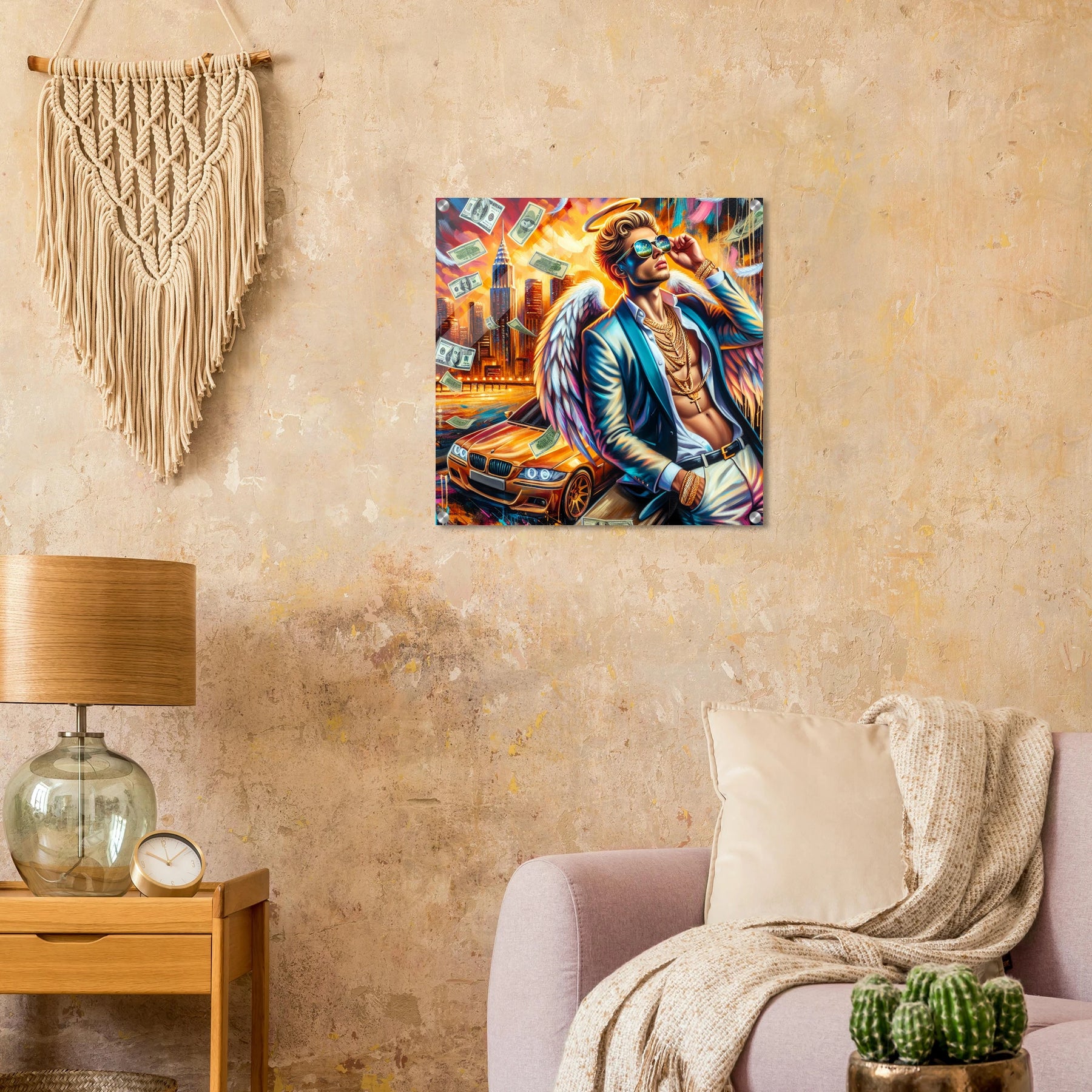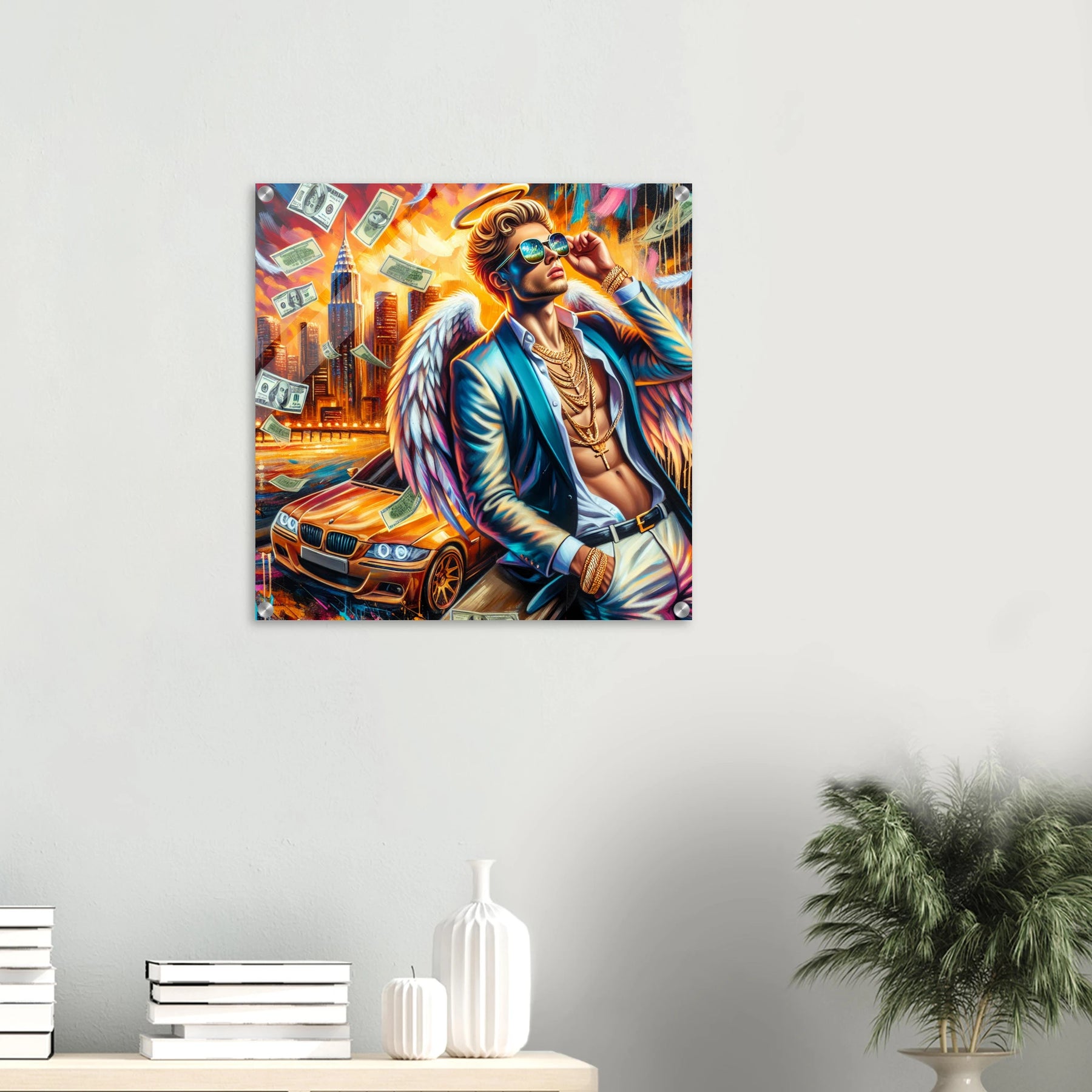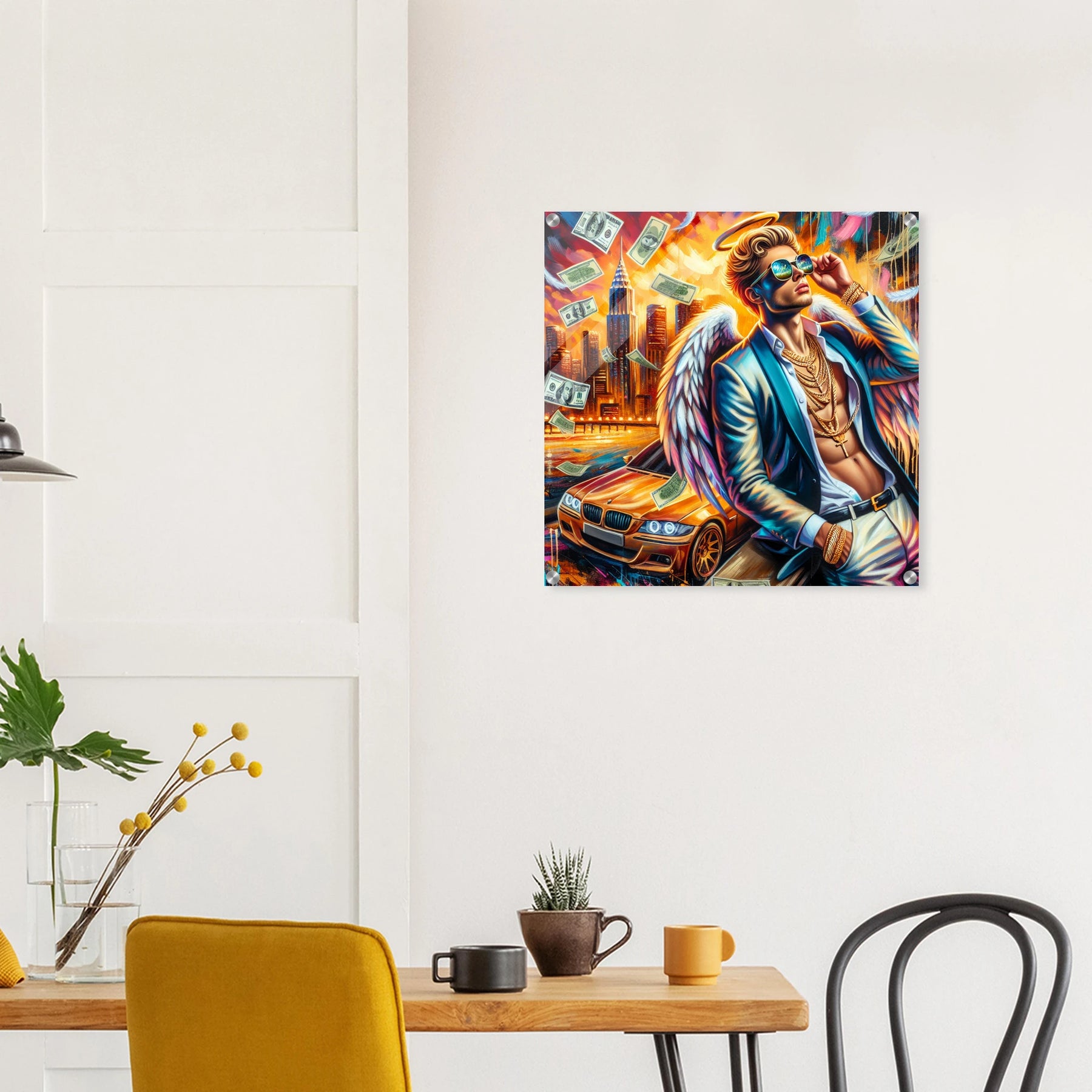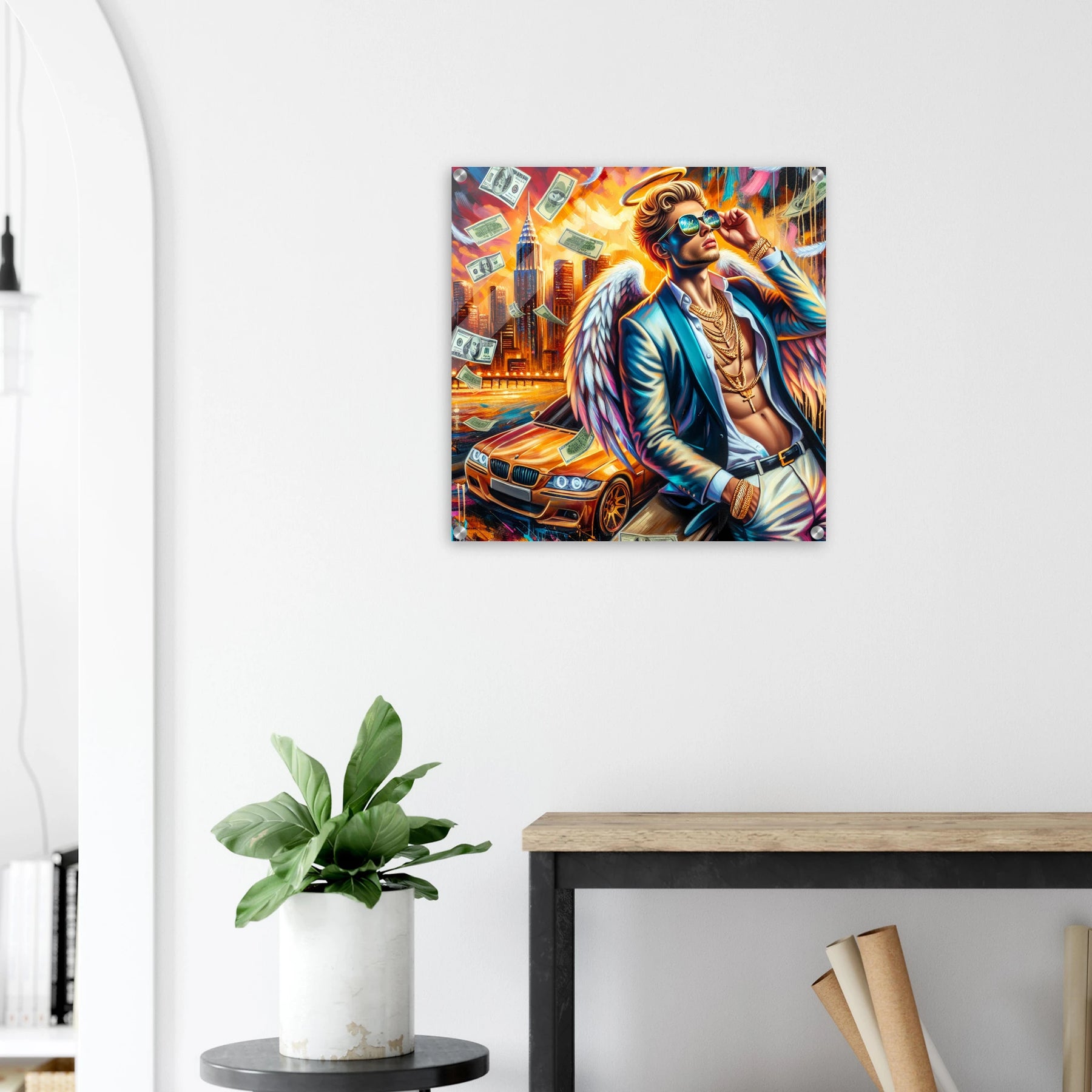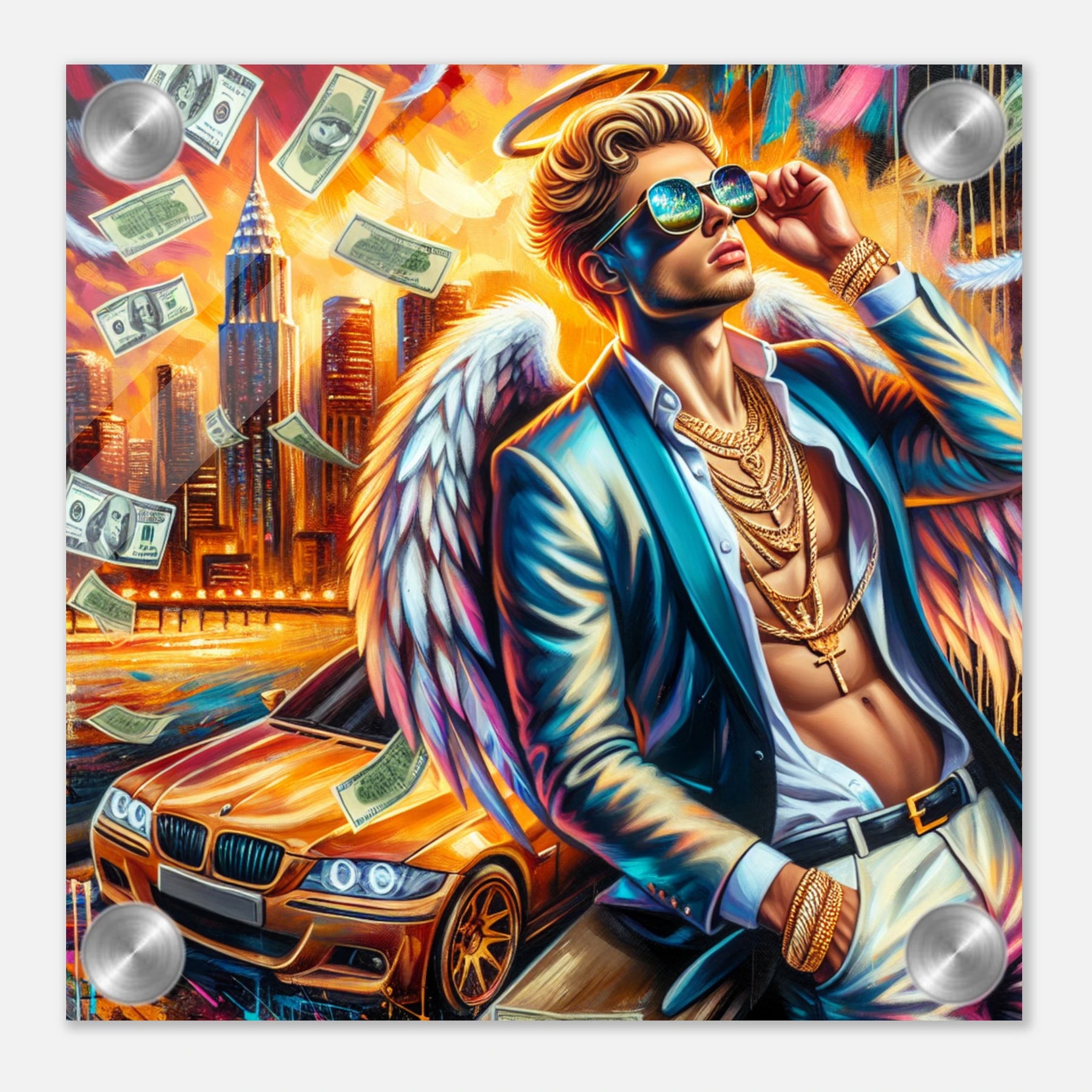 Reicher Unternehmer-Engel mit Geldscheinen – Heaven’s Hustle Acrylglasdruck mit luxuriösem Auto und Engelsflügeln