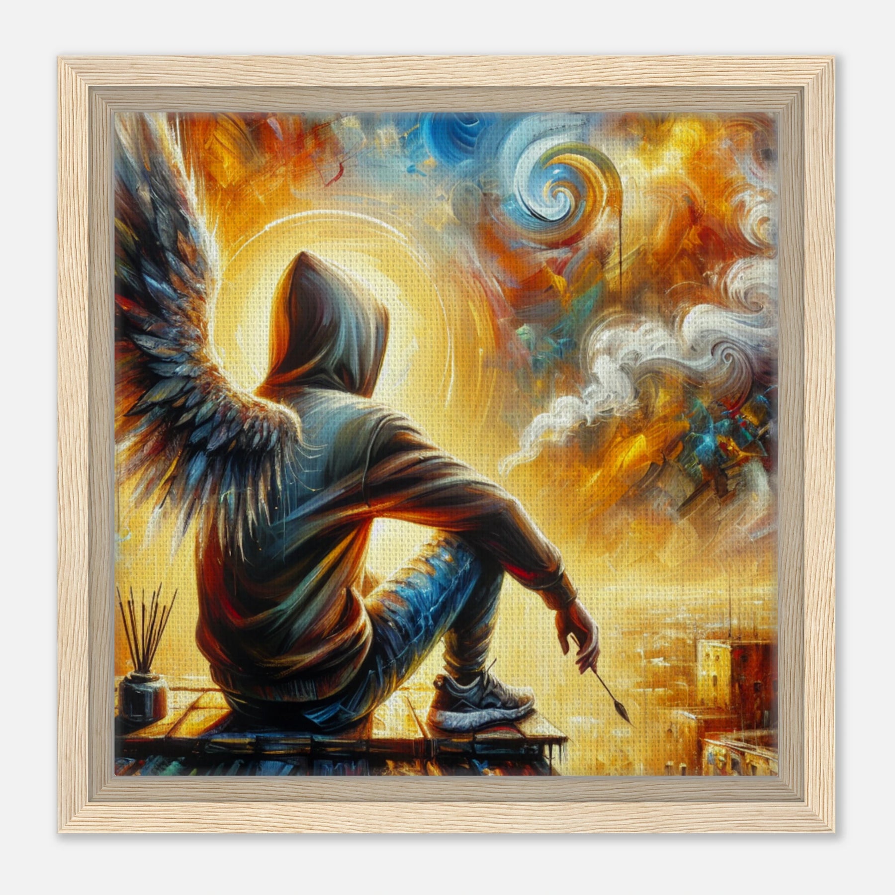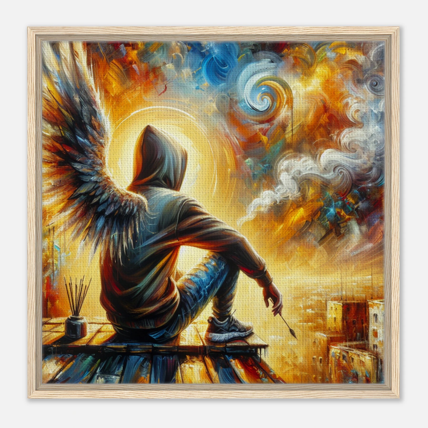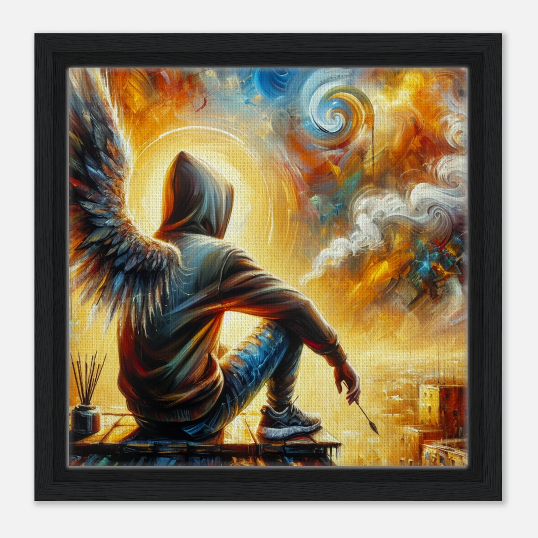Diese gerahmte Leinwand zeigt einen Engel aus der Urban Angel-Serie – kraftvoll, ästhetisch und voller Tiefe. Die strukturierte Oberfläche bringt das Motiv besonders lebendig zur Geltung, der hochwertige Rahmen sorgt für eine elegante Galerie-Optik.